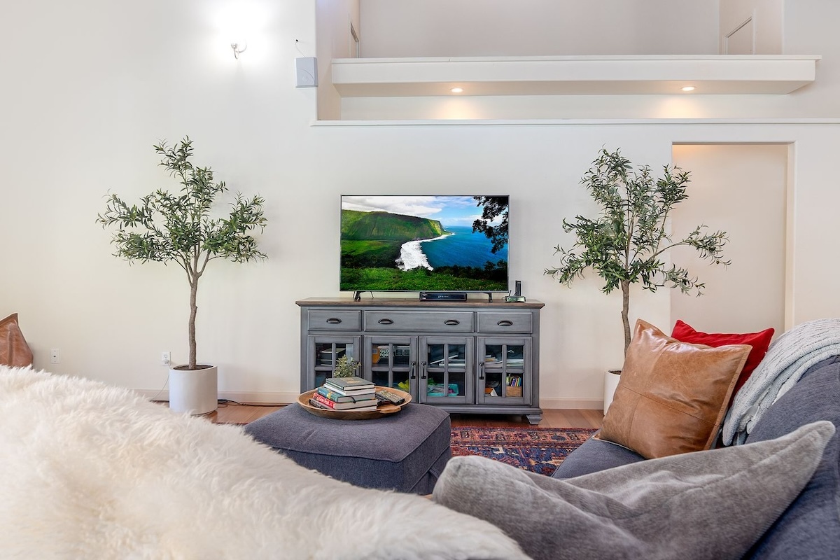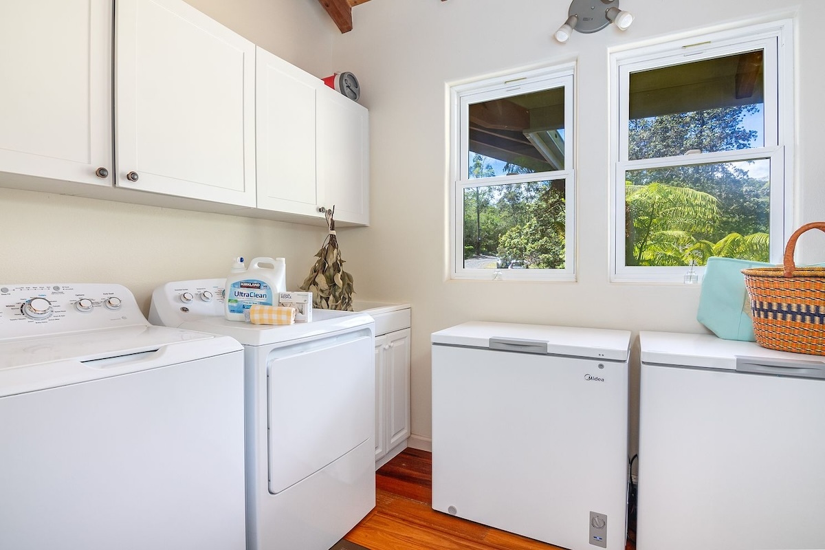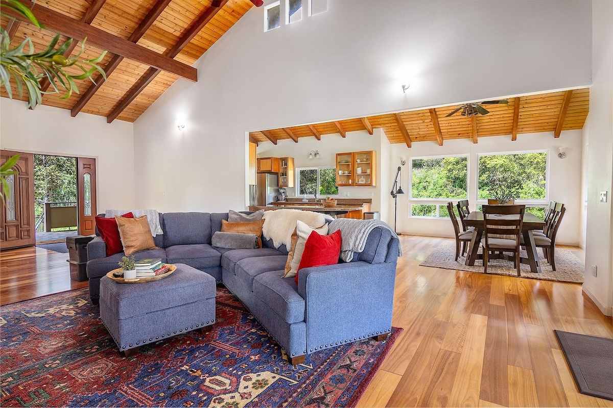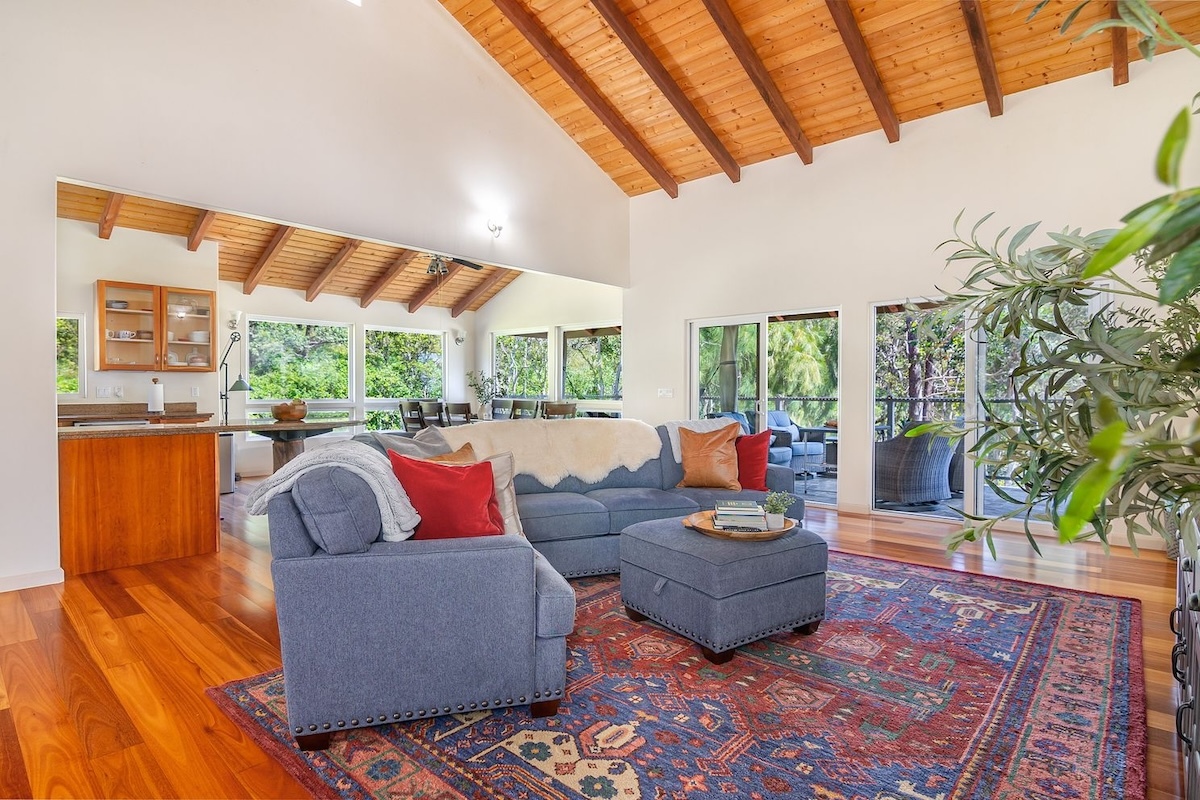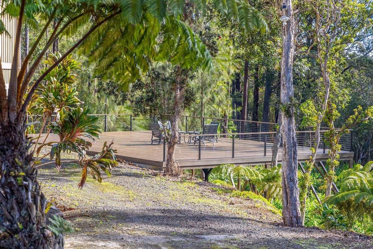 Experience exceptional dual-living flexibility in this serene 3-bedroom, 4-bath residence set on over 7 acres of private native forest in Ahualoa. Located just 12 miles from Waimea and 6 miles from Honokaa, this sanctuary offers a rare opportunity to live amidst a private forest reserve. Property Highlights: - 7+ acres of lush native forest with ‘Ohi?a hardwood trees, Hapu?u ferns, ginger, and strawberry guava. - Split-level design with high open-beam ceilings and abundant natural light - Eucalyptus hardwood floors in the main living and kitchen areas - Large windows throughout framing serene forest views and enhancing the natural ambiance - Wellness and outdoor living features, including a private spa area and a large freestanding deck - Underground electric, county water, and high-speed internet–rare conveniences for Ahualoa living. Main Level: - Open living, dining, and kitchen area designed for seamless indoor—outdoor flow, along with a conveniently located laundry area. - Covered lanai with wood-burning fireplace, slate floors, and handcrafted ‘Ohi?a posts - Two bedrooms and two bathrooms, including a spacious primary suite featuring: dual sinks, granite counters, jacuzzi soaking tub, separate shower, and a walk-in closet. Lower-Level Separate Living Area: One bedroom with bathroom and closet, plus an additional space staged as a bedroom, along with a full kitchen and separate washer/dryer. Wellness & Outdoor Amenities: - Dry sauna, wet steam sauna, and Classic Barrel Cold Plunge for a true at-home spa retreat. -Expansive freestanding entertainment deck set among the trees–perfect for gatherings or peaceful relaxation. This rare Ahualoa property offers a private forest sanctuary with flexible living spaces, resort-style wellness amenities, and a tranquil setting just minutes from town. A unique opportunity to enjoy quiet, spacious, and rejuvenating Big Island living.