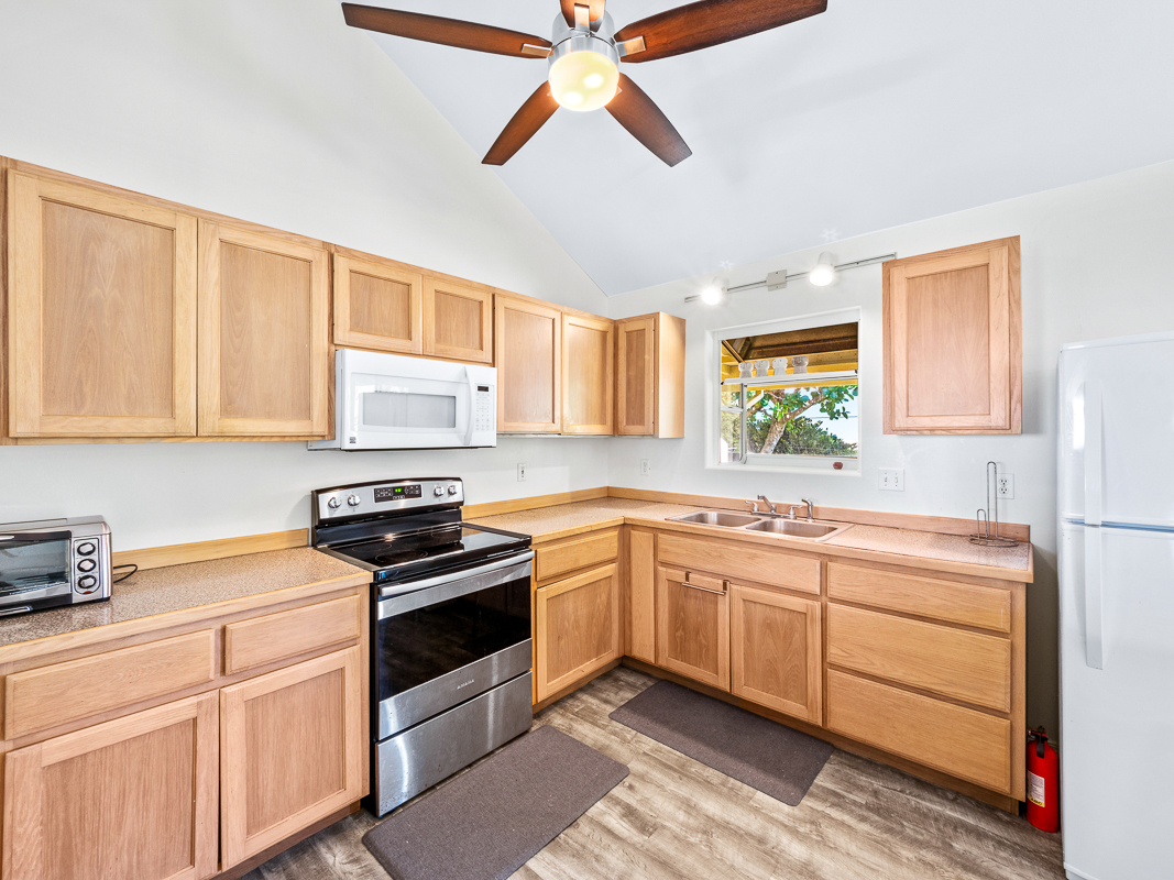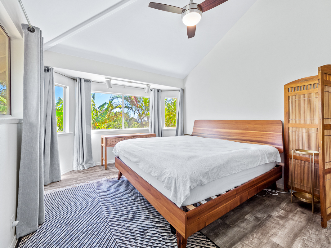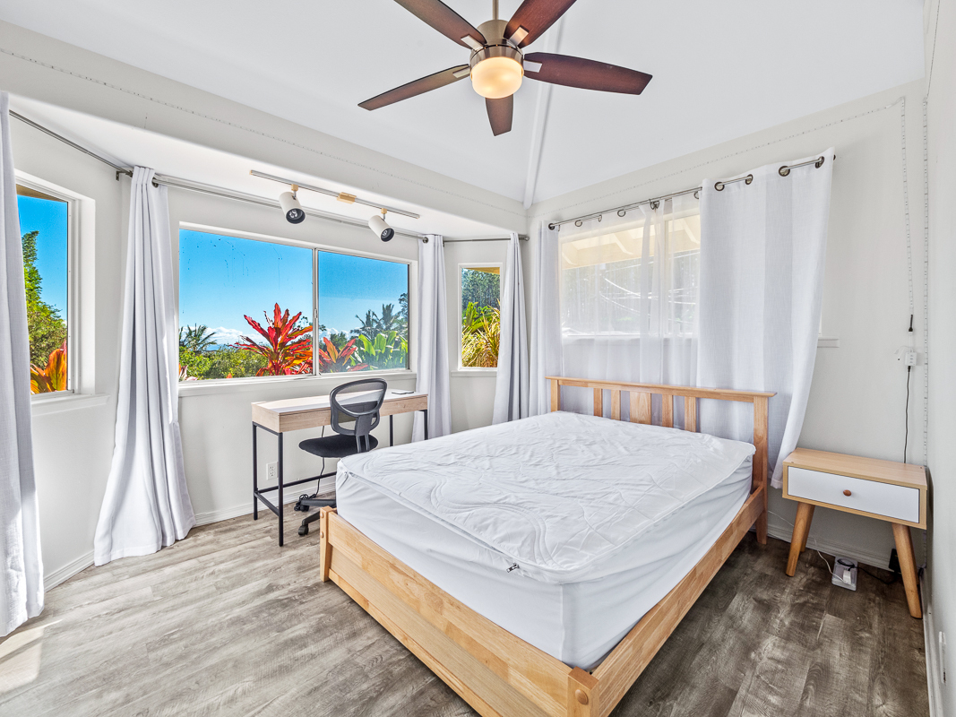 Enjoy ocean and sunrise views from this well-maintained, single-level 3-bedroom, 2-bath home situated on over one acre in the desirable Huina Estates subdivision. Located at approximately 1,100-foot elevation and just minutes from Honokaa Town, this modern and contemporary residence offers abundant natural light, an open living area with ocean views, and a spacious covered lanai ideal for indoor-outdoor living. Recent improvements include vinyl plank flooring and interior paint. The primary suite features an en-suite bath, walk-in closet, and bay window framing ocean views, while two additional bedrooms share a full bath. The property includes a detached garage, fenced front and rear yards, rolling lawn, and a variety of mature fruit trees. Bordering a small valley for added privacy, this home is conveniently located near the Sunday Honokaa Farmers Market and close to town amenities, schools, dining, and services. Easy access to Waimea, Hilo, Kona, and nearby beaches and resorts. Property is currently occupied by tenant with lease ending on January 31, 2026.