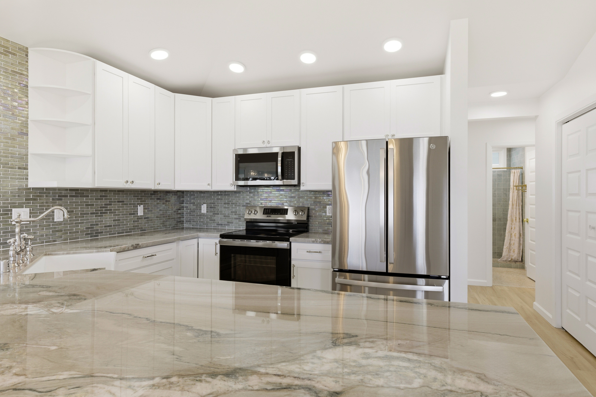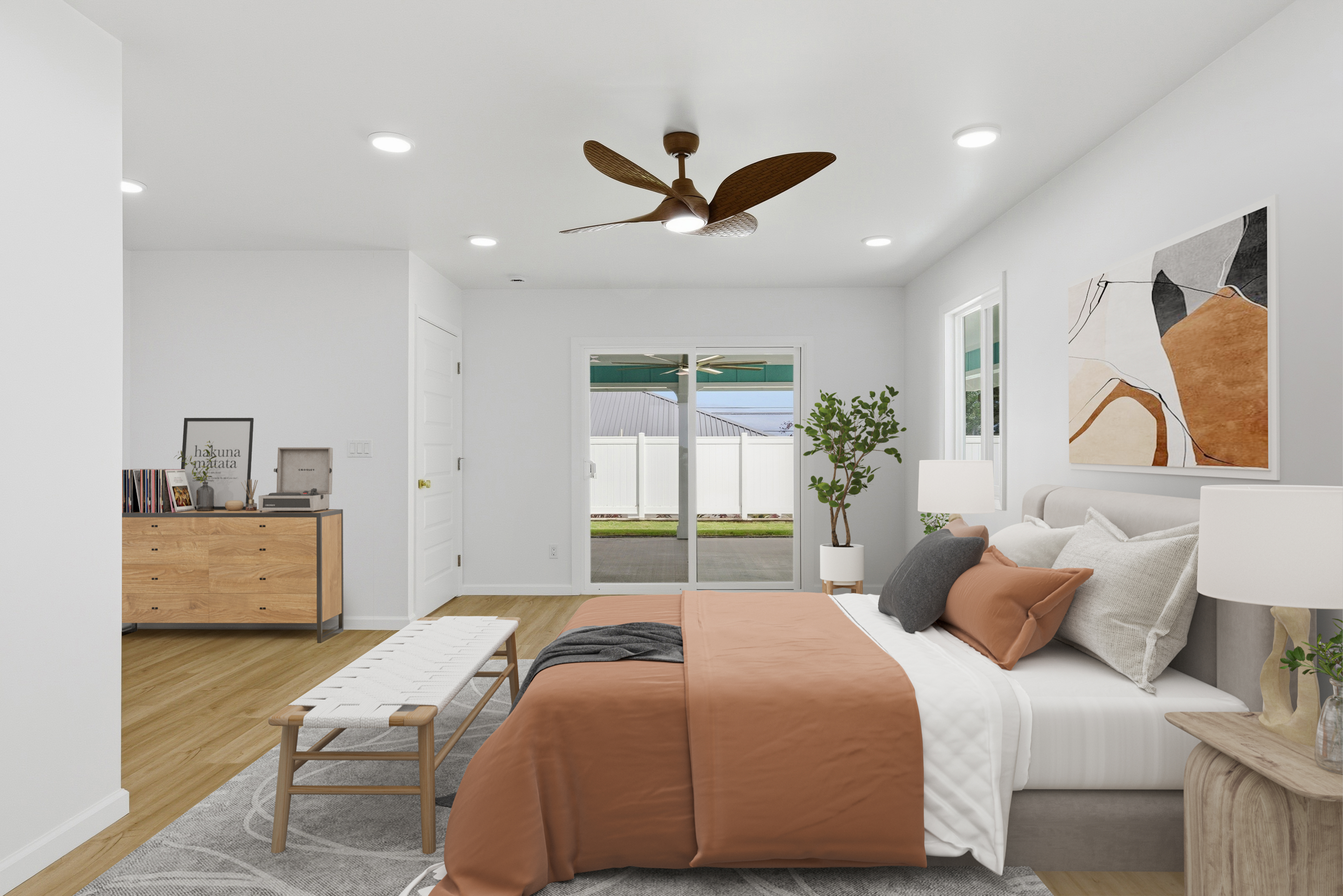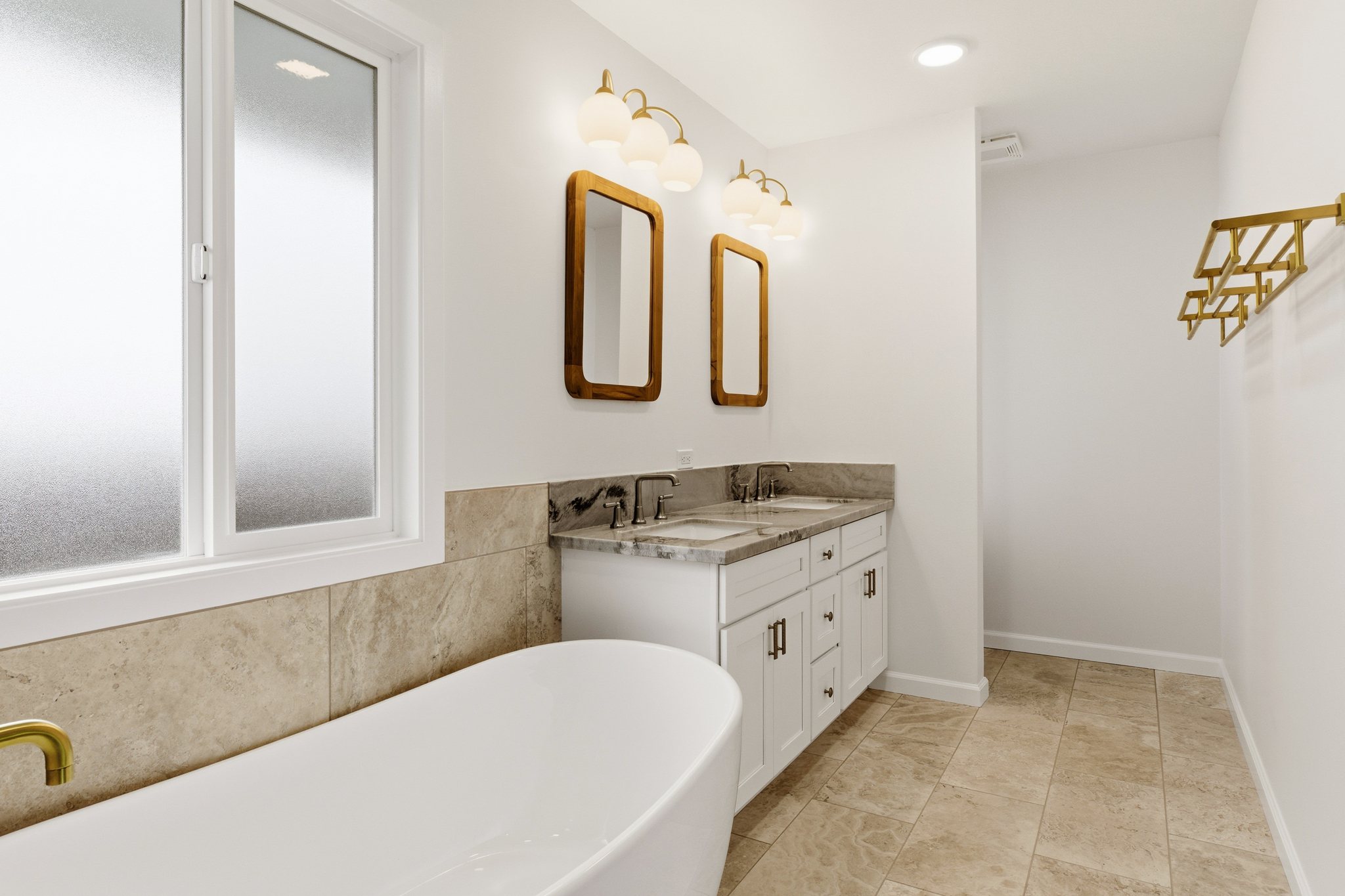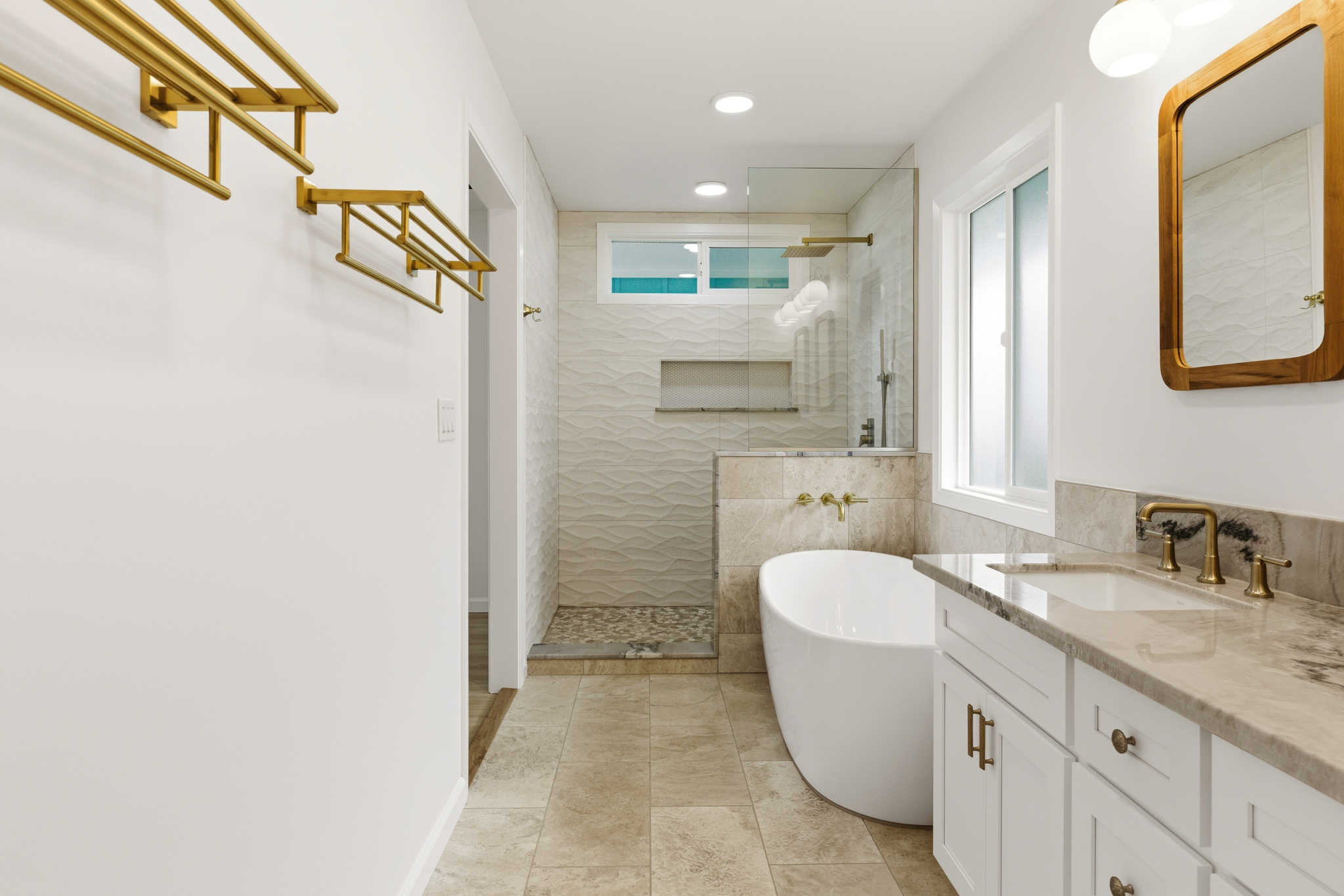 The spa-like primary suite offers calming tones, travertine flooring, a soaking tub, teak-framed mirrors from Bali, and a walk-in shower with natural stone. A walk-in closet and adjoining flex space provide added versatility. The guest bath continues the tranquil theme with sukabumi select stone tile from Indonesia in soft green and sage hues.