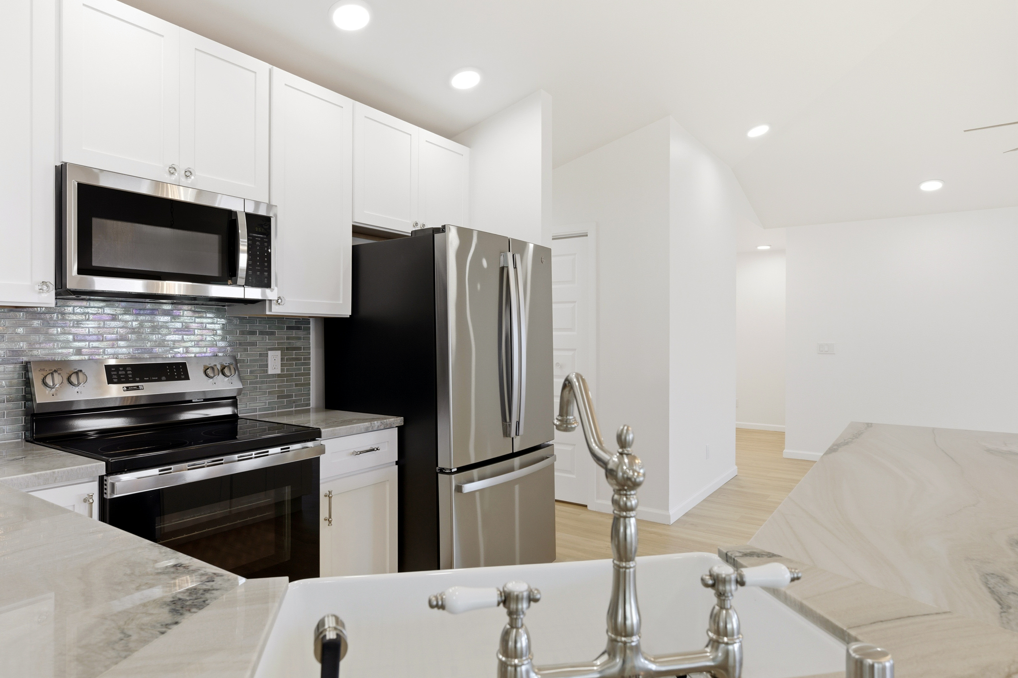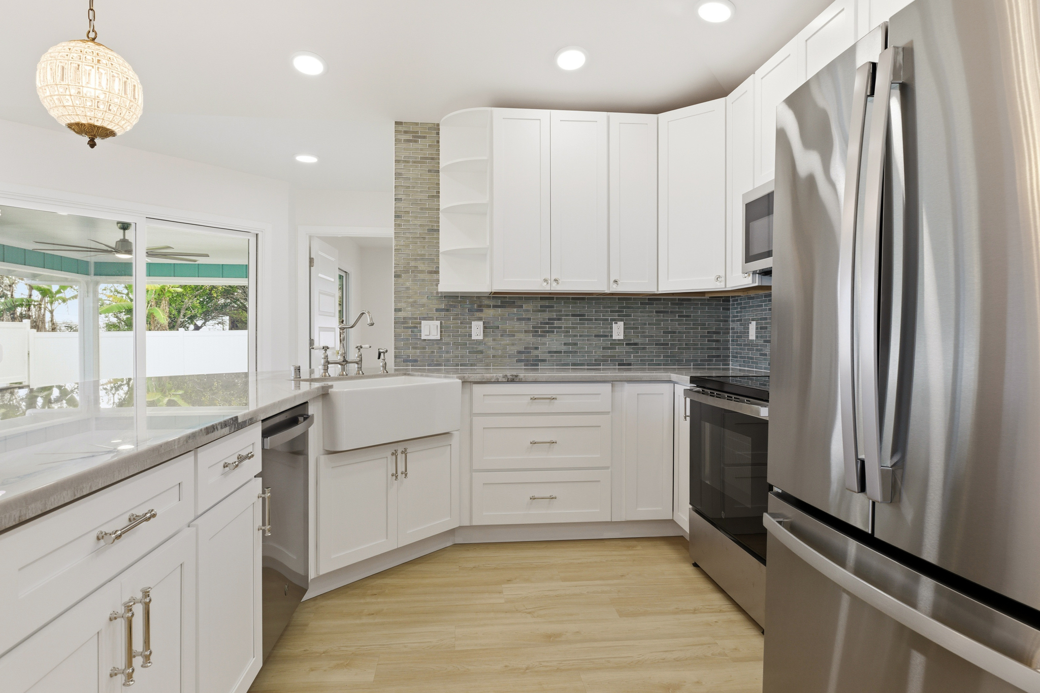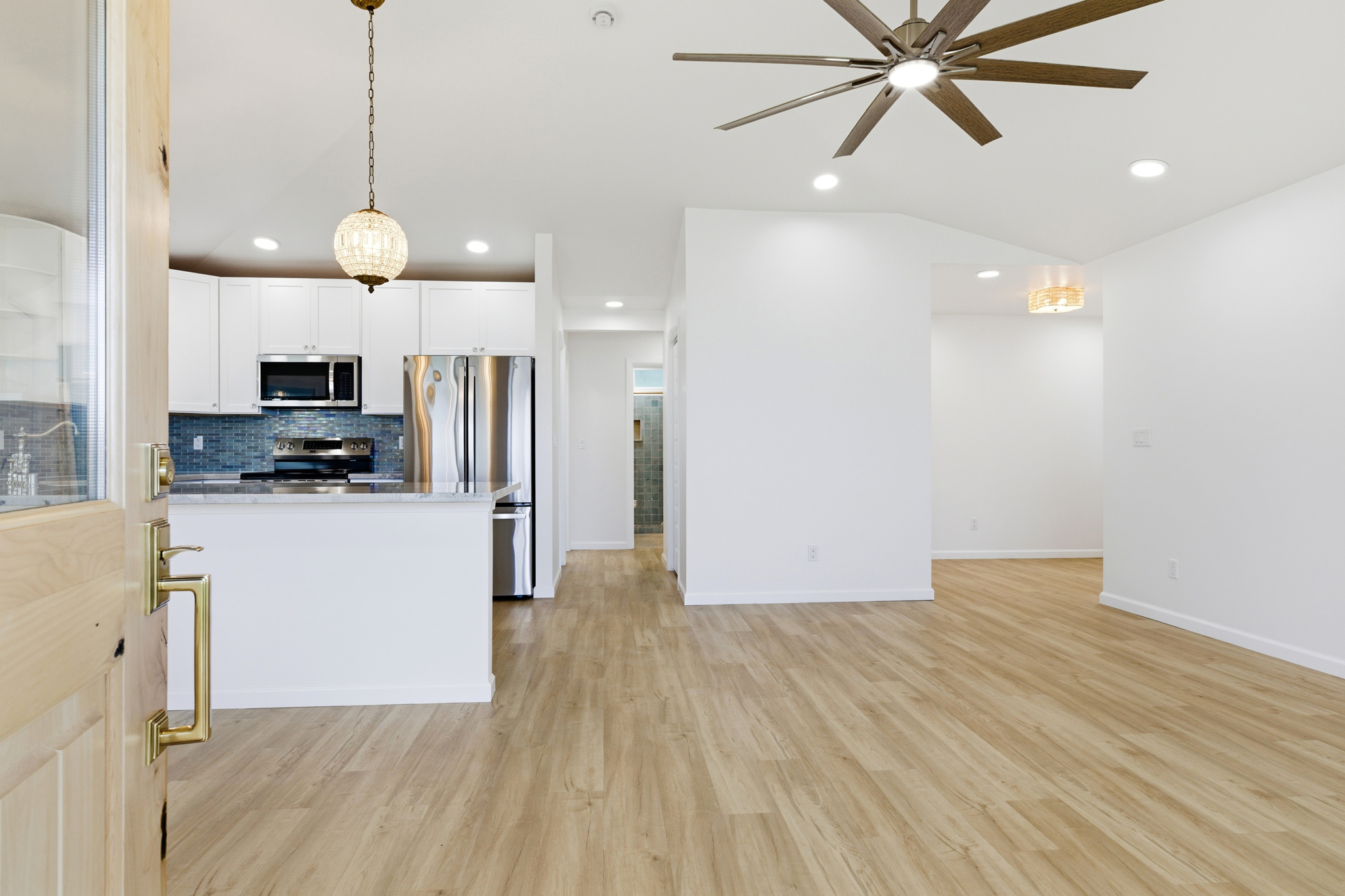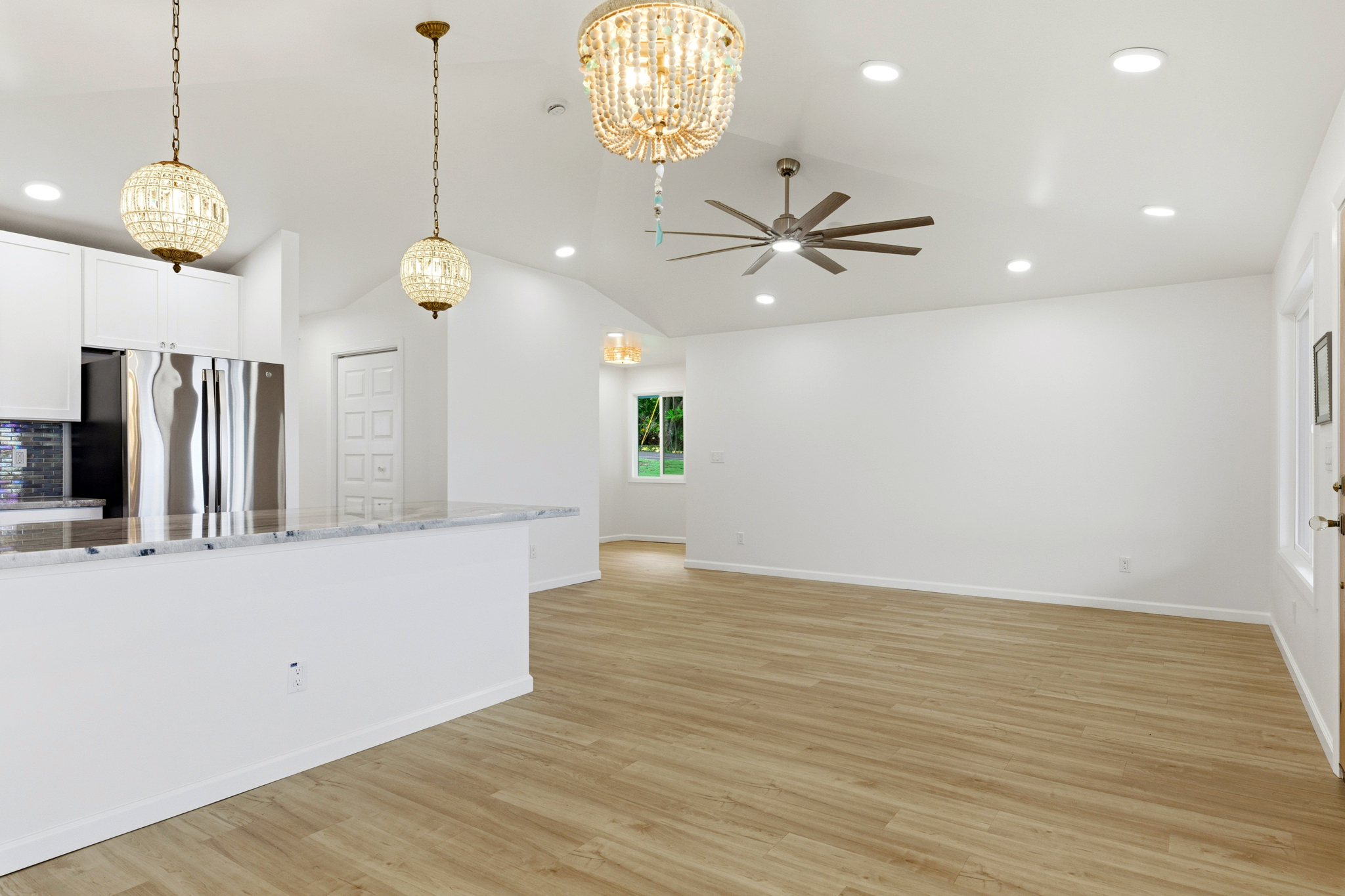 This beautifully designed single-family home blends timeless style with modern comfort, offering an open-concept layout and beach-inspired colors and finishes. Step into a light-filled living space with vaulted ceilings and LVP flooring that flows gracefully from room to room. The kitchen features quartzite countertops, brass hardware, vintage-style knobs and pulls, curated lighting, and a spacious pantry. A wood bead chandelier, hand-strung with beach glass, glass beads, and shells, adds a graceful island touch to the dining area.