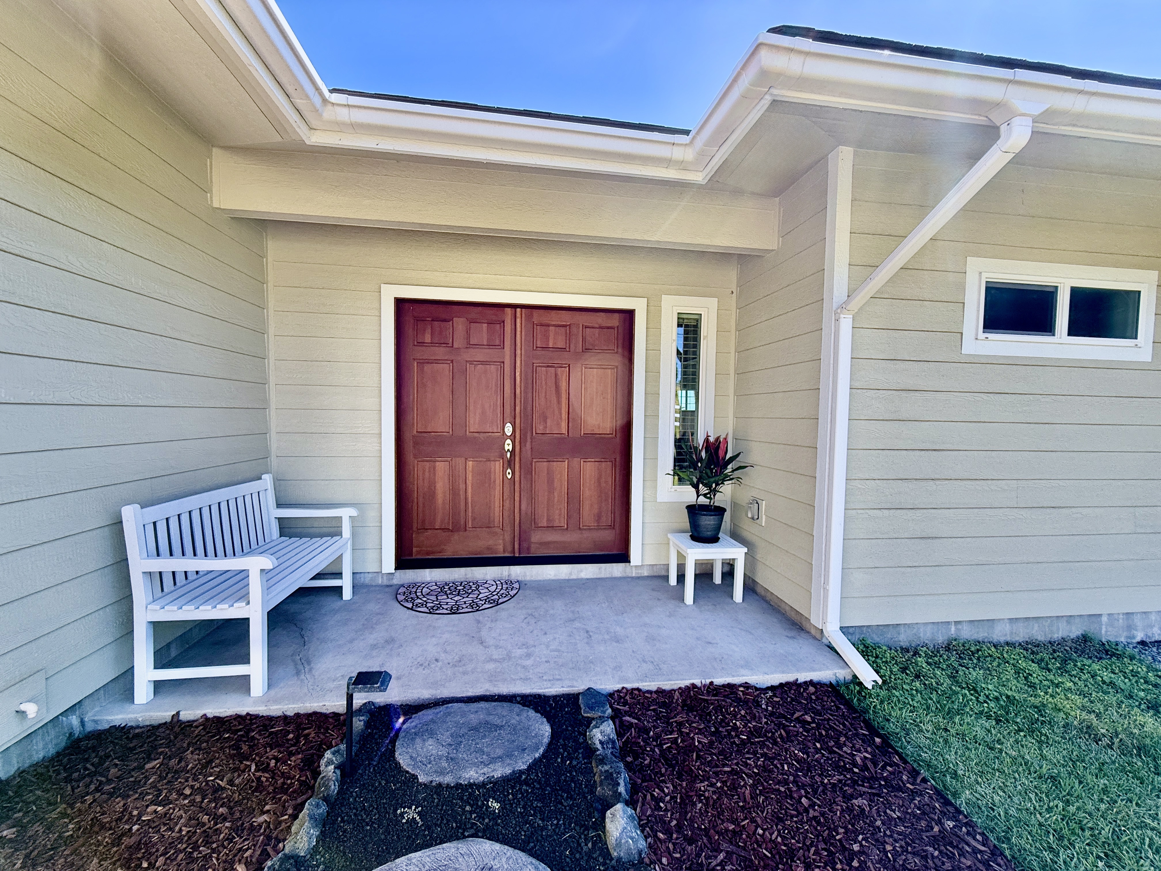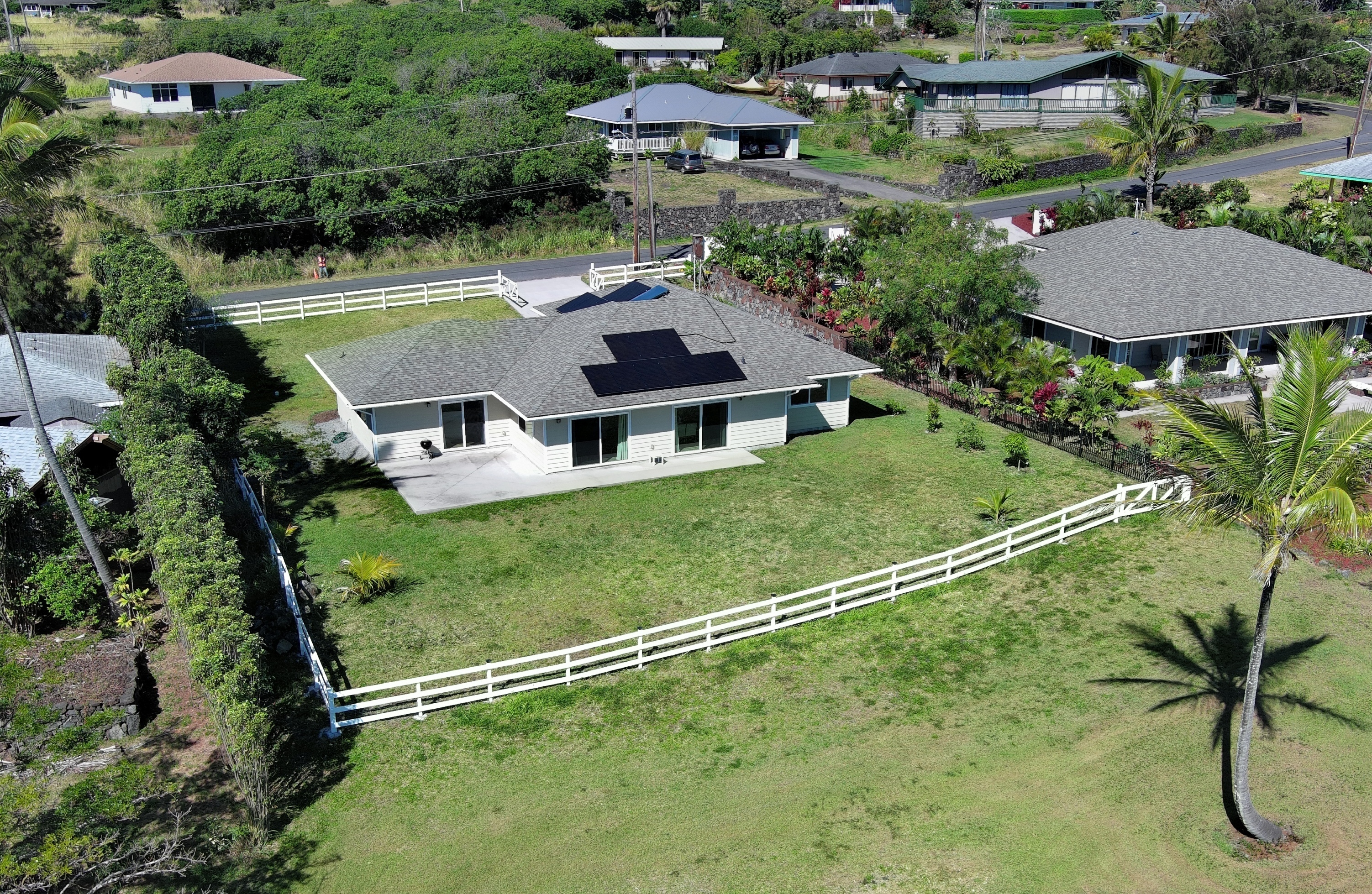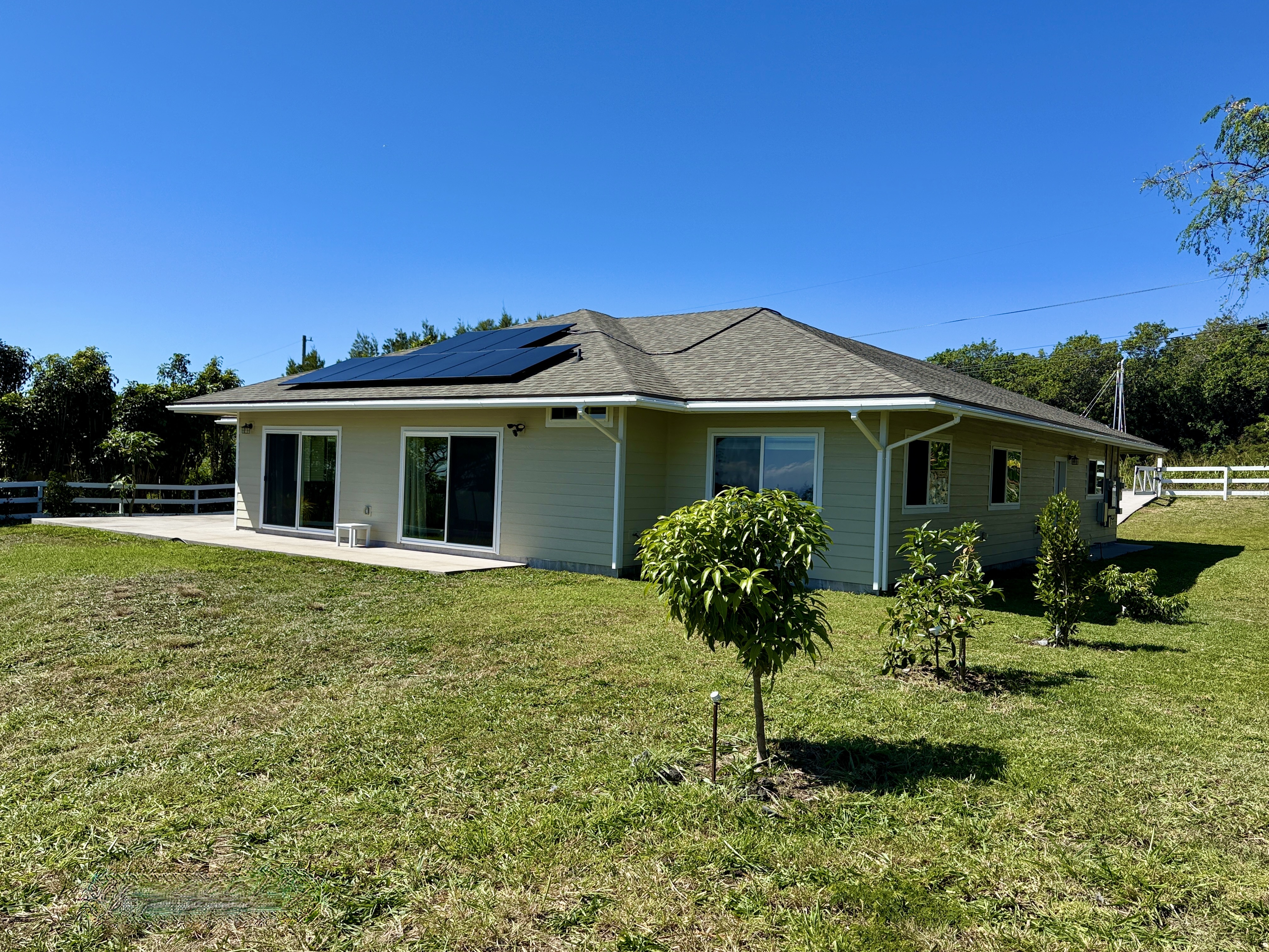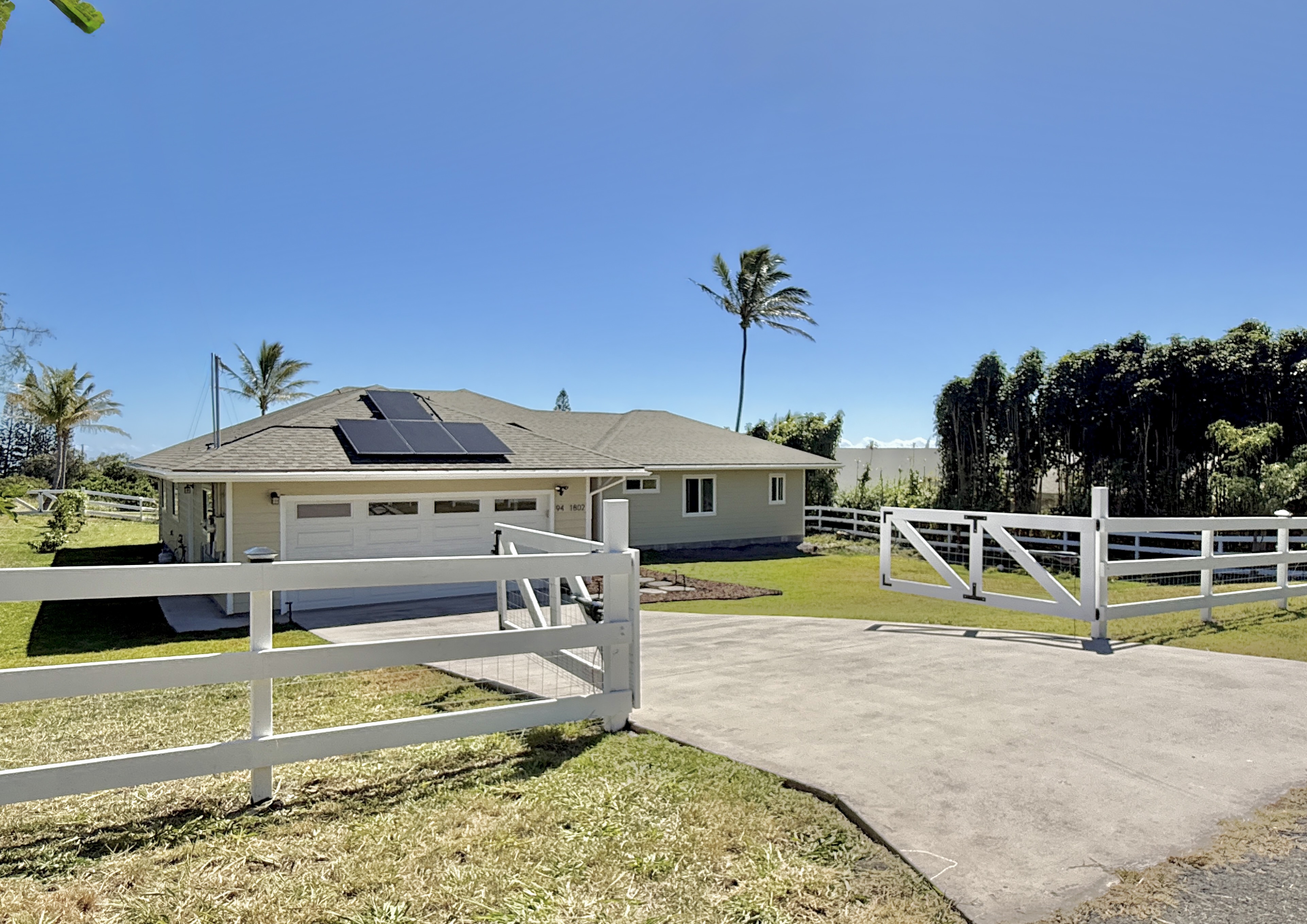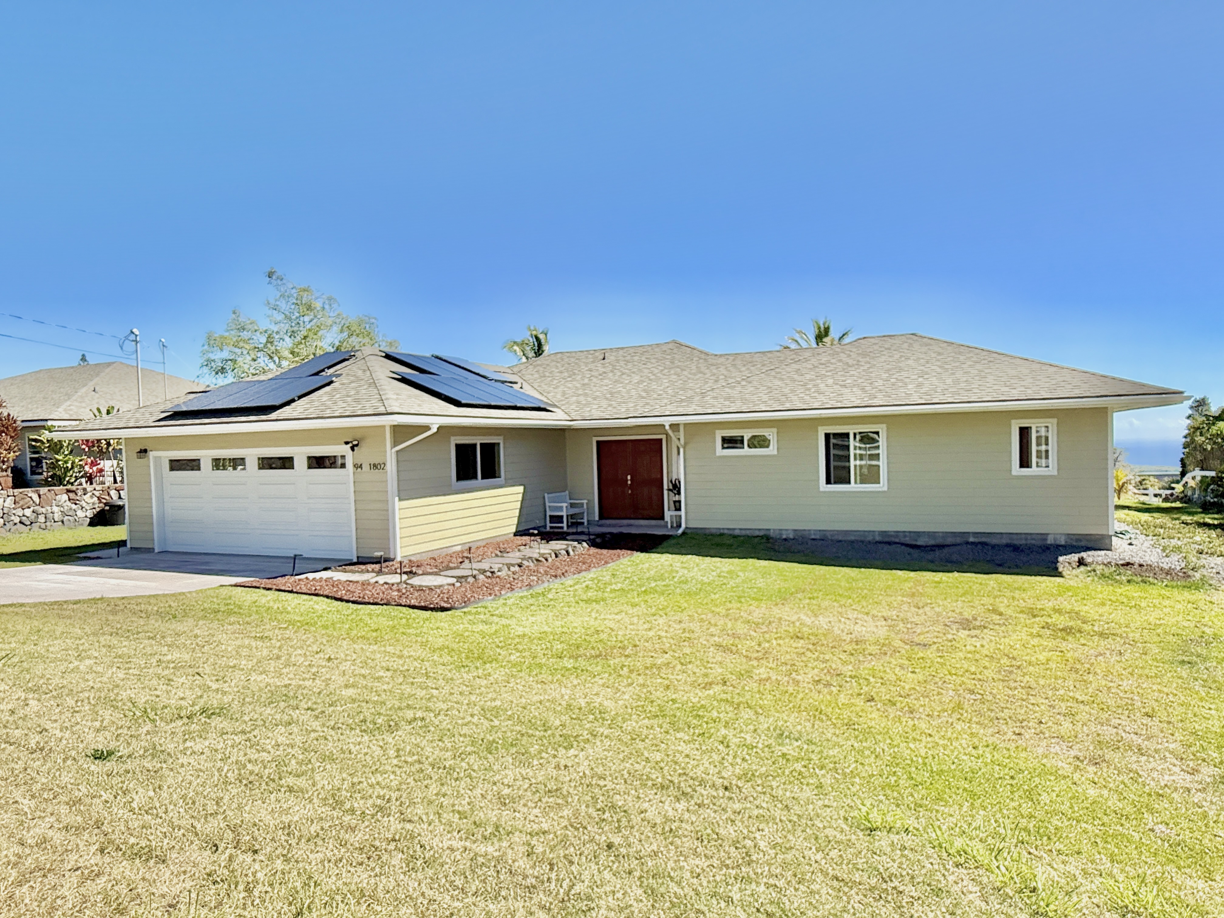 * If you want a large, one level, new home that backs to the golf course w/ocean views but don't want to spend thousands of dollars and hours of time on landscaping, furnishings & home necessities, look no further! * Built in 2021, this turnkey, move in ready home looks brand new & includes stylish contemporary furnishings w/everything you need to start living the Hawaiian lifestyle you have been dreaming of the minute you step through the door. Located along the 18th fairway in Discovery Harbour, you will enjoy beautiful views from all main rooms. * Save hundreds monthly on your electric bill with an OWNED (not leased) solar system by ProVision Solar w/Tesla battery backup, installed in 2023. * The entire property is framed by an attractive split-rail fence w/a pet-friendly lower section & remote-controlled entry gate at the driveway that preserves views while securing the property & creating a pleasant buffer from the golf course. Ring security system included as well. * The floor plan is ideal w/the open main living area at the heart of the home. The owners suite is privately situated on one side w/two additional bedrooms plus a full bath on the other. Kitchen, dining, & living areas combine into an inviting open-concept space ideal for entertaining. Interior living space is approximately 1,939 sq ft plus 600 sq ft of open patio space, for about 2,467 sq combined. Laundry room w/quality washer/dryer and work sink inside the home NOT out in the garage. * Landscaping includes a variety of fruit trees & plantings: papaya, banana, avocado, mango, lemon, Brazilian cherry, and more, supported by a drip irrigation system for easy care. * The designer kitchen is anchored by a massive quartz island and features custom cabinetry & a complete stainless appliance package. * The owner’s suite offers a generous walk-in closet, and private bath bathroom w/double sinks, quartz counters, stand-alone soaking tub, and oversized walk-in custom shower.
