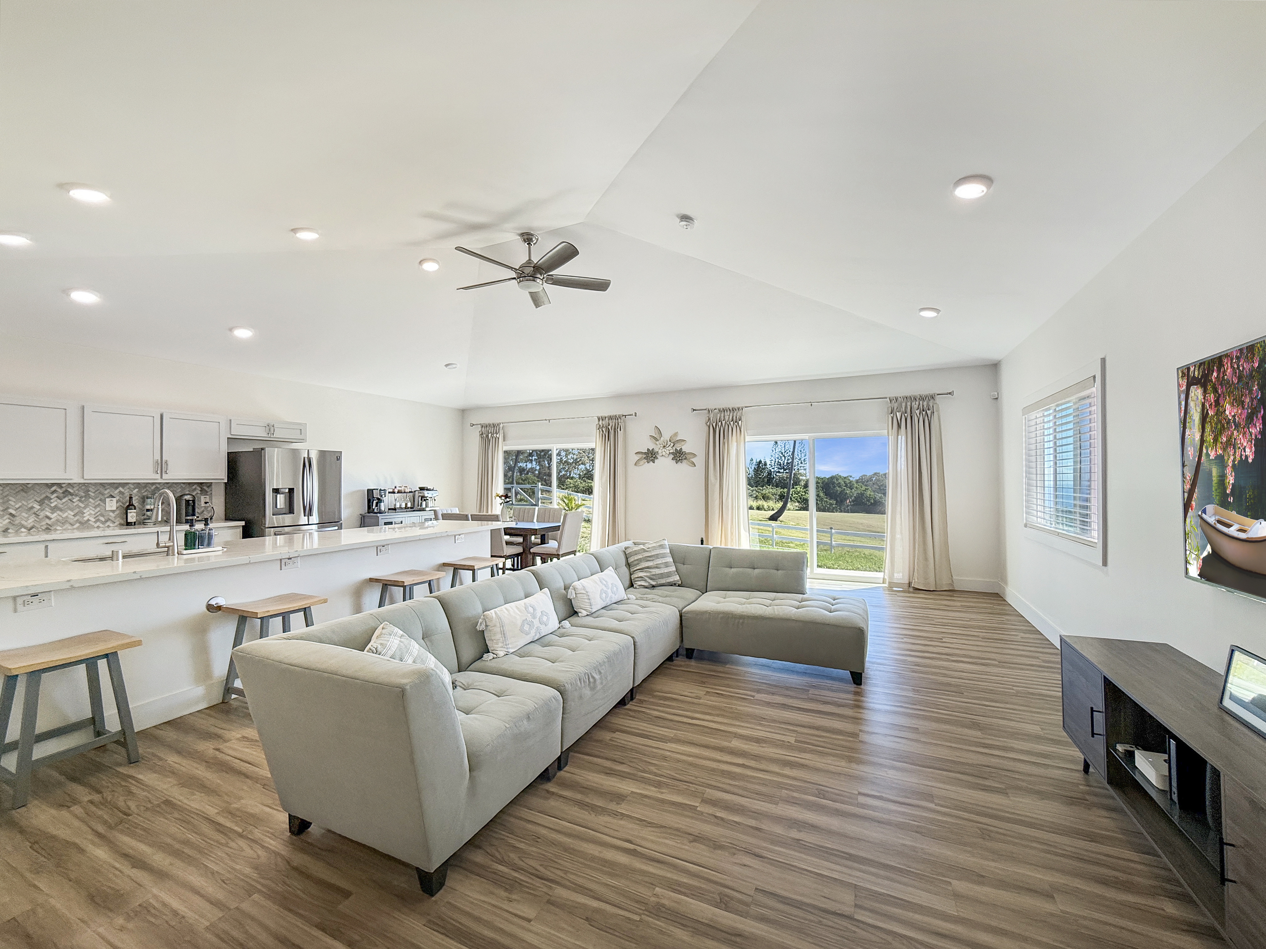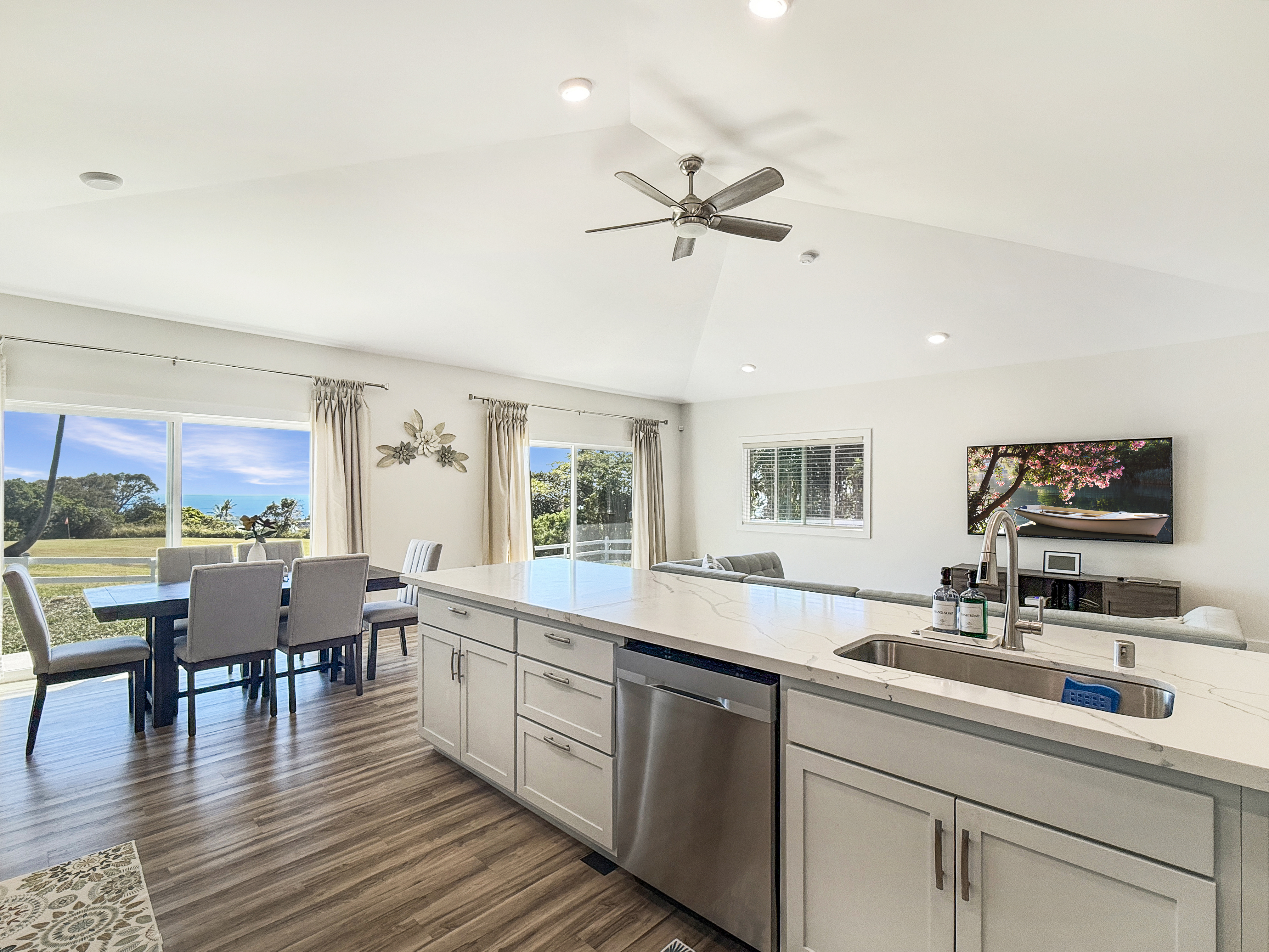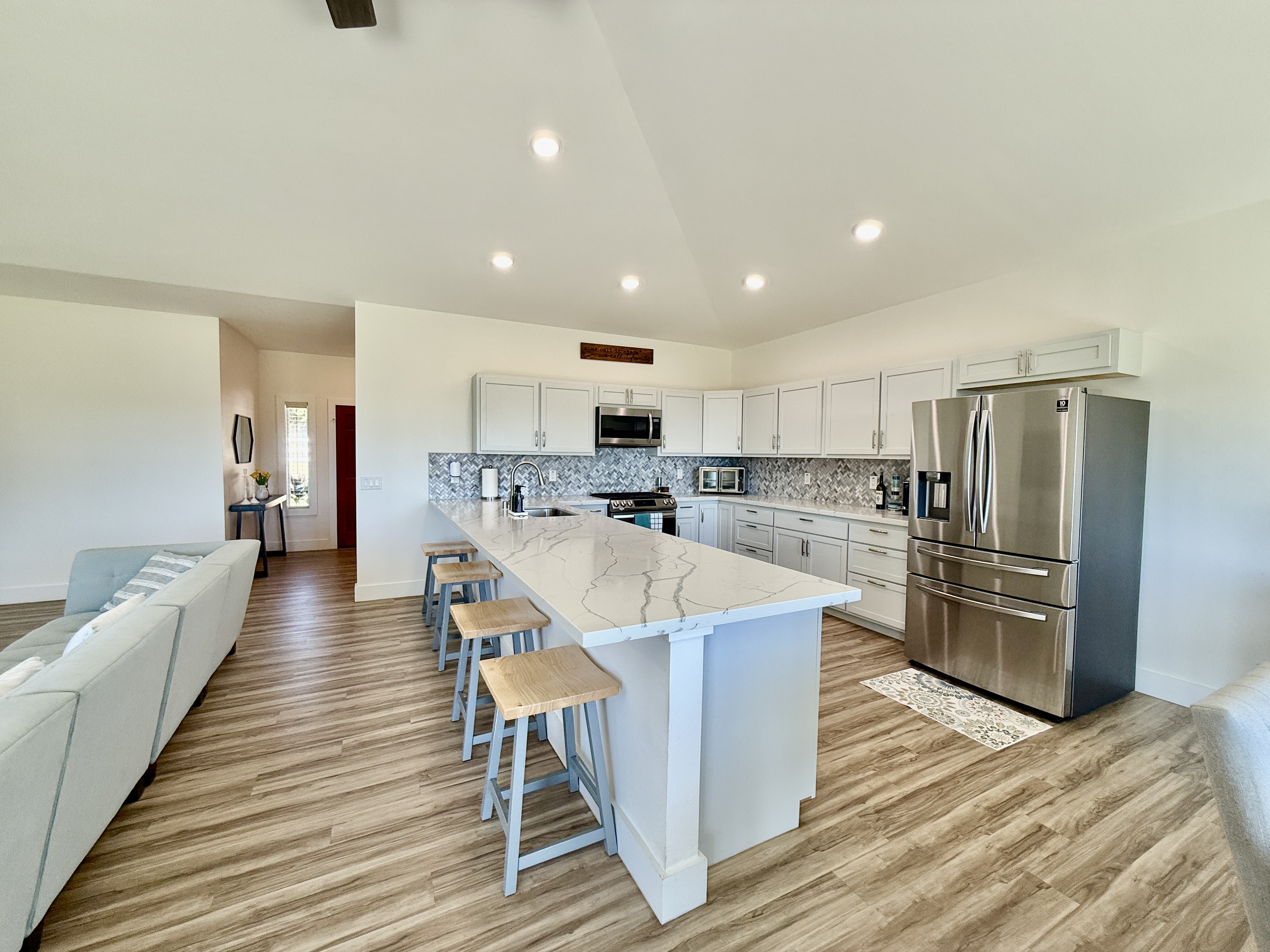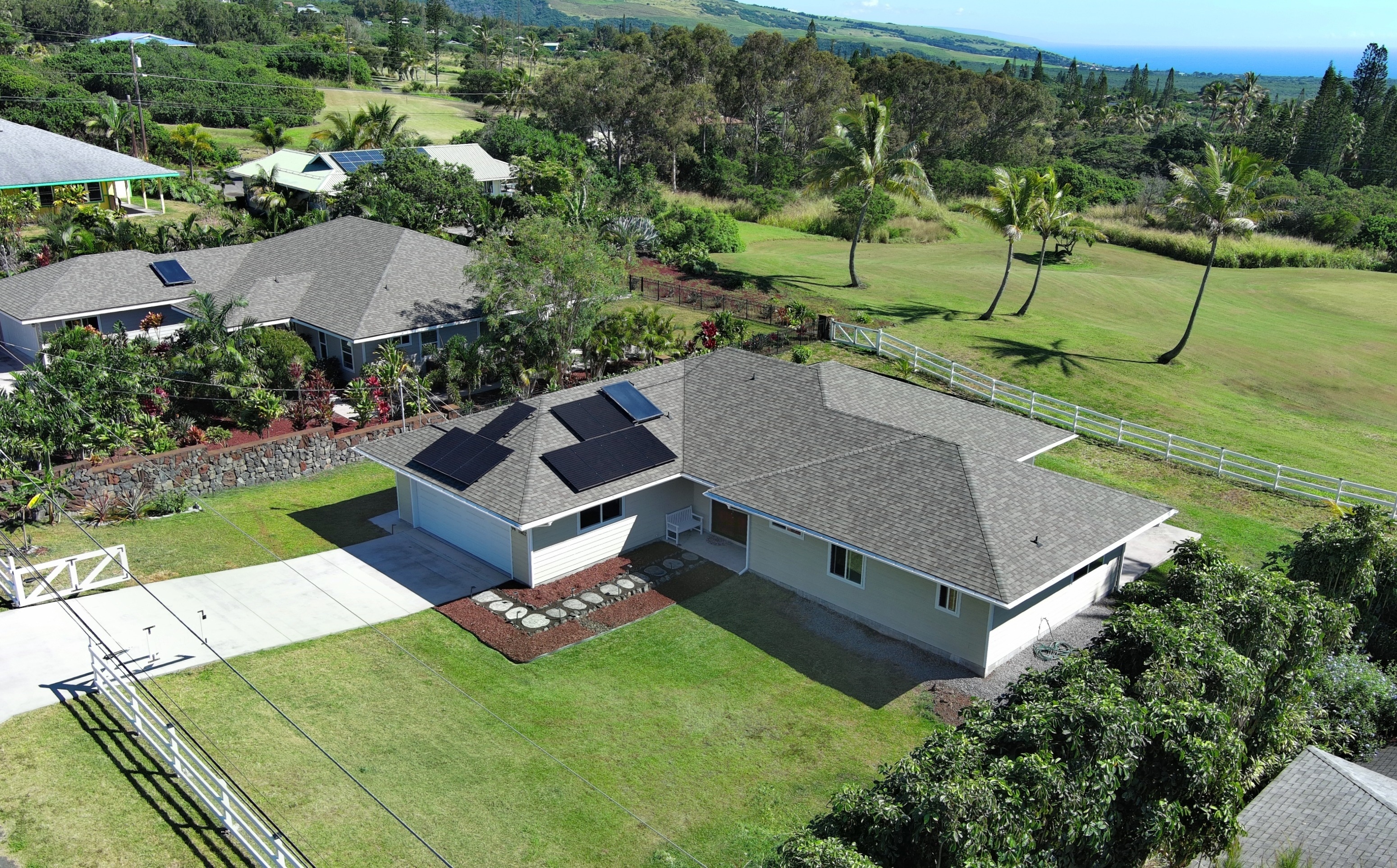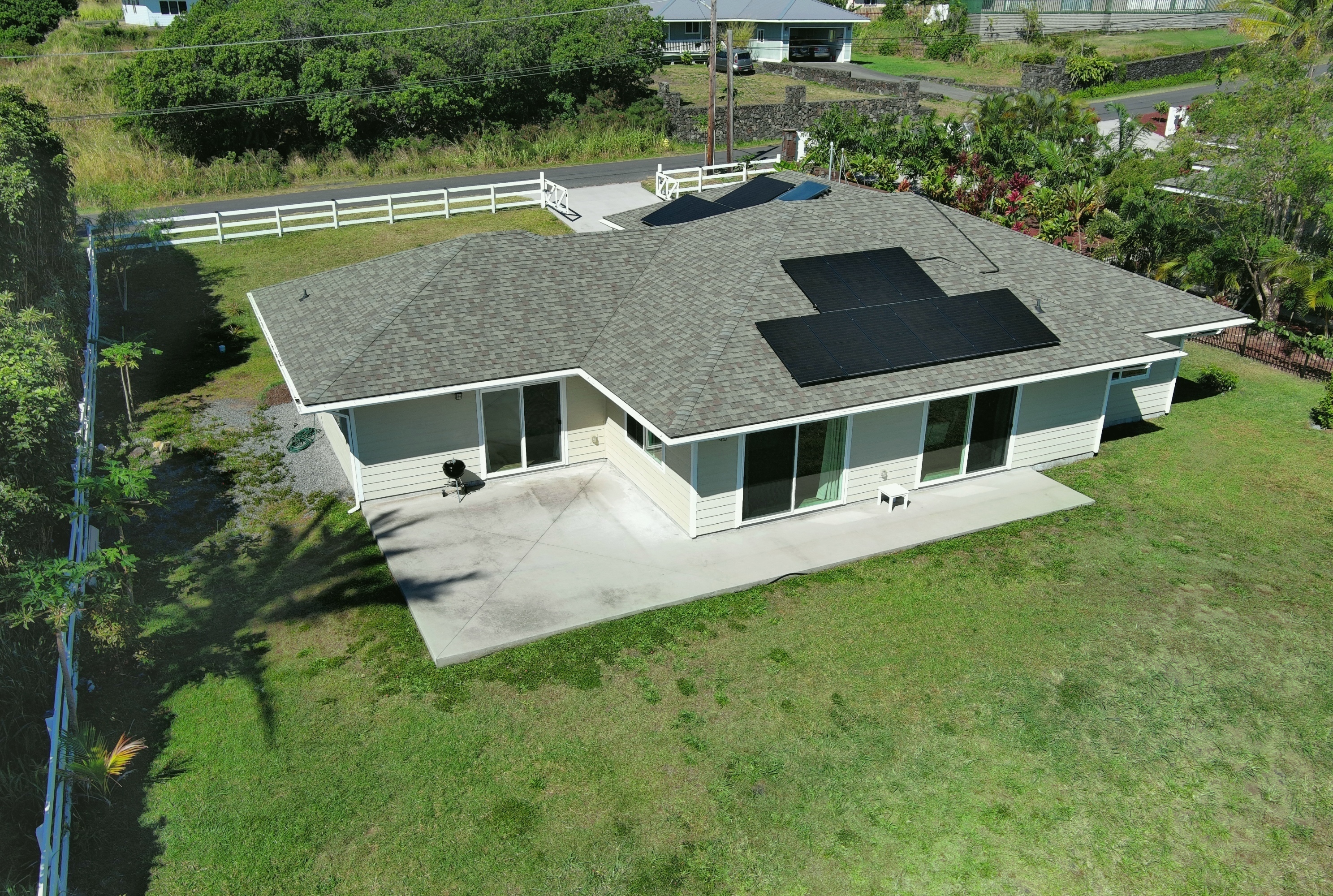 * If you want a large, one level, new home that backs to the golf course w/ocean views but don't want to spend thousands of dollars and hours of time on landscaping, furnishings & home necessities, look no further! * Built in 2021, this turnkey, move in ready home looks brand new & includes stylish contemporary furnishings w/everything you need to start living the Hawaiian lifestyle you have been dreaming of the minute you step through the door. Located along the 18th fairway in Discovery Harbour, you will enjoy beautiful views from all main rooms. * Save hundreds monthly on your electric bill with an OWNED (not leased) solar system by ProVision Solar w/Tesla battery backup, installed in 2023. * The entire property is framed by an attractive split-rail fence w/a pet-friendly lower section & remote-controlled entry gate at the driveway that preserves views while securing the property & creating a pleasant buffer from the golf course. Ring security system included as well. * The floor plan is ideal w/the open main living area at the heart of the home. The owners suite is privately situated on one side w/two additional bedrooms plus a full bath on the other. Kitchen, dining, & living areas combine into an inviting open-concept space ideal for entertaining. Interior living space is approximately 1,939 sq ft plus 600 sq ft of open patio space, for about 2,467 sq combined. Laundry room w/quality washer/dryer and work sink inside the home NOT out in the garage. * Landscaping includes a variety of fruit trees & plantings: papaya, banana, avocado, mango, lemon, Brazilian cherry, and more, supported by a drip irrigation system for easy care. * The designer kitchen is anchored by a massive quartz island and features custom cabinetry & a complete stainless appliance package. * The owner’s suite offers a generous walk-in closet, and private bath bathroom w/double sinks, quartz counters, stand-alone soaking tub, and oversized walk-in custom shower.
