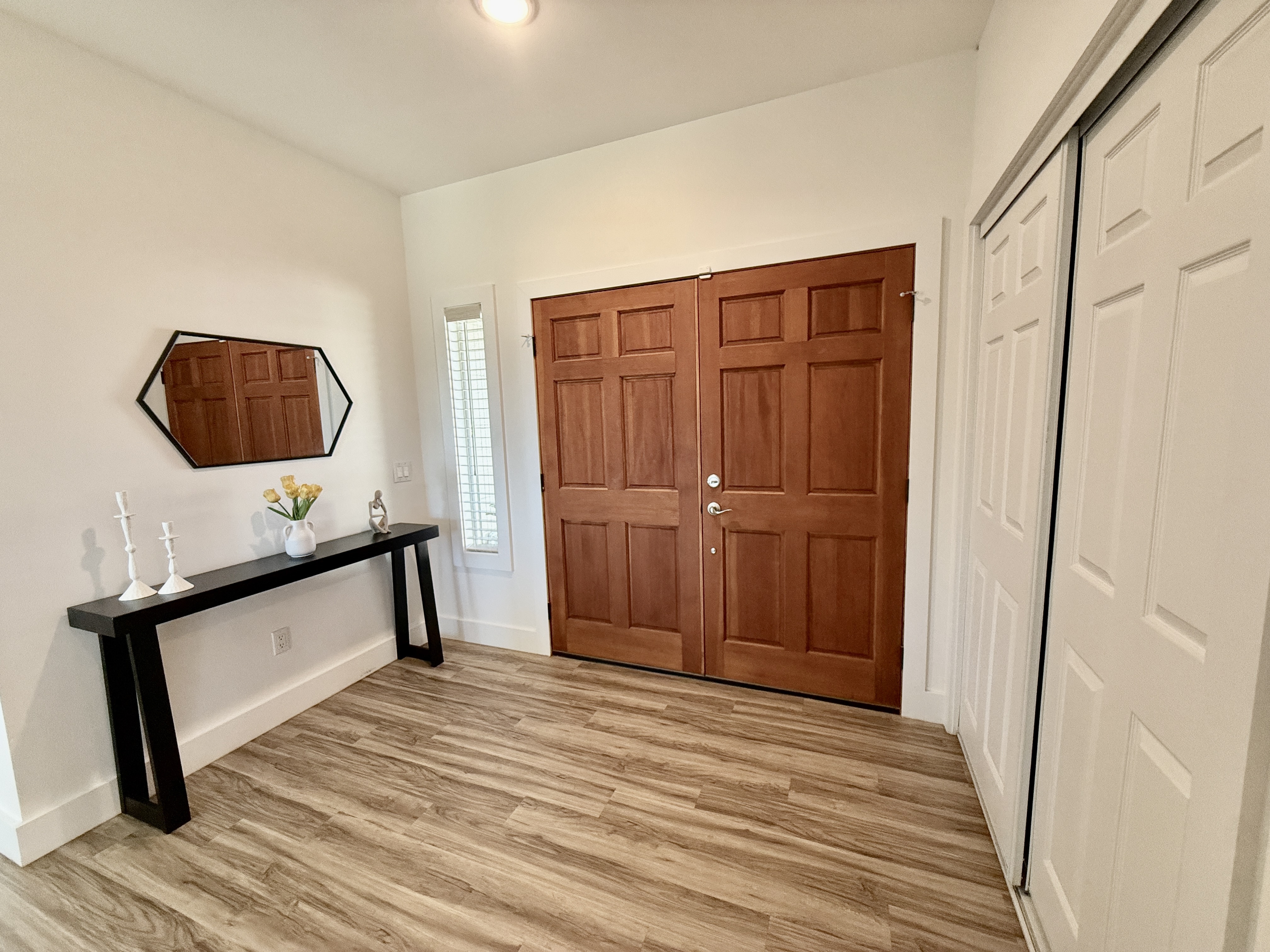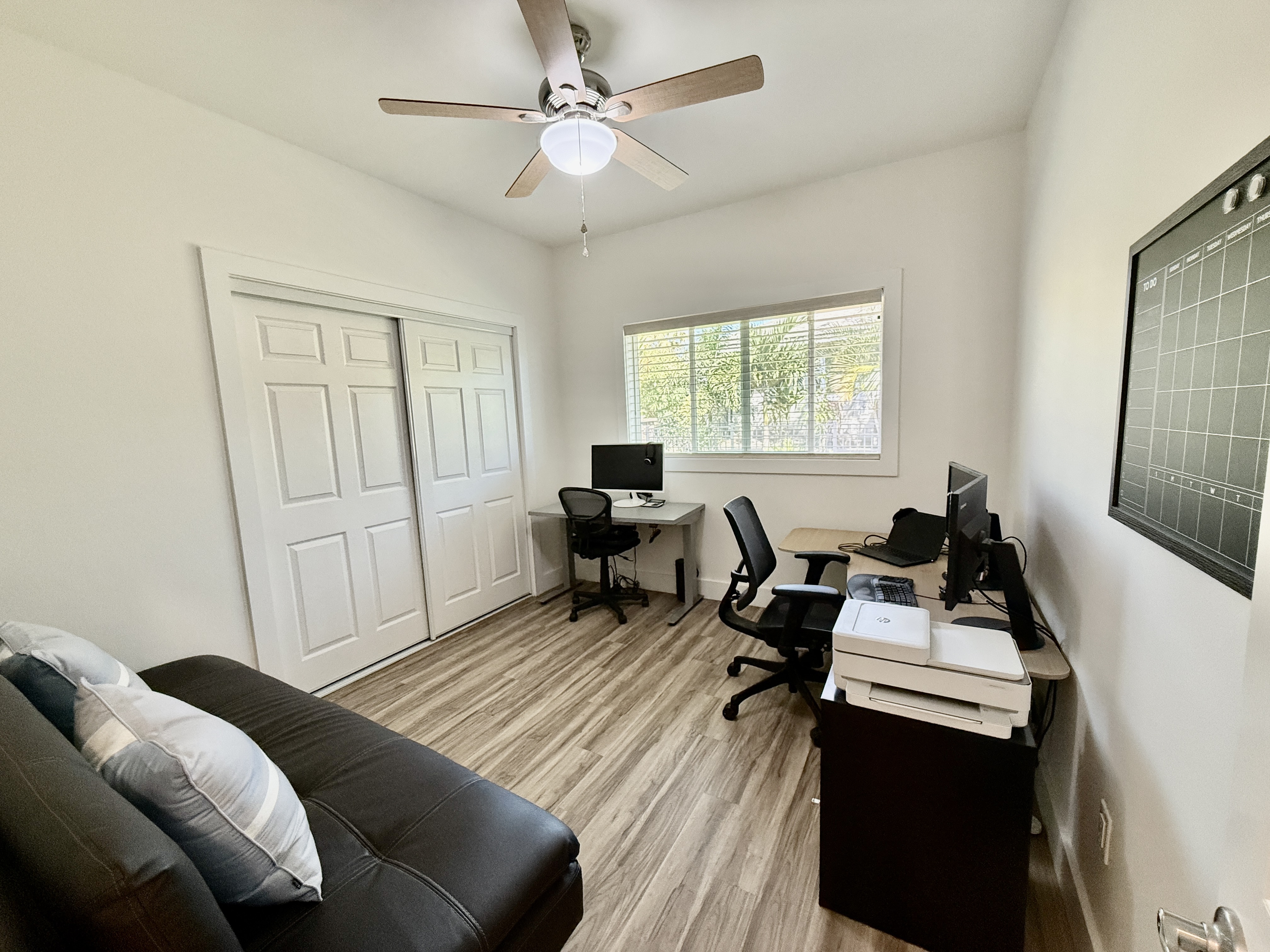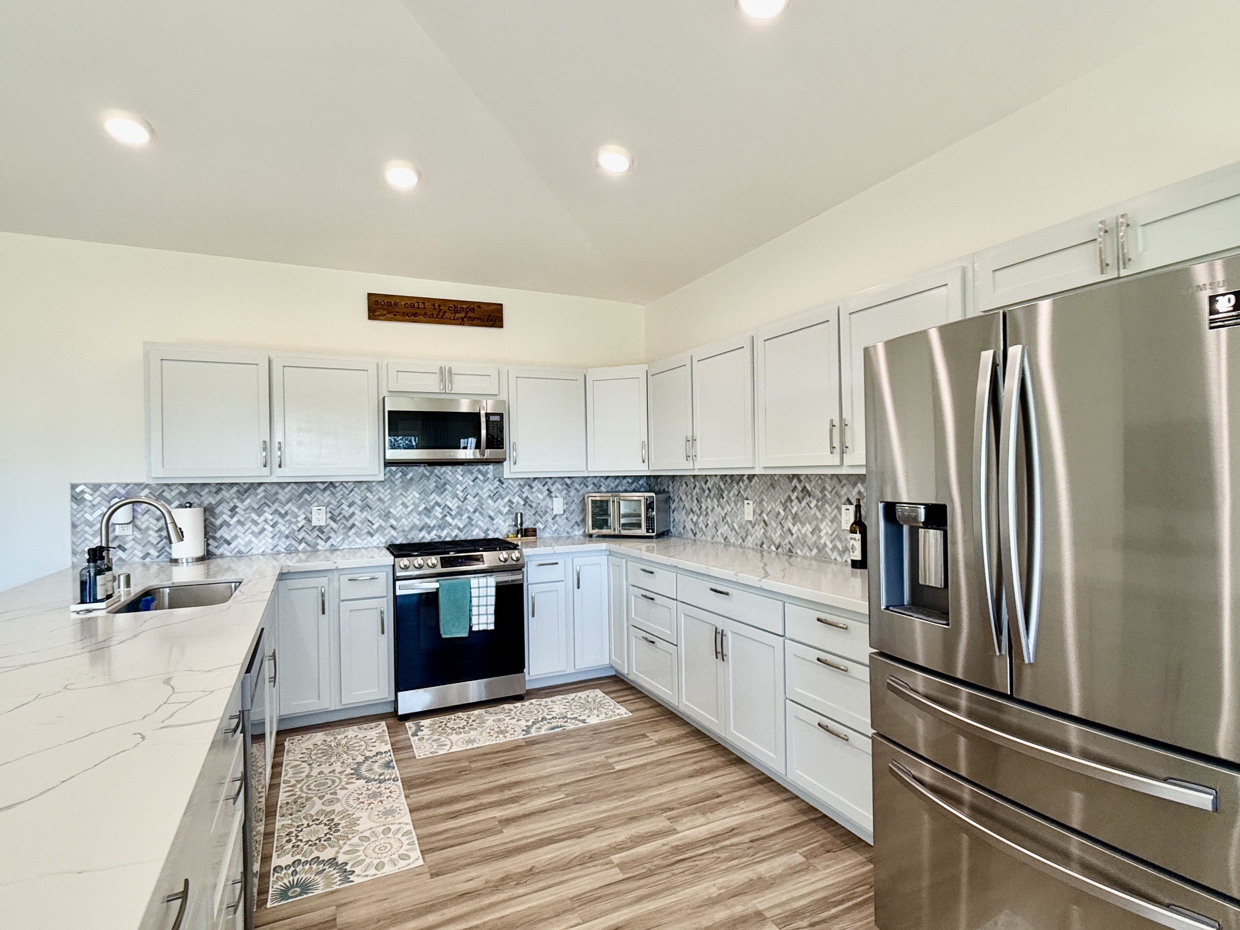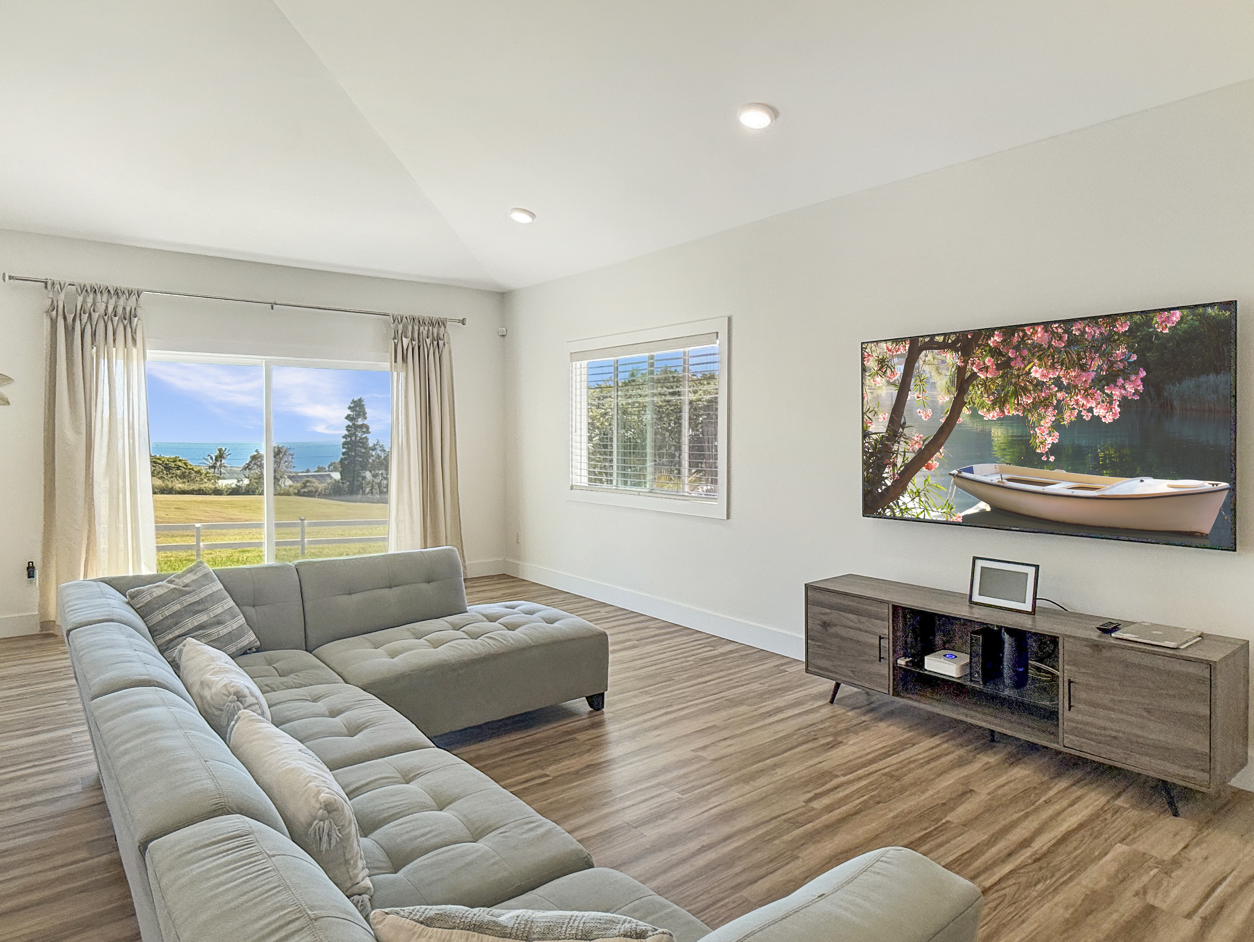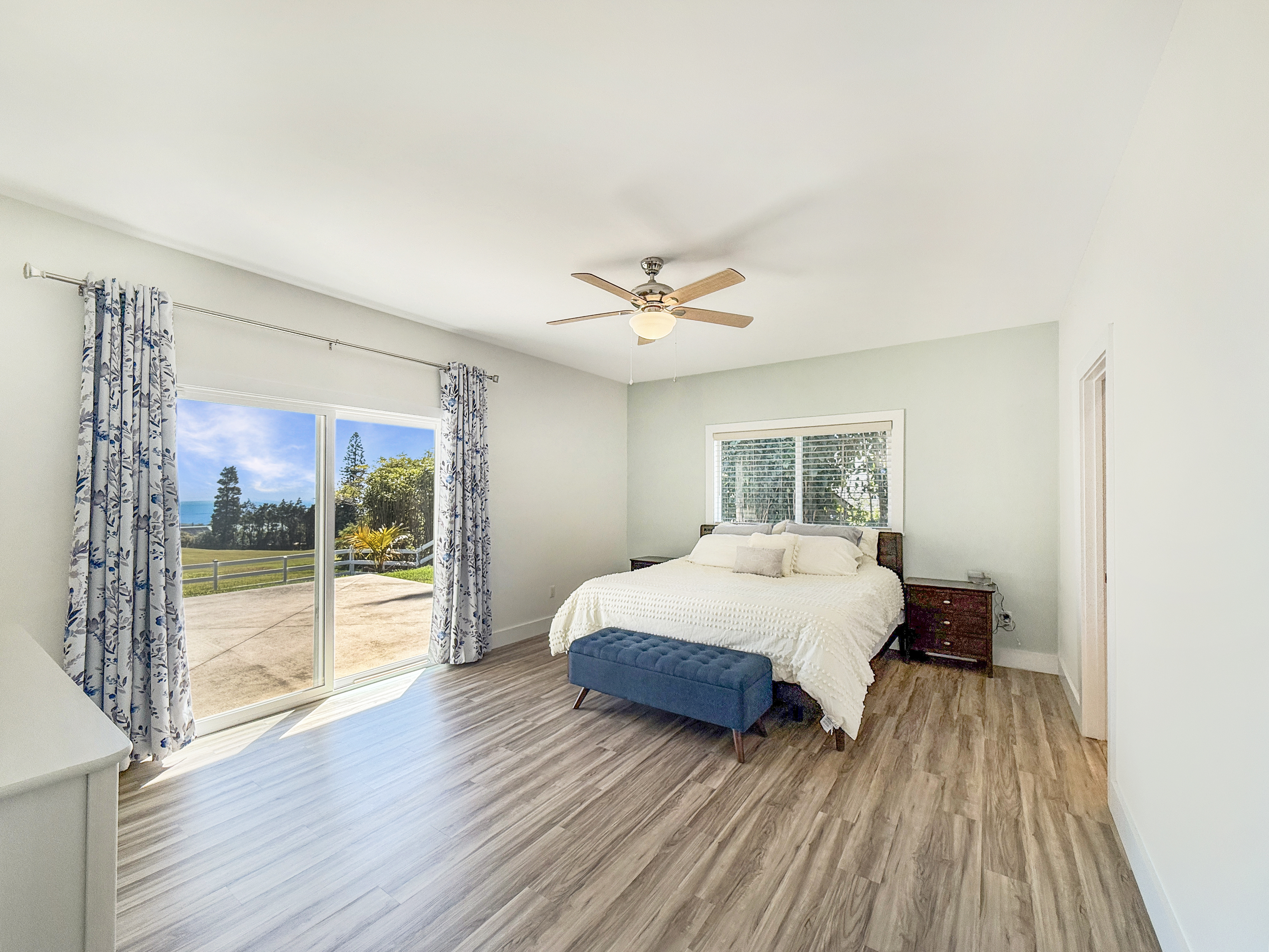 * If you want a large, one level, new home that backs to the golf course w/ocean views but don't want to spend thousands of dollars and hours of time on landscaping, furnishings & home necessities, look no further! * Built in 2021, this turnkey, move in ready home looks brand new & includes stylish contemporary furnishings w/everything you need to start living the Hawaiian lifestyle you have been dreaming of the minute you step through the door. Located along the 18th fairway in Discovery Harbour, you will enjoy beautiful views from all main rooms. * Save hundreds monthly on your electric bill with an OWNED (not leased) solar system by ProVision Solar w/Tesla battery backup, installed in 2023. * The entire property is framed by an attractive split-rail fence w/a pet-friendly lower section & remote-controlled entry gate at the driveway that preserves views while securing the property & creating a pleasant buffer from the golf course. Ring security system included as well. * The floor plan is ideal w/the open main living area at the heart of the home. The owners suite is privately situated on one side w/two additional bedrooms plus a full bath on the other. Kitchen, dining, & living areas combine into an inviting open-concept space ideal for entertaining. Interior living space is approximately 1,939 sq ft plus 600 sq ft of open patio space, for about 2,467 sq combined. Laundry room w/quality washer/dryer and work sink inside the home NOT out in the garage. * Landscaping includes a variety of fruit trees & plantings: papaya, banana, avocado, mango, lemon, Brazilian cherry, and more, supported by a drip irrigation system for easy care. * The designer kitchen is anchored by a massive quartz island and features custom cabinetry & a complete stainless appliance package. * The owner’s suite offers a generous walk-in closet, and private bath bathroom w/double sinks, quartz counters, stand-alone soaking tub, and oversized walk-in custom shower.