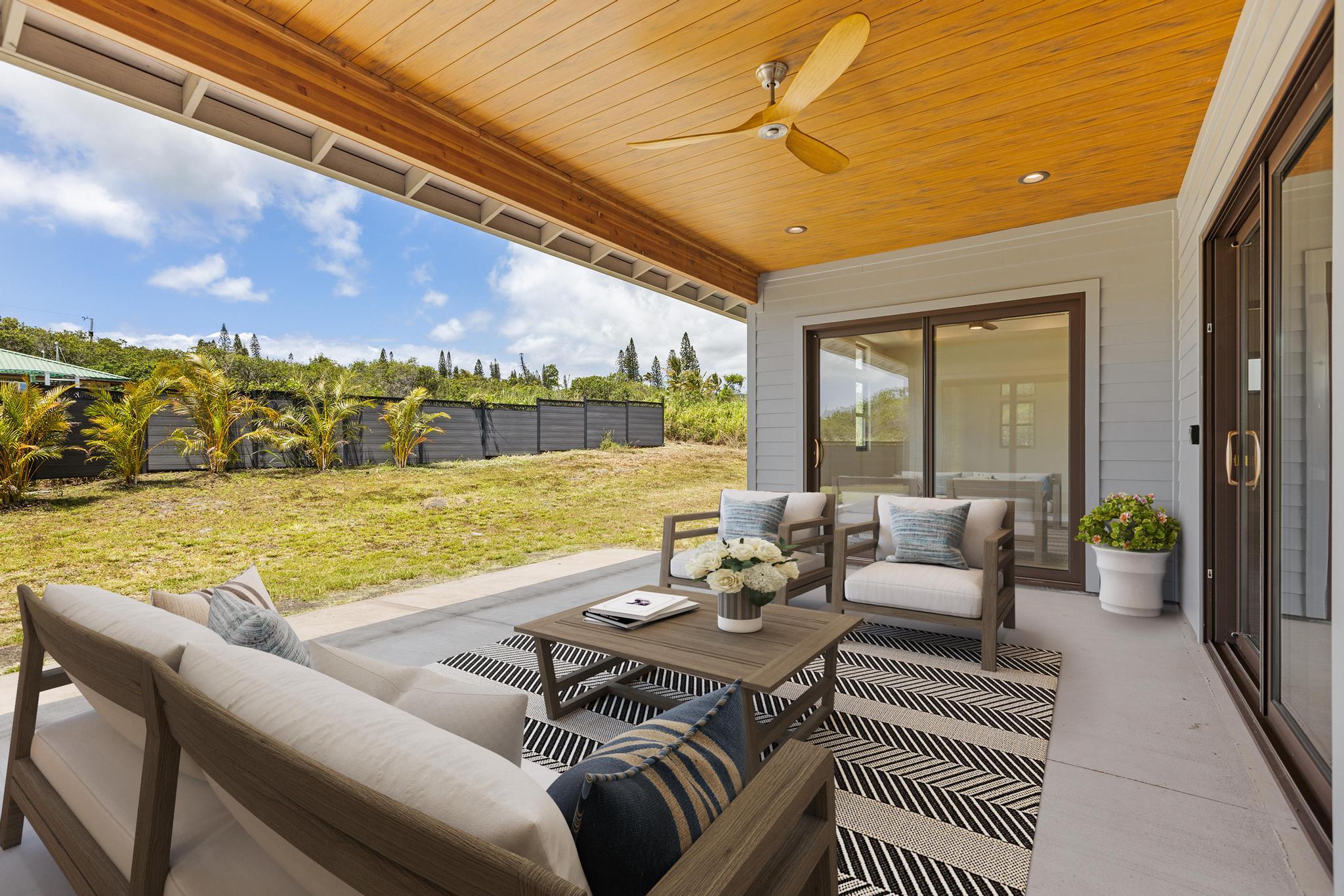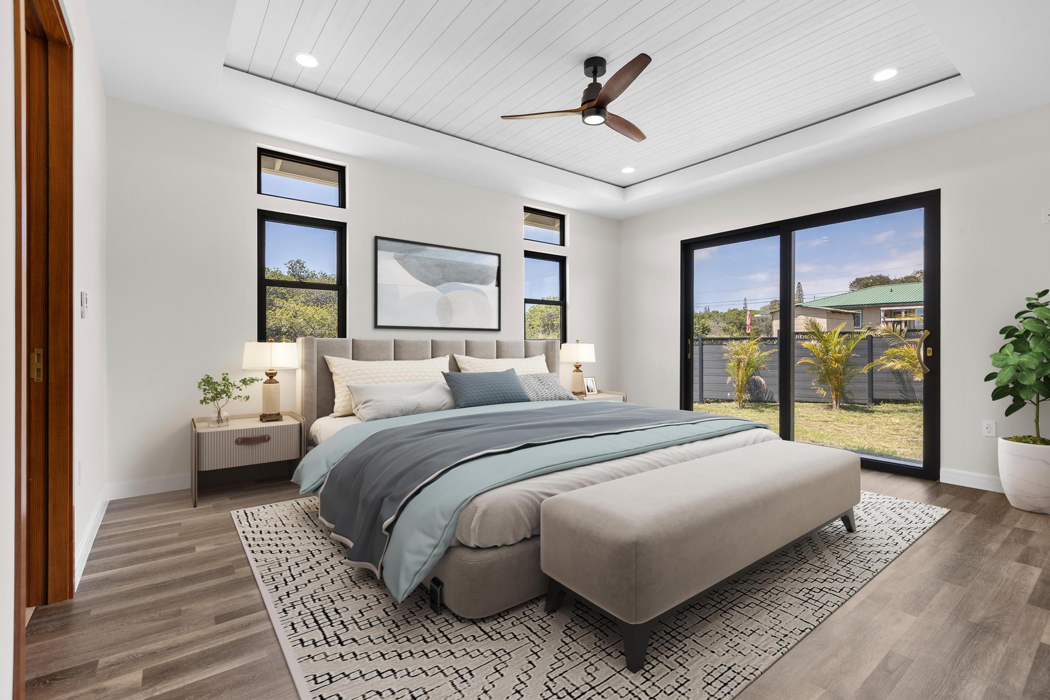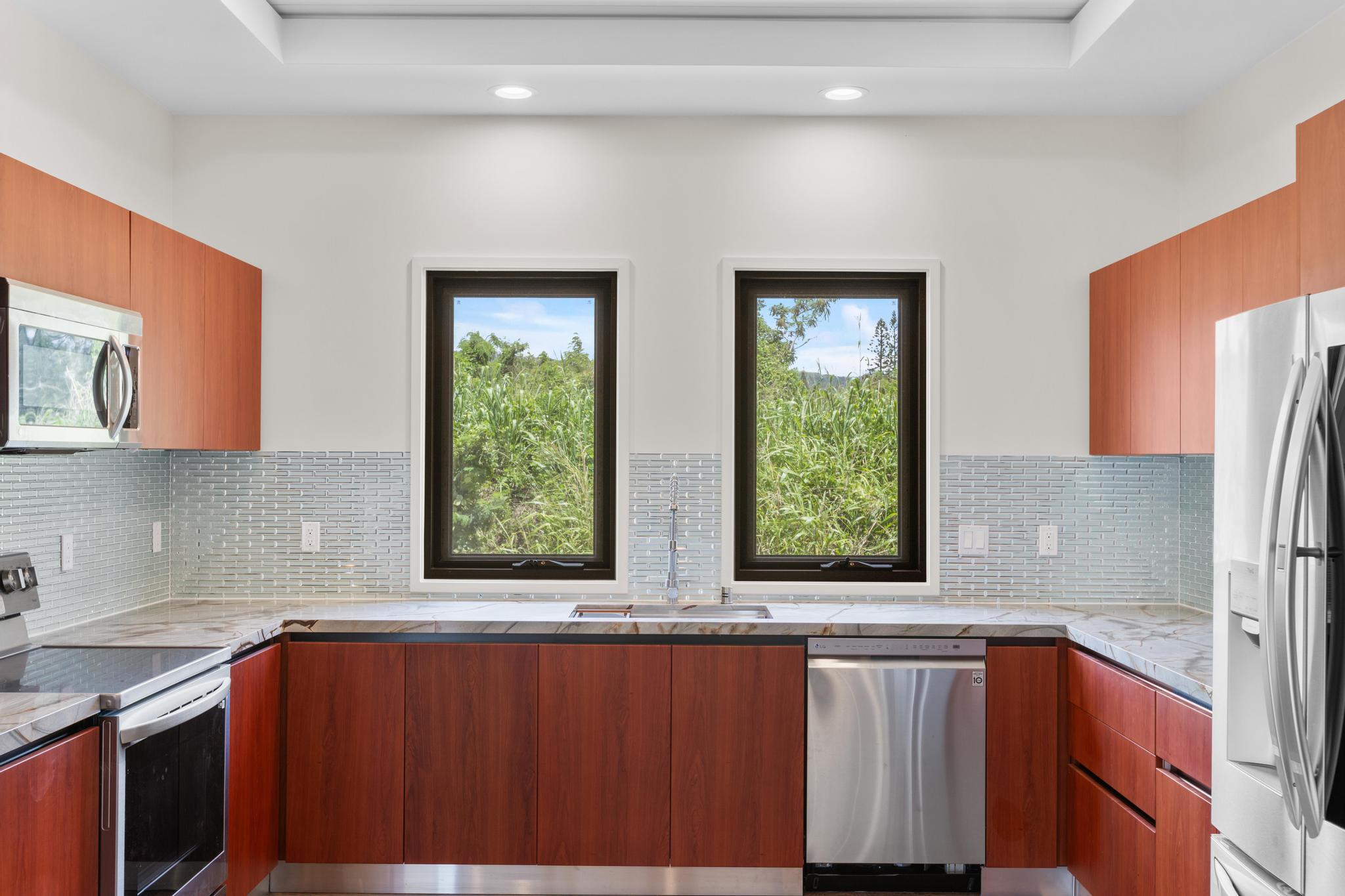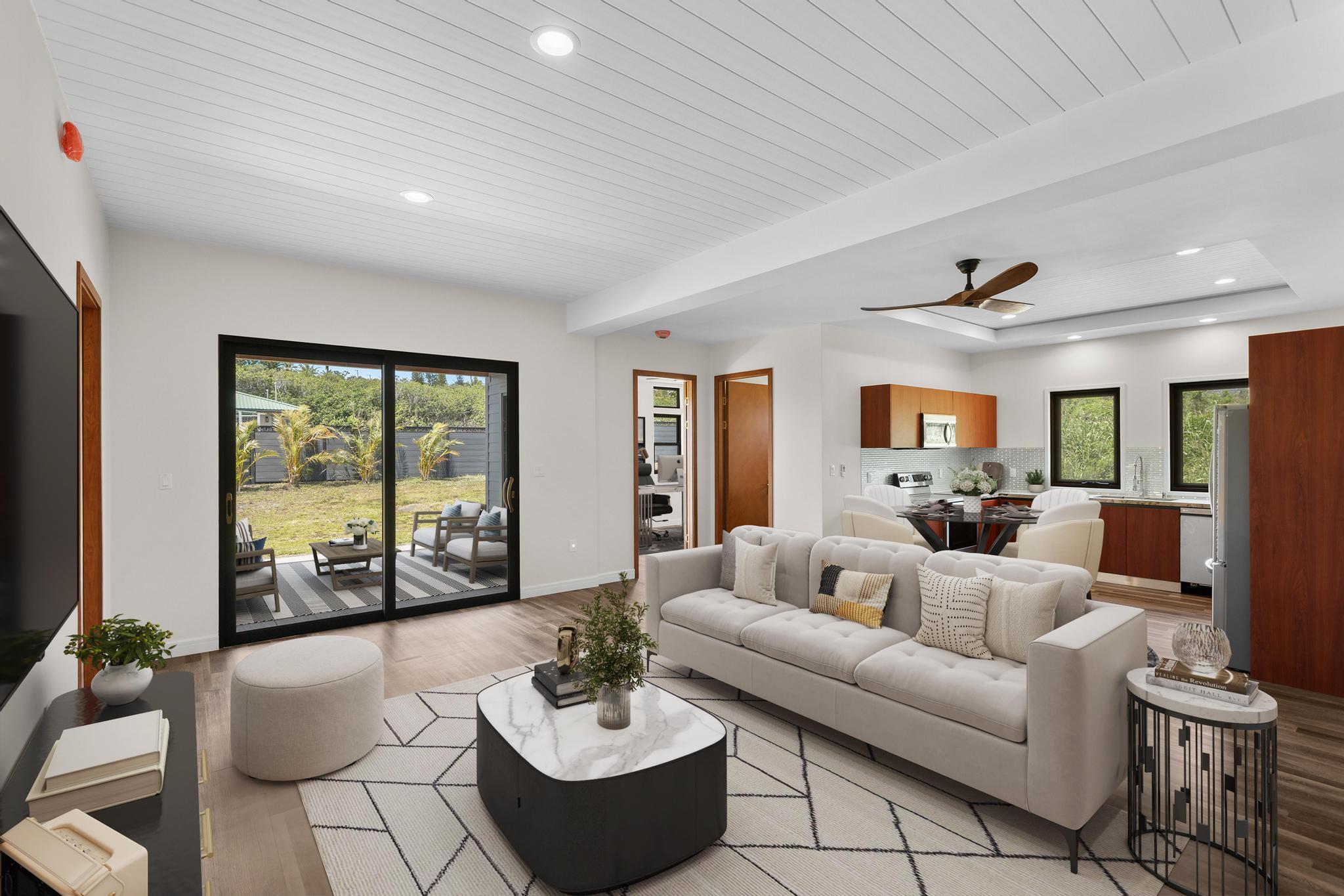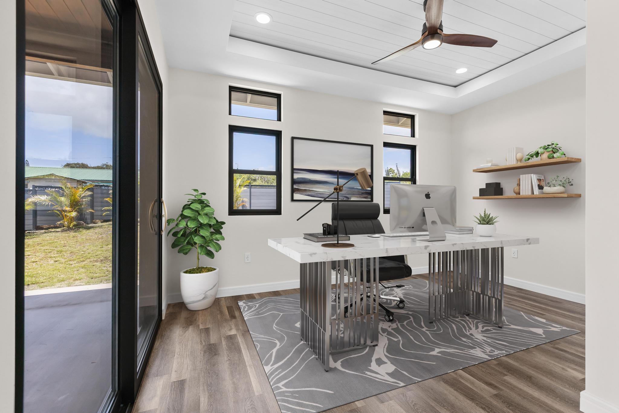Discover modern island living in this newly built home in Discovery Harbour. Designed with both style and durability in mind, this property features low-maintenance, long-lasting exterior materials including Hardie cement fiberboard siding and a laminated asphalt shingle roof–ideal for Hawaii’s climate. Step inside to a thoughtfully designed interior with 10-foot ceilings throughout and elegant tray ceilings in the bedrooms, creating an open and airy feel. The stunning front entry door makes a bold first impression and includes a built-in camera and fingerprint entry for added security and convenience. The spacious primary suite is a true retreat, featuring two sets of custom sliding doors that flood the space with natural light and provide seamless indoor-outdoor flow. Enjoy a spa-like ensuite with a stone soaking tub, walk-in shower, and a large walk-in closet. A well-designed floor plan includes a second suite with its own private bathroom–perfect for guests or multi-generational living–while the third bedroom offers flexibility as a home office, creative space, or additional guest room. Features & Highlights: - New construction with modern design - Durable Hardie cement fiberboard exterior - Laminated asphalt shingle roof for longevity - 10-foot ceilings with tray ceilings in bedrooms - Luxurious primary suite with stone soaking tub & walk-in shower - Large kitchen pantry - Large walk-in closet in primary bedroom - Two sets of custom sliding doors for natural light - Second suite with private bathroom - Flexible third bedroom / home office - Smart front door with camera & fingerprint entry - Low-maintenance construction–ideal for island living - Portion of backyard fenced with Eureka Palms recently planted for privacy - Close to golf course, shopping, dining, and South Point Modern comfort, smart design, and durable construction come together in this exceptional Big Island home.
