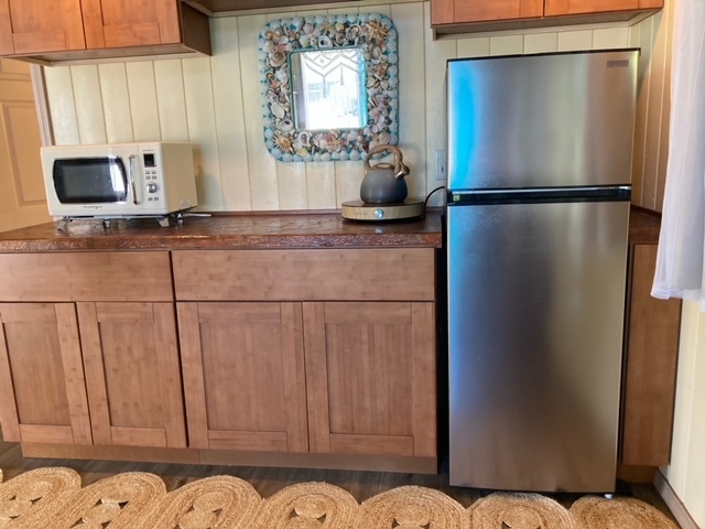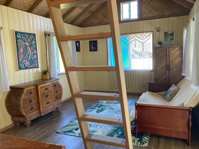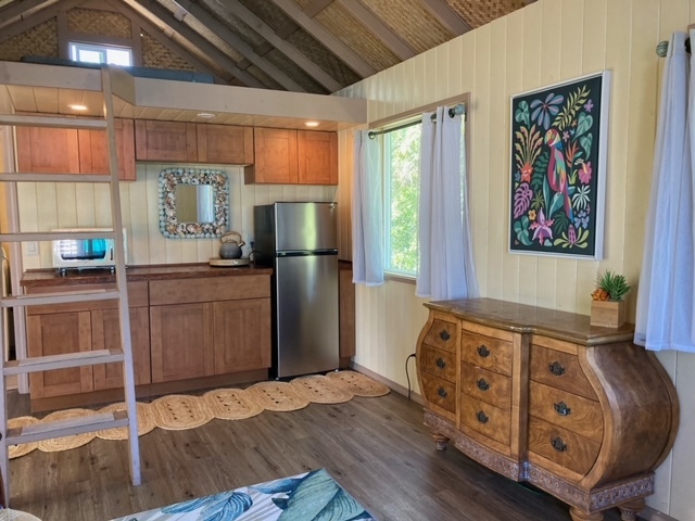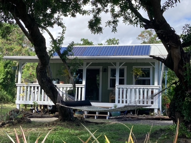 Green Sand Subdivision - Correct address is 94-6312 Mauka St. Great little unpermitted studio cabin with a loft and a front porch with removable pet gate to help keep them secure - also has a nicely fenced yard and is located in a small rural community. This studio has a spacious main room, kitchenette area, full bath and a sleeping loft with a lauhala lined ceiling. On the front porch is the kitchen sink and a propane camping stove with burners & an oven, and the microwave and refrigerator are inside the cabin. The countertop is made of laminated wood products. The large loft area could be the main sleeping space or extra room for guests, if the studio is used as the bedroom. Furnishings in the photos are included. The full bath has a tub/shower combo and a washing machine. Owned PV system with some newer components (2 SoK batteries and EG4 inverter) generates more power than is needed to run the house. Built in 2024, this property also has a newer 6500 gallon steel water catchment tank and a small septic tank. Per Helco, power is available at the street with an SSPP assessment of $1,563 with approved building plans. Lava Zone 6, Flood Zone X. Lounge in the hammock in the front yard & enjoy the beautiful yard full of flowers and edible plants. Some of the plantings include: lime, avocade, white pineapple, banana, papaya, rubber tree, orange, green and red ti and more. New white vinyl fencing separates this property from the neighbors on both sides. Green Sands is part of Na'alehu town where you'll find several Ka'u coffee shops, the Punalu'u Bake Shop, a post office, credit union, hardware store, other restaurants and also the popular Weds and Fri OKK farmer's markets. Check out the southern part of The Big Island with it's old Hawaii charm! Both Kailua-Kona and Hilo have international airports and most major services. Check out the 360 virtual tour!