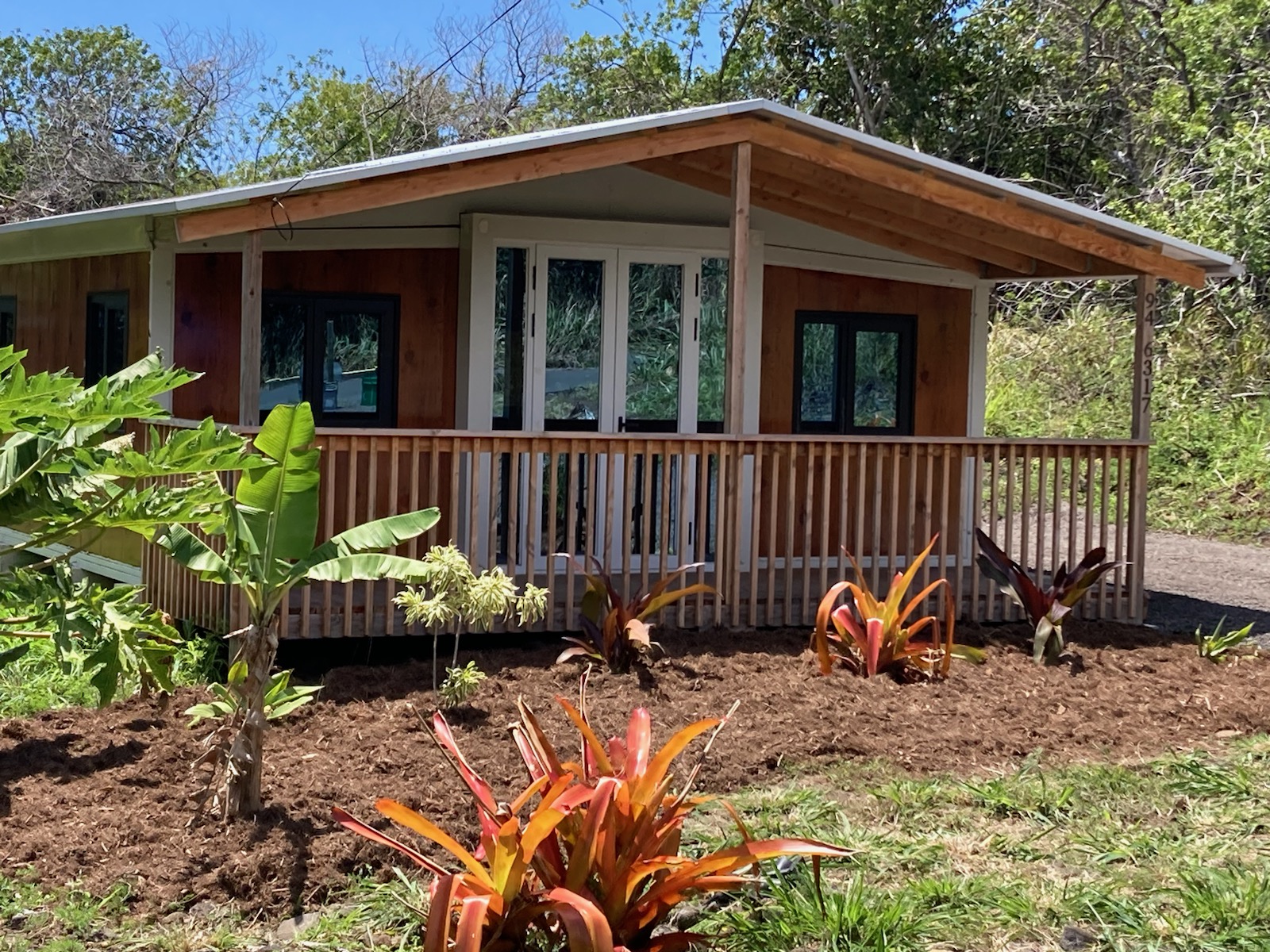 New 2 bedroom, 1 bathroom, prefab off grid home in beautiful Green Sand subdivision. Enter this house through the front covered lanai and into the open concept living room, dining and kitchen area. The kitchen has plenty of cabinets with soft closed drawers, stone countertops, and upper wall cabinets for additional storage. Appliances include a refrigerator and propane cooktop. One full bathroom has a large walk-in shower with heavy duty glass shower doors, a 48 V solar system with 6 460 W panels with lithium battery and a 3200 gallon water tank with cover support. Perfect setup for sustainable off grid living! Home has high speed WiFi and security cameras. This property is nicely landscaped including several papaya trees and banana trees.