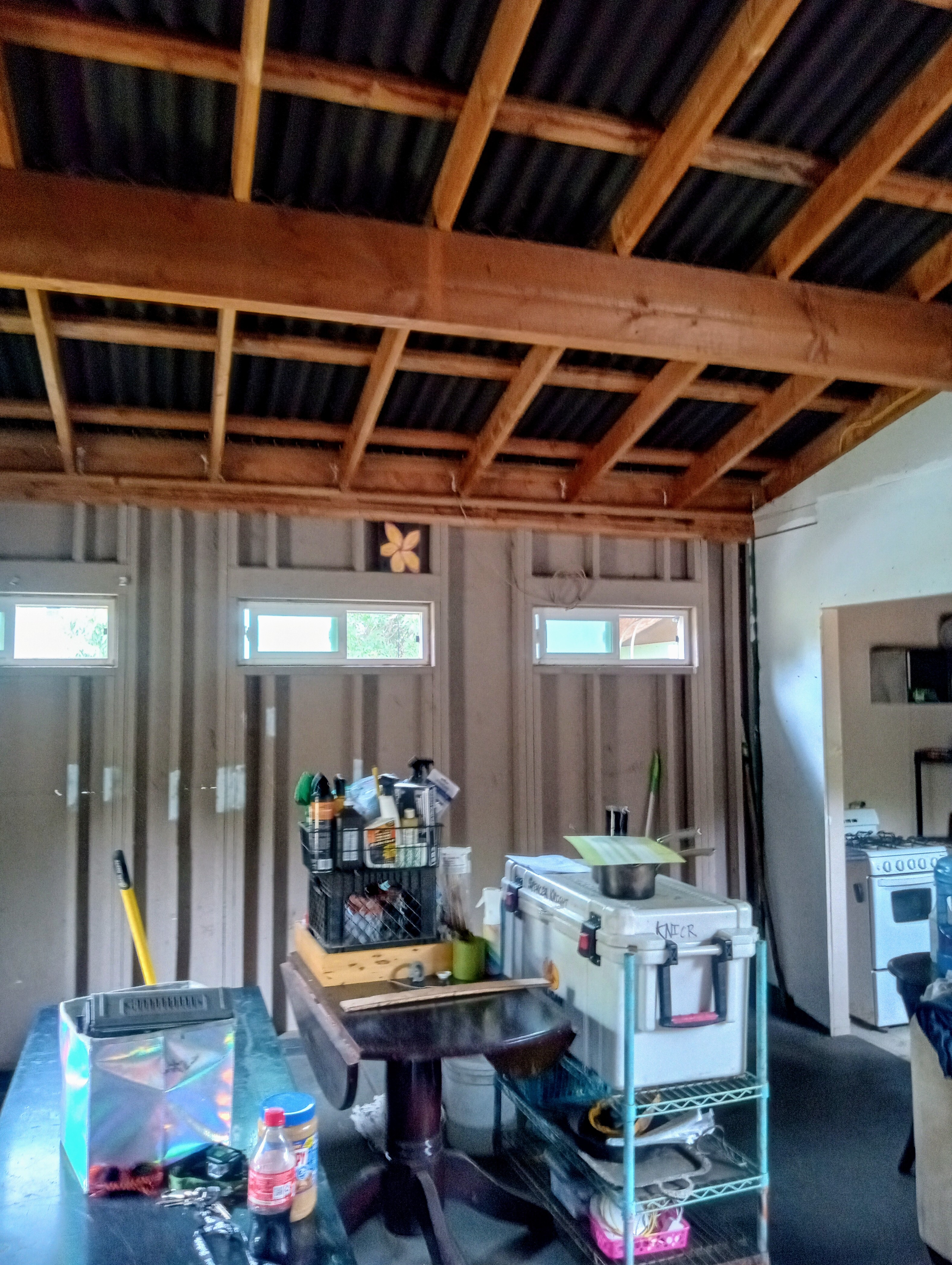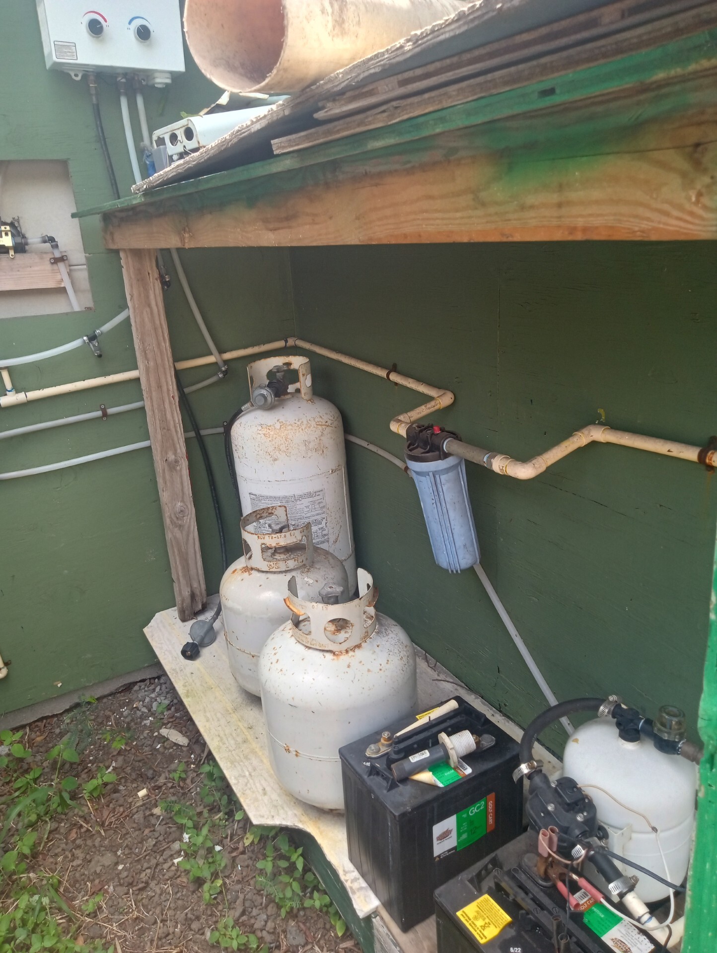 2 water storages, each 250 Gallons, Generator, and was set up for solar before with some infrastructure in the solid utility shed. Propane water heater and stove.