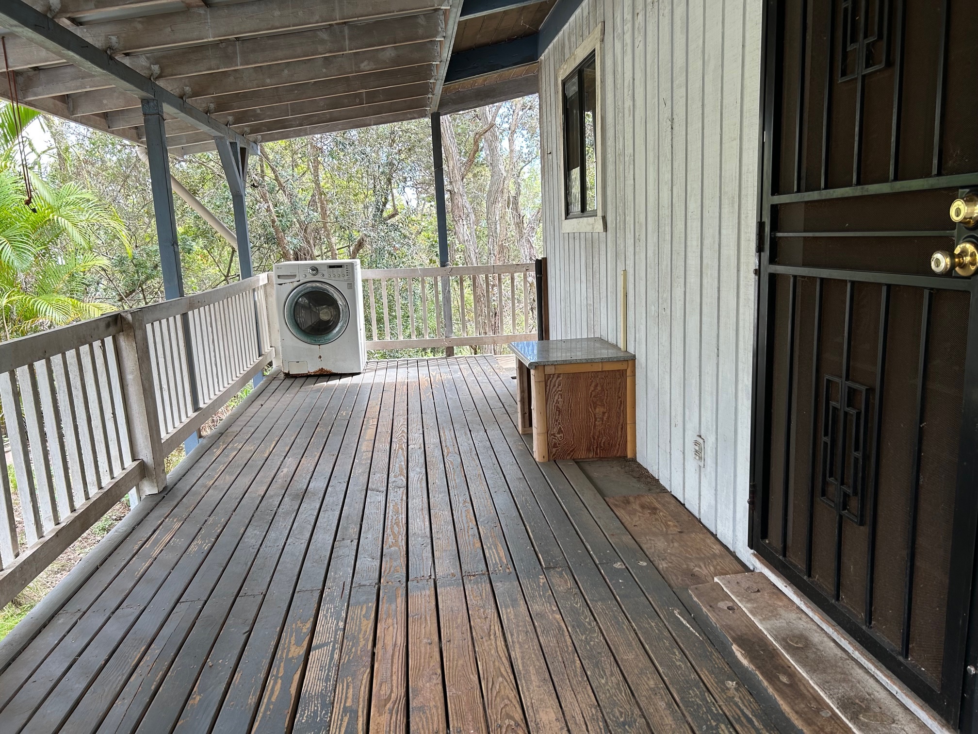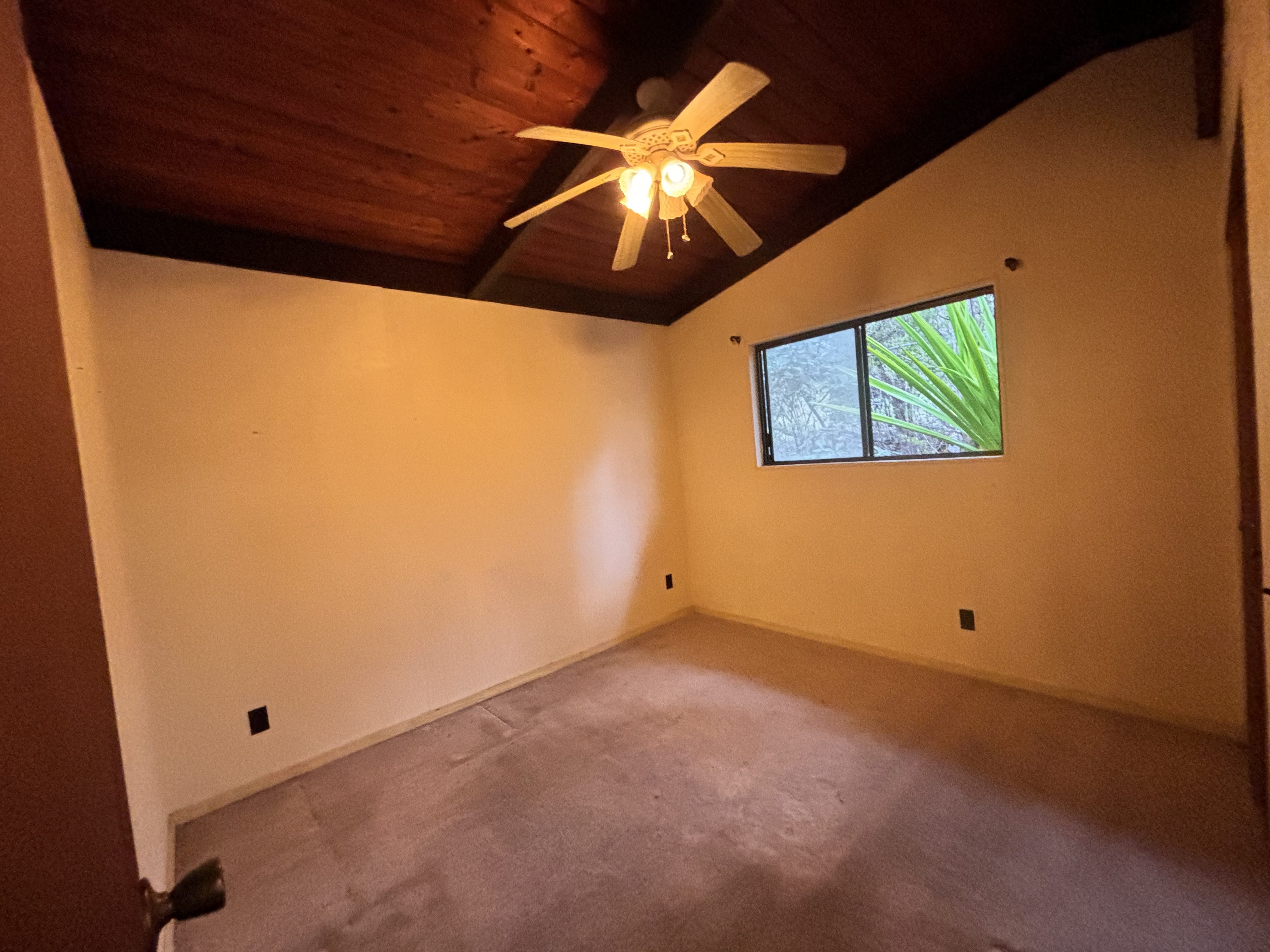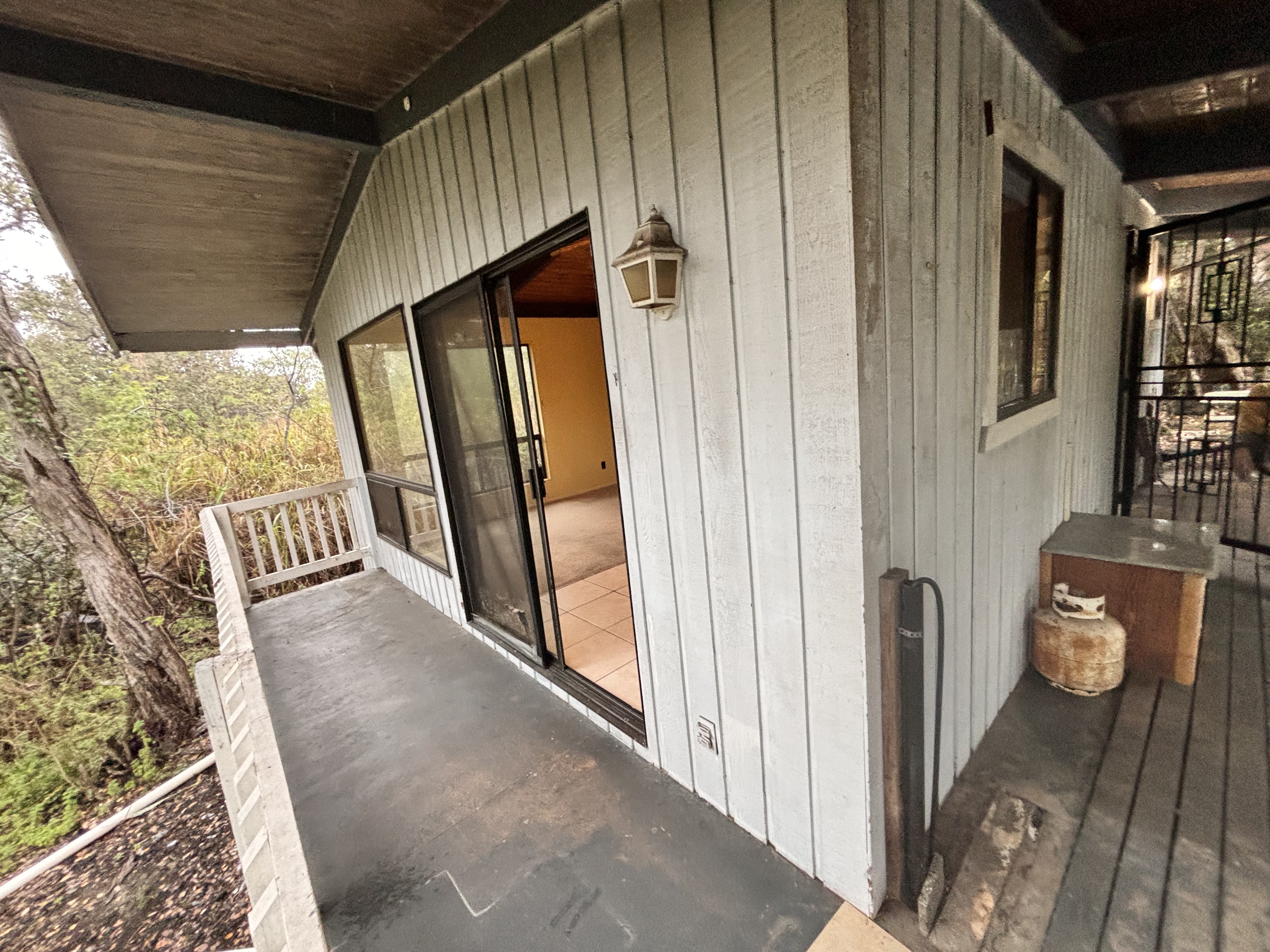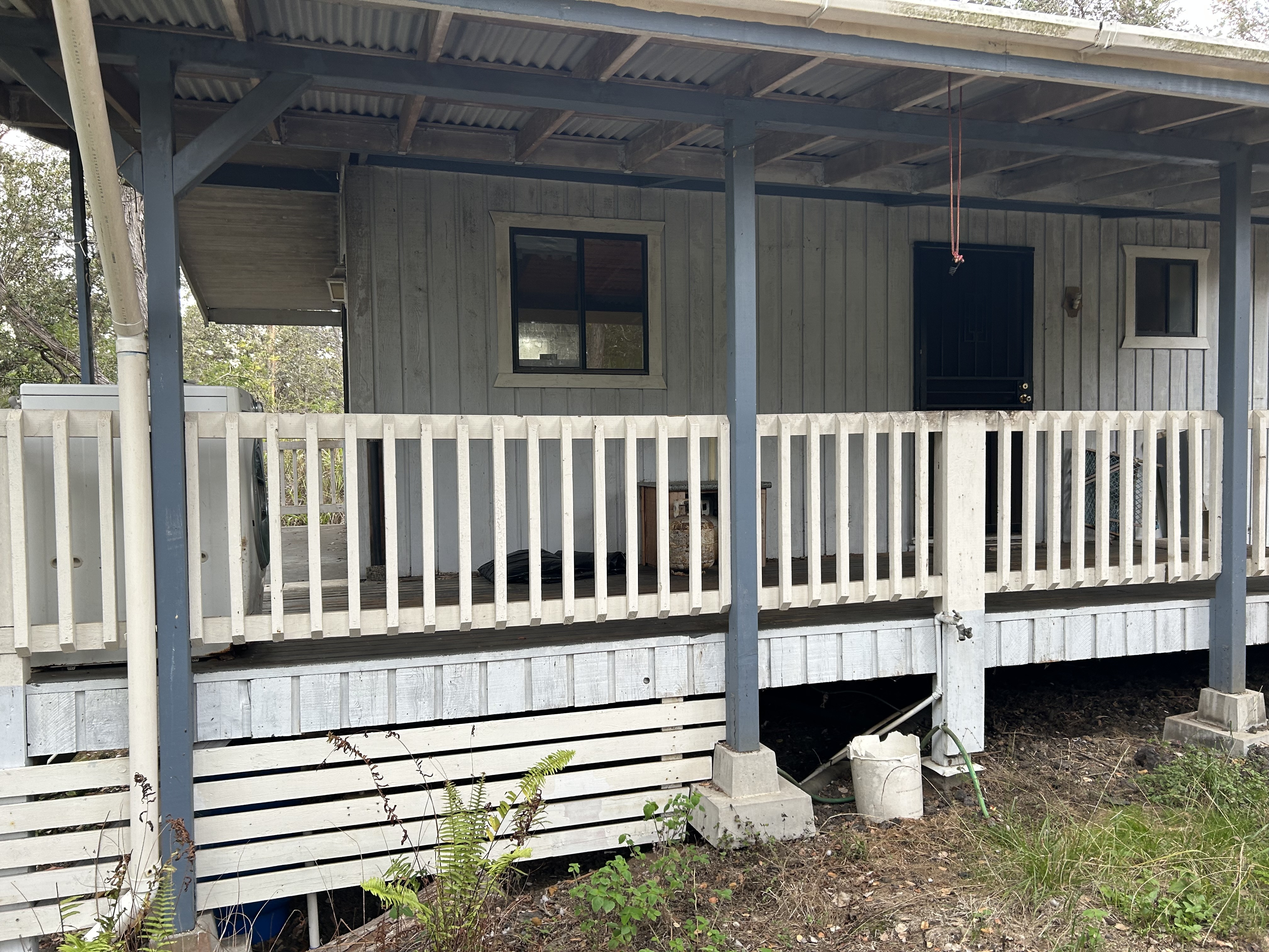 Private, gated and tucked away on 1 acre of land surrounded by lush vegetation. Main house consists of an updated 2 bedroom, 1 bath home which features vaulted ceilings, granite countertops, soft close cabinets, newer appliances, newer floors, a tiled bath and laundry room. Escape onto your screened-in lanai which is an added living space of more than 200 square feet. The inside laundry room leaves ample space to add a washer and dryer, plus room for cabinets for more storage. Private pathway extends to the back of the property where tucked away is the 2nd building with a covered lanai sits. Each house has its own separate water catchment tank and circle driveway. Great for extended family, workshop or gym! Experience the privacy this hidden gem has to offer. Property is being sold As-Is. Current TIR and previous survey available with accepted offer. No showings on Saturday. By appointment only. No Trespassing.