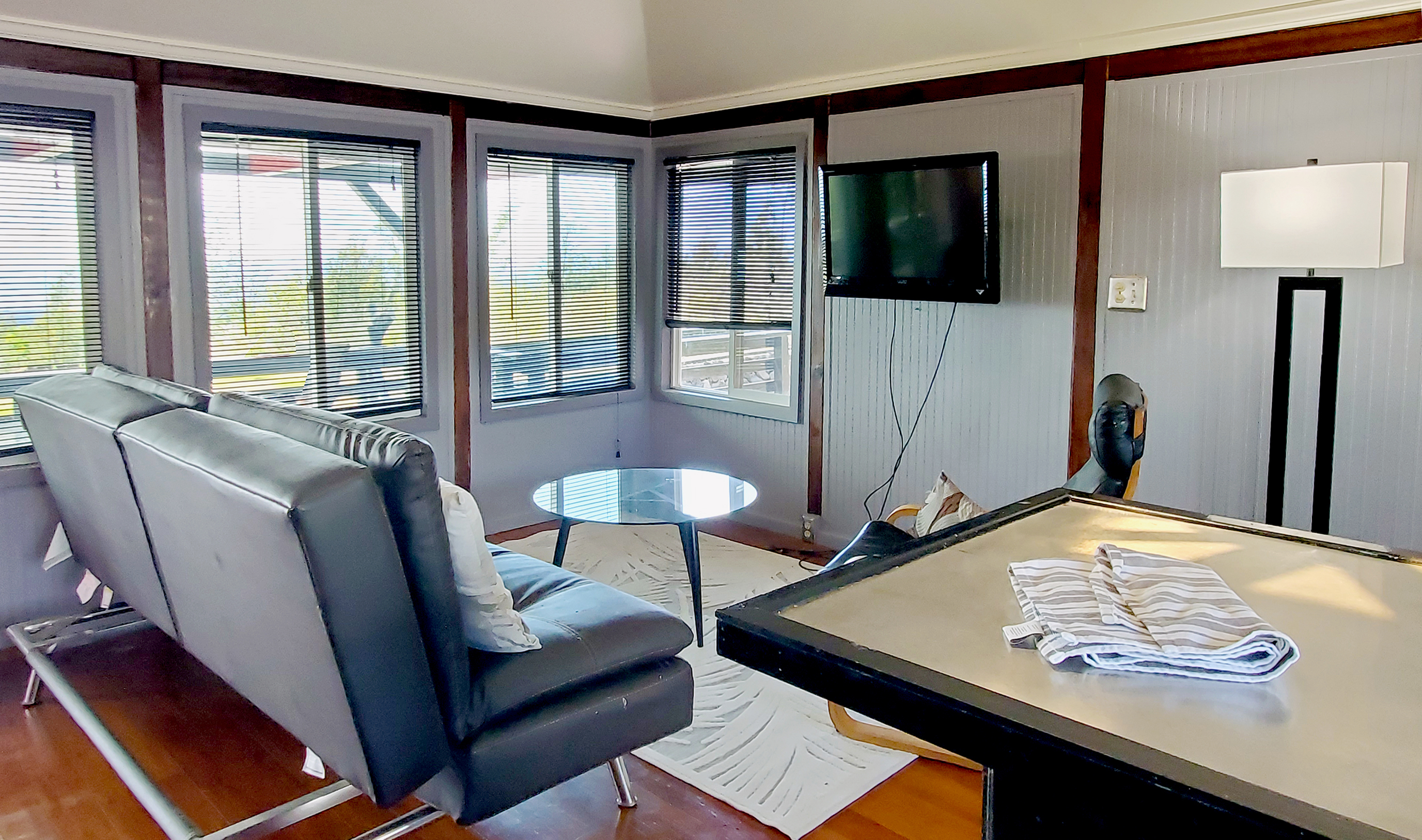 Fold-out couch, chair, TV, coffee table, movable serving bar