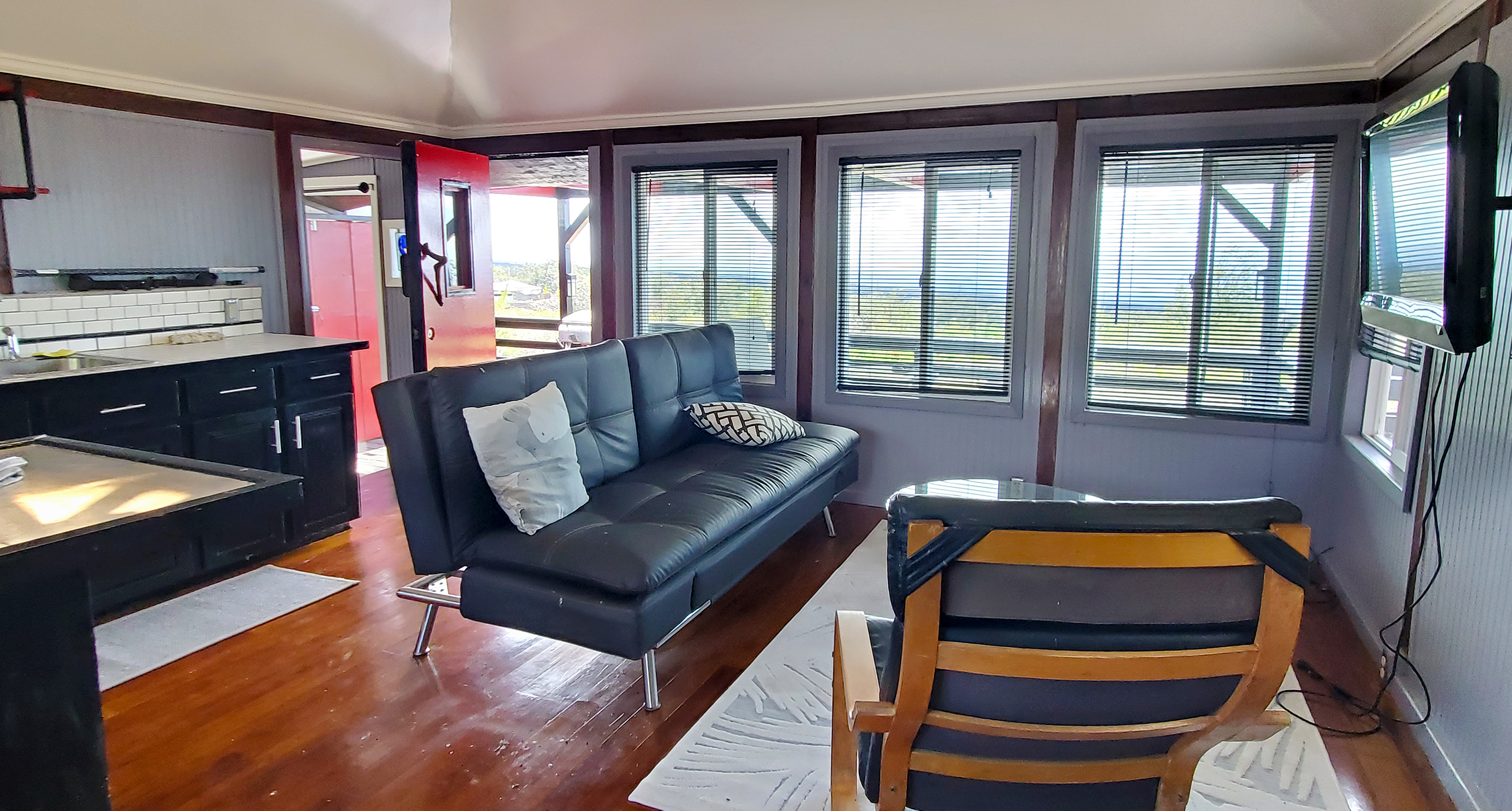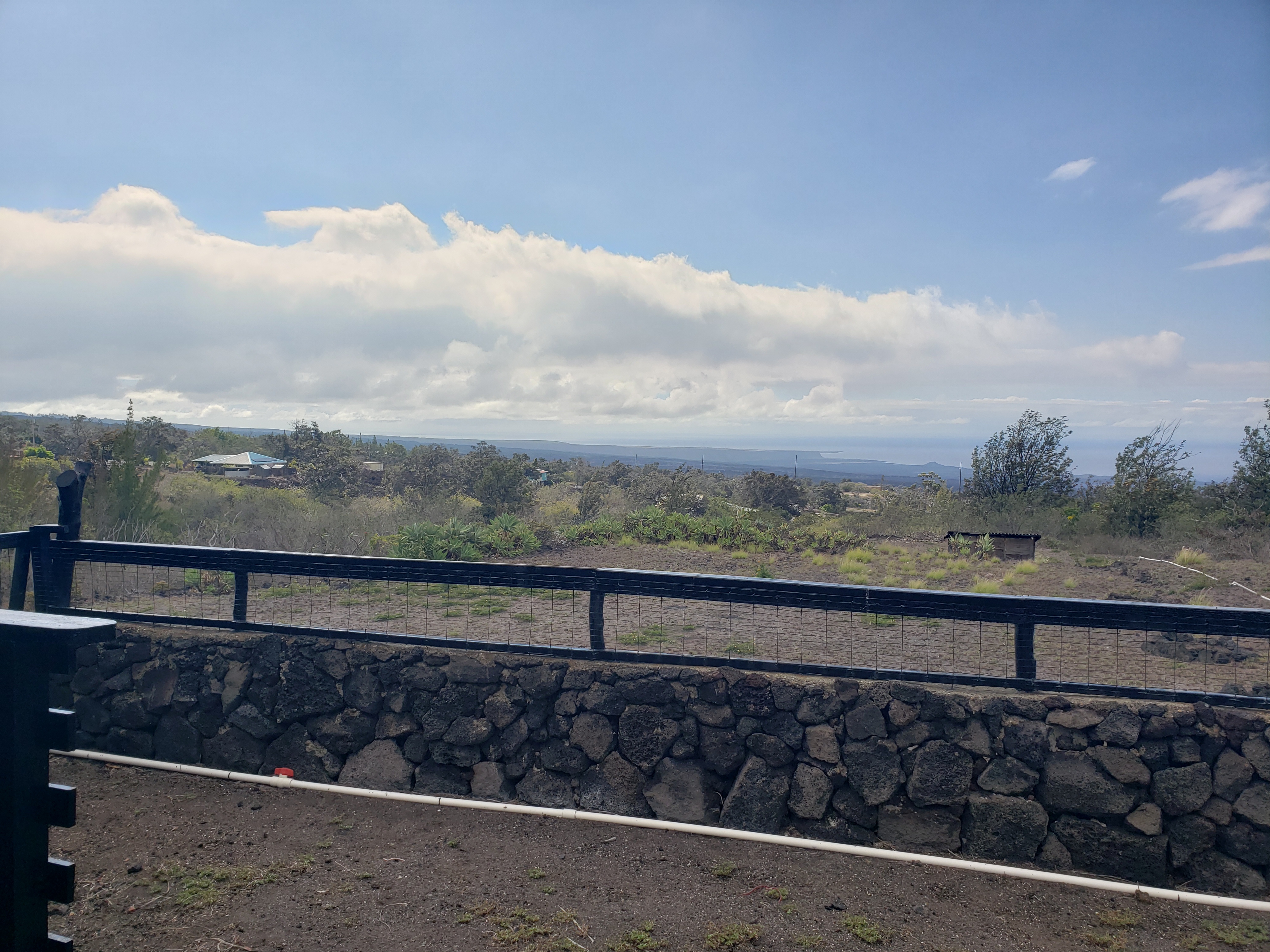 Hale Anuenue "House of Rainbows" Charming road appeal with vast views of the South Point Ocean coastline. Feel the openness! This convenient prime location is only 2 blocks from the highway. One of the best features is the Polynesian-style roofed bungalow with a skylight to accent the high cathedral ceiling and a large fan to circulate air flow. The natural uplifting lighting provides ambiance for the living room.