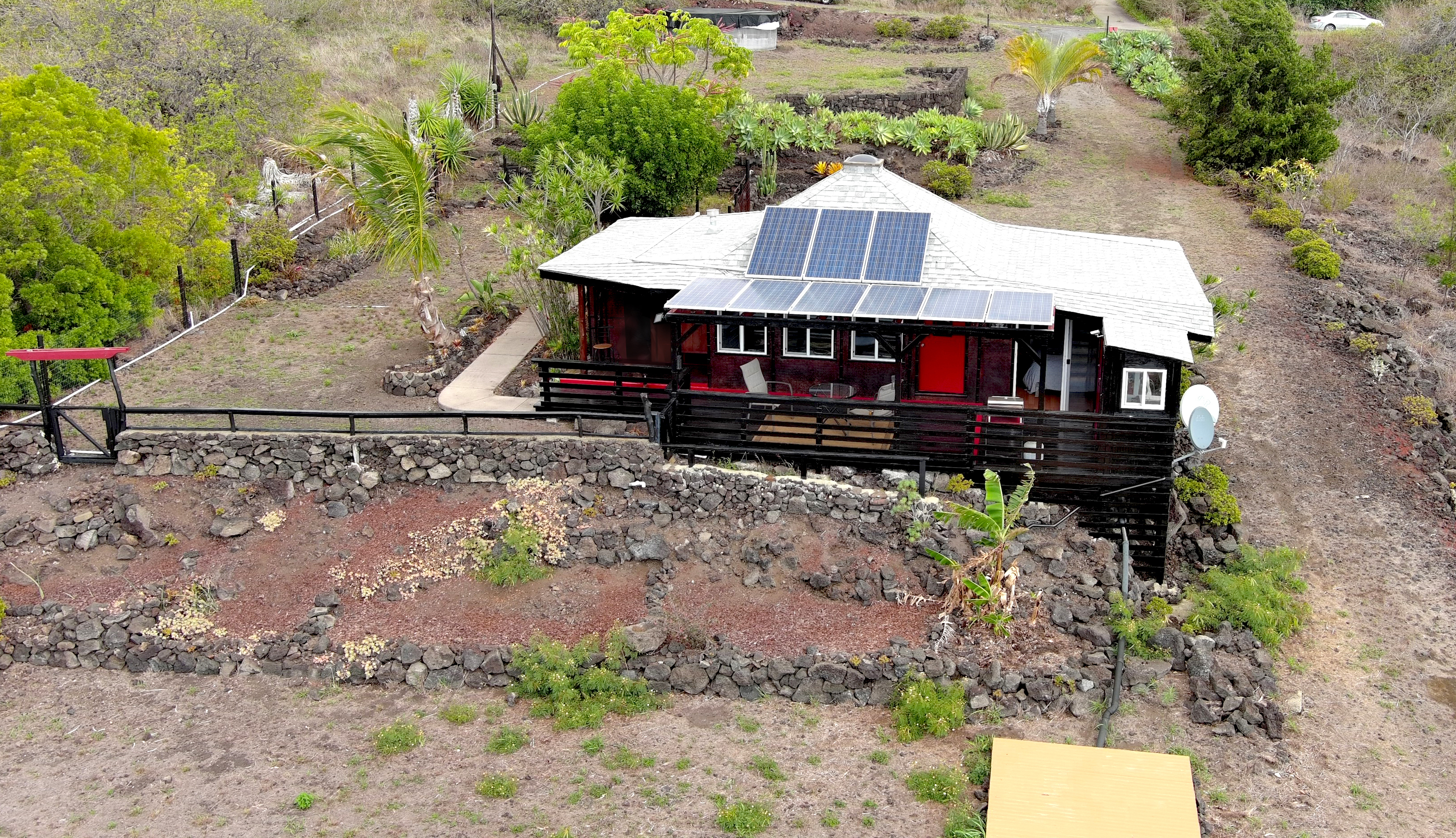 The entire property is cleared, leveled, and well planned out. The front has a leveled raised house pad with a driveway. and a terraced rock wall. The 16,000-gallon water catchment is at the front corner. Easy to fill tank. Waterline to the back of the lot