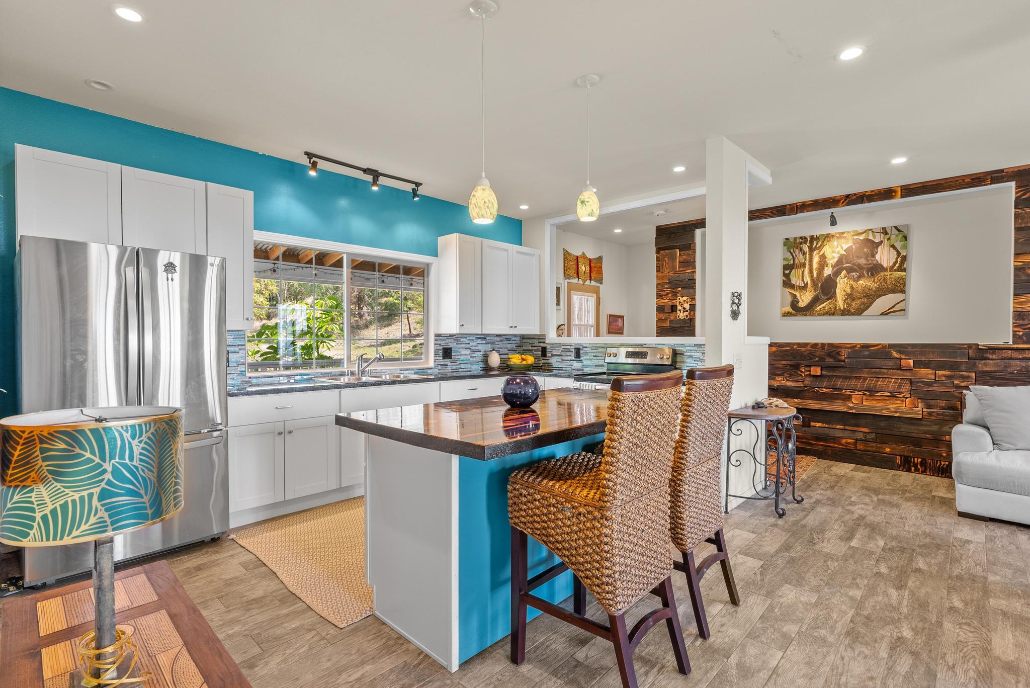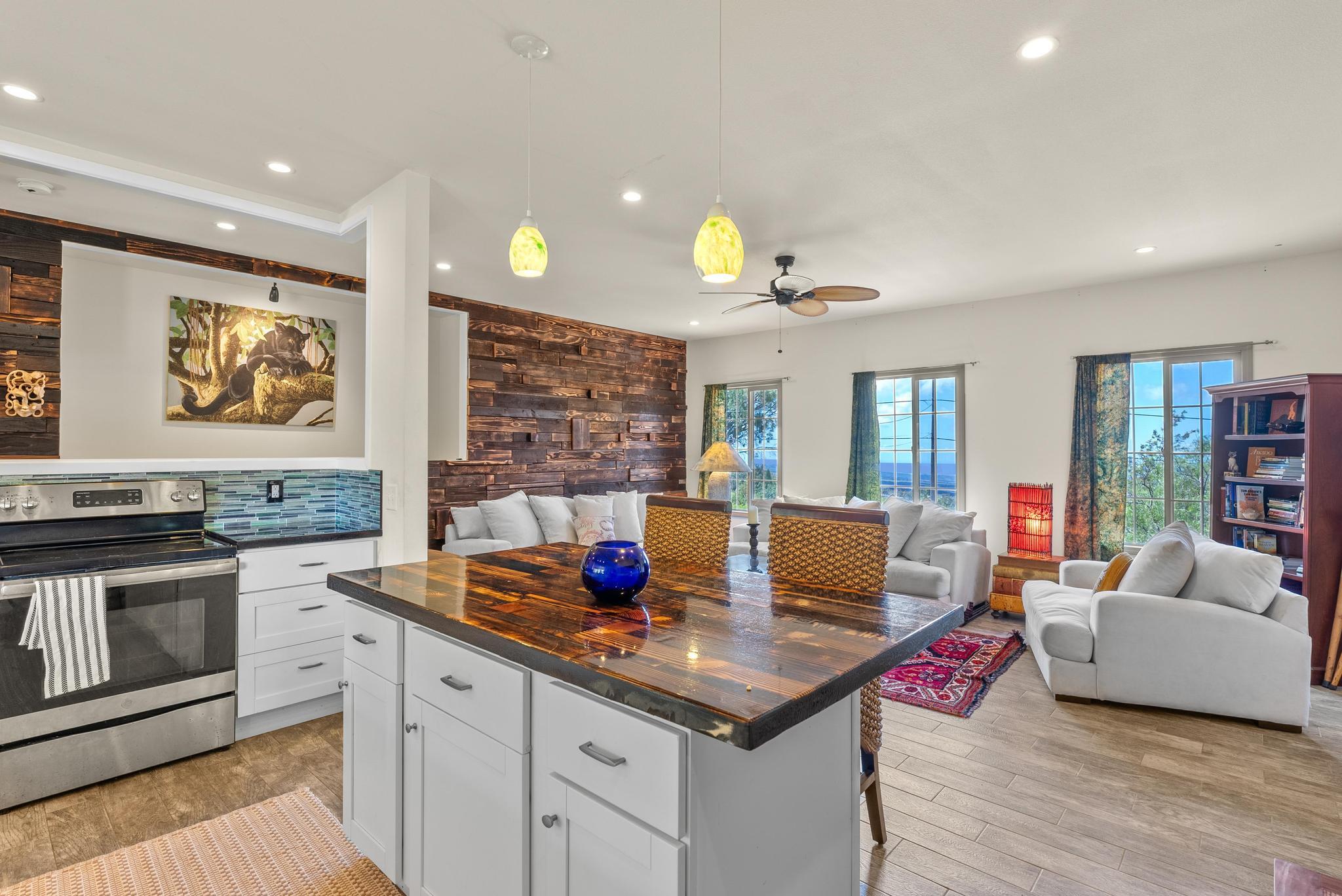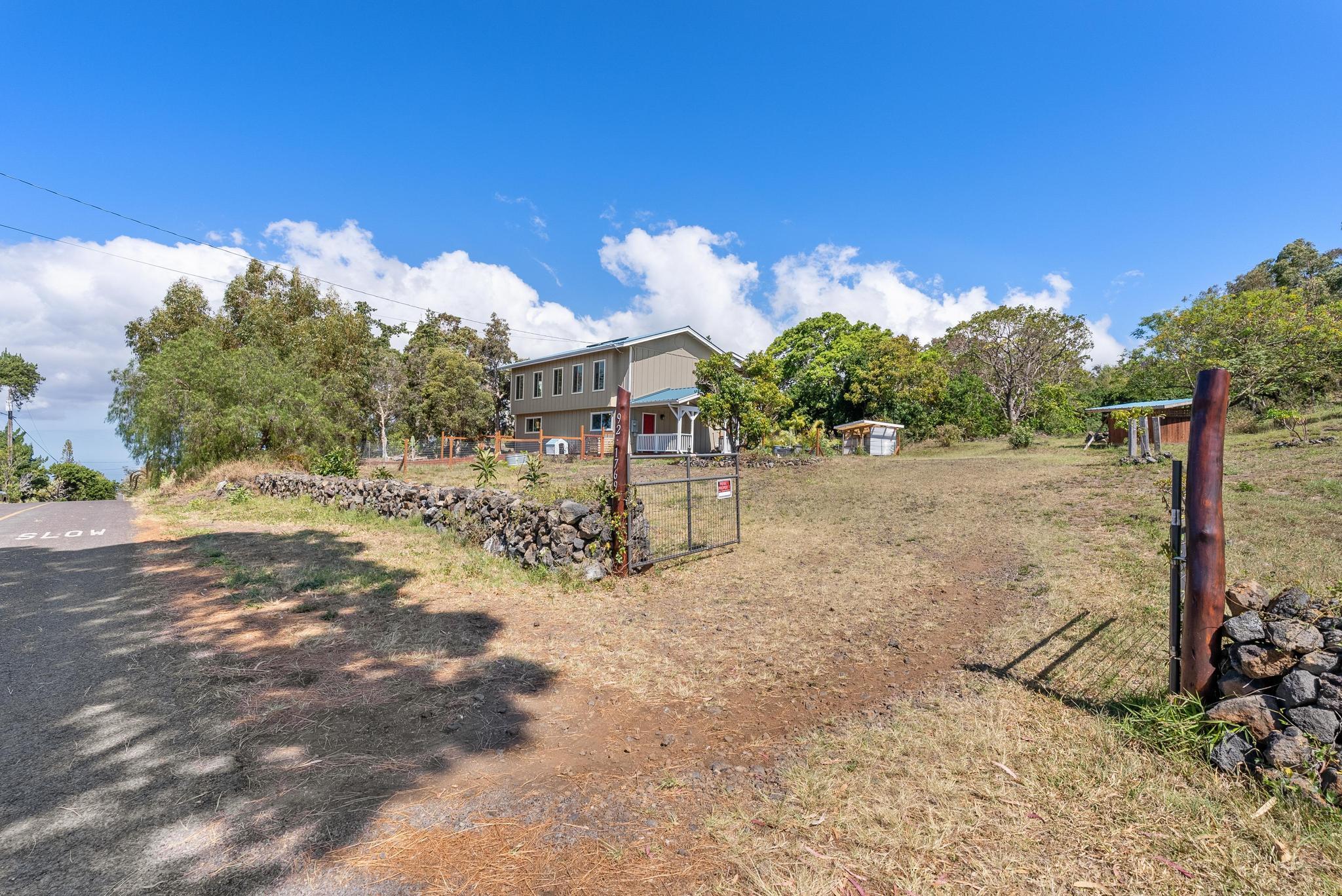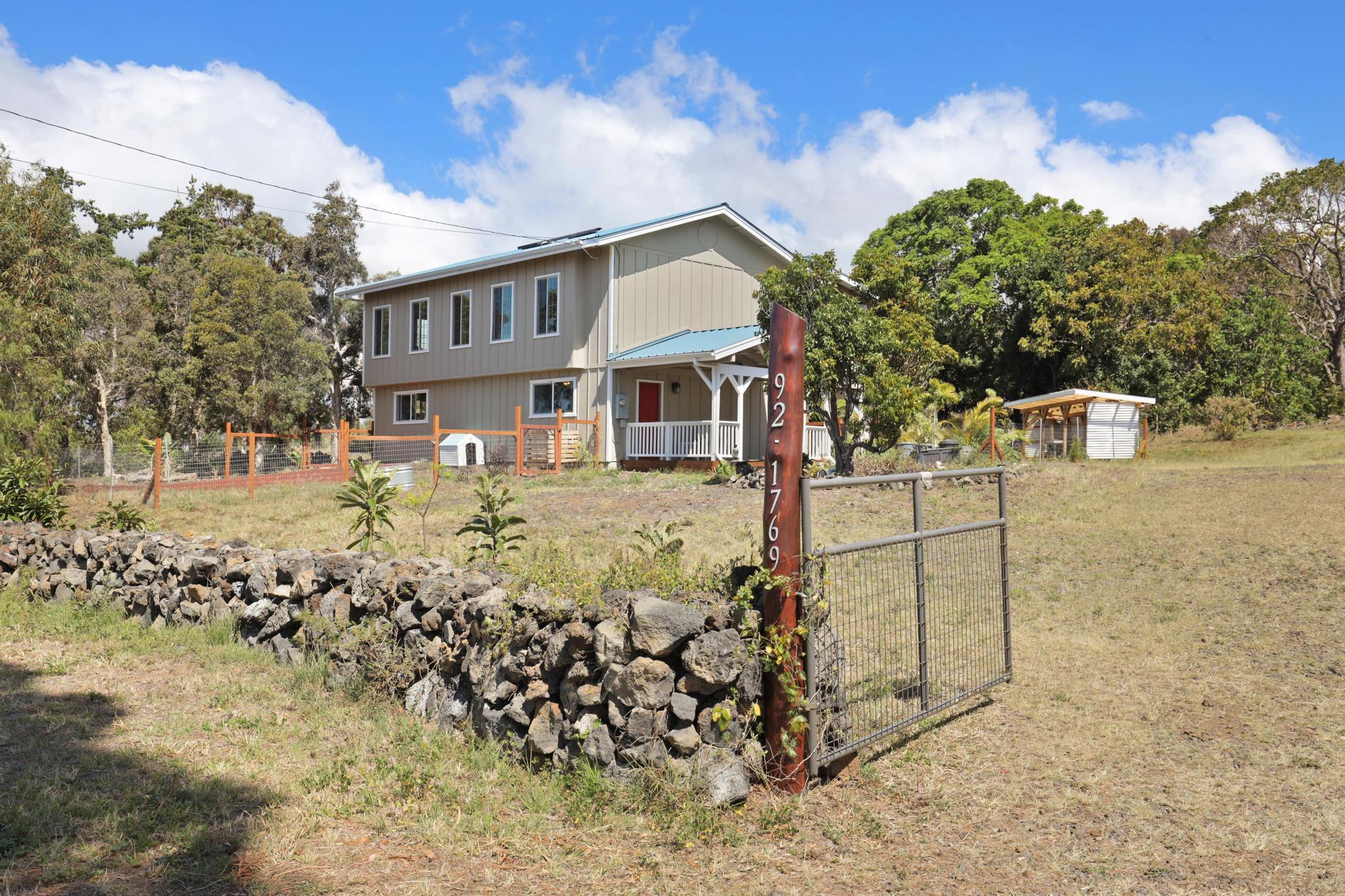 Welcome to this stunning upscale home, offering 3 bedrooms, 2 bathrooms, and 2 private acres in a peaceful setting with spectacular ocean views. Built in 2020 and enhanced with recent luxurious updates, this property blends modern comfort with timeless elegance. The open-concept interior features 9-foot ceilings upstairs, creating a bright ambiance throughout. Classic French windows in the living room frame breathtaking ocean views, while a stunning Shou Sugi Ban (burned wood) accent wall at the entry adds a distinctive artistic touch. The all-new kitchen is a chef's delight, showcasing butcher block countertops, quality appliances, tile floors, and a uniquely crafted island. Upstairs, the dream master suite offers abundant space, an ensuite bath, and a tiled walk-in shower. Downstairs, two additional bedrooms await–one light and bright with southern exposure, the other opening to a huge, covered patio. A full bath with a tiled shower, a laundry room, and a large interior storage room completes the lower level. Upstair Lanai alteration and some Interior improvements completed without permit. Outdoor living is equally impressive, with a new 24' x 12' lanai upstairs–perfect for private dining and a covered porch downstairs. The 2 acres of gently sloping land are beautifully landscaped, dotted with tropical flowers, fruit trees, and a mature macadamia orchard. The garden invite you to cultivate your own piece of paradise. Practical upgrades include a solar hot water heater, a new metal roof for rainwater catchment, and a reliable water system featuring a 10,000-gallon tank paired with a 5,000-gallon poly tank. Storage is abundant, with a 14' x 12' tool storage room and a large exterior shed. Located in a quiet neighborhood of well-maintained homes, this property offers easy access to shopping, fishing, and gardening. Green and Black Sand Beaches nearby- a true haven for island living. Virtual Tours Available!