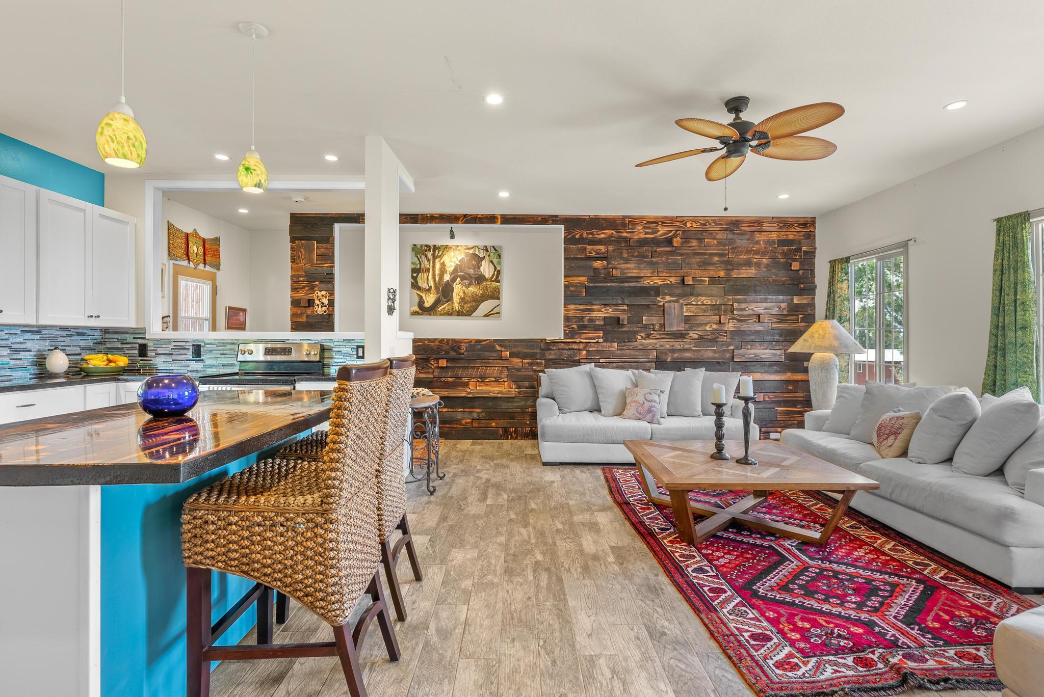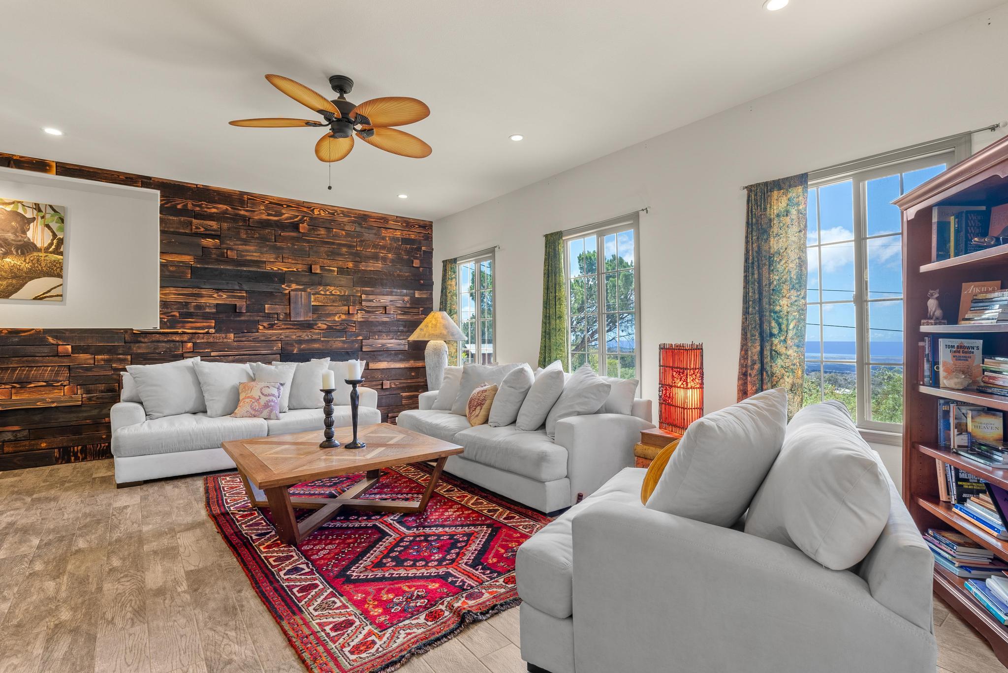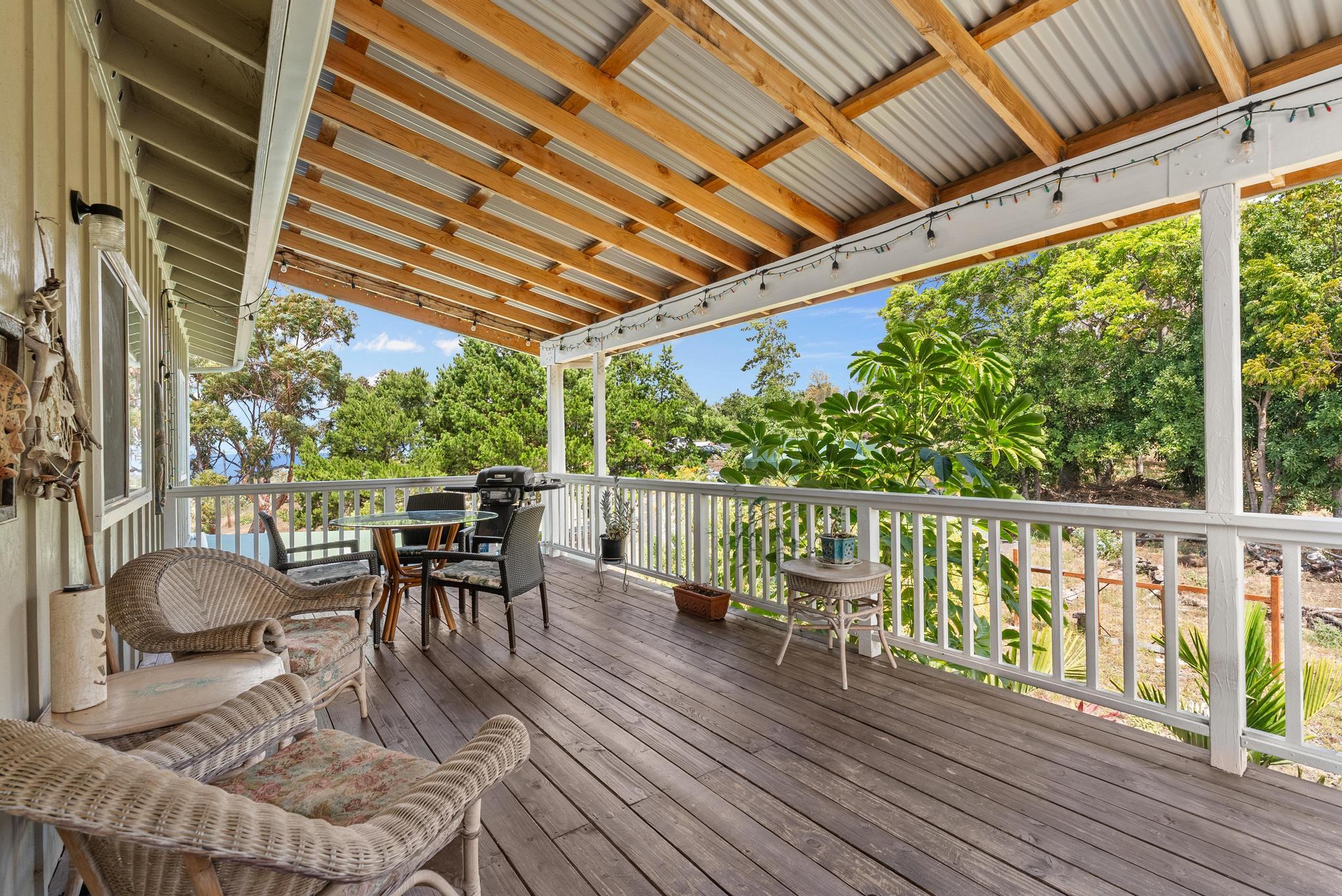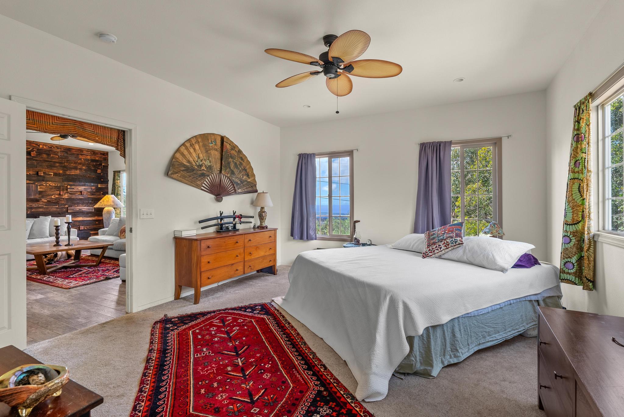 Welcome to this stunning upscale home, offering 3 bedrooms, 2 bathrooms, and 2 private acres in a peaceful setting with spectacular ocean views. Built in 2020 and enhanced with recent luxurious updates, this property blends modern comfort with timeless elegance. The open-concept interior features 9-foot ceilings upstairs, creating a bright ambiance throughout. Classic French windows in the living room frame breathtaking ocean views, while a stunning Shou Sugi Ban (burned wood) accent wall at the entry adds a distinctive artistic touch. The all-new kitchen is a chef's delight, showcasing butcher block countertops, quality appliances, tile floors, and a uniquely crafted island. Upstairs, the dream master suite offers abundant space, an ensuite bath, and a tiled walk-in shower. Downstairs, two additional bedrooms await–one light and bright with southern exposure, the other opening to a huge, covered patio. A full bath with a tiled shower, a laundry room, and a large interior storage room completes the lower level. Upstair Lanai alteration and some Interior improvements completed without permit. Outdoor living is equally impressive, with a new 24' x 12' lanai upstairs–perfect for private dining and a covered porch downstairs. The 2 acres of gently sloping land are beautifully landscaped, dotted with tropical flowers, fruit trees, and a mature macadamia orchard. The garden invite you to cultivate your own piece of paradise. Practical upgrades include a solar hot water heater, a new metal roof for rainwater catchment, and a reliable water system featuring a 10,000-gallon tank paired with a 5,000-gallon poly tank. Storage is abundant, with a 14' x 12' tool storage room and a large exterior shed. Located in a quiet neighborhood of well-maintained homes, this property offers easy access to shopping, fishing, and gardening. Green and Black Sand Beaches nearby- a true haven for island living. Virtual Tours Available!