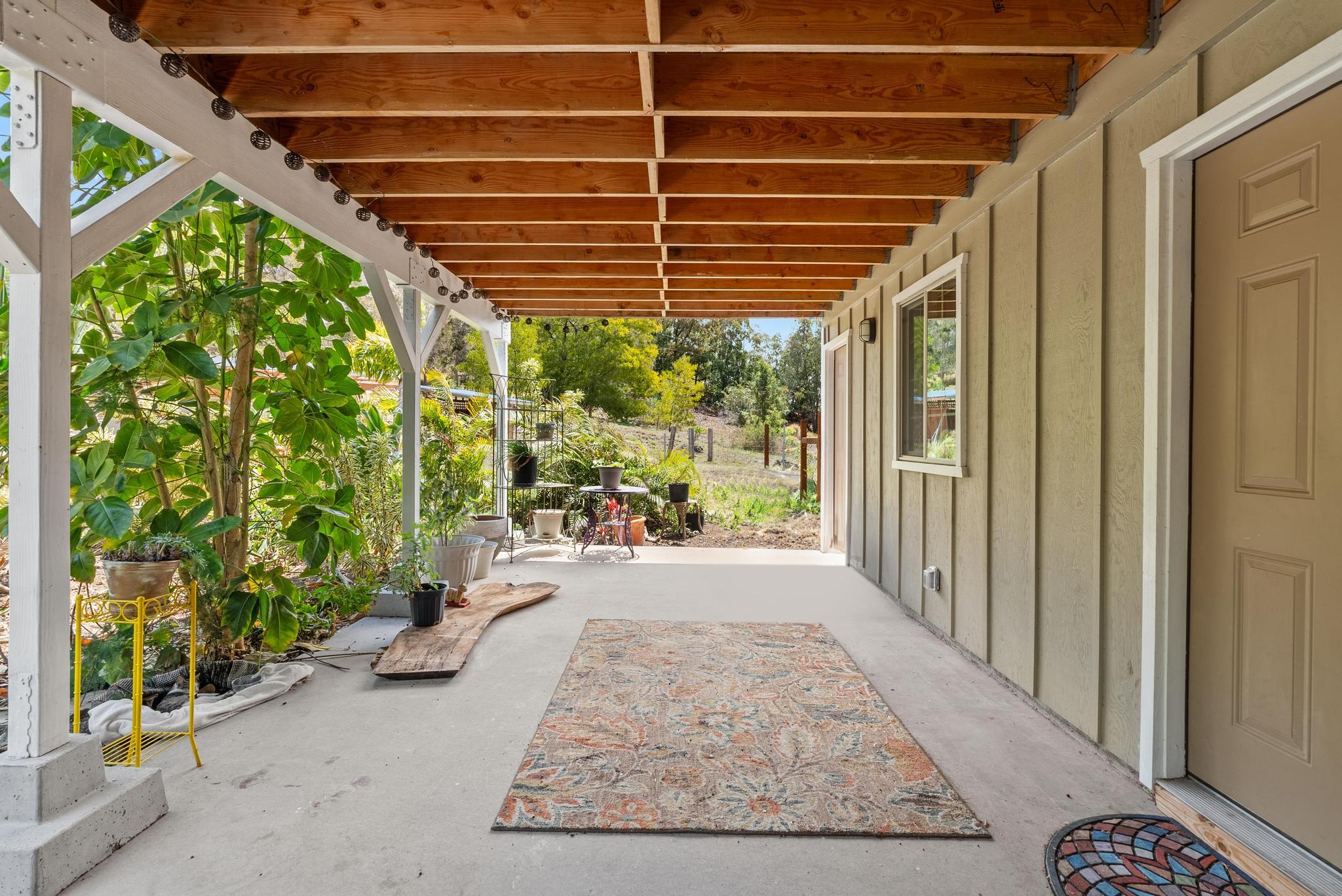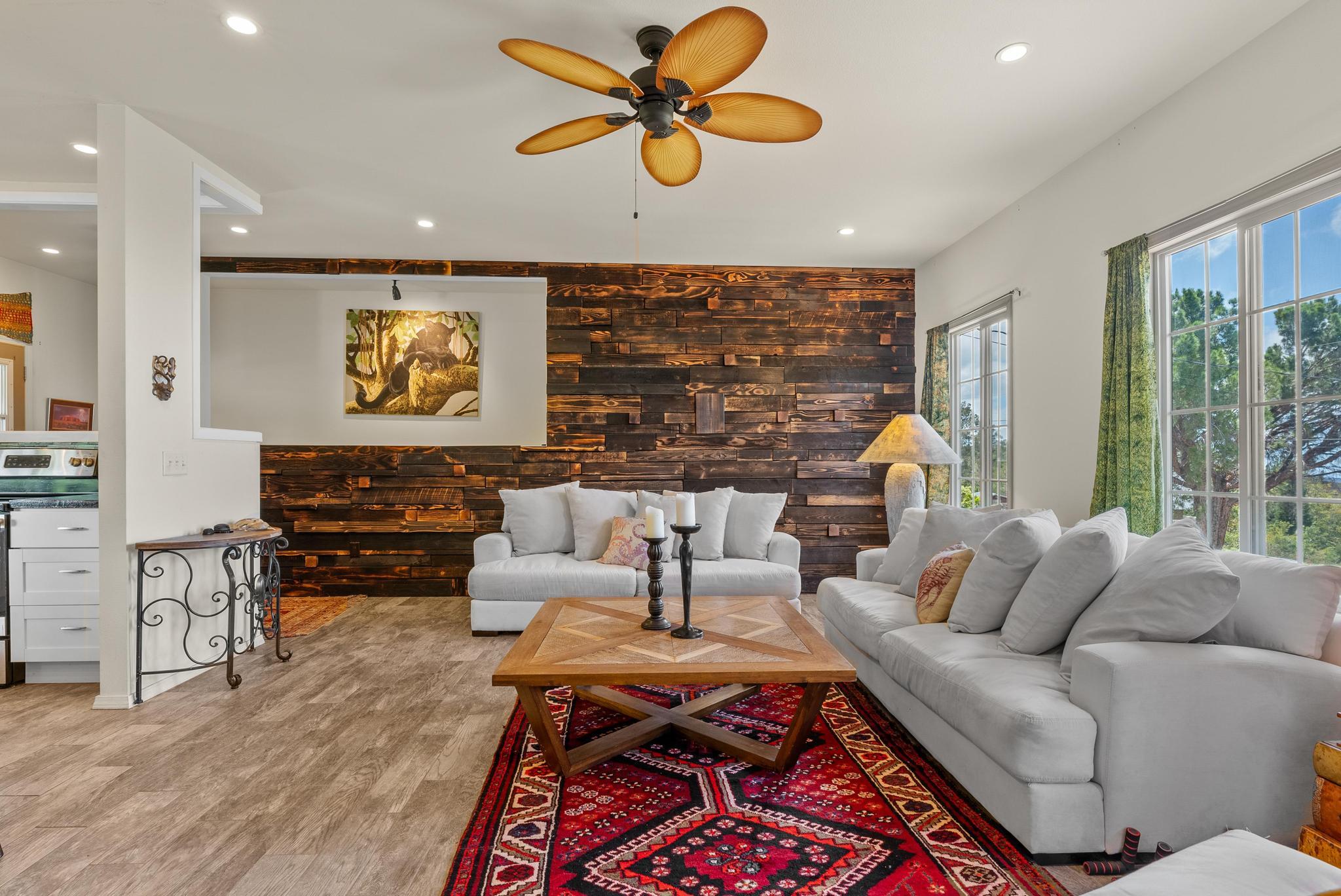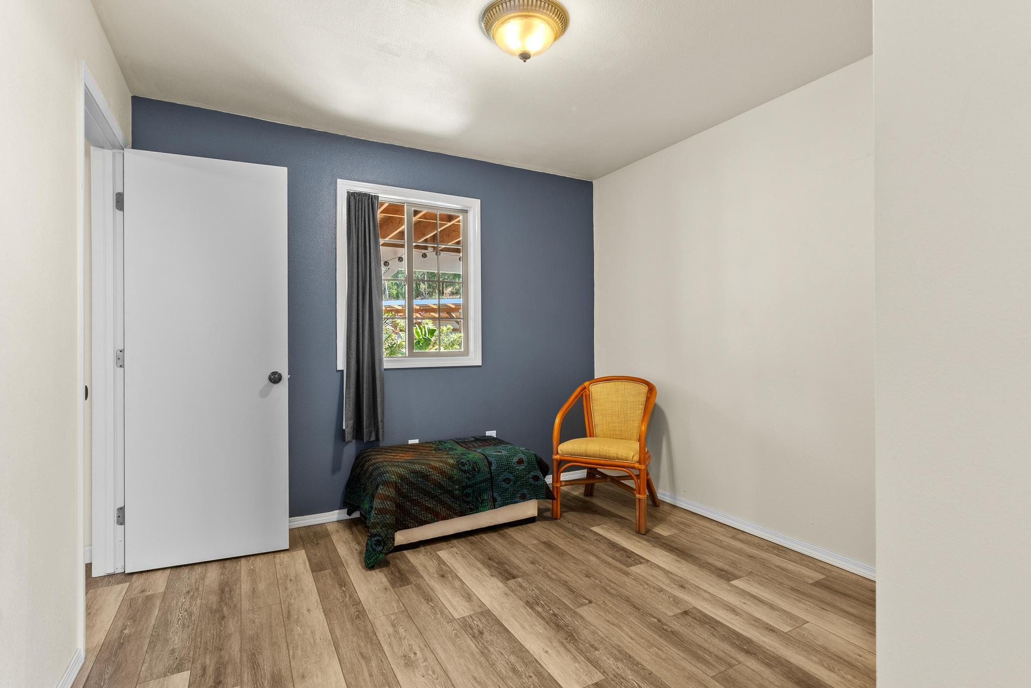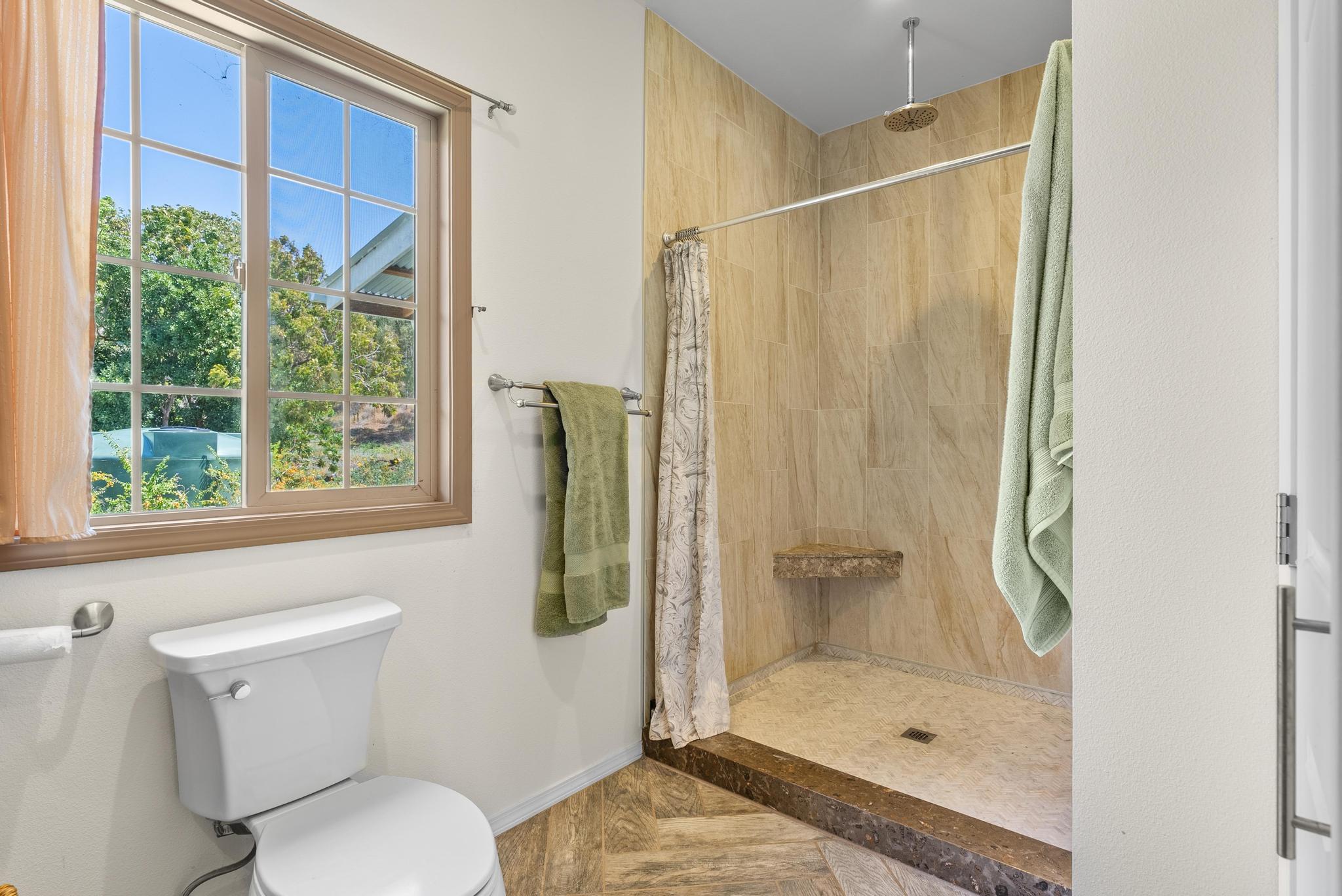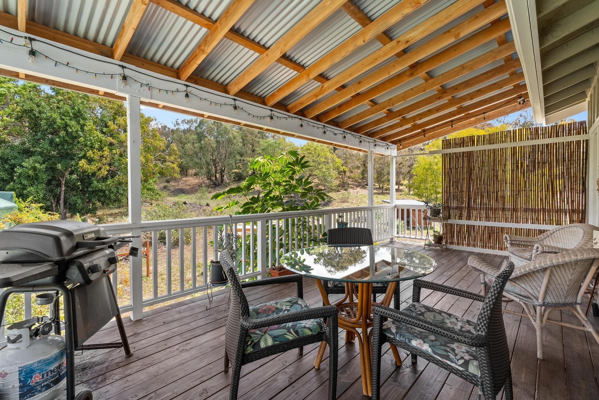 Welcome to this stunning upscale home, offering 3 bedrooms, 2 bathrooms, and 2 private acres in a peaceful setting with spectacular ocean views. Built in 2020 and enhanced with recent luxurious updates, this property blends modern comfort with timeless elegance. The open-concept interior features 9-foot ceilings upstairs, creating a bright ambiance throughout. Classic French windows in the living room frame breathtaking ocean views, while a stunning Shou Sugi Ban (burned wood) accent wall at the entry adds a distinctive artistic touch. The all-new kitchen is a chef's delight, showcasing butcher block countertops, quality appliances, tile floors, and a uniquely crafted island. Upstairs, the dream master suite offers abundant space, an ensuite bath, and a tiled walk-in shower. Downstairs, two additional bedrooms await–one light and bright with southern exposure, the other opening to a huge, covered patio. A full bath with a tiled shower, a laundry room, and a large interior storage room completes the lower level. Upstair Lanai alteration and some Interior improvements completed without permit. Outdoor living is equally impressive, with a new 24' x 12' lanai upstairs–perfect for private dining and a covered porch downstairs. The 2 acres of gently sloping land are beautifully landscaped, dotted with tropical flowers, fruit trees, and a mature macadamia orchard. The garden invite you to cultivate your own piece of paradise. Practical upgrades include a solar hot water heater, a new metal roof for rainwater catchment, and a reliable water system featuring a 10,000-gallon tank paired with a 5,000-gallon poly tank. Storage is abundant, with a 14' x 12' tool storage room and a large exterior shed. Located in a quiet neighborhood of well-maintained homes, this property offers easy access to shopping, fishing, and gardening. Green and Black Sand Beaches nearby- a true haven for island living. Virtual Tours Available!