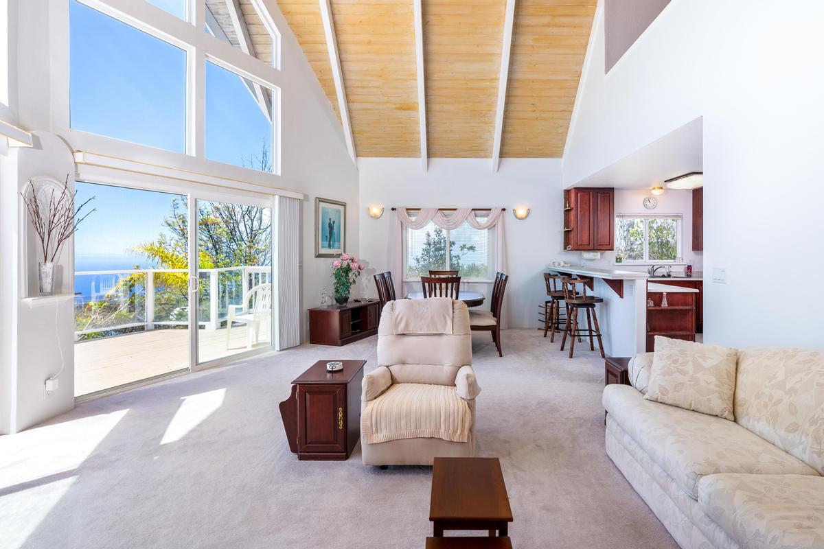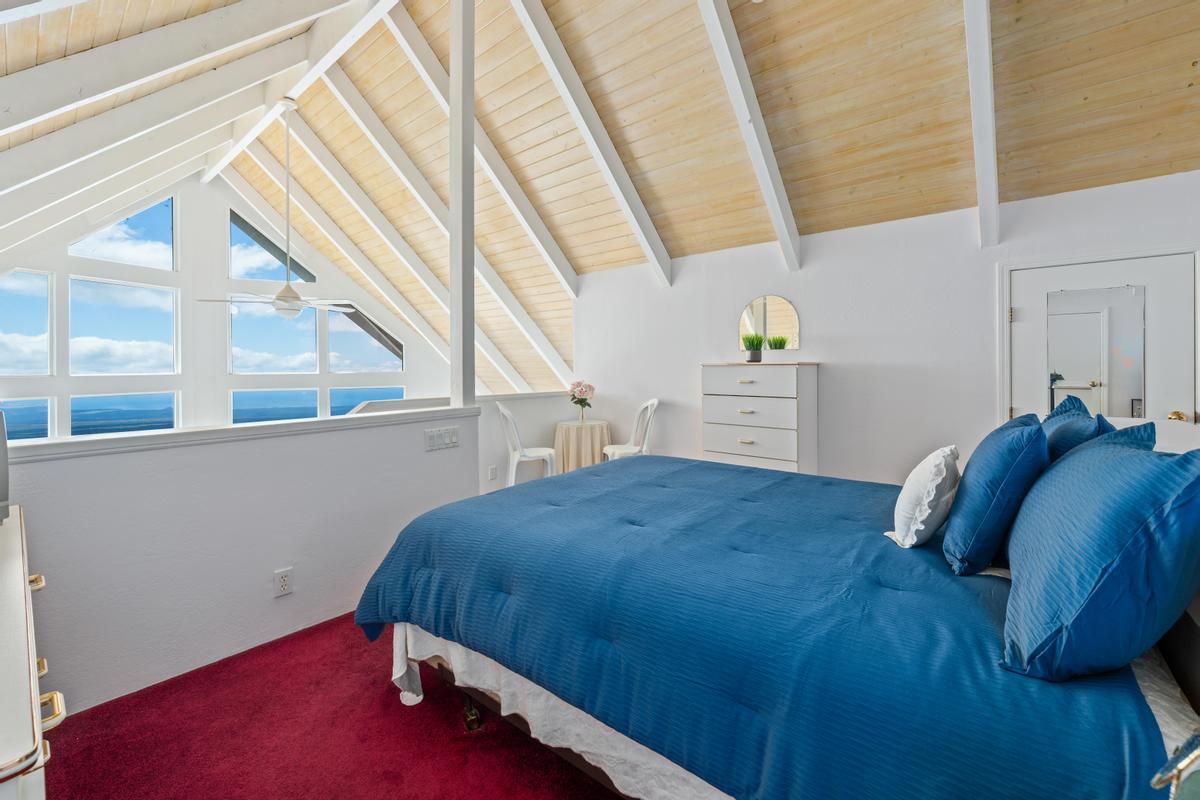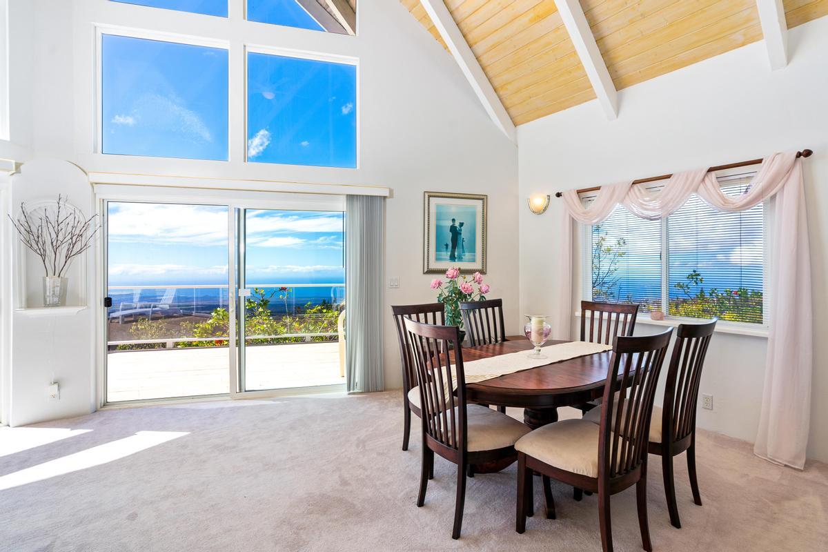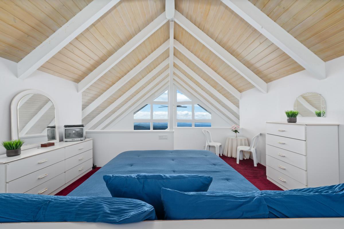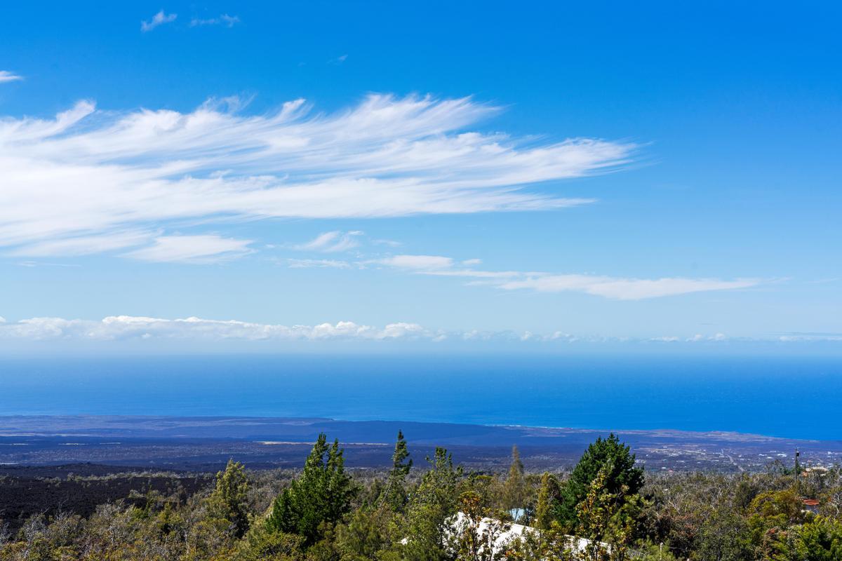 Welcome home to a "million dollar view" for a fraction of the cost. This Lucky Bennet design is a beautiful concept which is ideal for island lifestyle. This lightly lived in 1770 sqft 3 bedroom 2 bath is in pristine condition. The home is situated on a meticulously landscaped acre in a great part of the subdivision with nice homes located near by. This home exudes peace and tranquillity with white interior open beam ceilings, large windows and sliding glass doors that provides a view of the islands natural beauty. As you open the entrance door to this home you are greeted with a gentle Hawaiian breeze and graced with tile floors and large hallways that lead you straight to the heart of the home. One will find themselves gravitating to the large deck that overlooks the Ka’u forest reserve with unobstructed views of South Point all the way down the coastline. Two of the rooms are on the main floor along with the kitchen and bathroom, living room and dining room. Main level bedrooms have large deep closets and are good sizes, and laundry is in the hallway closet for convenience. A staircase then leads you to the upstairs loft which is the 3rd/primary bedroom with a big walk in closet with cedar lining and a separate bathroom. The Kitchen is open concept and contains clean white appliances with cherry wood cabinetry/shelving and a breakfast bar. Deck is large with glass panels so you can still enjoy unobstructed panoramic views while sitting. There is a detached garage with lots of storage perfect for parking a car or a "man cave" or "she shed". The whole acre is beautifully landscaped, walkable with flowers and mature trees. The home features a large 22k gallon water catchment tank, irrigation on timers and built on post and pier with additional storage space underneath the home. Don't miss out on seeing this elegant home, you'll be impressed. **See 3D virtual tour and view the video tour at https://show.tours/v/s7RqTqN?b=0
