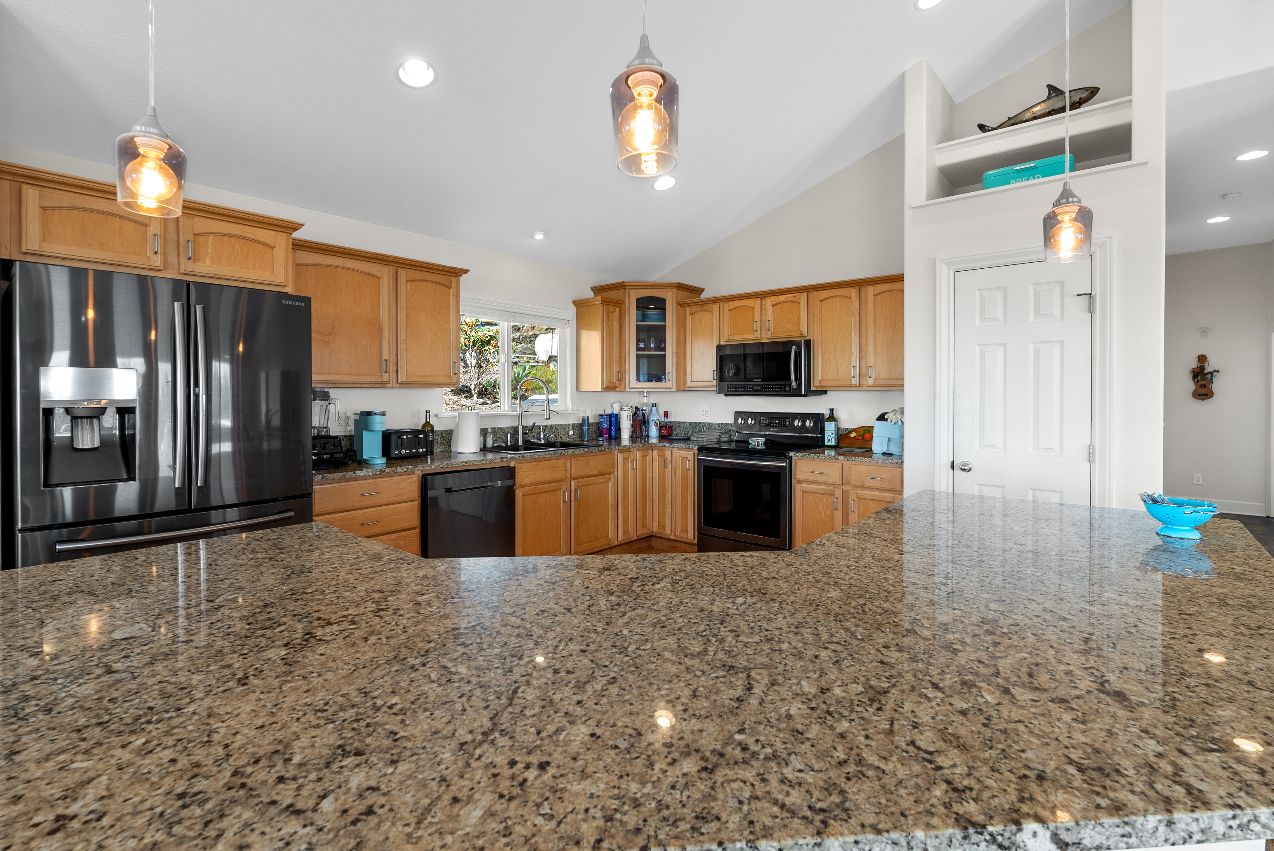 Your home has an open floor plan, vaulted ceilings, and bamboo flooring in the dining area and kitchen. The granite swathed island features a breakfast bar and the kitchen is complete with a granite island and features soft close drawers, cabinets and pantry. The laundry area is conveniently located inside the home and the bedrooms are generously sized with lots of cross ventilation and ocean views. Enjoy your morning coffee and afternoon BBQ's on the covered lanai. Don't miss your opportunity to live the Hawaii lifestyle!