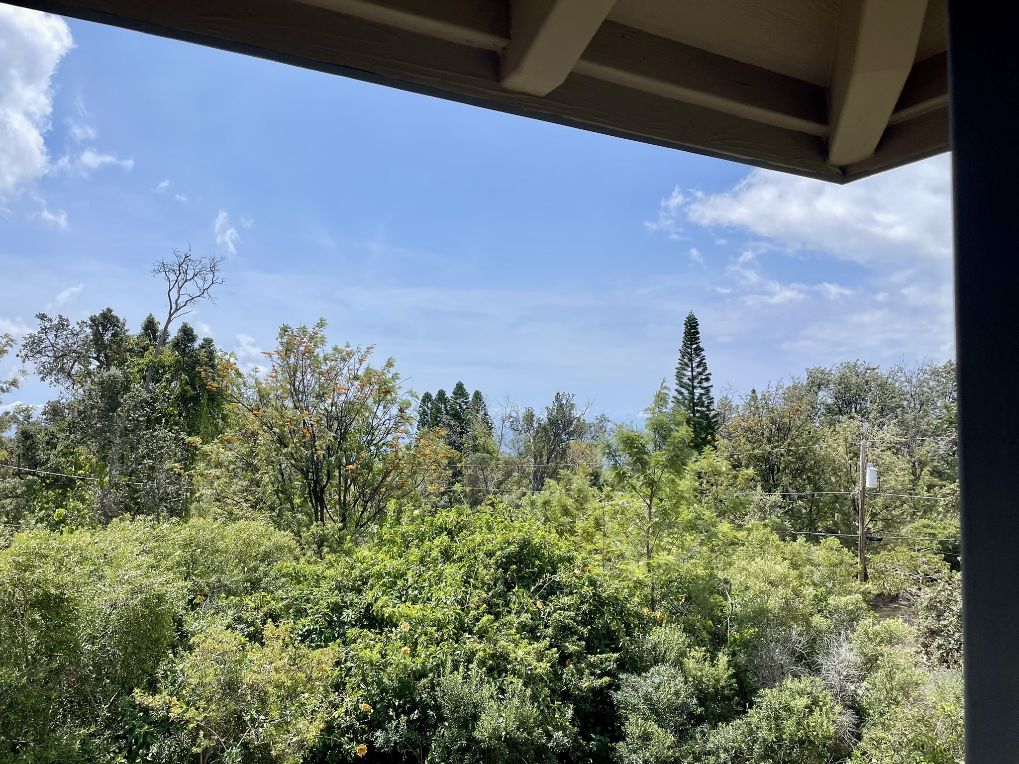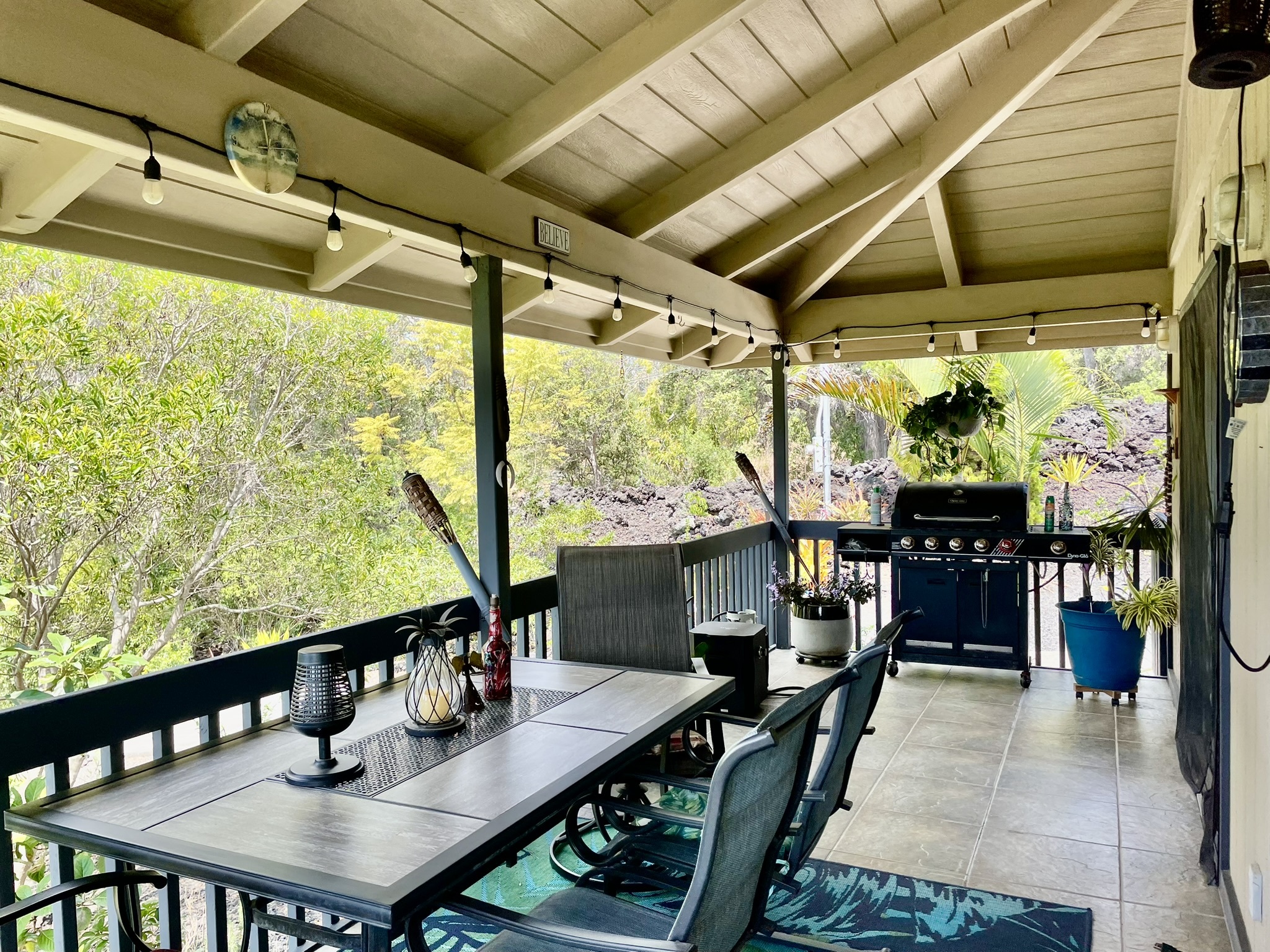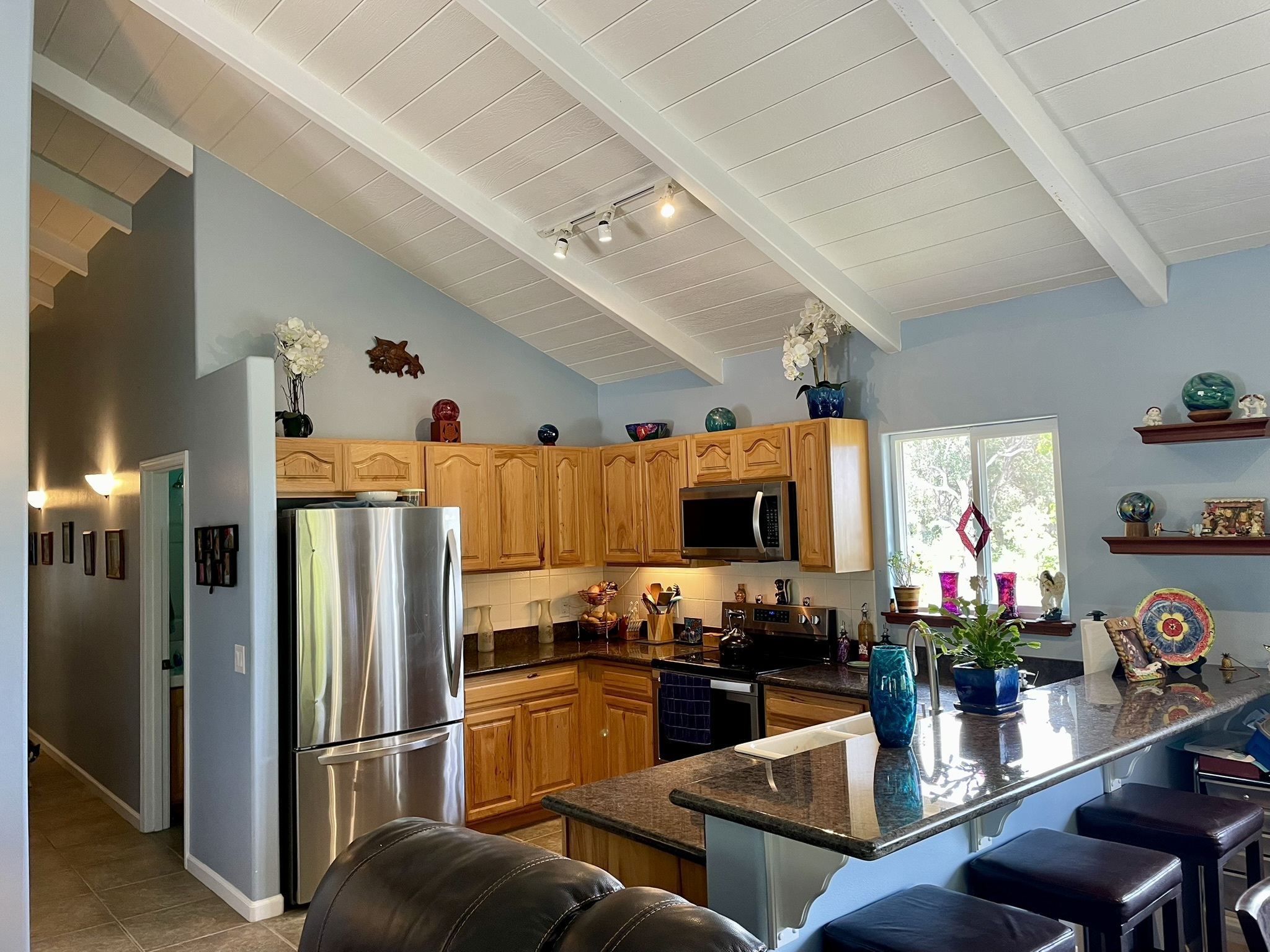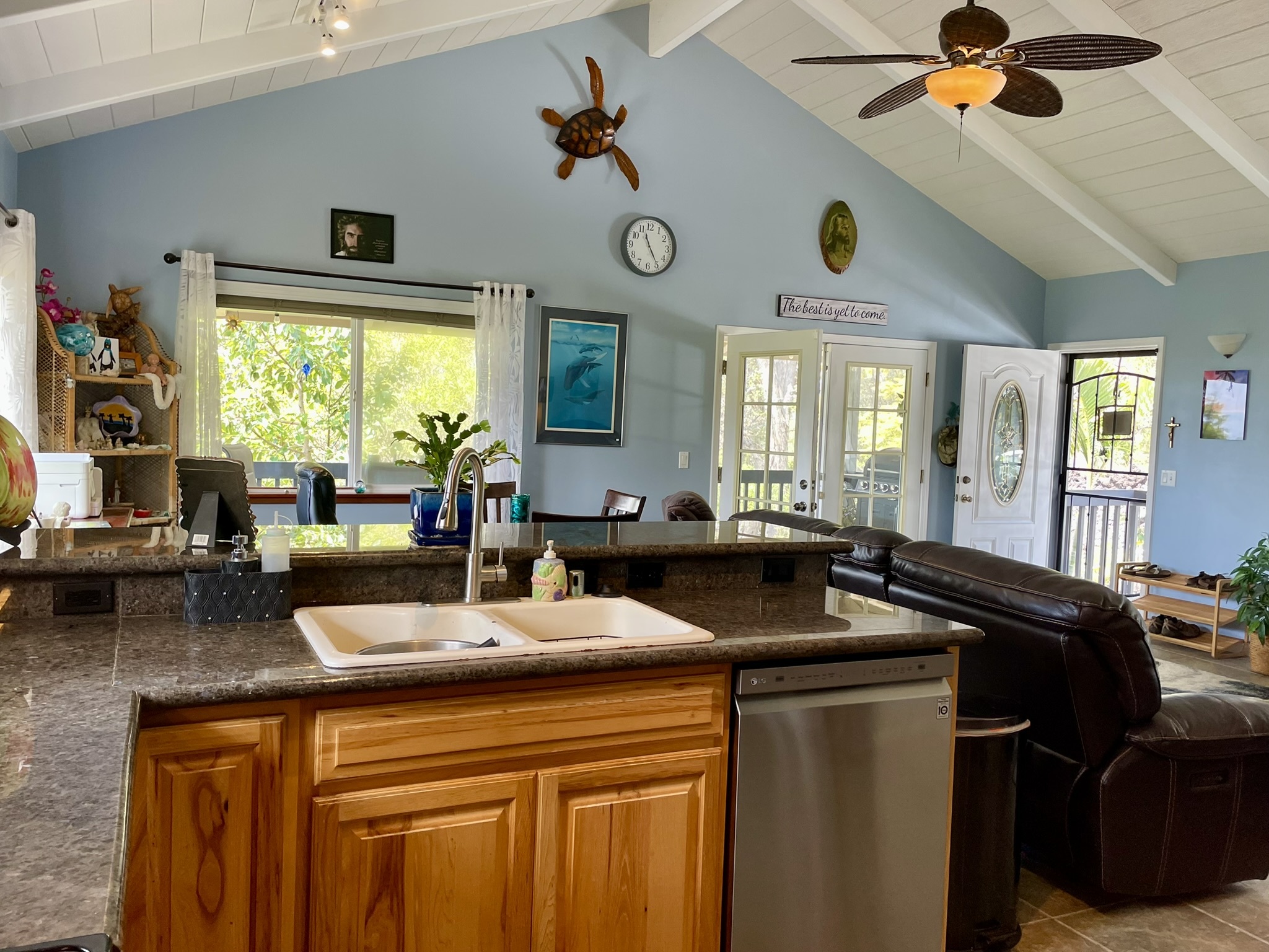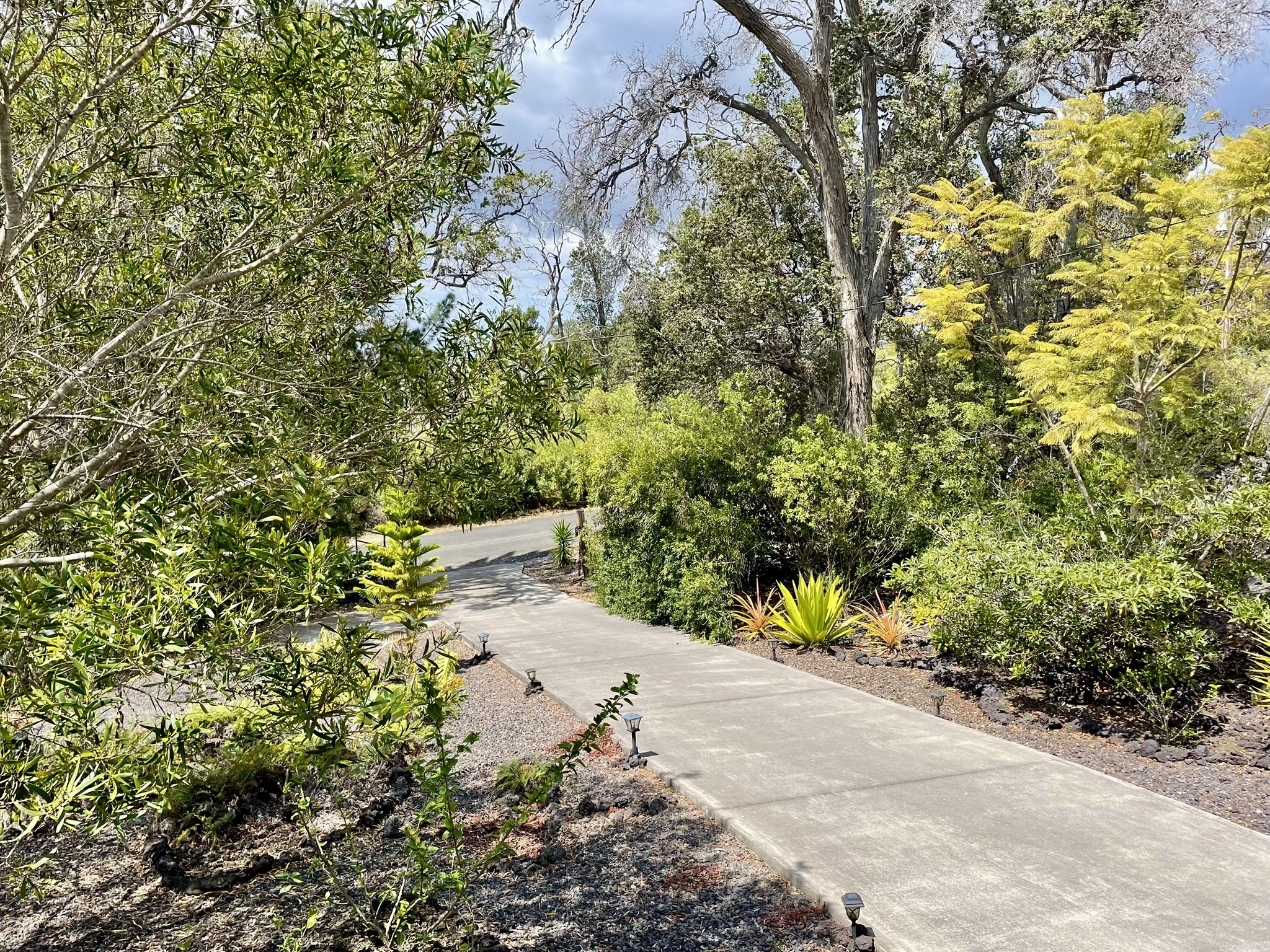 Beautifully maintained home nestled in a private serene treed oasis. Enter into the Huge Great room with soaring high ceilings and open plan with living Dining and Kitchen perfect for entertaining. French doors enter onto a large covered lanai. The Kitchen has newer very nice appliances and solid wood cabinetry and granite countertops. There are three Spacious Bedrooms and 2 Full Bathrooms. This Lovely Immaculate Home is nestled with complete privacy in an area of nice homes in the lower part of the subdivision and is turnkey furnished. Just bring your suitcase and move right in! The yard is full of beautiful colorful plantings including citrus and avocado trees and many flowering plants but is low maintenance. Lots of room to expand the gardens. The property is gated with Security system and there is built in storage rack in the large 2 car garage. The home has high vaulted ceilings cool tiled floors and laminate flooring in the bedrooms, indoor laundry room and plenty of closet space. It's all on one level for ease with no stairs. There is a complete whole home solar system with 13 panels and a tesla power wall installed and maintained by Sunnova. This easy-to-use system can be monitored by using an online app on your phone and has a monthly cost of approximately $168.00 and can be assigned to the new owner. The system can also be wholly purchased if Buyer desires at additional cost. The house is also connected to regular electricity for backup. Built in 2006 this is a fully permitted, solid, well-built and well-maintained house. There is a large, covered lanai great for those afternoon BBQs and evening sunset viewing. Paved driveway to two car garage. Its rare find to have lush green trees all around and still have an ocean view. Come feel the serenity and you will want to call this place home.