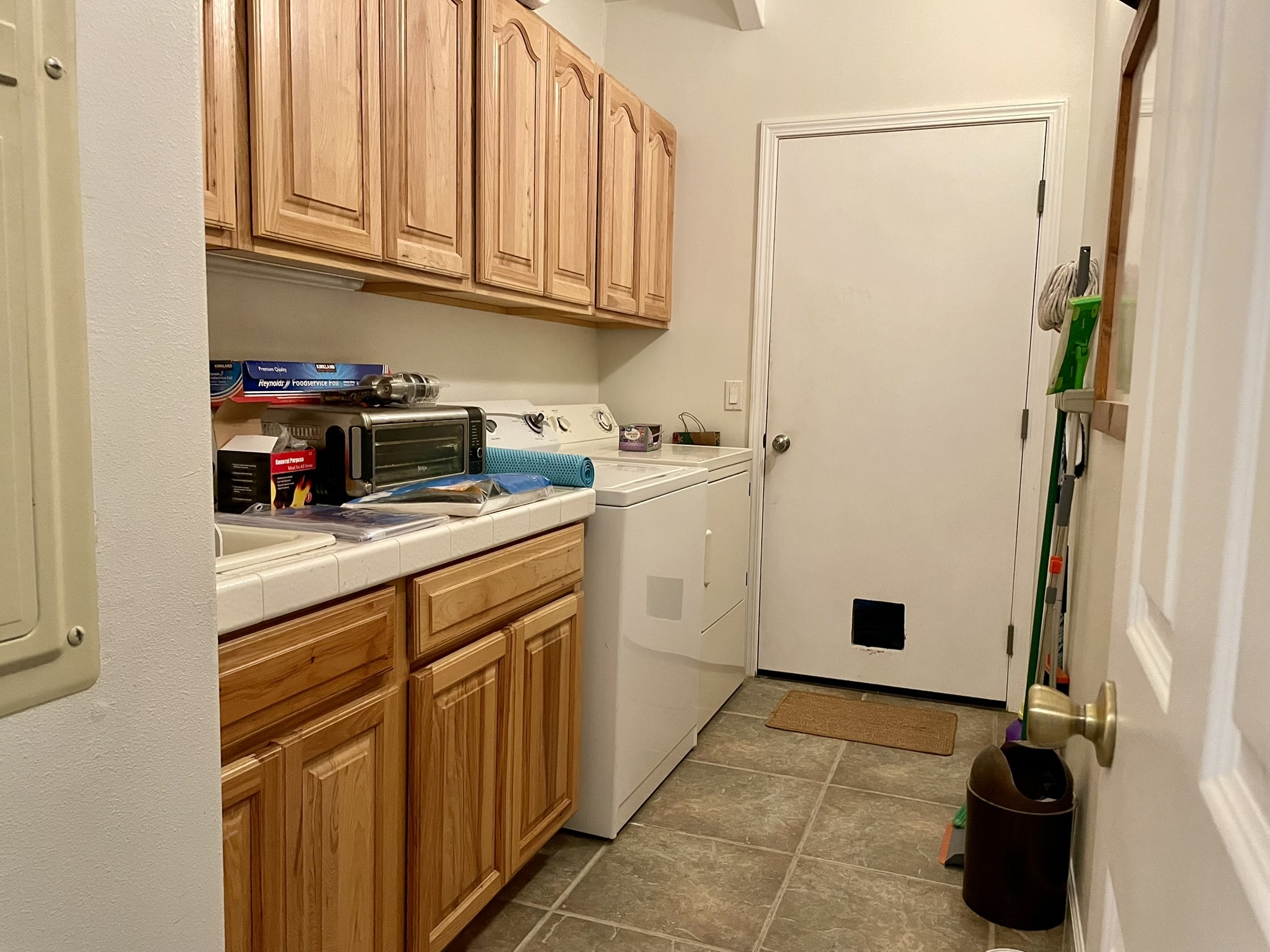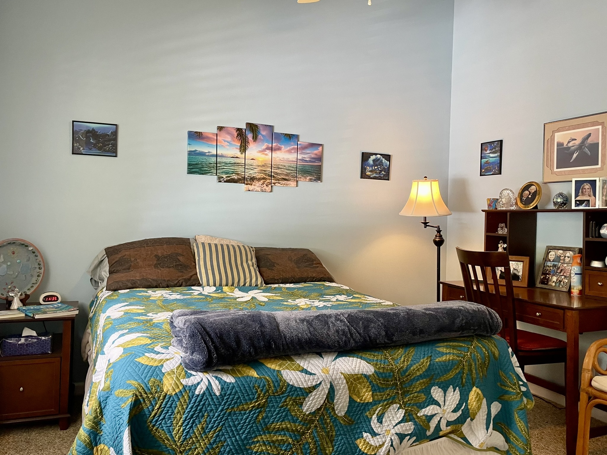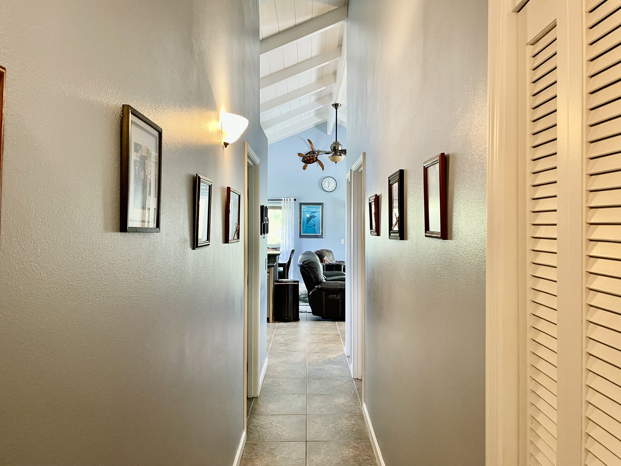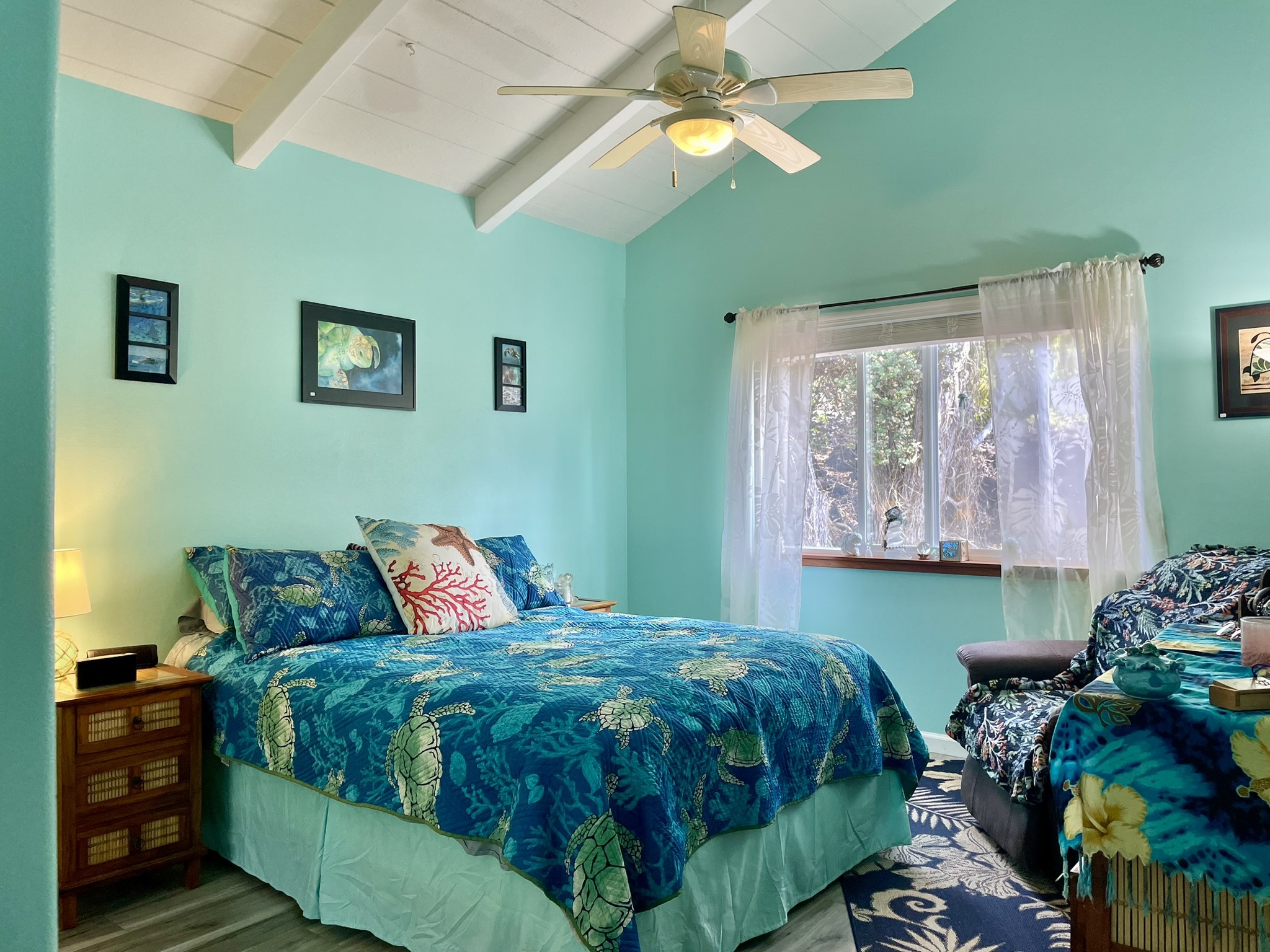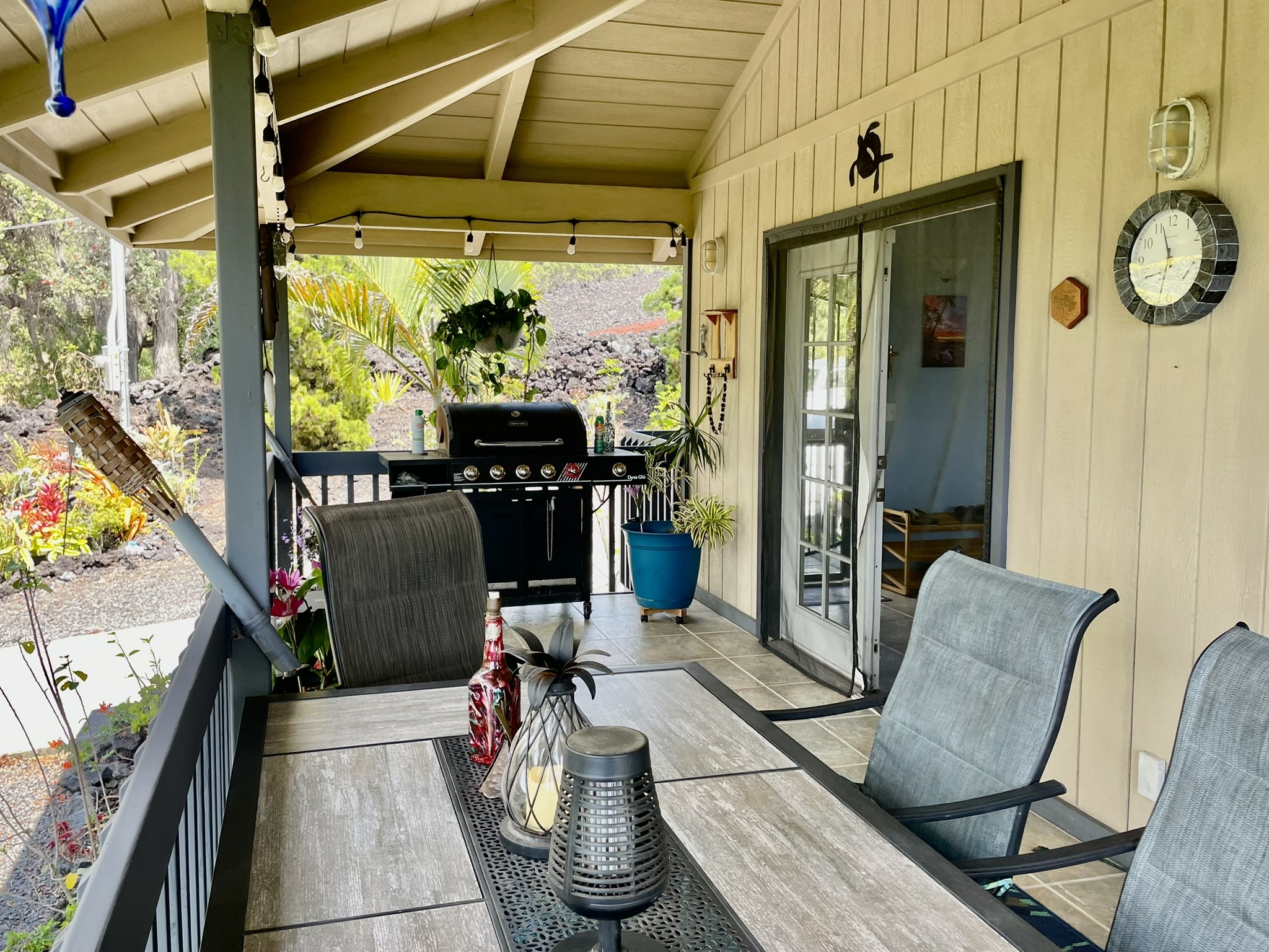 Beautifully maintained home nestled in a private serene treed oasis. Enter into the Huge Great room with soaring high ceilings and open plan with living Dining and Kitchen perfect for entertaining. French doors enter onto a large covered lanai. The Kitchen has newer very nice appliances and solid wood cabinetry and granite countertops. There are three Spacious Bedrooms and 2 Full Bathrooms. This Lovely Immaculate Home is nestled with complete privacy in an area of nice homes in the lower part of the subdivision and is turnkey furnished. Just bring your suitcase and move right in! The yard is full of beautiful colorful plantings including citrus and avocado trees and many flowering plants but is low maintenance. Lots of room to expand the gardens. The property is gated with Security system and there is built in storage rack in the large 2 car garage. The home has high vaulted ceilings cool tiled floors and laminate flooring in the bedrooms, indoor laundry room and plenty of closet space. It's all on one level for ease with no stairs. There is a complete whole home solar system with 13 panels and a tesla power wall installed and maintained by Sunnova. This easy-to-use system can be monitored by using an online app on your phone and has a monthly cost of approximately $168.00 and can be assigned to the new owner. The system can also be wholly purchased if Buyer desires at additional cost. The house is also connected to regular electricity for backup. Built in 2006 this is a fully permitted, solid, well-built and well-maintained house. There is a large, covered lanai great for those afternoon BBQs and evening sunset viewing. Paved driveway to two car garage. Its rare find to have lush green trees all around and still have an ocean view. Come feel the serenity and you will want to call this place home.