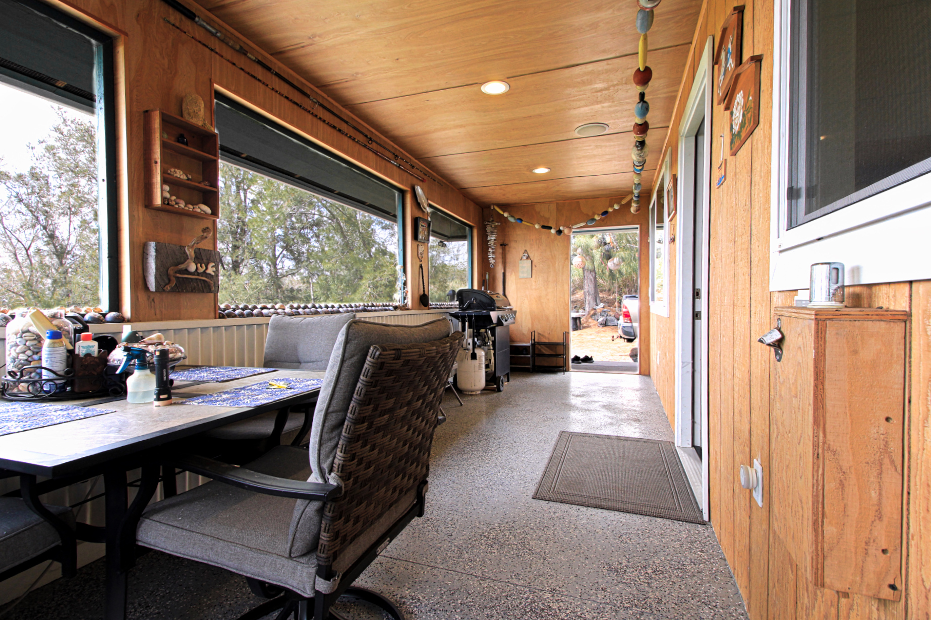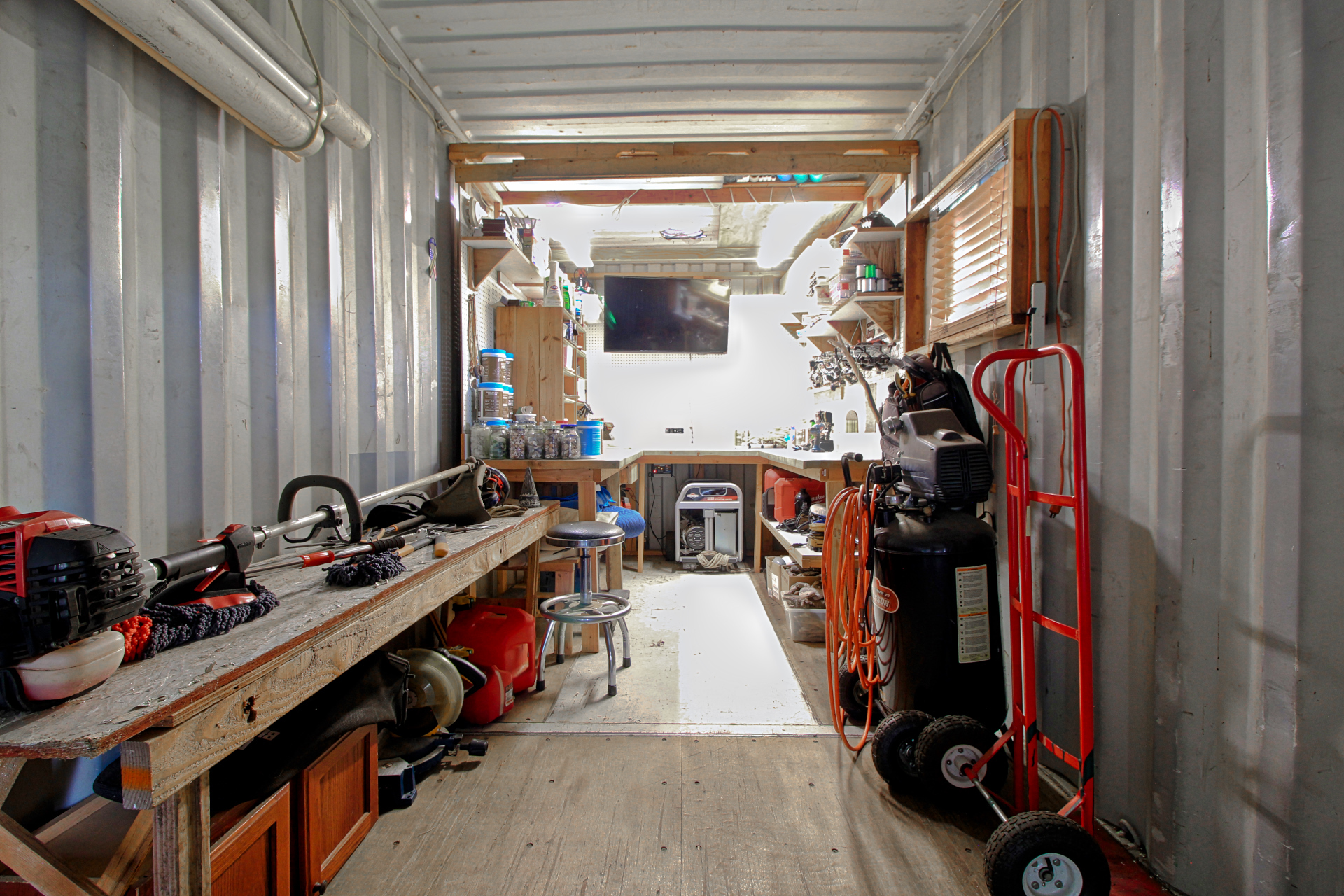 Enjoy breezy afternoons on the screened-in lanai, surrounded by mature trees that offer privacy and a lush backdrop. The property includes a detached 2-car garage with its own full bathroom and separate laundry room – an ideal setup for conversion to guest quarters, an office, or hobby space. A covered carport adds convenience, and a 40' shipping container has been converted into a fully equipped workshop.