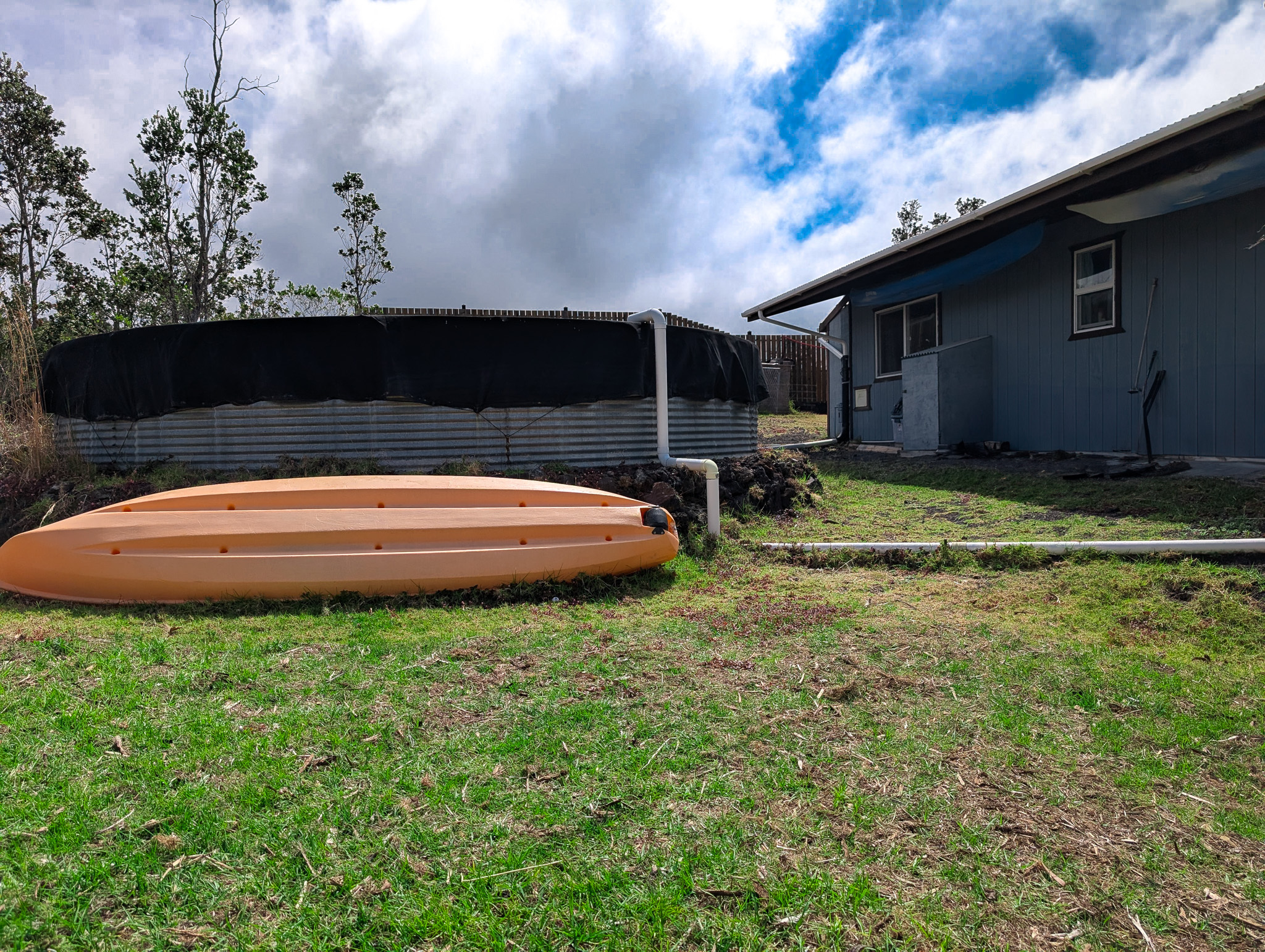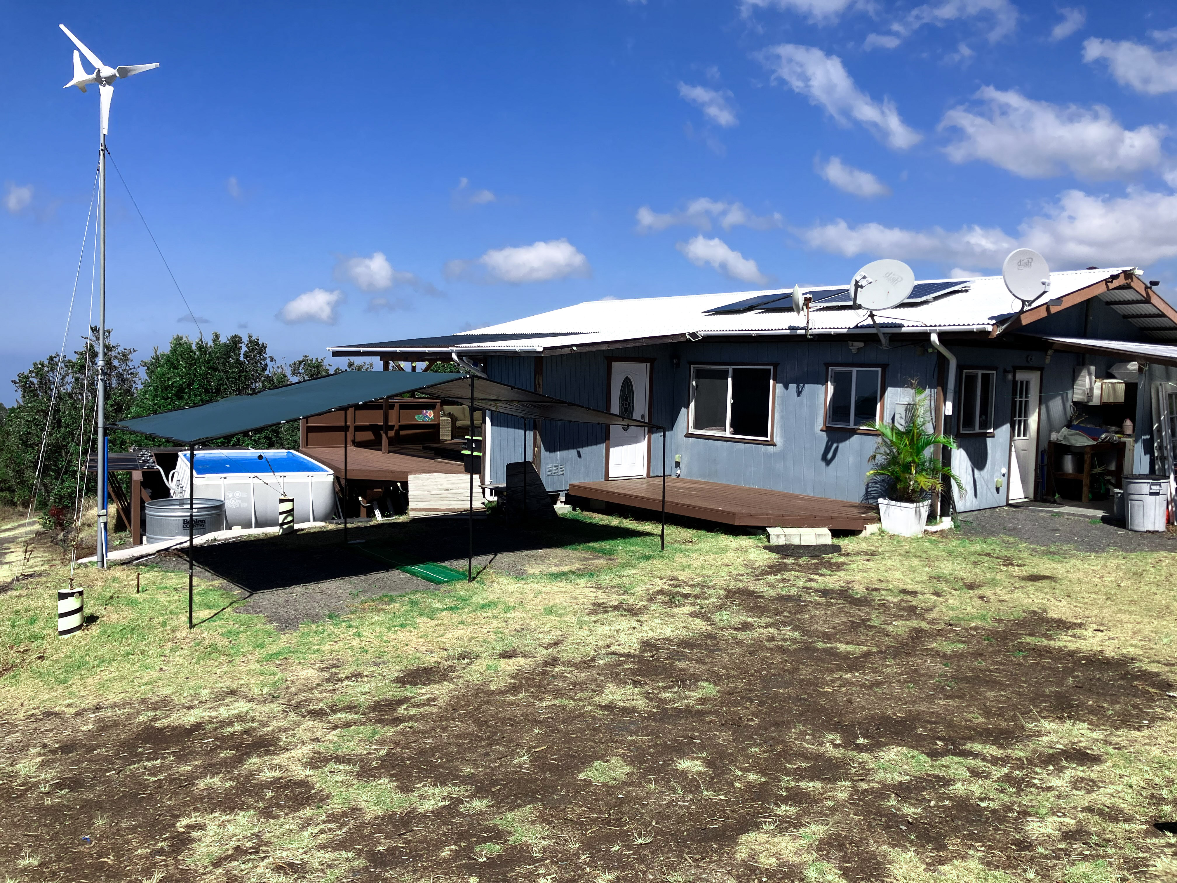 internet. The kitchen is very spacious with plenty of cupboard and cabinet space and a cozy breakfast bar. The living room has a sliding glass door that leads out to a large 1000sq ft covered lanai space with a massive panoramic view of the ocean. Off the left side there is an above ground pool on a cement pad that sits level with the lanai. Off the right side there is a beautiful lawn with a private fire pit area surrounded by palm trees. This house has a 12,000 gallon catchment tank for water and a 24v solar system with windmill.