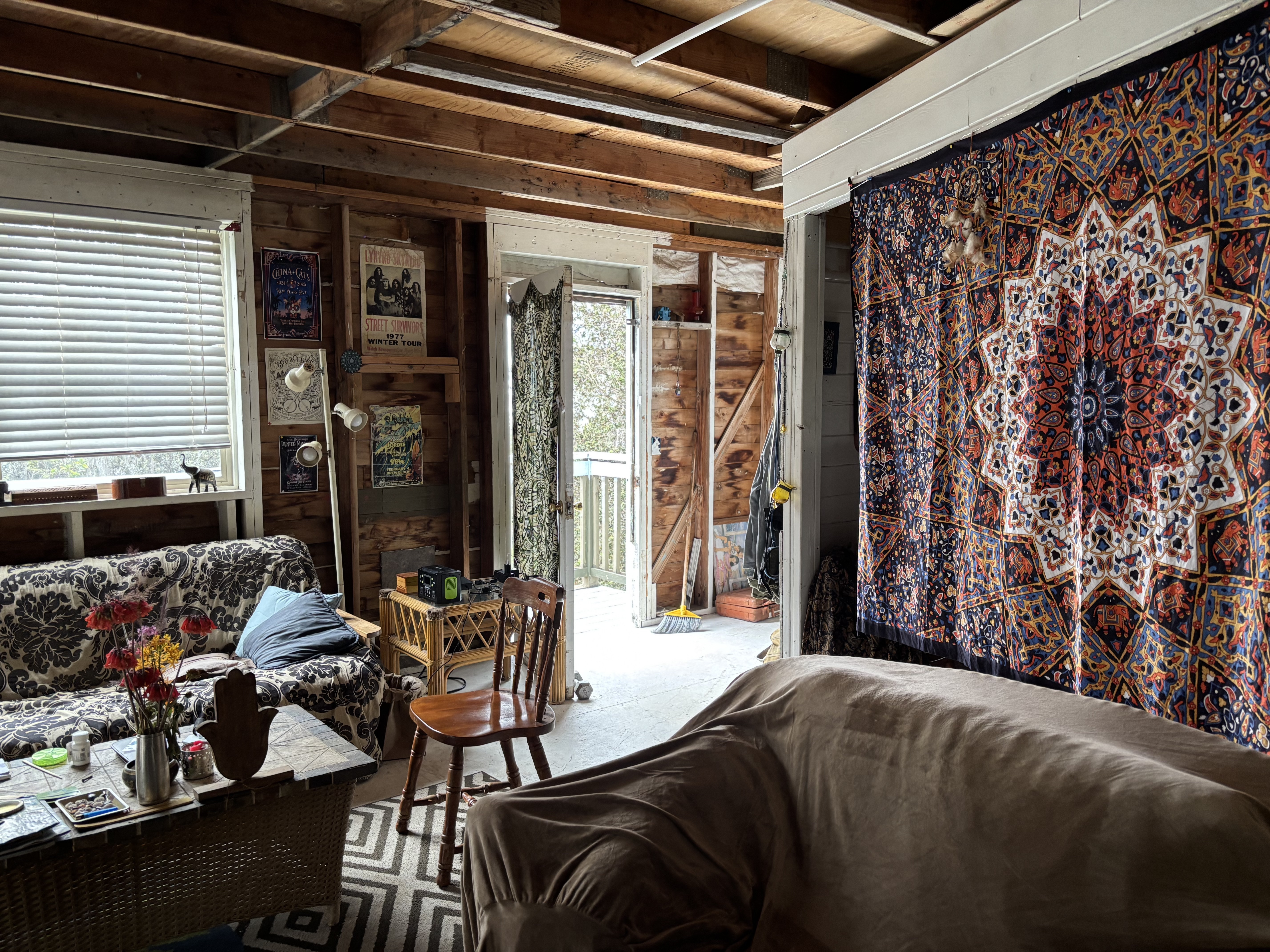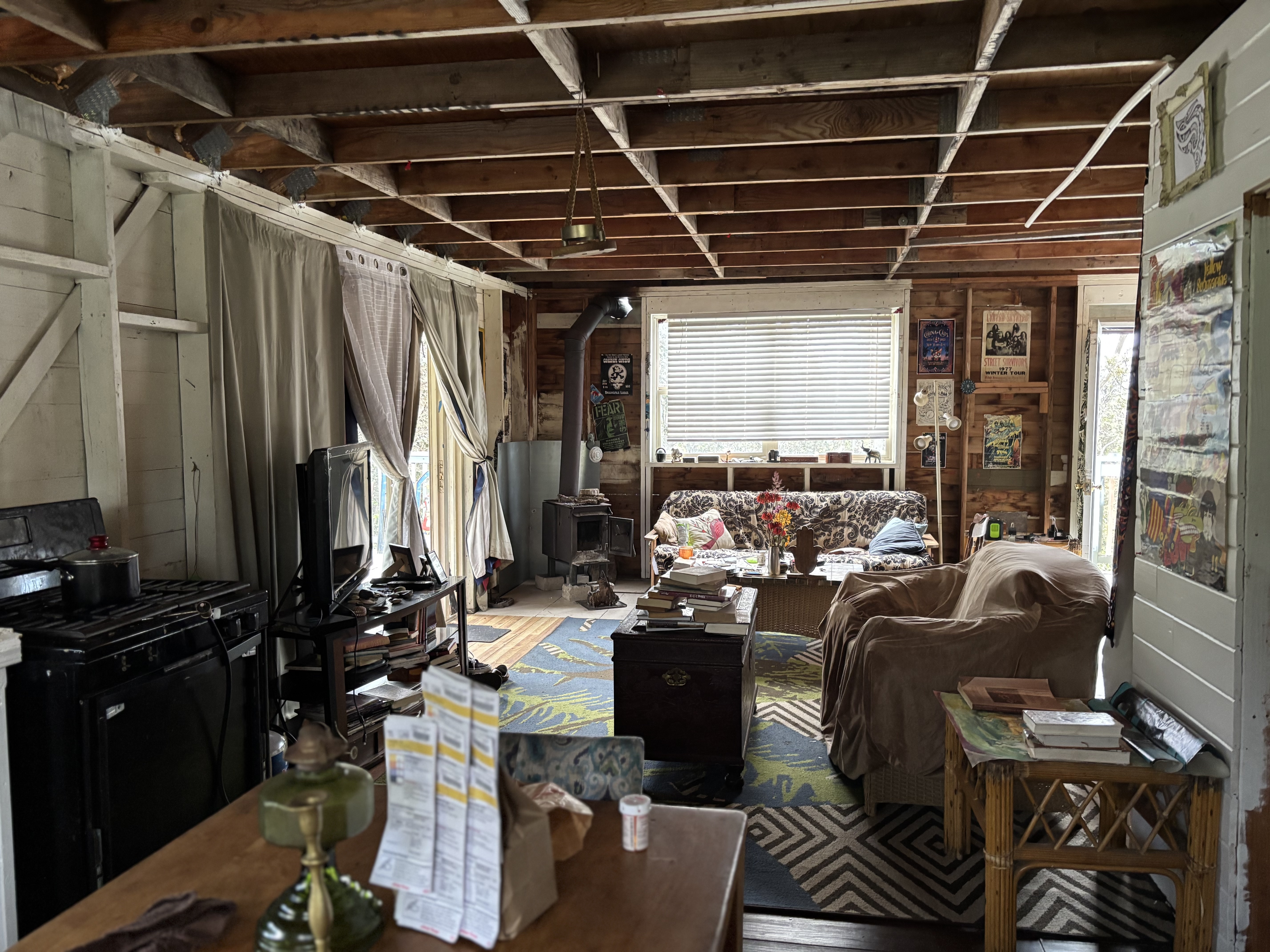Off grid unpermitted unfinished Cedar 1 bedroom and 1 bathroom house on one acre. Separate acre adjacent also comes with sale, making 2 full acres. Has upstairs loft; spacious decks front and south side. 4200 gallons Redwood Water Tank, and structured built with permit.