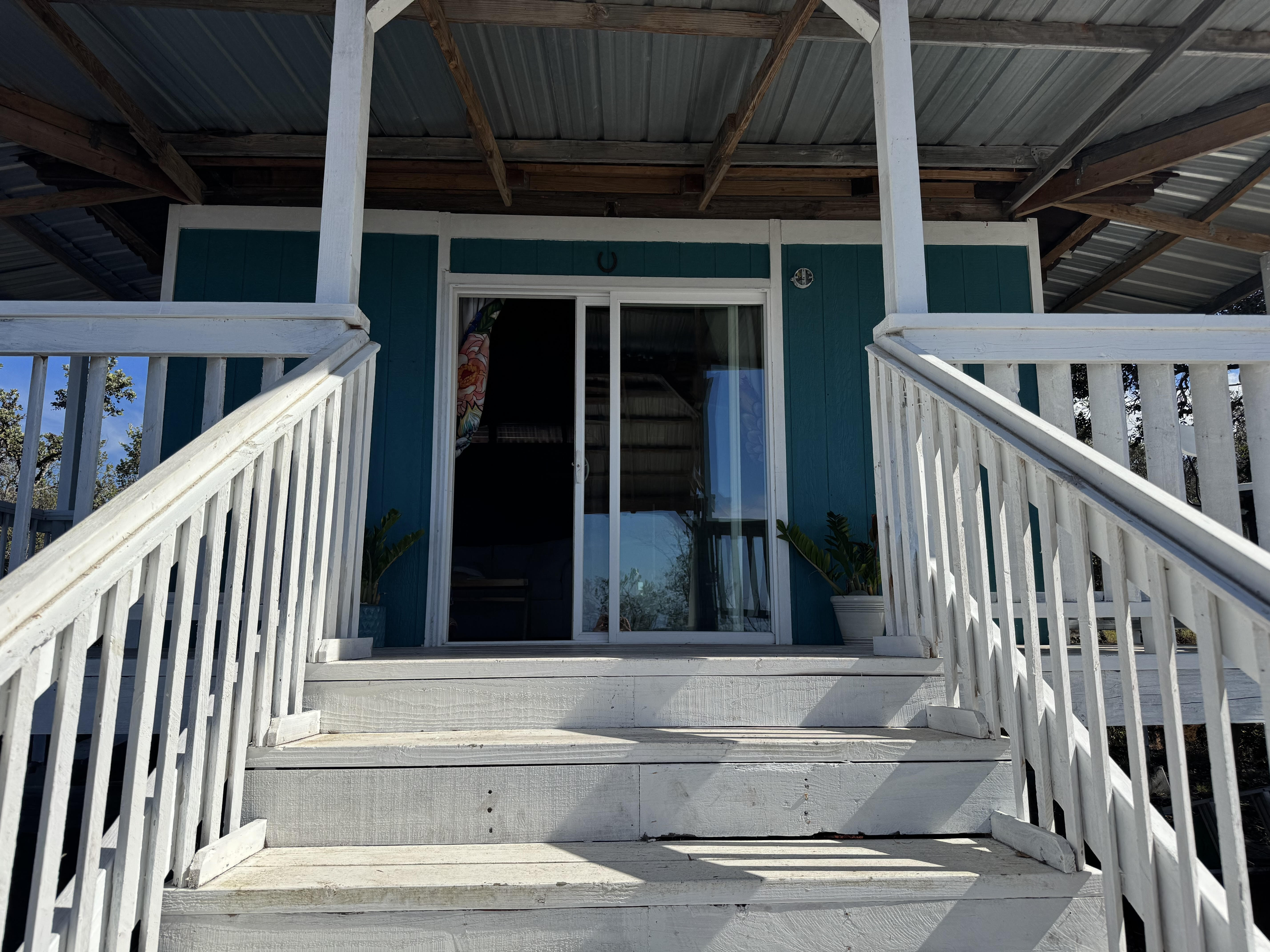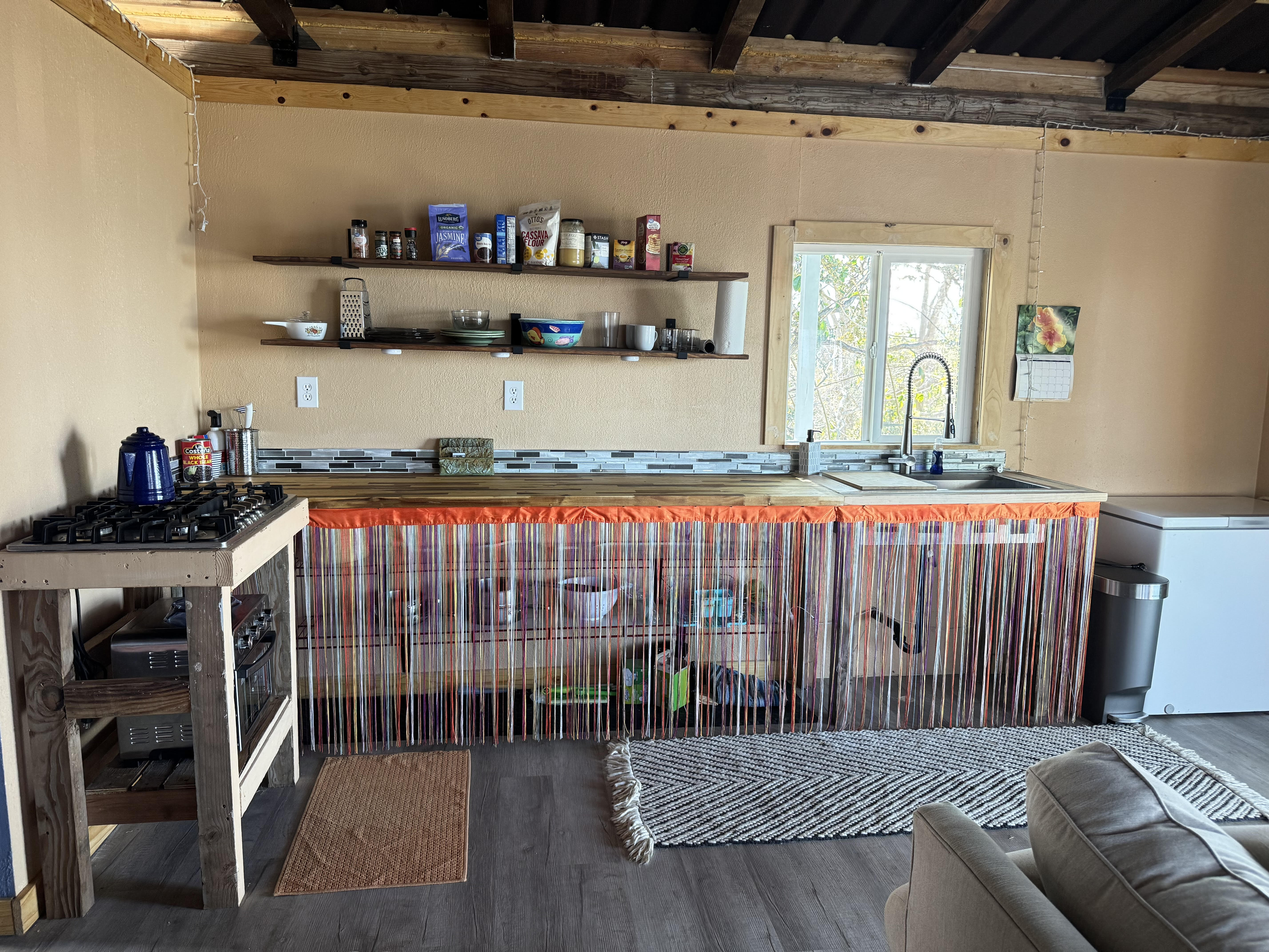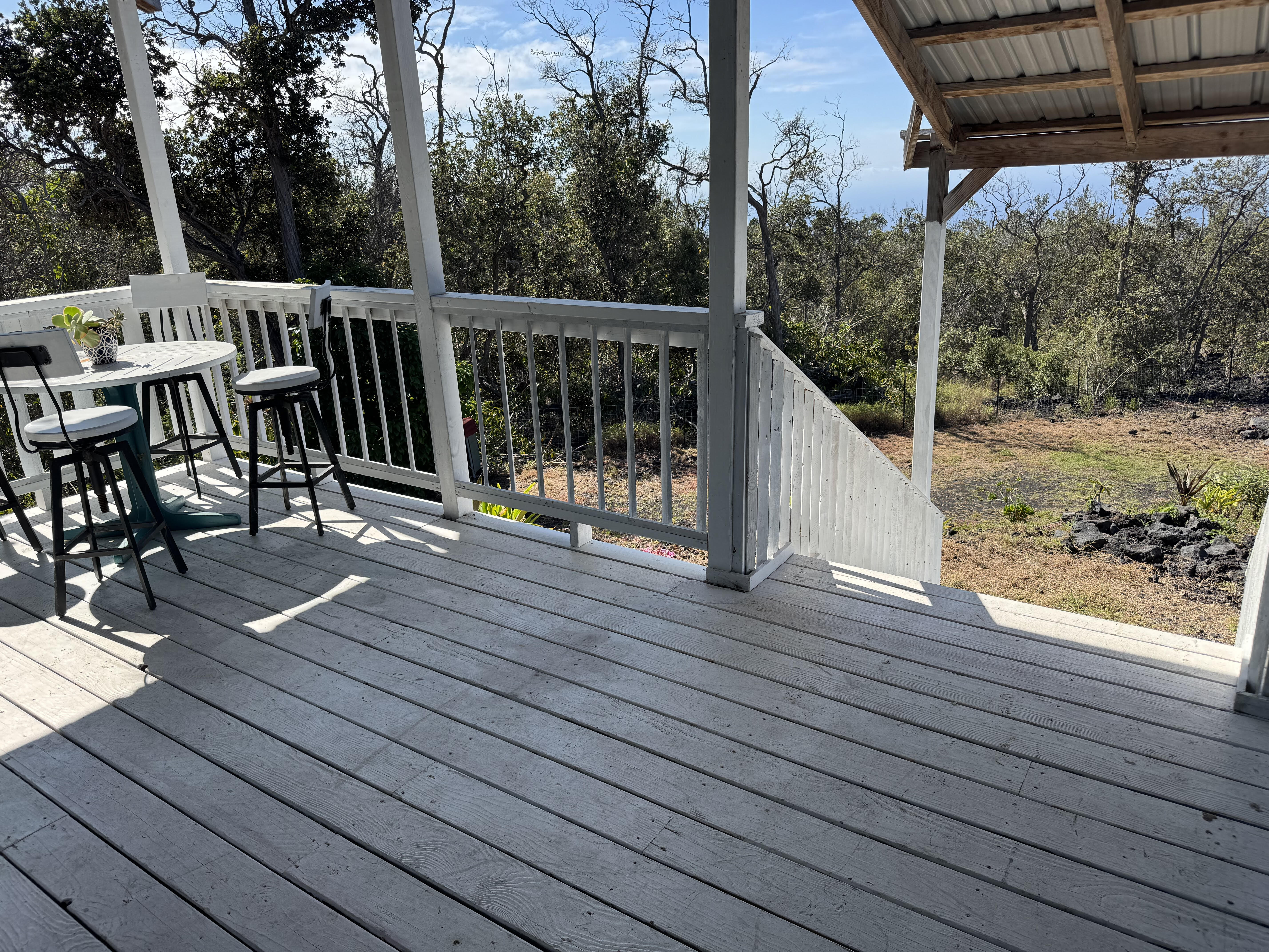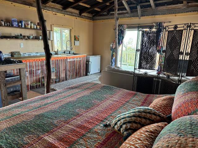 Furnished and move in ready! Lovely cabin in a quiet and serene setting with sunrise and ocean views. One acre terraced parcel with room for another home or structure on the upper level. Kitchen has a five burner gas cooktop and stainless steel farm sink.   The bathroom has faux marble countertops, toilet.