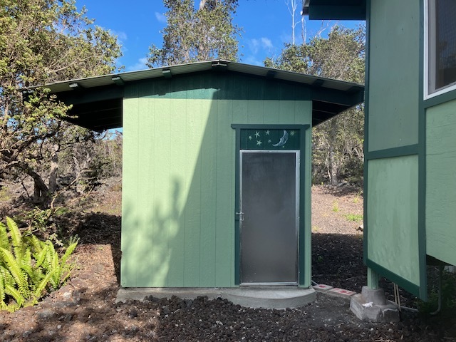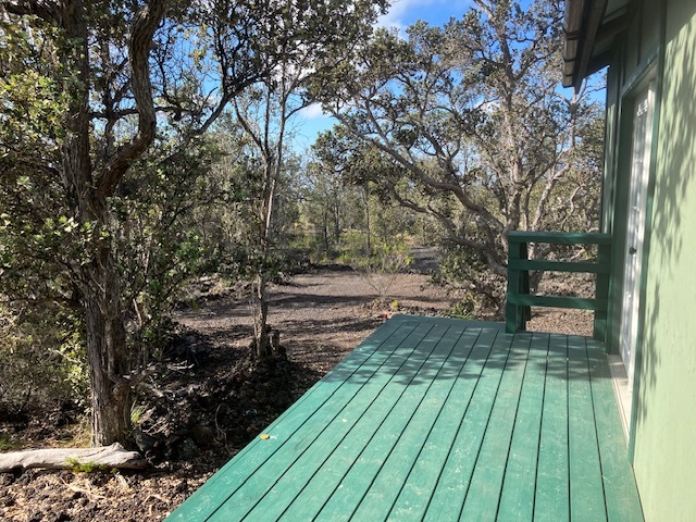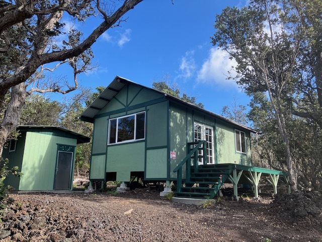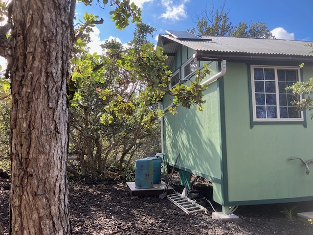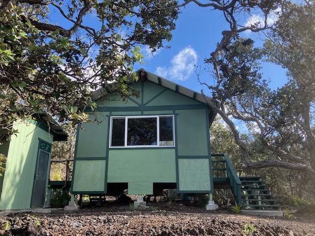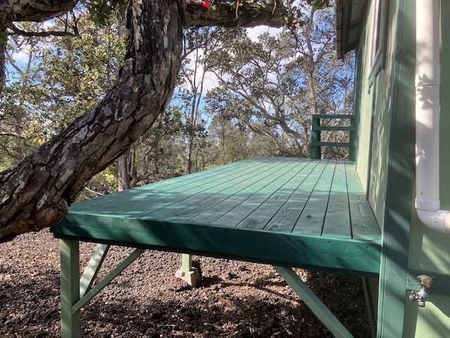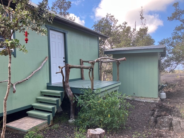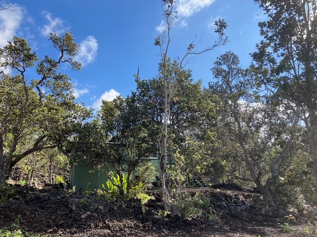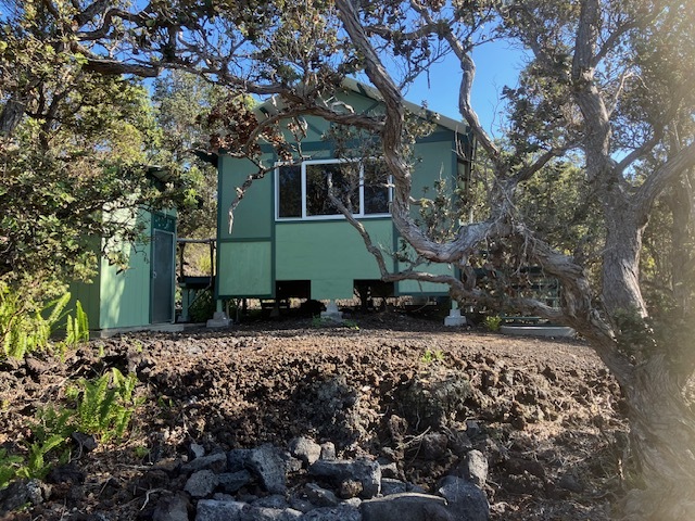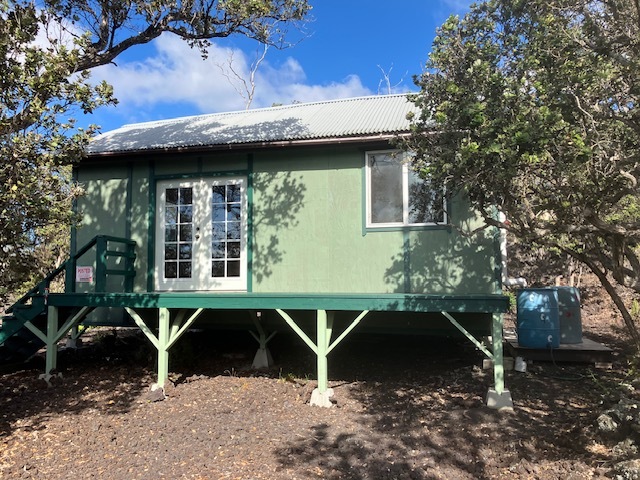 An attractive cabin in a lovely, forested location. The cabin is set back and private from the street, allowing plenty of opportunity to notice the breeze, the passing clouds and chirping birds enjoying the natural environment. Imagine the quiet mornings and evenings spent on the deck that can be in your future. The cabin has the basics, some solar to run the lights and the pump, some water storage for dishes and showers and a carpeted bedroom for a warm night time floor. Up front outdoors there is a sturdy storage area, which could become a pet enclosure and has multiple other potential uses. Please look carefully at the accompanying photos. This is an opportunity for someone looking for an affordable home on the Big Island to realize their dream. Ocean View Town Center is nearby for daily necessities; grocery stores, hardware store, gas stations, restaurants and center is adjacent to Highway 11 for trips to Kailua-Kona and the airport. Recreational and cultural opportunities are available all over the island and are usually open to everyone.