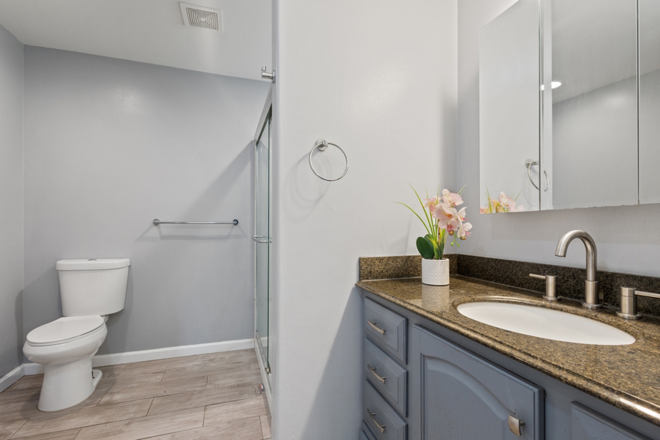 2 large south bedrooms share a full guest bath a new vessel, new cabinet, new bath/shower, new toilet.