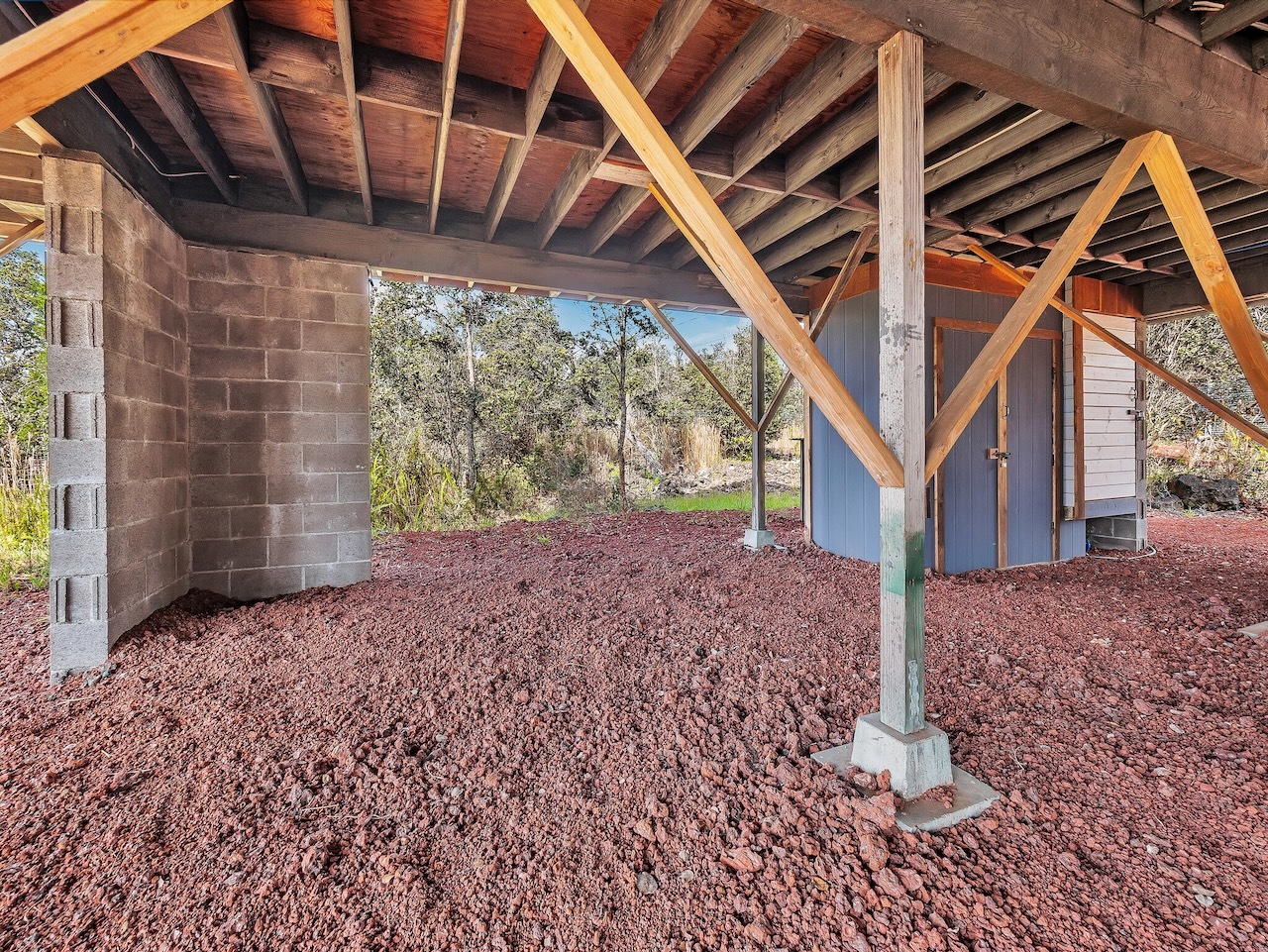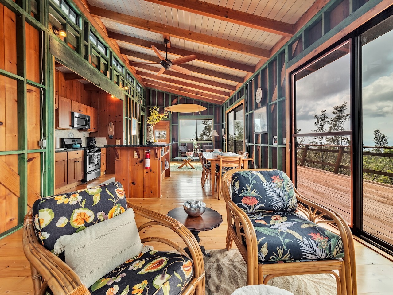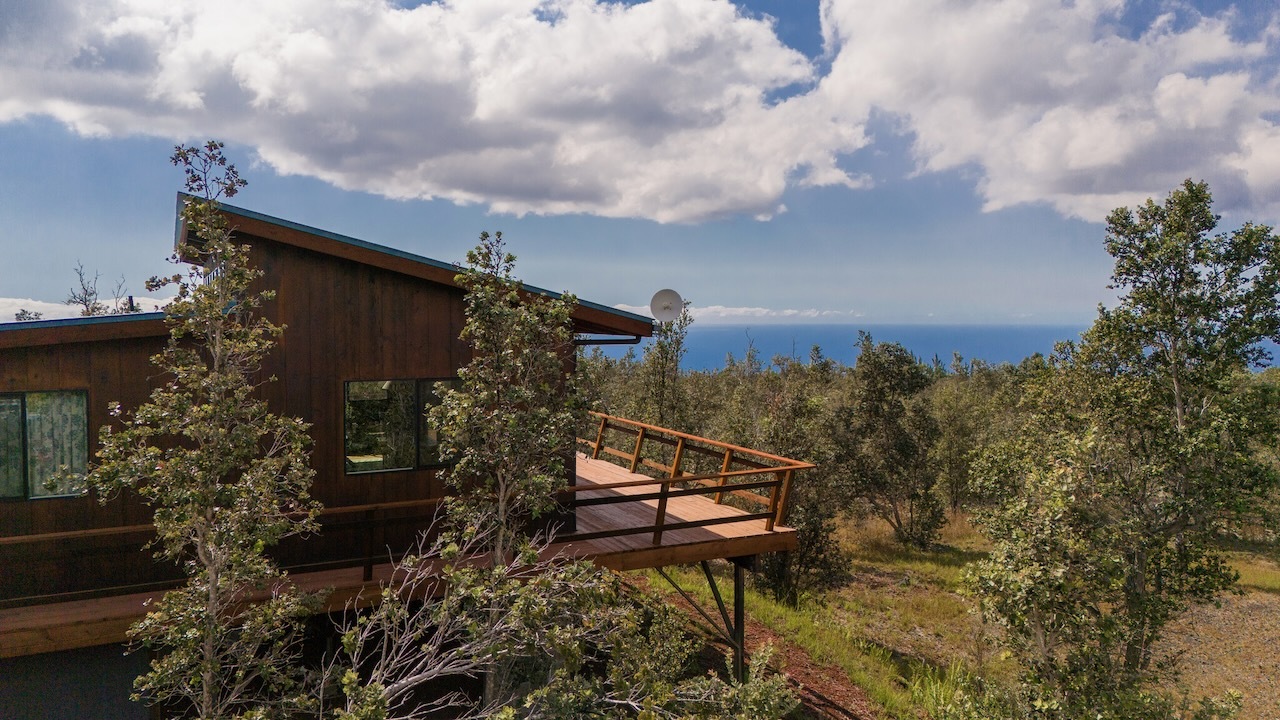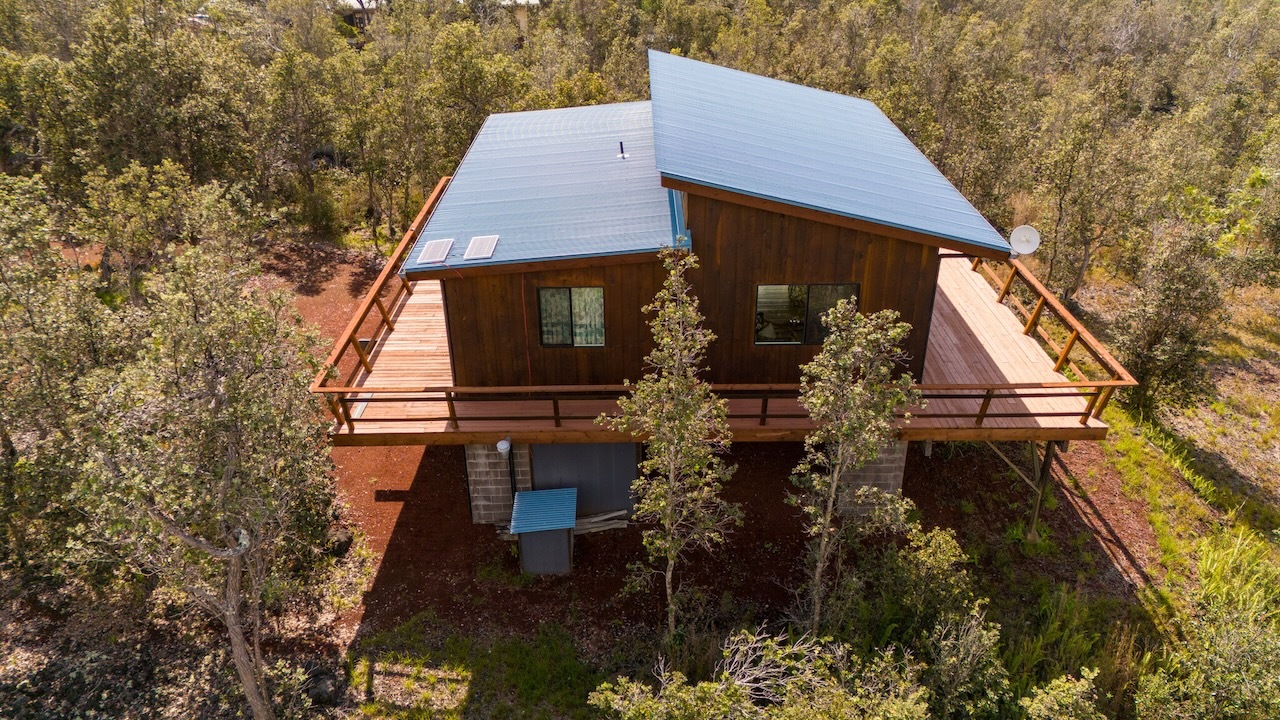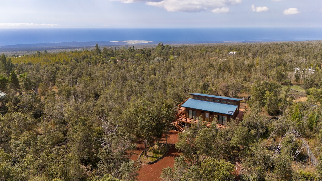 Beautifully crafted and full of character, this exceptional home offers privacy, ocean views, and old Hawai?i charm in a highly desirable area of Ocean View. Built with old-growth Northern California redwood–naturally termite resistant–the home features a one-of-a-kind front door reclaimed from a 1905 Victorian home in Manhattan Beach. An impressive Tiki (The God of Light) greets you upon entry. Inside, soaring ceilings and a spacious living area create an open, airy atmosphere. Soft pine flooring sourced from Northern CA and hand-milled in Hawaii adds warmth and authenticity throughout. The kitchen features a large island ideal for gatherings. Built-in shelving and two pedestal sinks in the bathroom add both charm and functionality. Enjoy stunning ocean views from the expansive wrap-around deck–recently repaired and painted–perfect for sunsets, entertaining, or simply taking in the lush, green surroundings. The redwood siding has been recently stained, and a new driveway gate enhances privacy and curb appeal. Set among old-growth ?Ohi?a trees in a quiet, peaceful setting, this off-grid property offers self-sufficient living with power supplied by a gas generator. The SSPP has been paid in full. The home is thoughtfully positioned for privacy while remaining part of a highly sought-after Ocean View neighborhood. The bathroom is currently accessed from the exterior, though it could easily be renovated to allow interior access from both bedrooms, offering future flexibility. Gas, groceries, restaurants, hiking, and beaches are nearby–offering convenience without sacrificing tranquility. A truly special offering combining craftsmanship, serenity, and island living. Property is sold together with the adjacent lot, actively listed as MLS 726865. $310k price includes both lots.