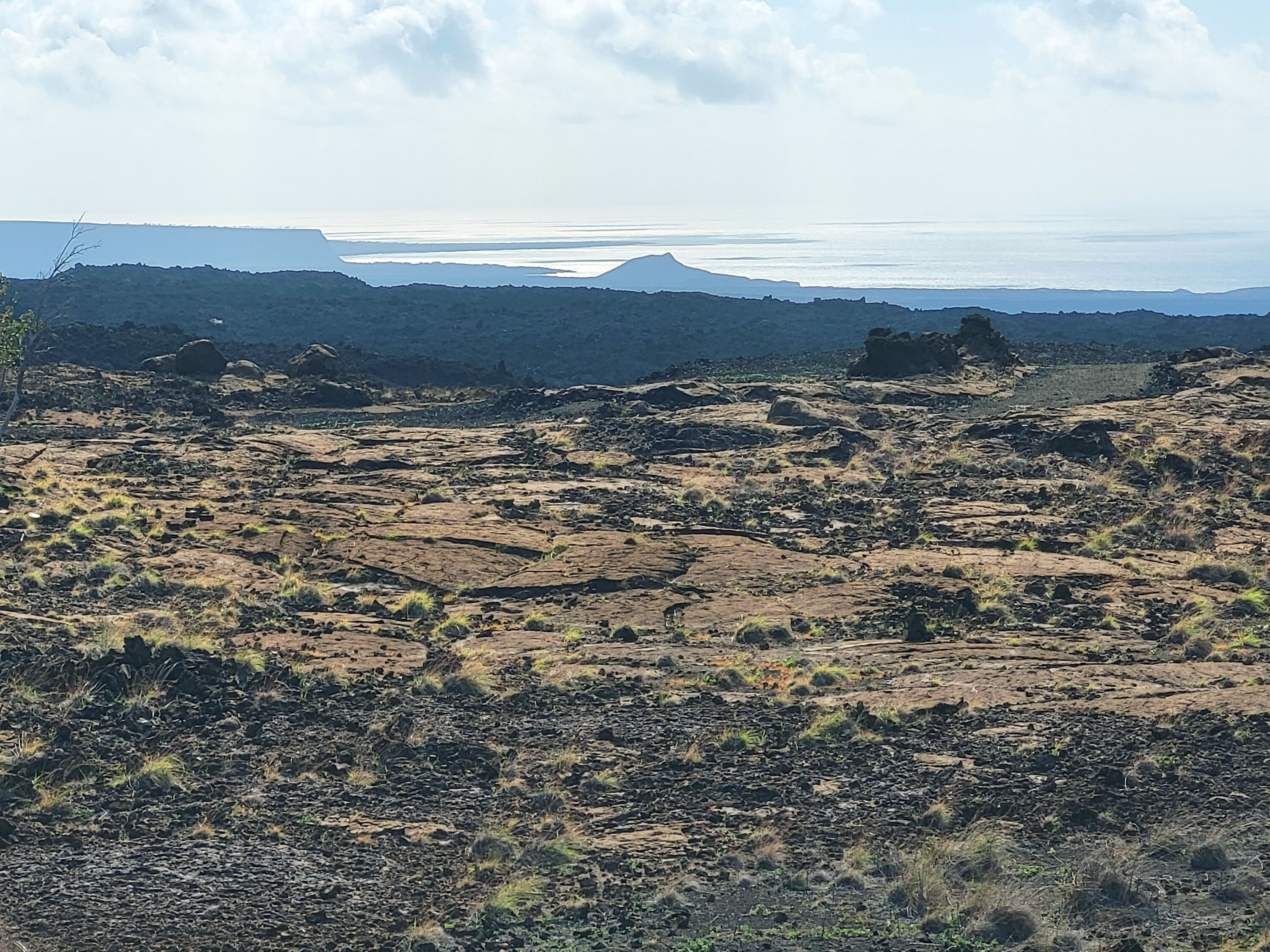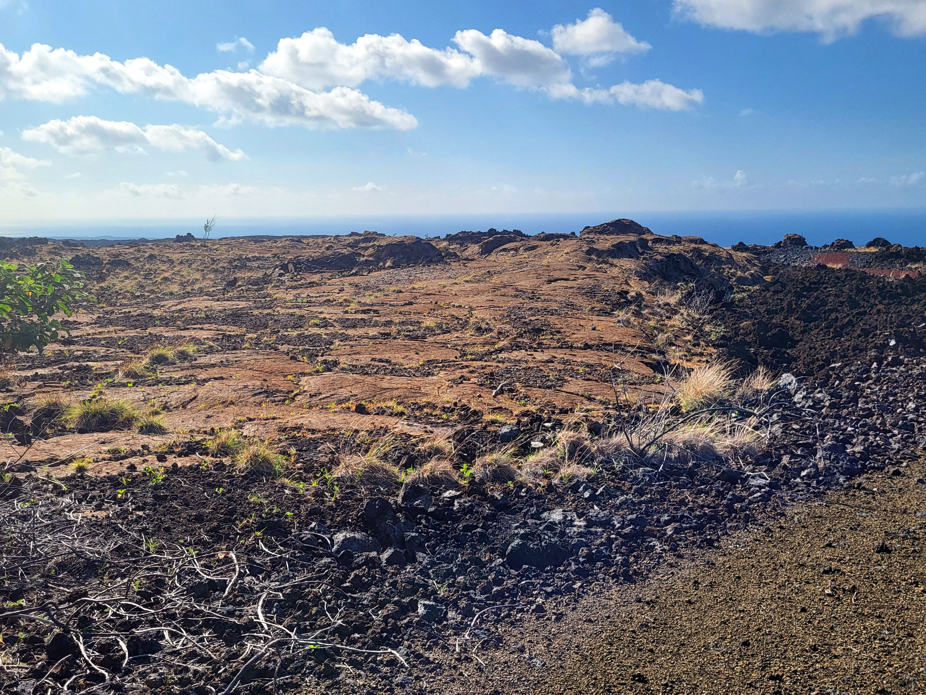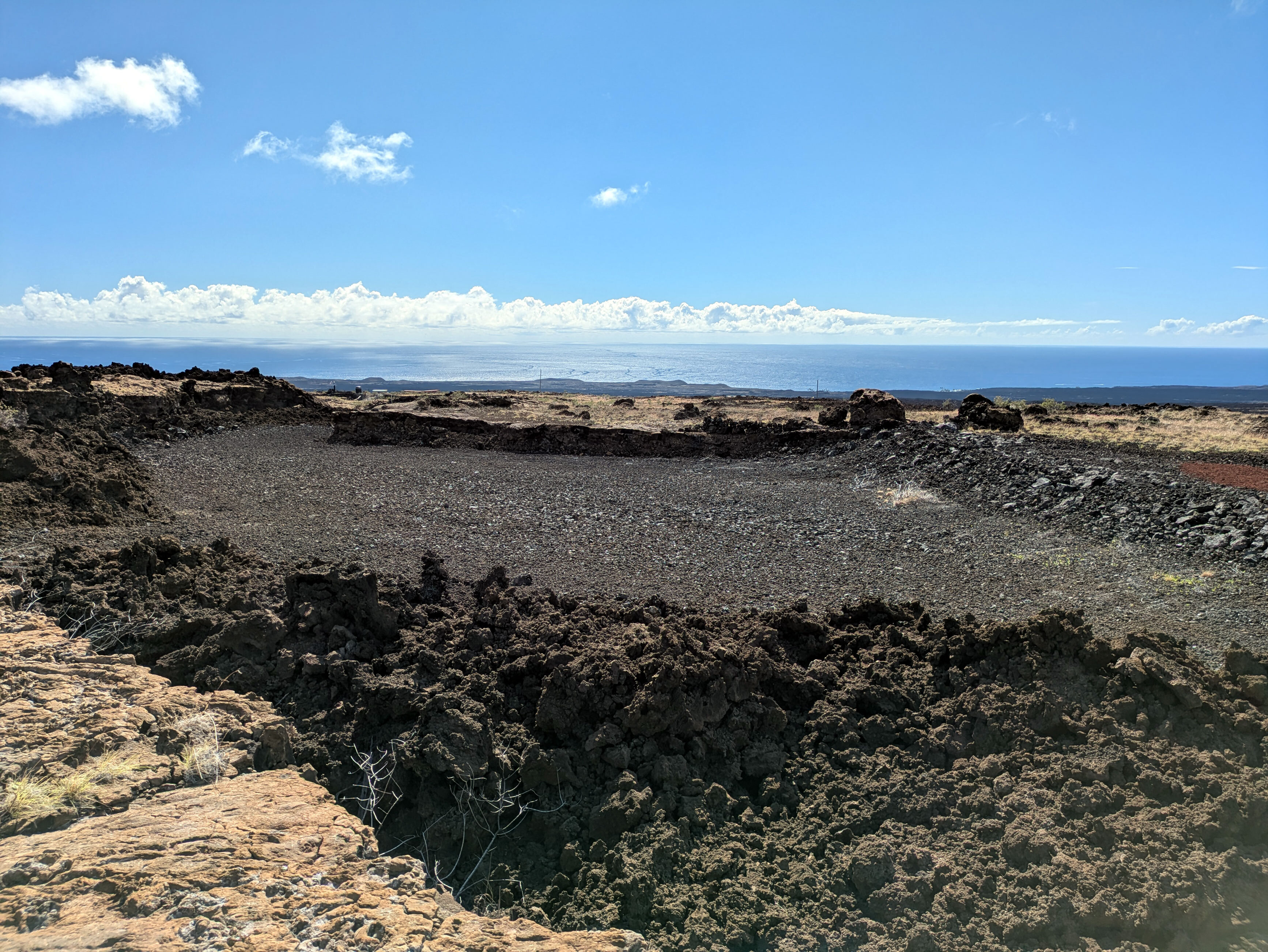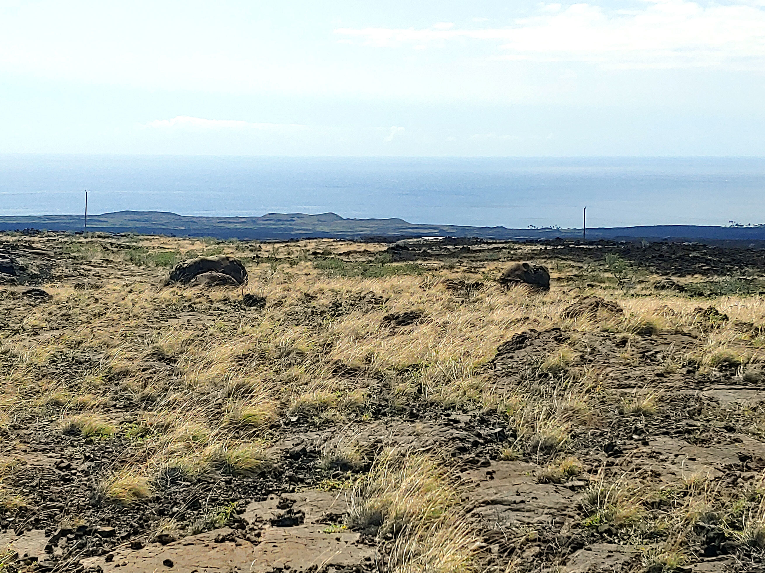 3.3 acre lot perched near the east end of Tapa Drive in the Hawaiian Ocean View Ranchos subdivision on Hawaii Island. The lot is selectively graded, providing driveway access to a prime house site and an expansive graded plot also suitable for a house, additional structures and a septic field. Approximately half of the 3.3 acres surface features pahoehoe lava slabbing. Using post and beam type foundation, a home could be constructed on the pahoehoe without additional grading, thus preserving the site’s natural character. The already graded areas are purposely contained within the portion of a collapsed lava tube that transits the lot. The site offers a spectacular 90 degree-expanse view of ocean, coastline and sunsets. A border of the Kahuku-Pohue unit of Hawaiian Volcanoes National Park abuts the Ranchos subdivision just east of the lot. Pohue Bay beach is 2 -3/4 miles by ancient foot trail from a nearby trailhead. The lot has grid-electricity available. Ocean View Town Center is four miles or approximately ten minutes away and has three grocery stores, post office, restaurants, hardware store, and three gas stations. Drive-to beaches (Punalu’u and Ho’okena) are approximately 30 minutes away via Highway 11.