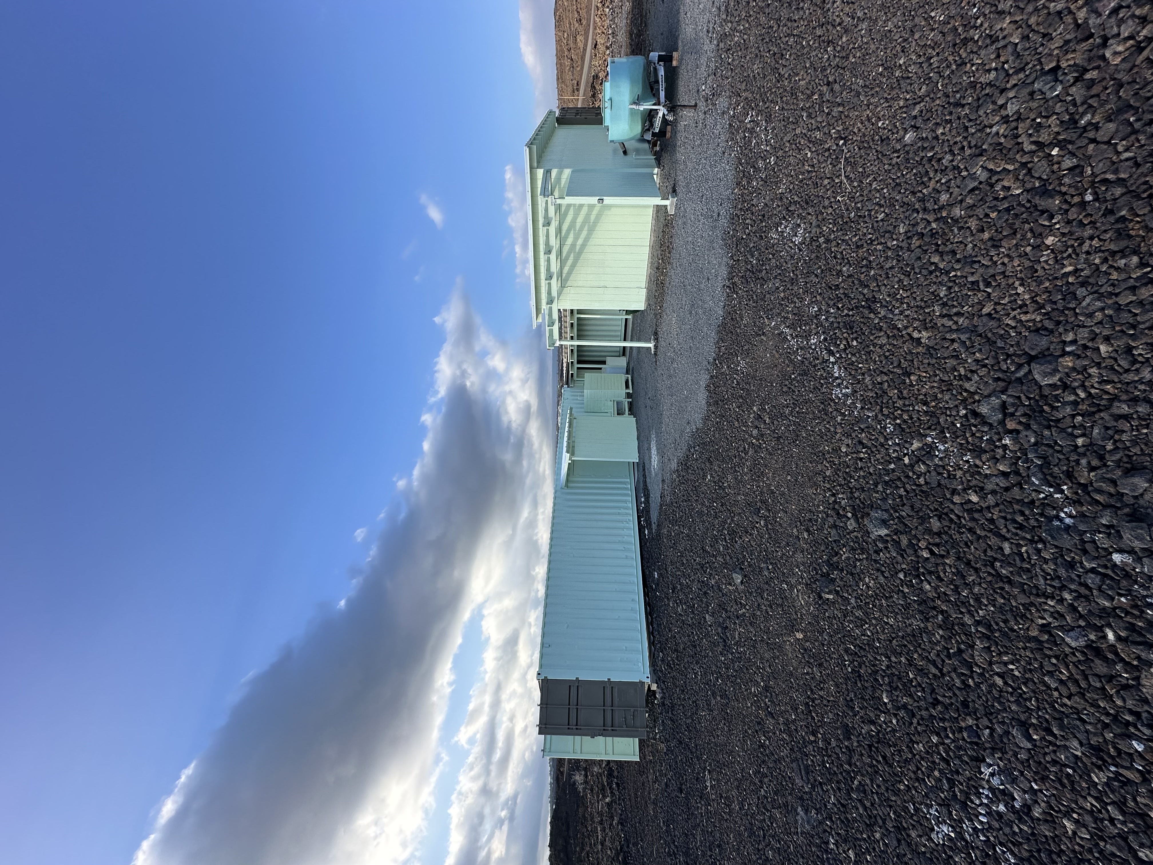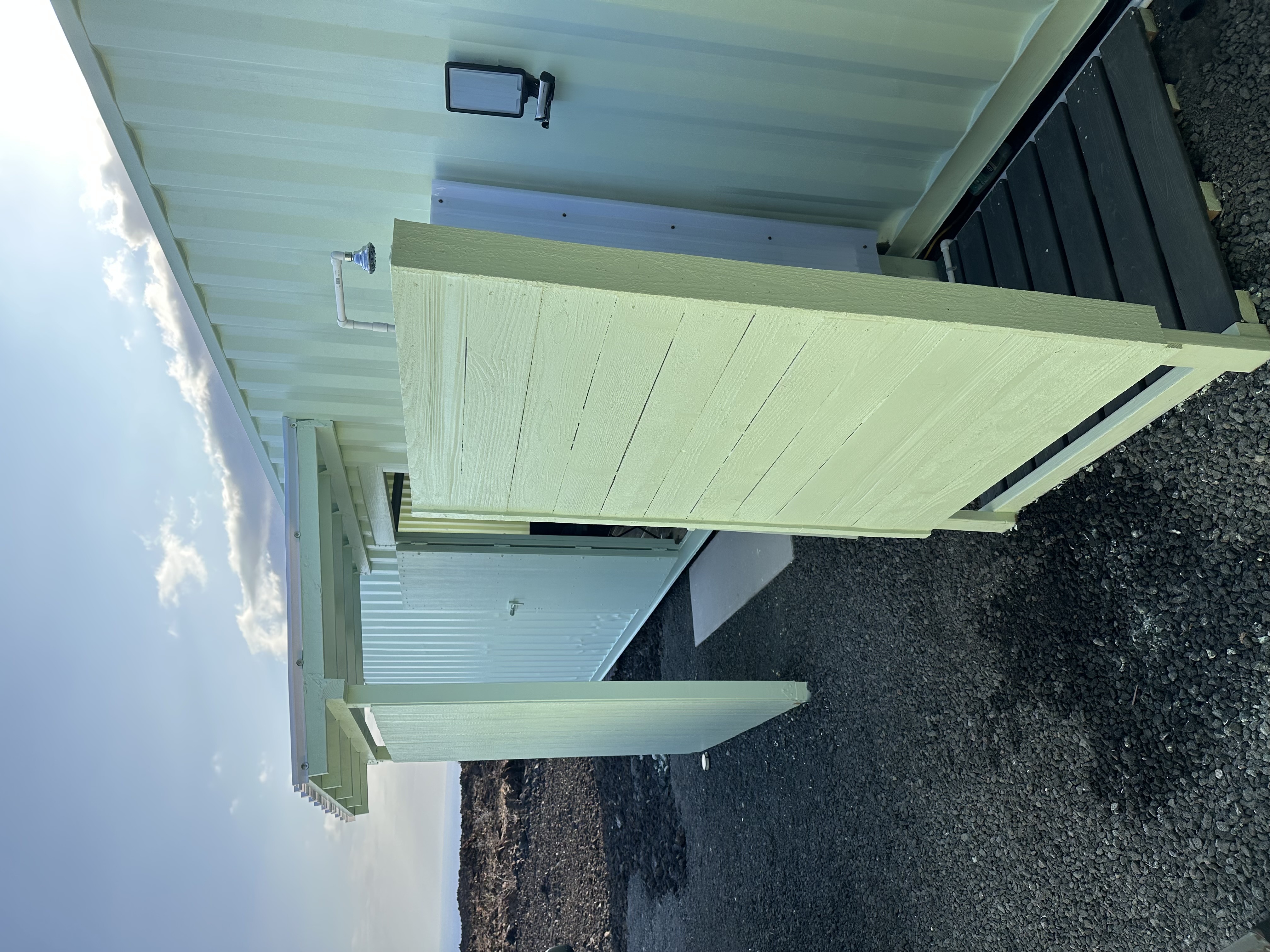 A 40-ft steel shipping container has been converted into a stylish & functional living area, painted interior walls, installed flooring, a sink, water closet, & outdoor shower. System runs on 800-watt solar. A second 40-ft container currently serves as secure storage.