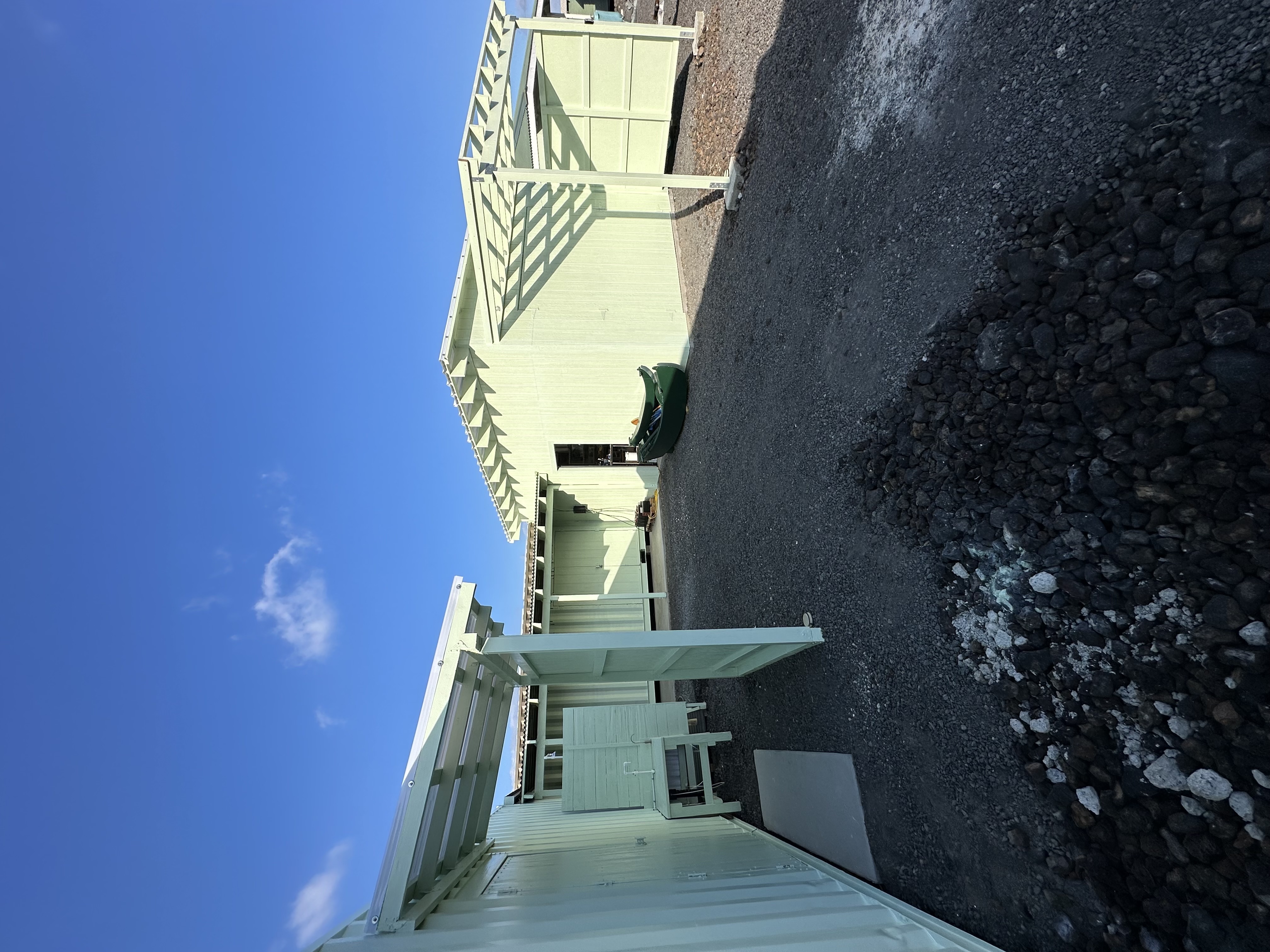 The second structure is a charming studio featuring a wall of windows facing the ocean, bringing in abundant natural light. A privacy wall leads to the entry door and a spacious open-air lanai. Inside, you’ll find a pebble-floor shower and vinyl plank flooring in the bathroom. Powered by a 400-watt solar system, it offers both comfort and independence.