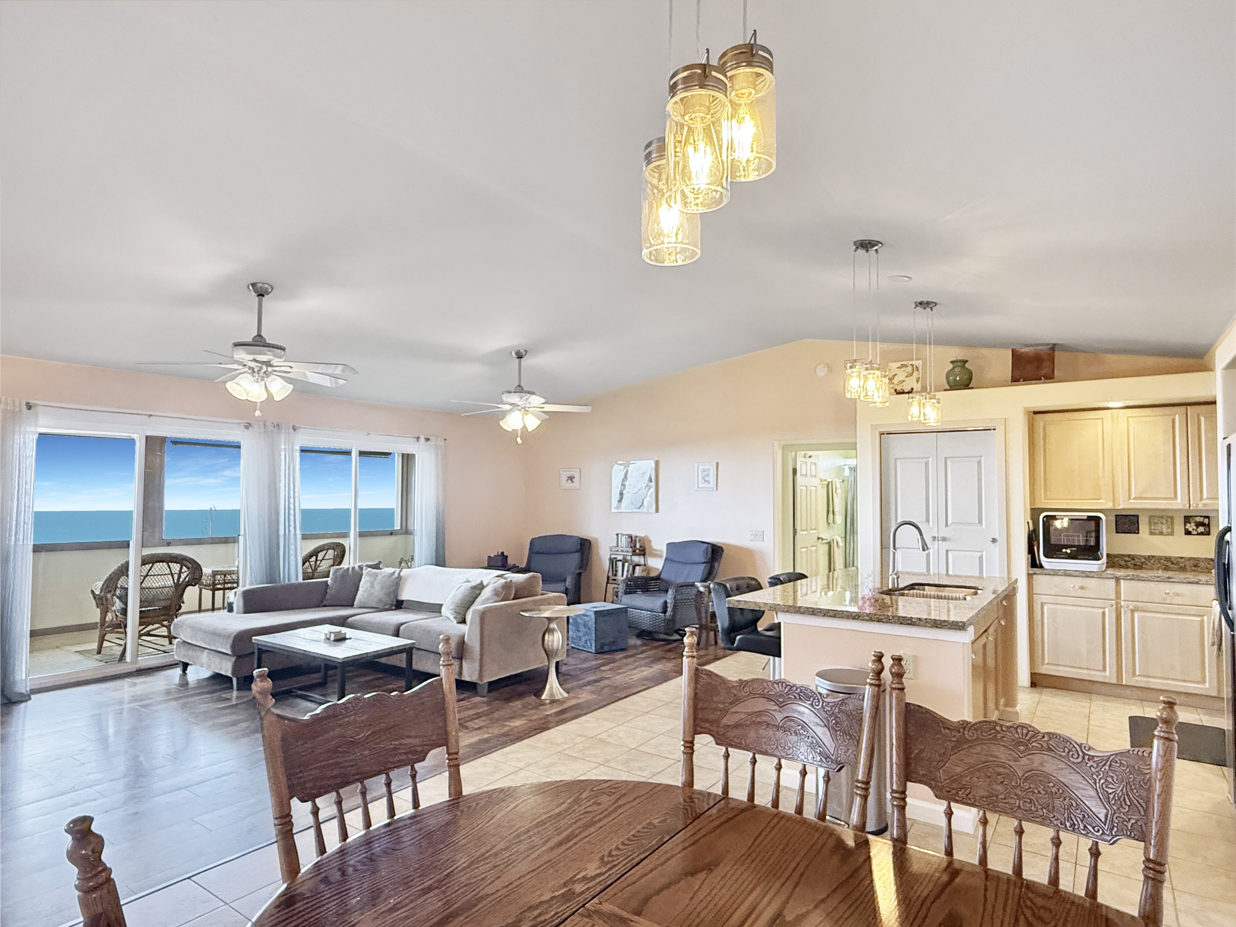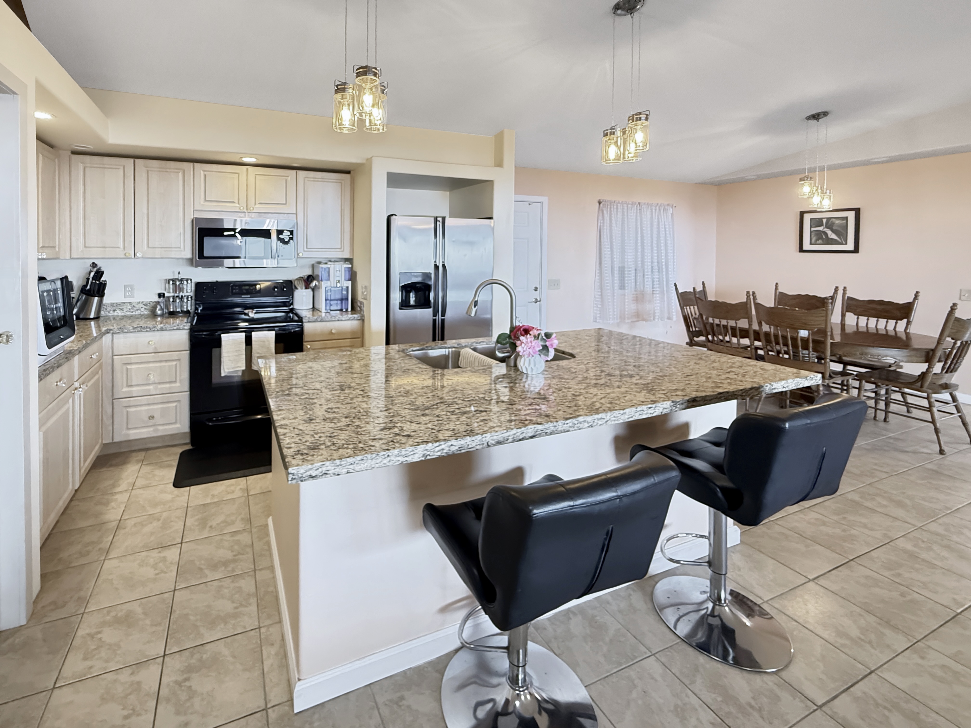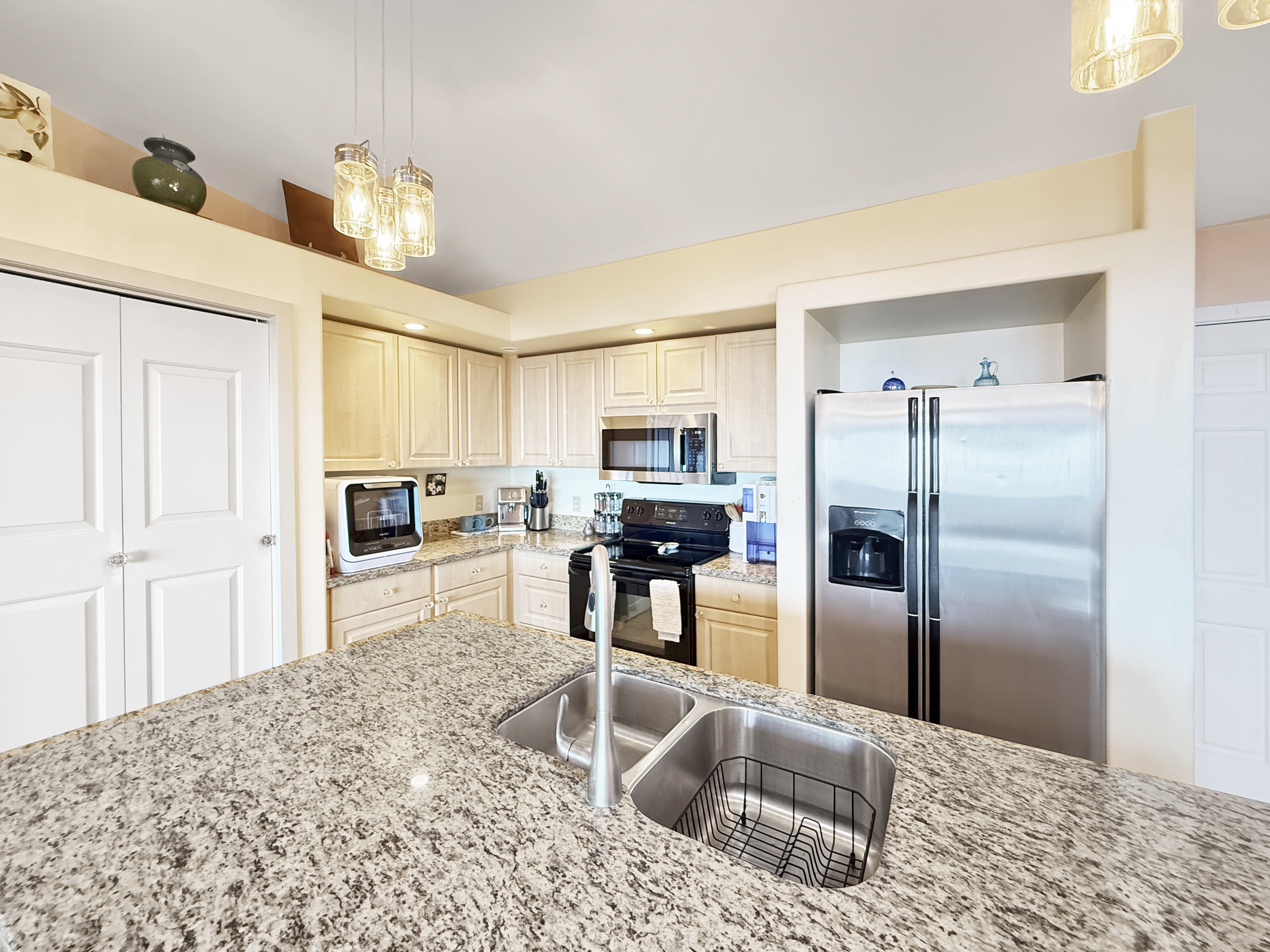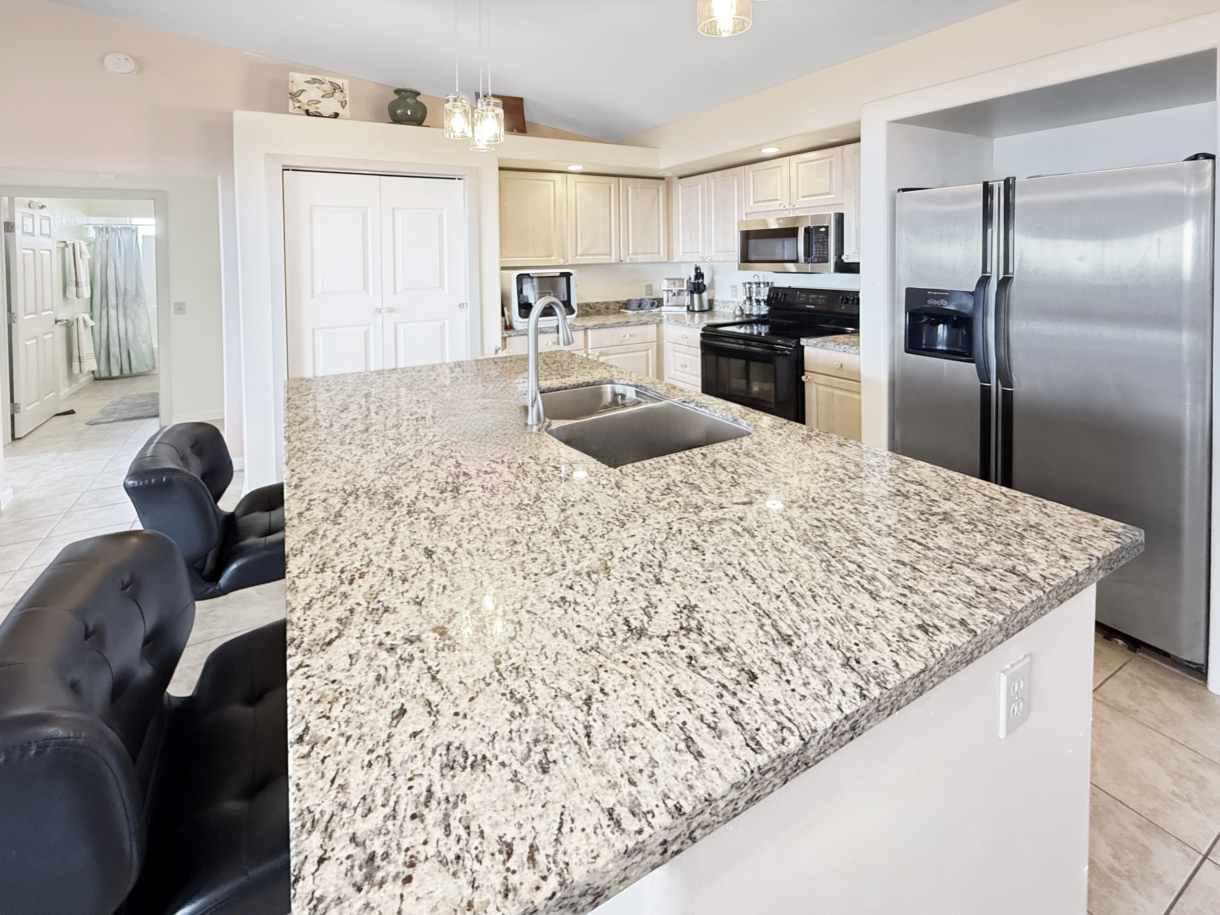 ~ The central living area includes a kitchen w/granite counters, a sit-down island w/ double sink, countertop dishwasher, side-by-side refrigerator, flat-top range, & built-in microwave/hood.