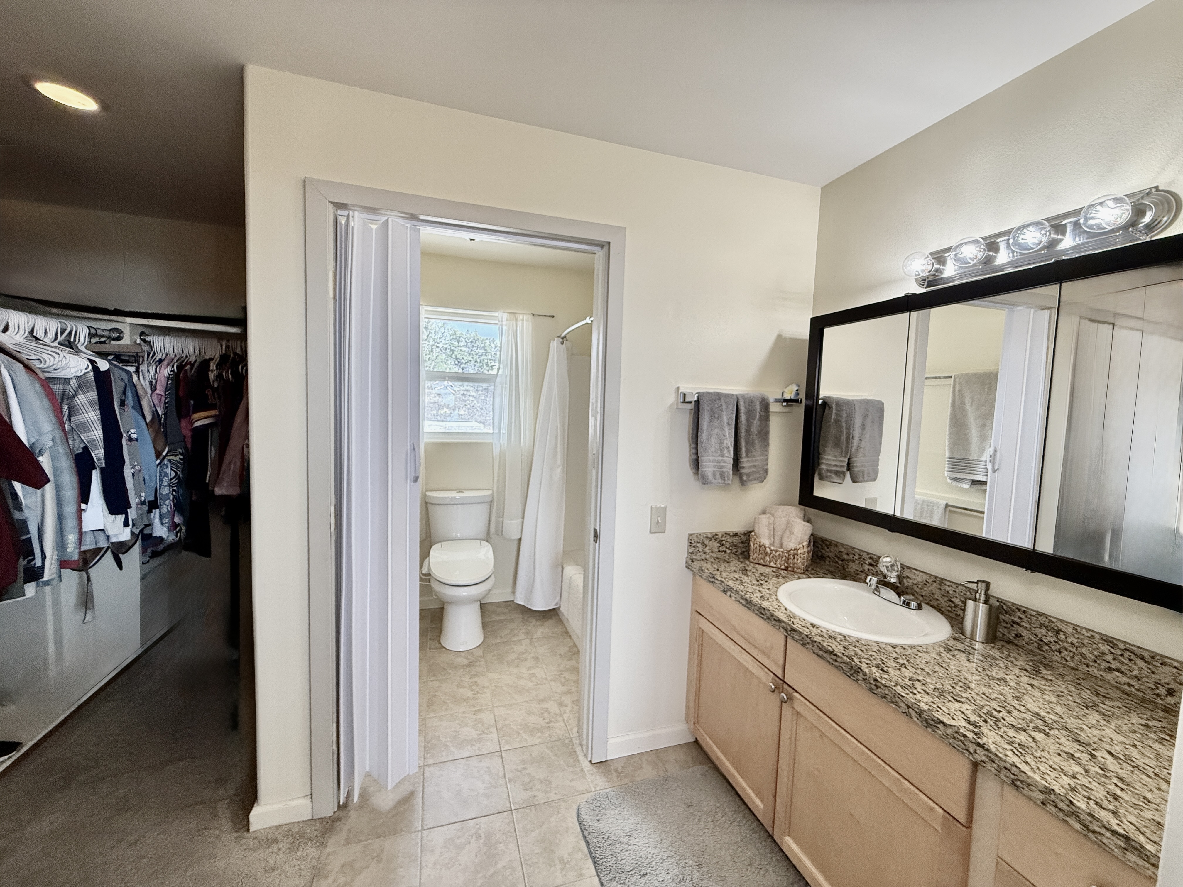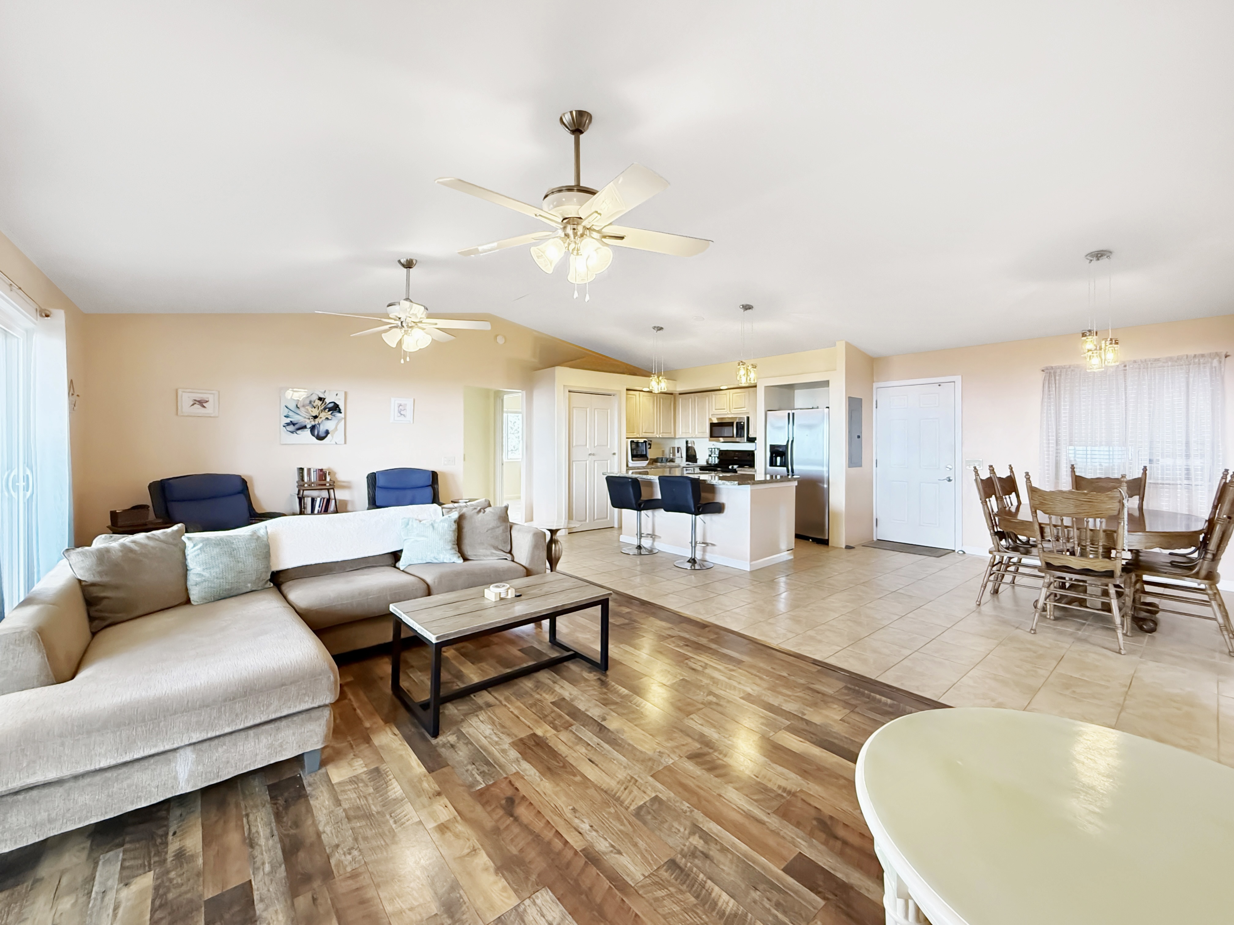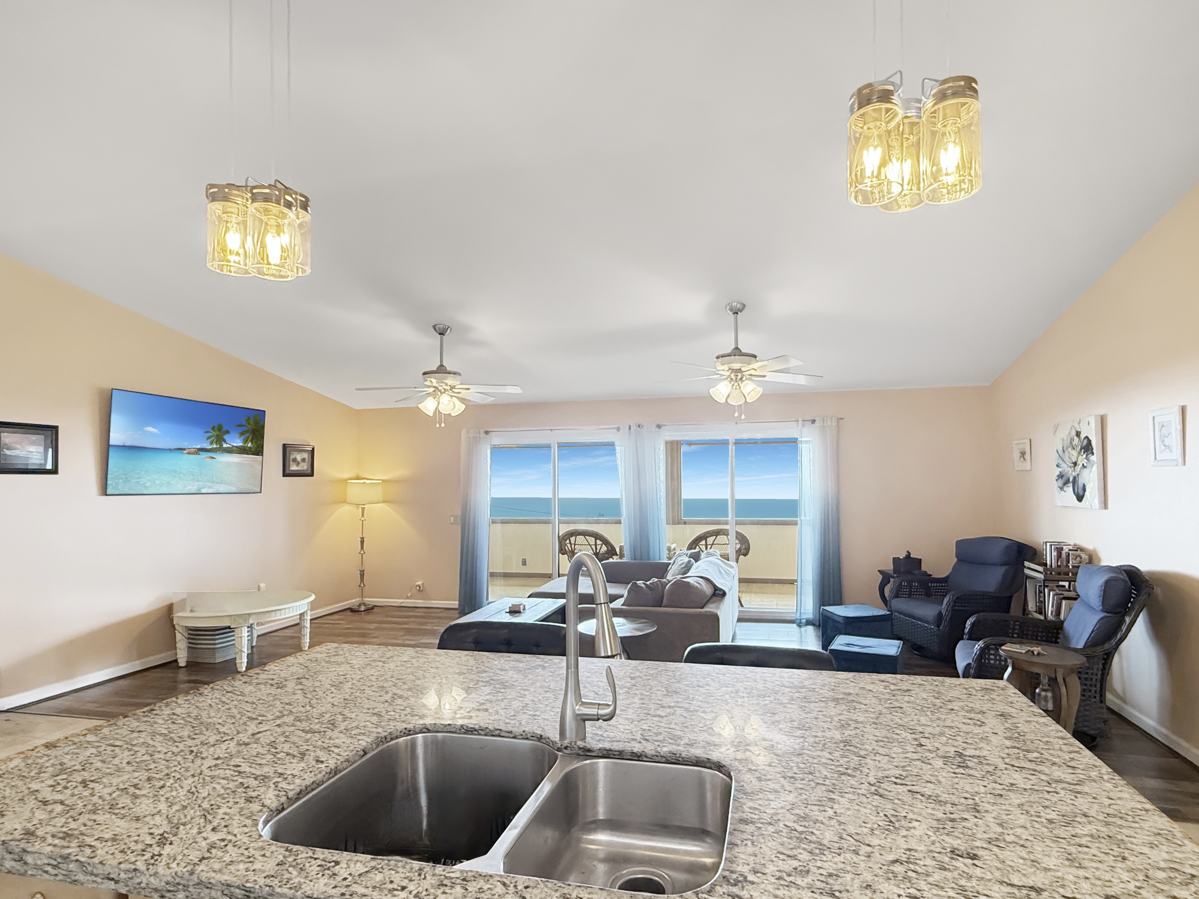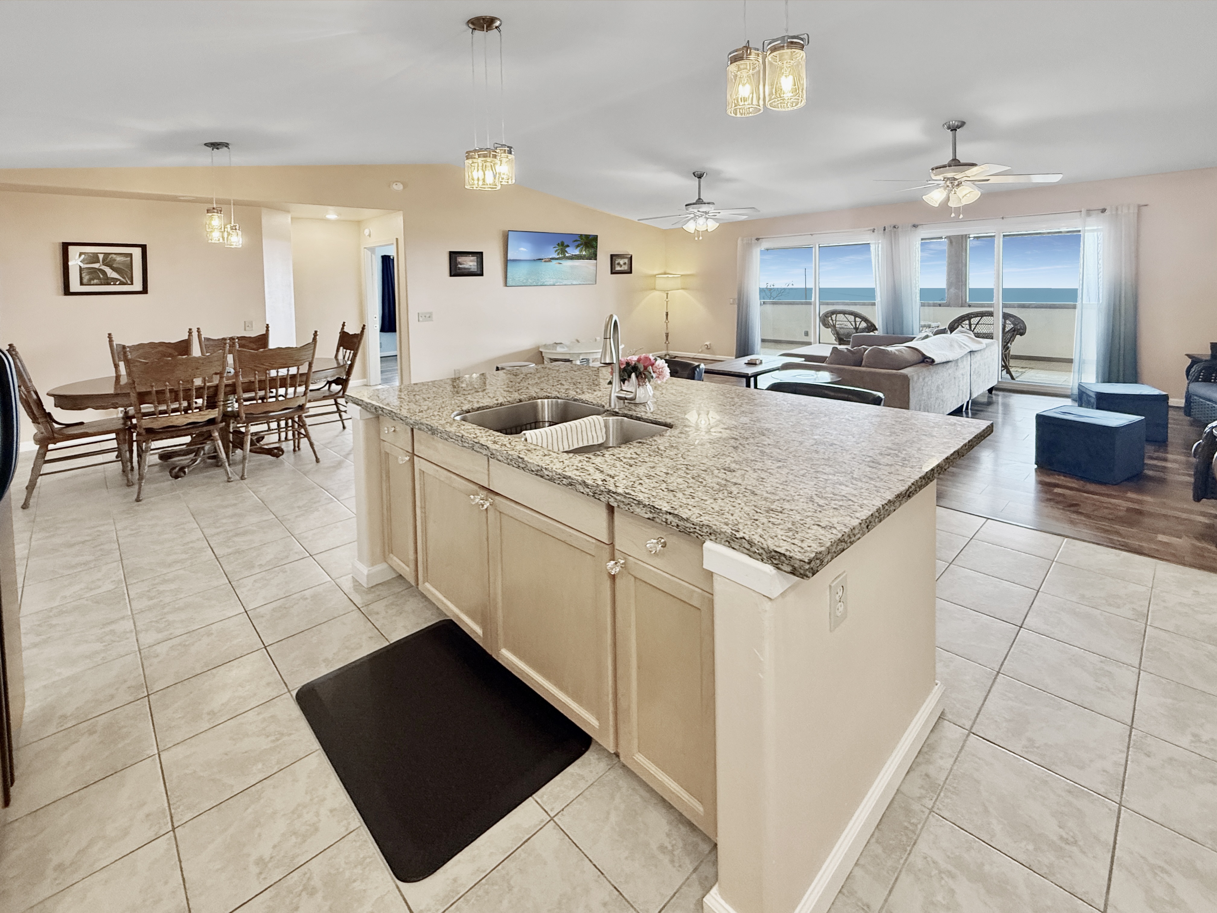 ~ The central living area includes a kitchen w/granite counters, a sit-down island w/ double sink, countertop dishwasher, side-by-side refrigerator, flat-top range, & built-in microwave/hood.