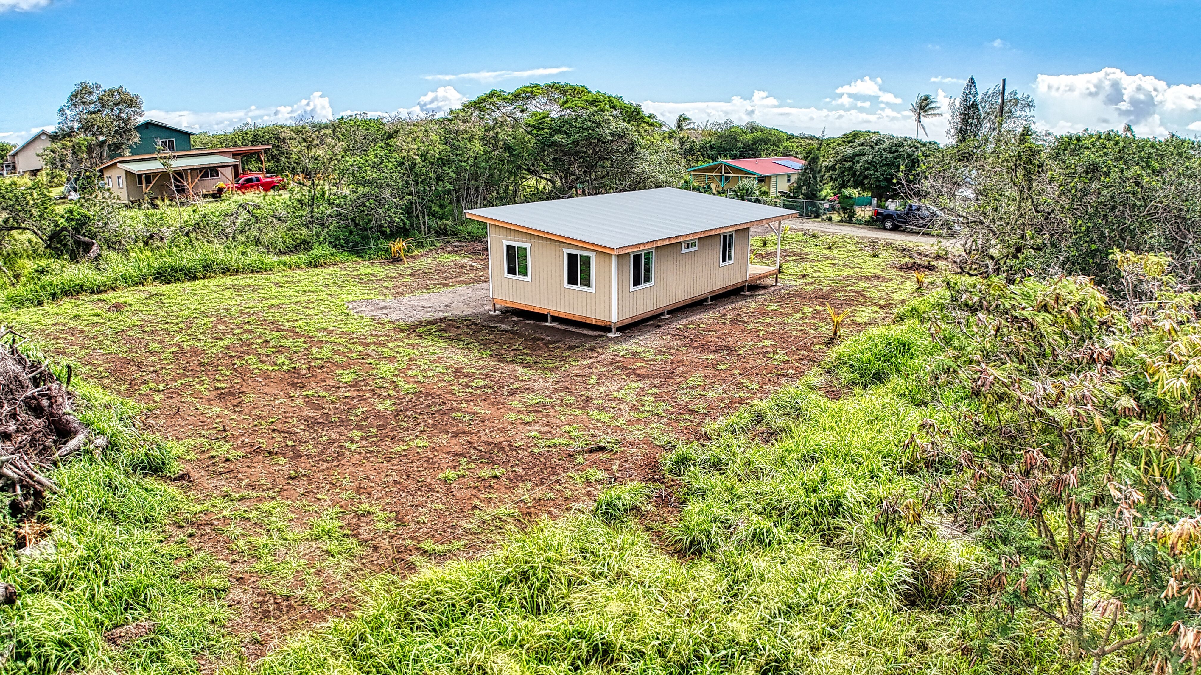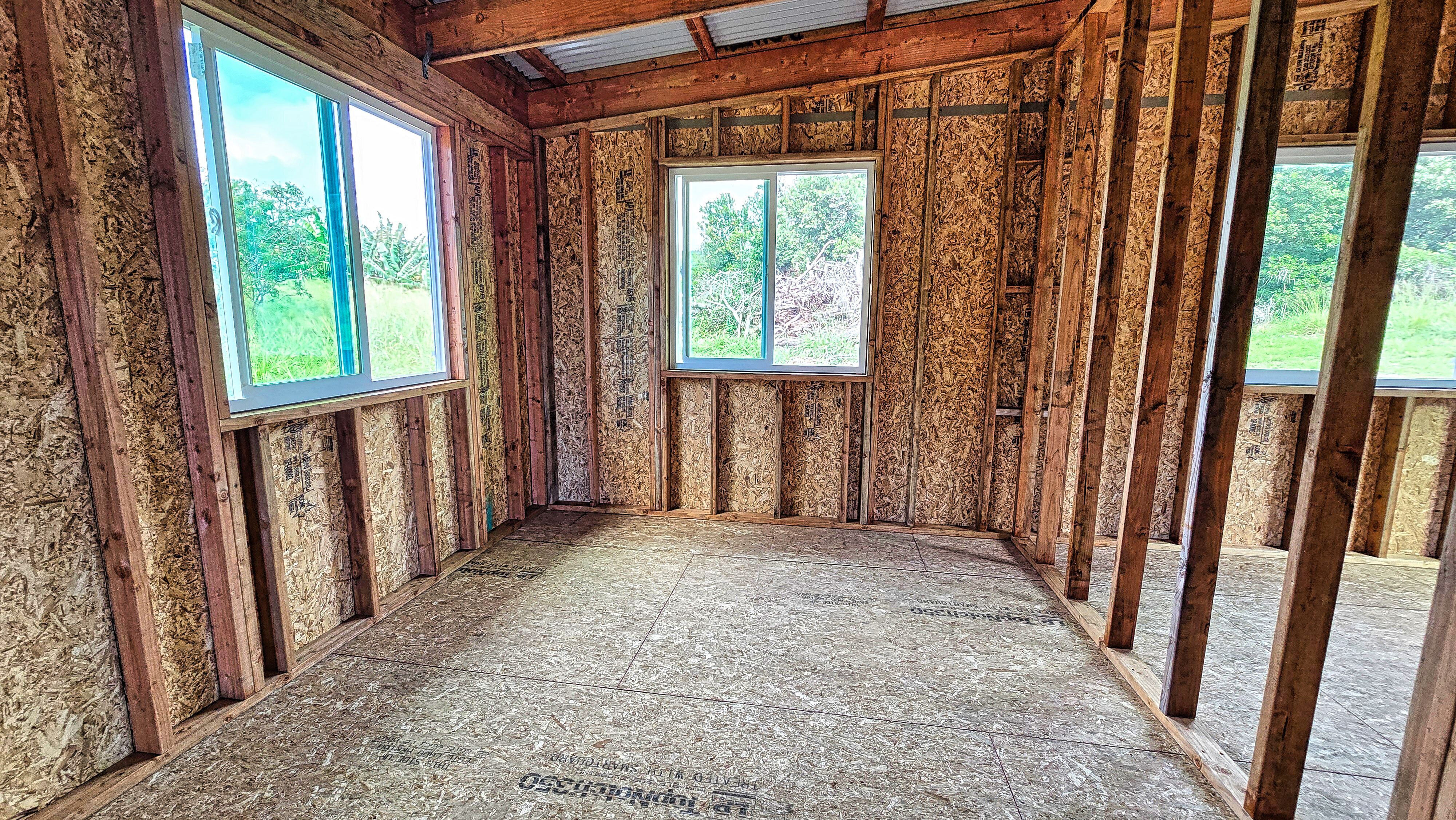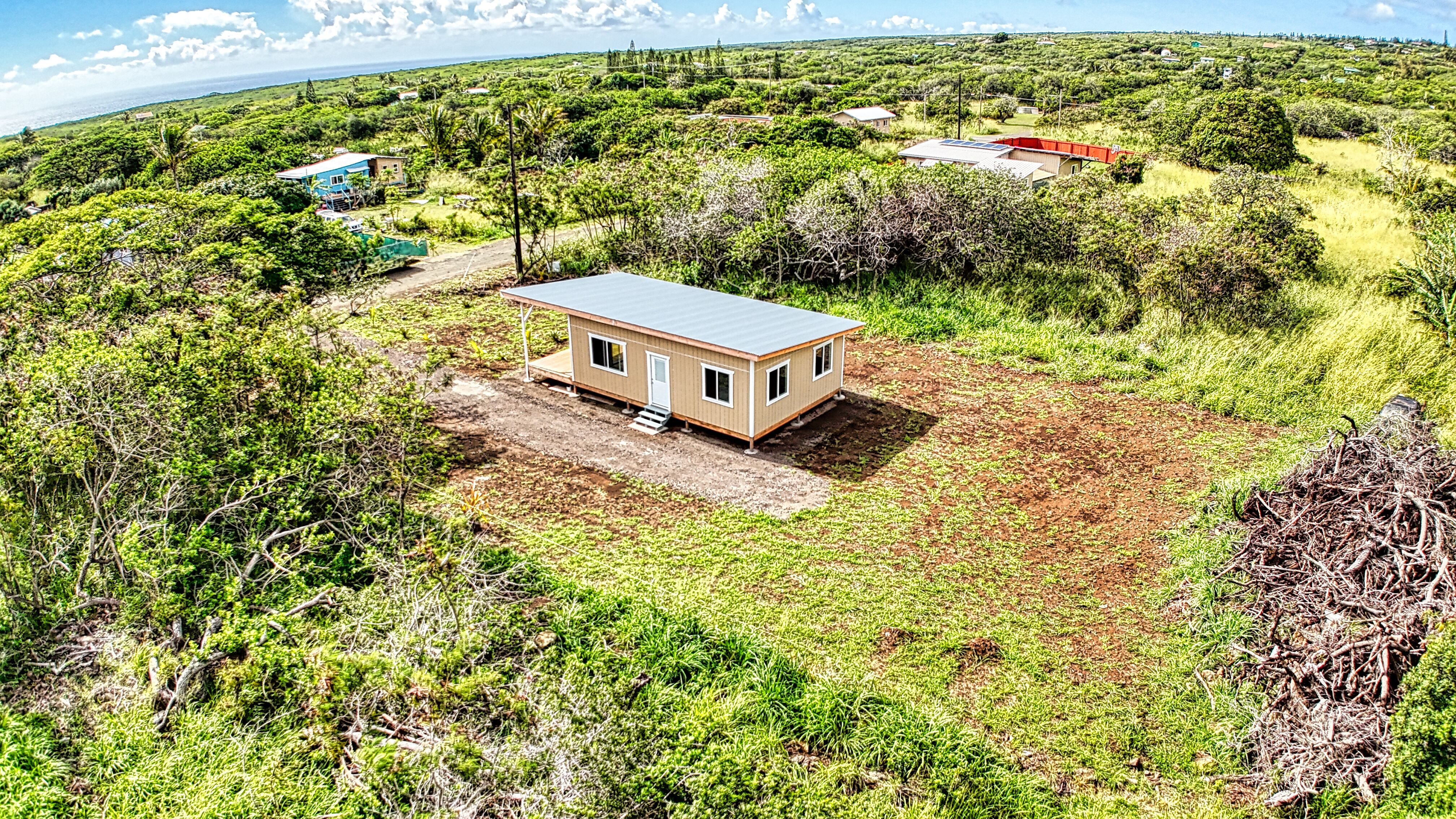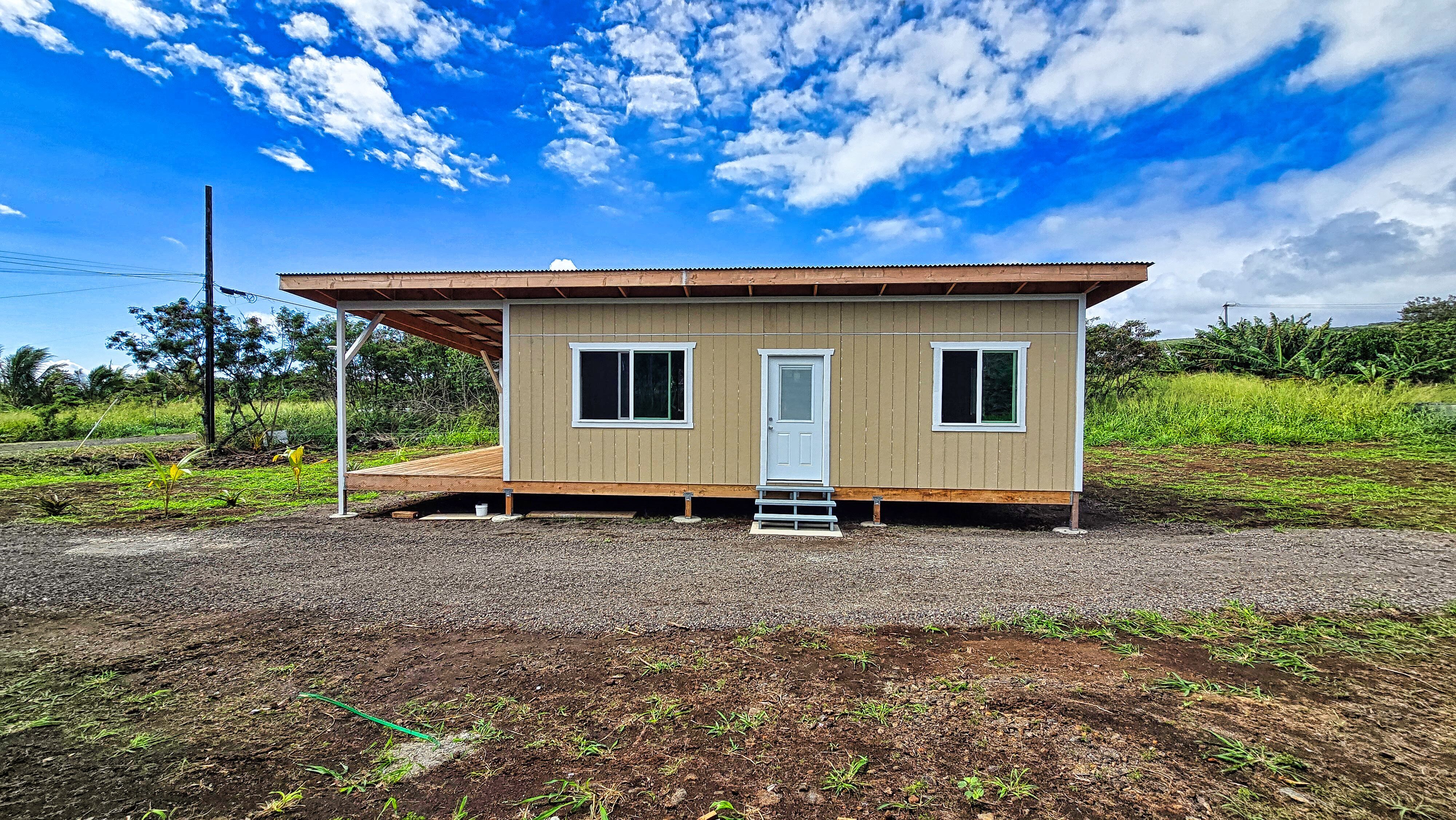 A brand new 2-bedroom, 1-bath, approx. 600 sq ft cottage with 200 sq ft lanai on a beautifully landscaped 1/4 acre lot with several tropical plants including coconut and banana trees. Located in Kiolakaa Homesite Subdivision, it's ready for you to finish exactly the way you want. The heavy lifting is done: cleared lot, bulldozed house pad, gravel driveway, modern roof design gives a cathedral ceiling feel in the open kitchen, living and dining room area. Dual-pane windows, exterior siding and trim, and a spacious covered front lanai that extends your living space outdoors and catches the cool Ka?u trades. Inside, the open framing makes it easy to visualize your layout and select your preferred finishes–sheetrock, board-and-batten, or paneling; hardwood, tile, or other flooring; plus your choice of cabinets and countertops. This is an ideal opportunity for a buyer who wants a “head start” build without taking on raw-land construction from scratch. Located just south of Na?alehu, you are minutes from everyday essentials such as post office, bank, gas, small markets, hardware and the famous Punalu?u Bake Shop. A short drive brings you to Punalu?u Black Sand Beach, South Point (Ka Lae), and the trail to Papakolea Green Sand Beach–some of the Big Island’s most iconic coastlines–all while enjoying the peaceful country feel of Ka?u. Cesspool and catchment tank can be added for an additional fee. There is no roughed in plumbing or electrical.