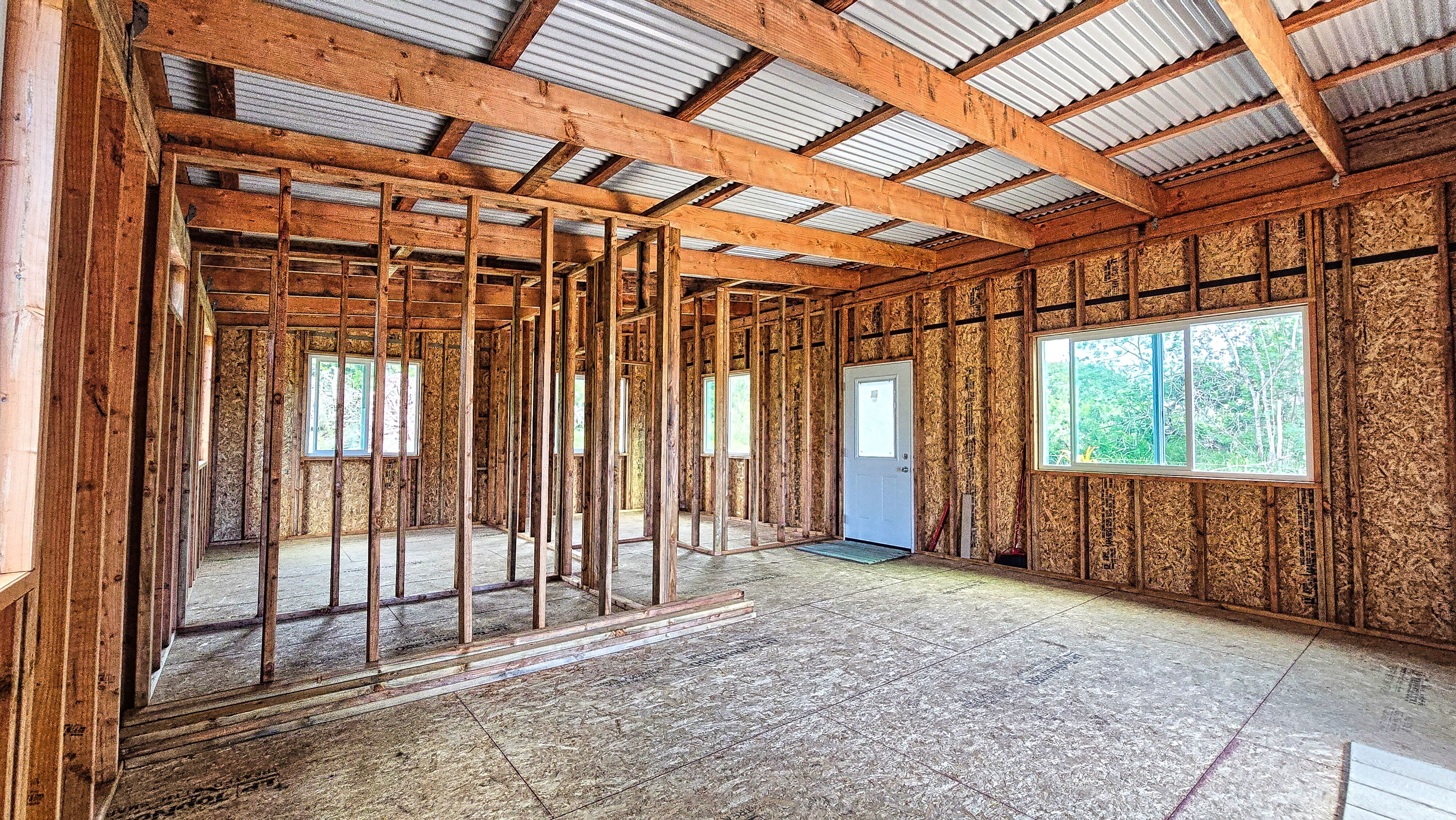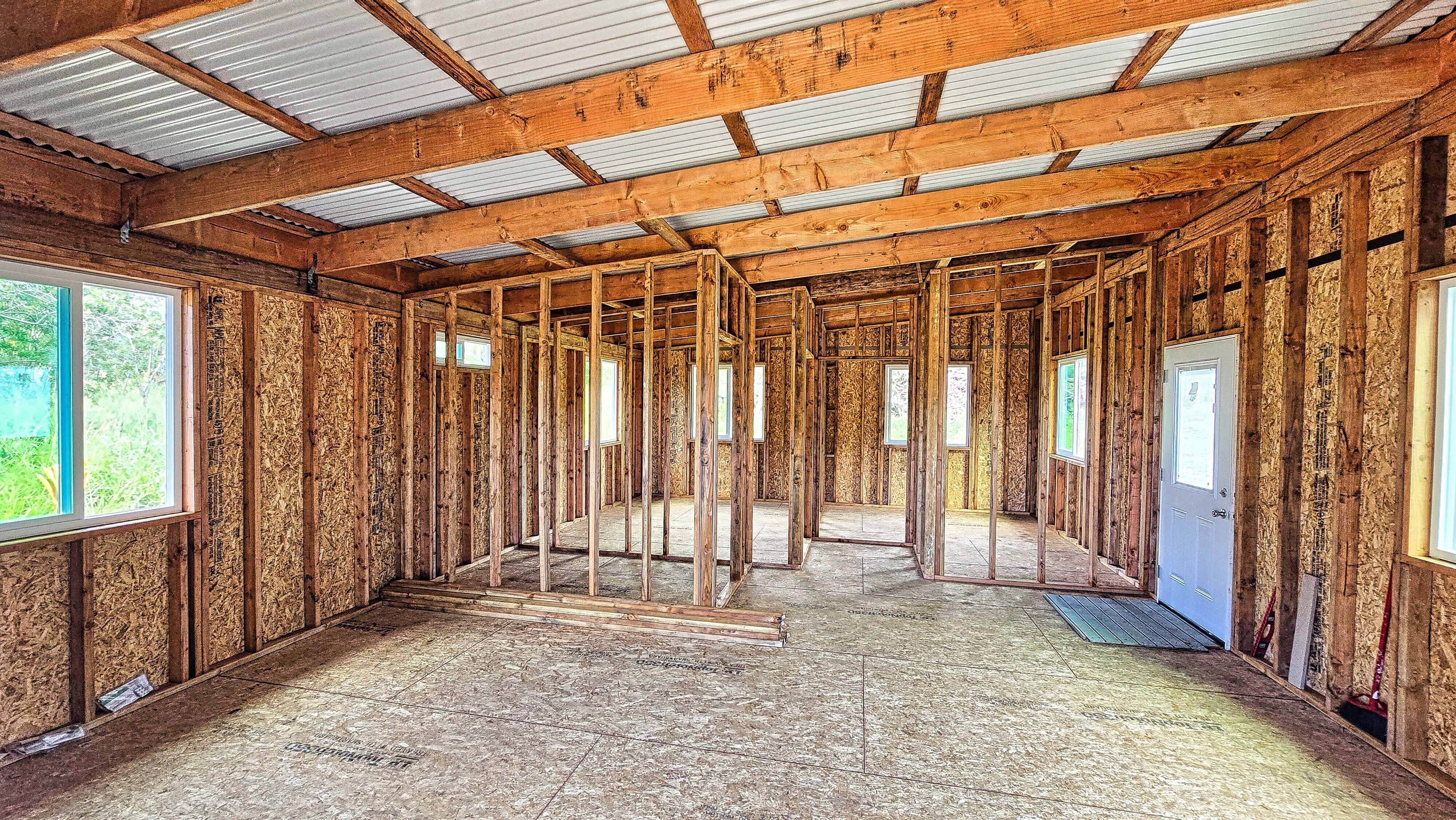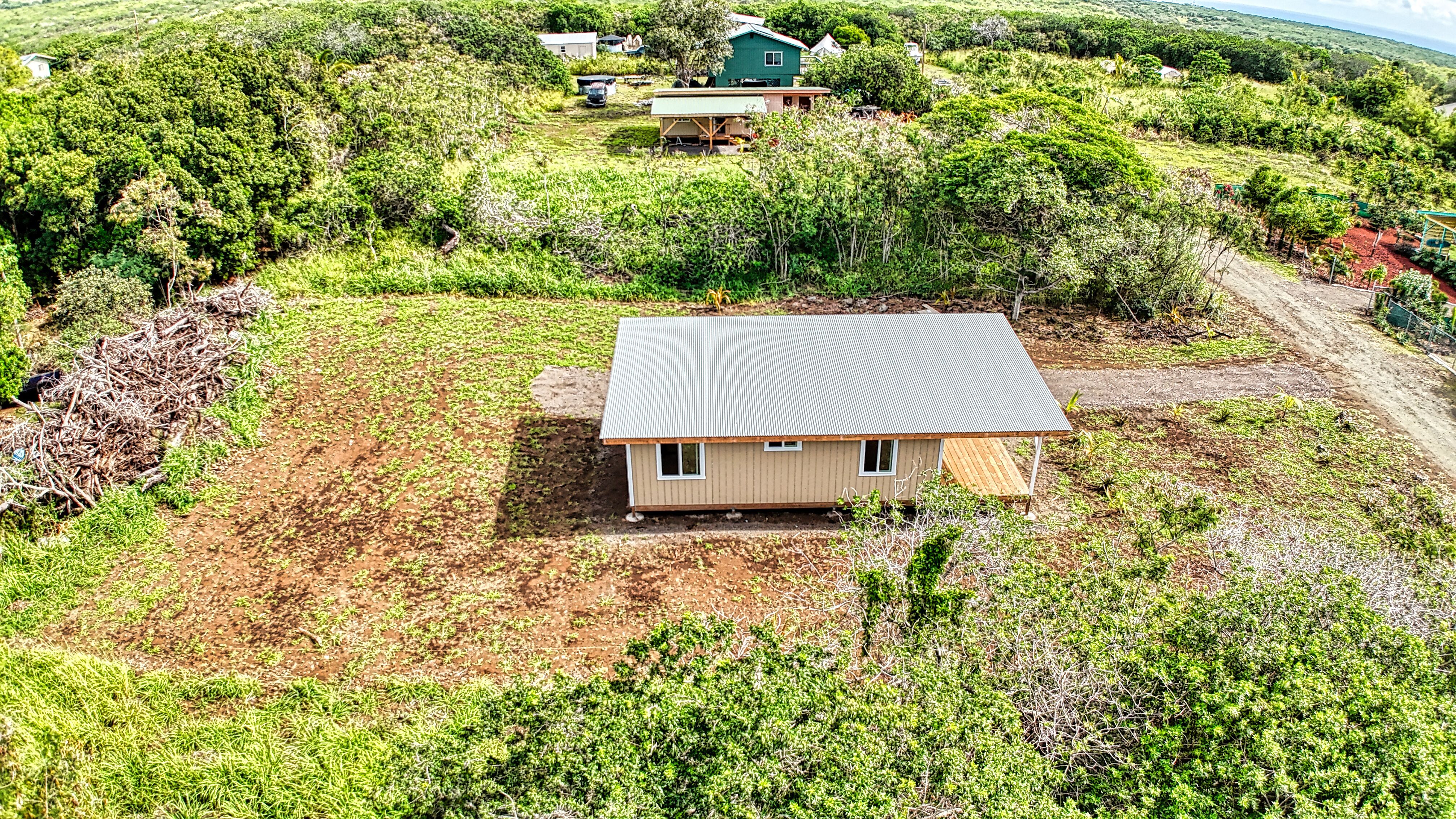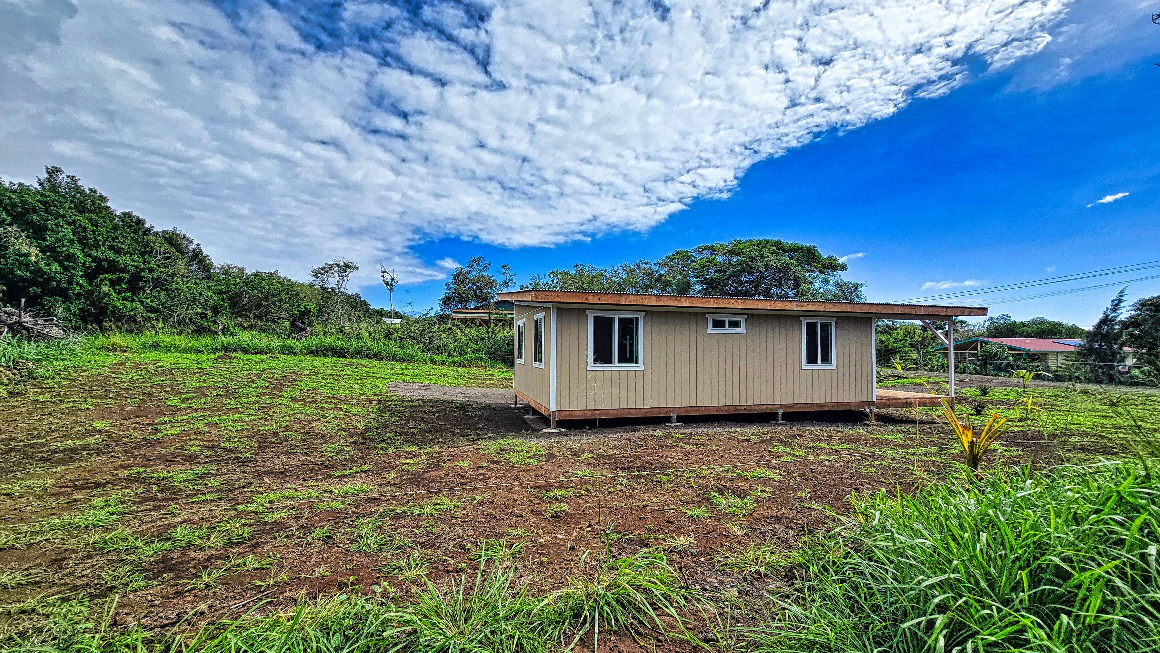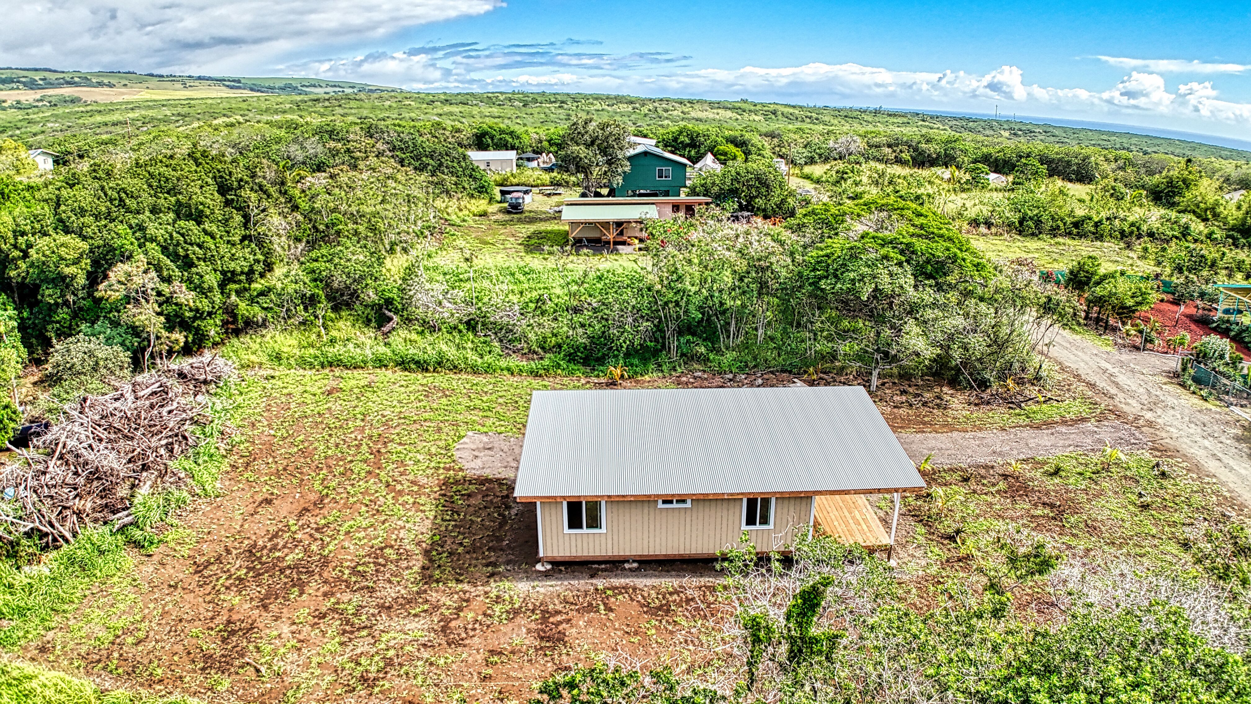 A brand new 2-bedroom, 1-bath, approx. 600 sq ft cottage with 200 sq ft lanai on a beautifully landscaped 1/4 acre lot with several tropical plants including coconut and banana trees. Located in Kiolakaa Homesite Subdivision, it's ready for you to finish exactly the way you want. The heavy lifting is done: cleared lot, bulldozed house pad, gravel driveway, modern roof design gives a cathedral ceiling feel in the open kitchen, living and dining room area. Dual-pane windows, exterior siding and trim, and a spacious covered front lanai that extends your living space outdoors and catches the cool Ka?u trades. Inside, the open framing makes it easy to visualize your layout and select your preferred finishes–sheetrock, board-and-batten, or paneling; hardwood, tile, or other flooring; plus your choice of cabinets and countertops. This is an ideal opportunity for a buyer who wants a “head start” build without taking on raw-land construction from scratch. Located just south of Na?alehu, you are minutes from everyday essentials such as post office, bank, gas, small markets, hardware and the famous Punalu?u Bake Shop. A short drive brings you to Punalu?u Black Sand Beach, South Point (Ka Lae), and the trail to Papakolea Green Sand Beach–some of the Big Island’s most iconic coastlines–all while enjoying the peaceful country feel of Ka?u. Cesspool and catchment tank can be added for an additional fee. There is no roughed in plumbing or electrical.