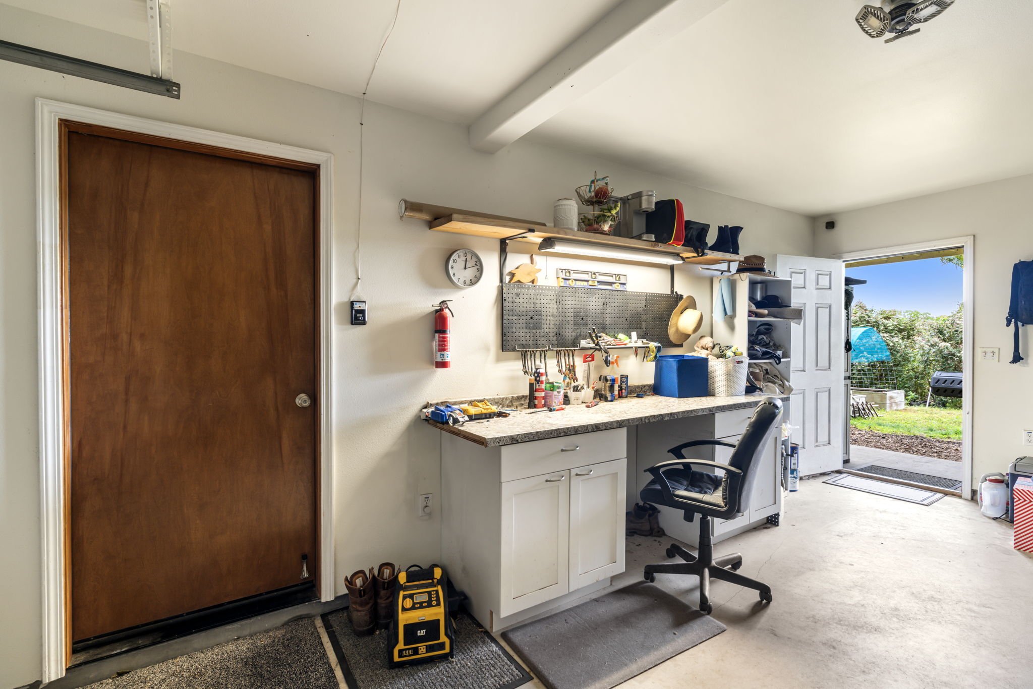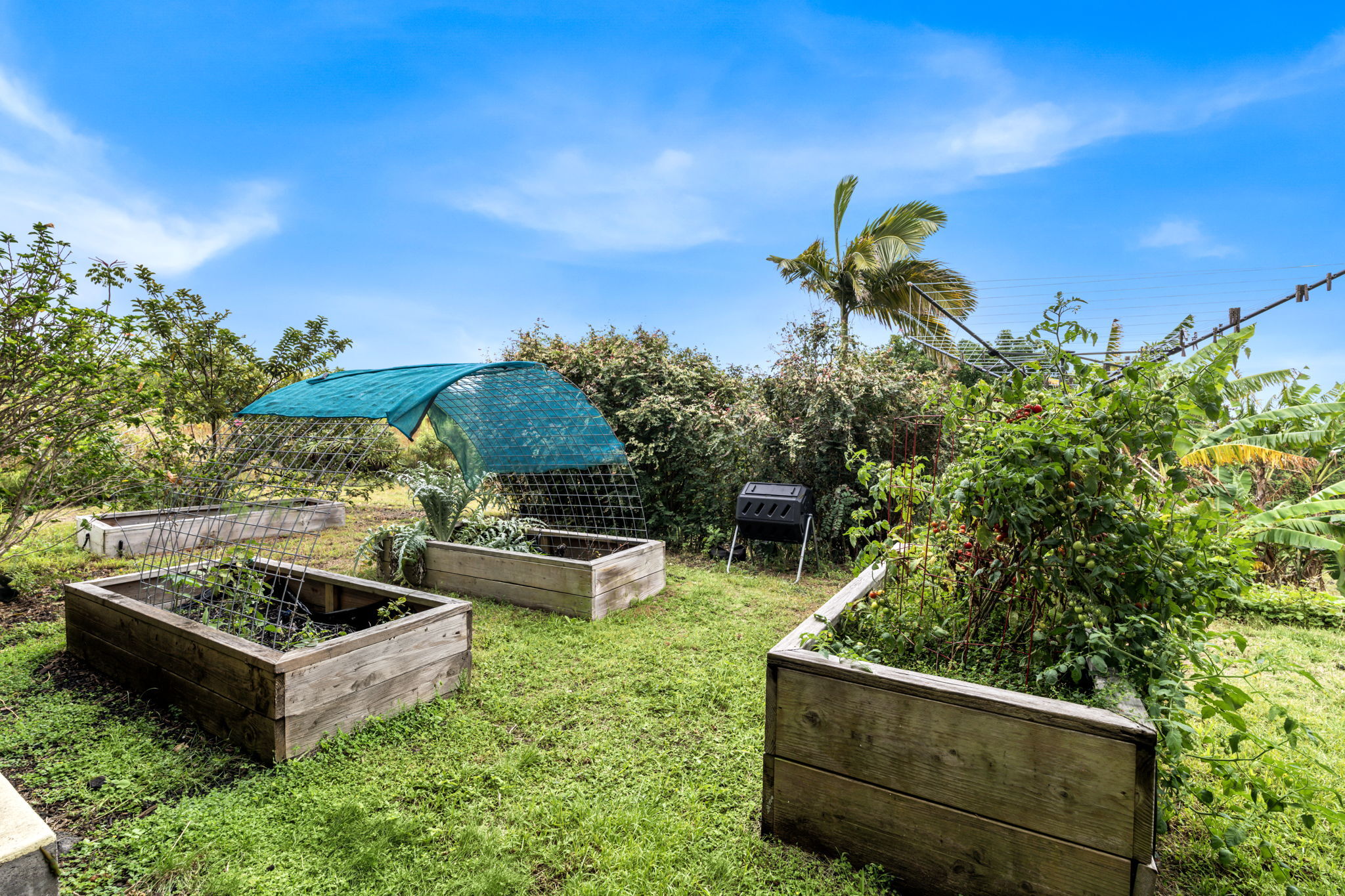 The yard has a lot of care infused in it, including five raised garden beds with timed irrigation, and pathways leading around the property. Gardenia trees greet you with their lovely scent. Producing fruit trees include avocado, banana, lemon, lime, mandarin, orange, pink grapefruit, Brazilian cherry, figs, soursop, sapote, miracle fruit, loquat, R2E2 mango, pineapple, tree tomato, lilikoi, Surinam cherry, dragonfruit, blackberry and vanilla vine. Ornamentals include hibiscus, plumeria, ginger, palms, and more.