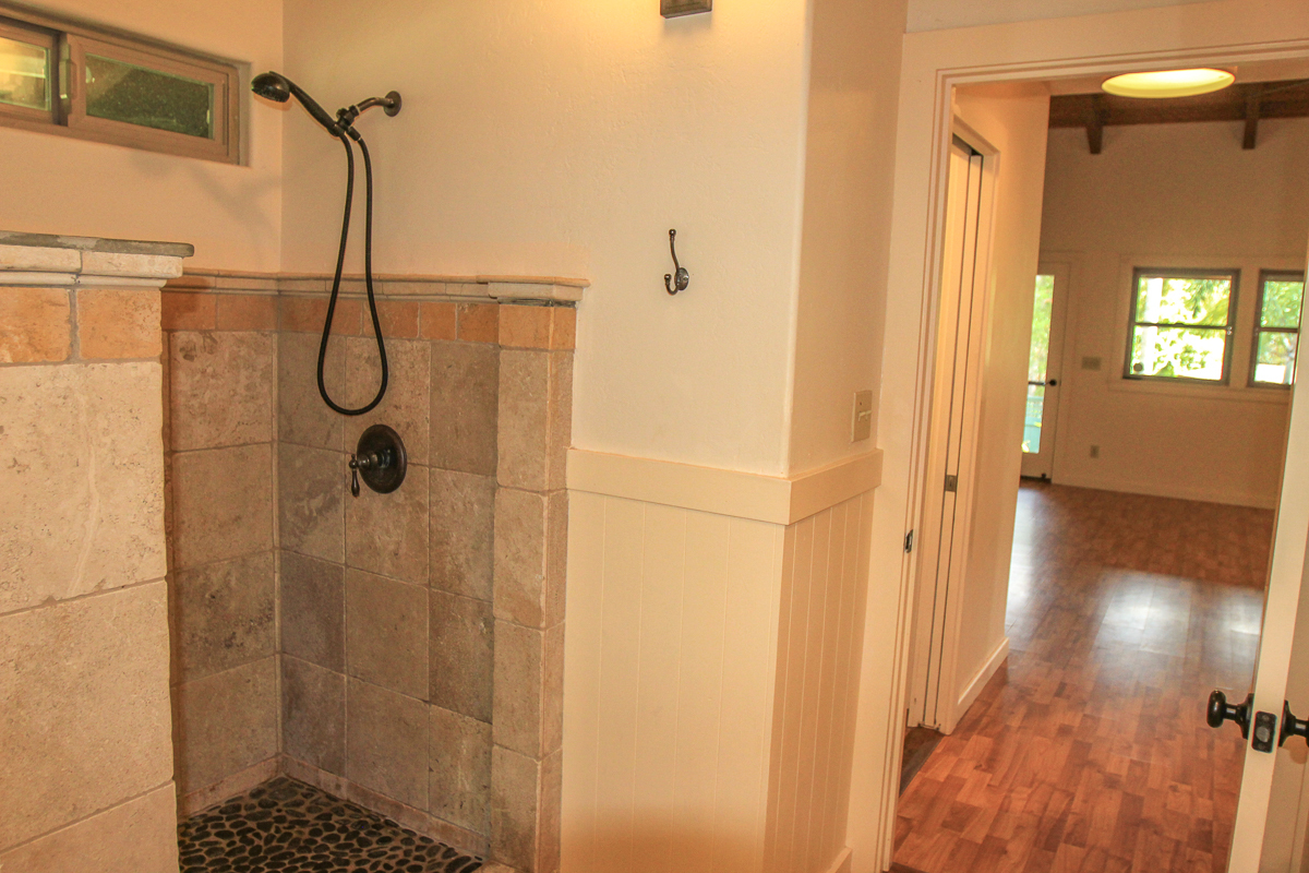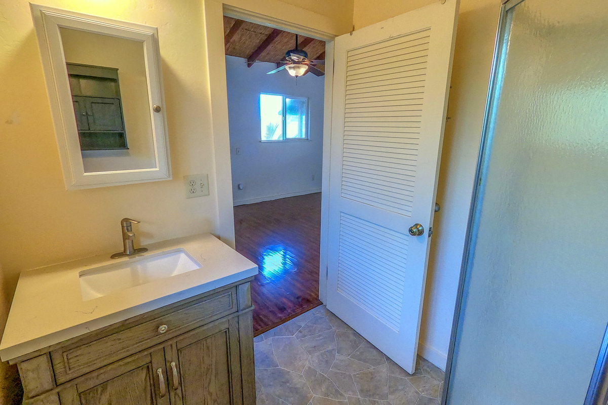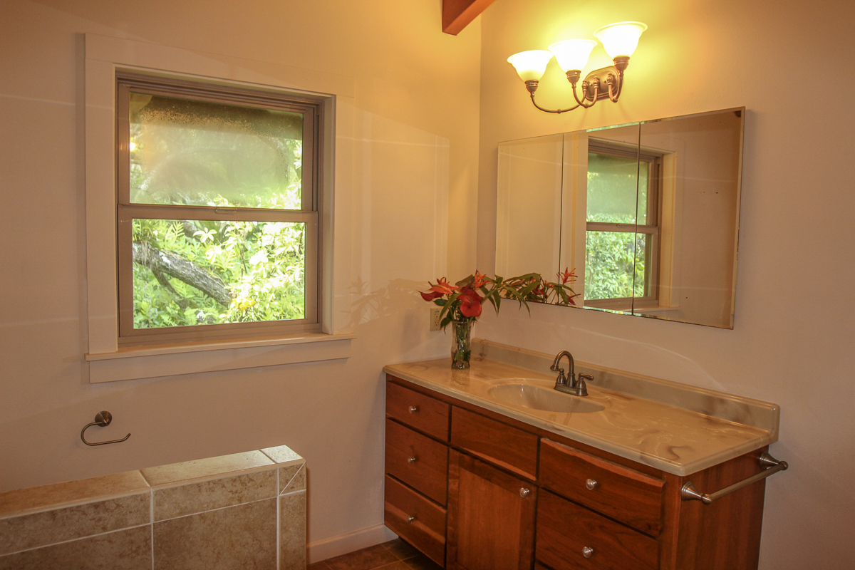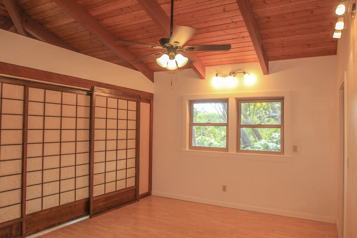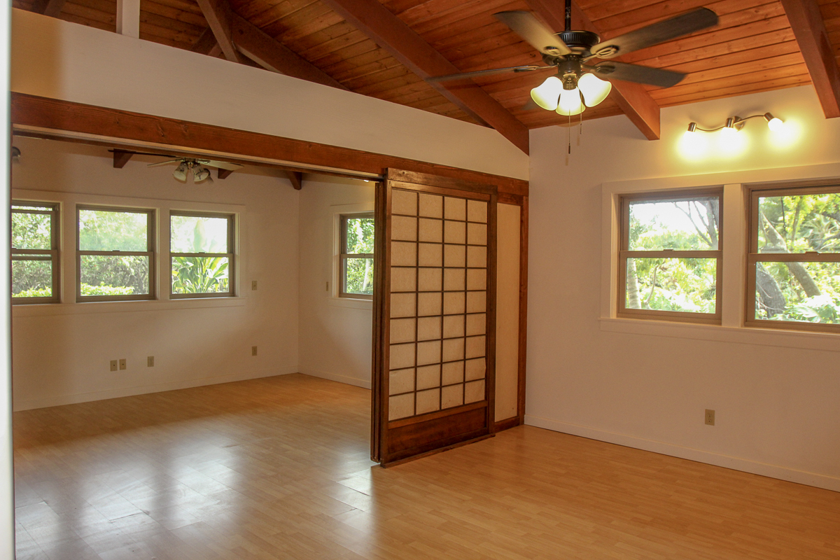 The second bedroom is a sprawling 16' x 24', with walk-in closet and custom, shoji doors in the center, providing an easy option to separate the space for use as a third bedroom, or office. The second bath offers a custom shower w/ travertine, tile walls and 'ili'ili stone floor, & pedestal sink.