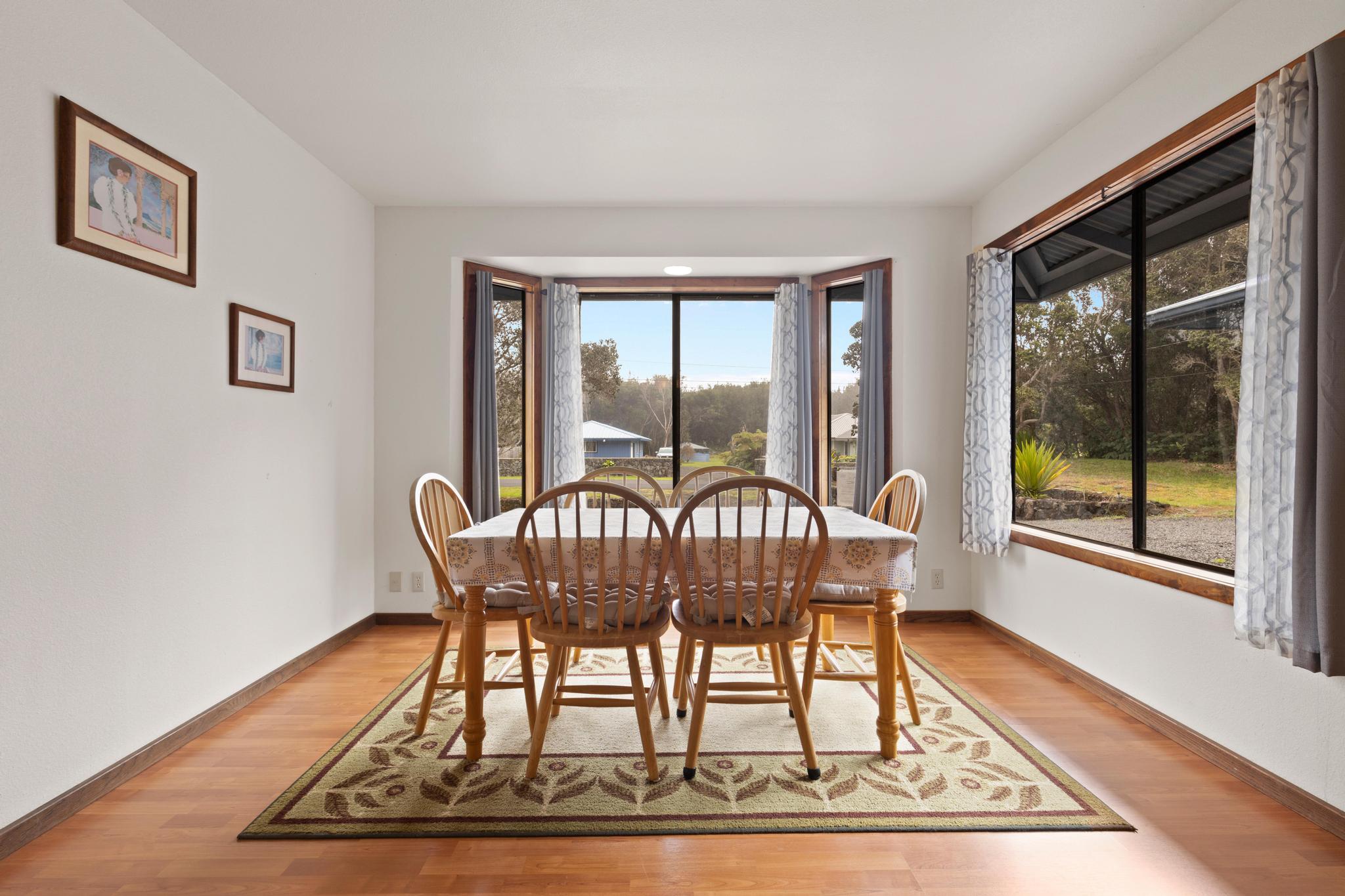 Beautiful natural rock walls frame the front of the property, giving the home a classic Volcano charm and a sense of elevation. Inside, the central foyer provides access to both wings of the home as well as the backyard. The kitchen features beautiful custom solid Koa cabinetry and opens to a bright dining area accented by a bay window. Just off this space is the spacious and private primary suite with its own full bathroom and closet.