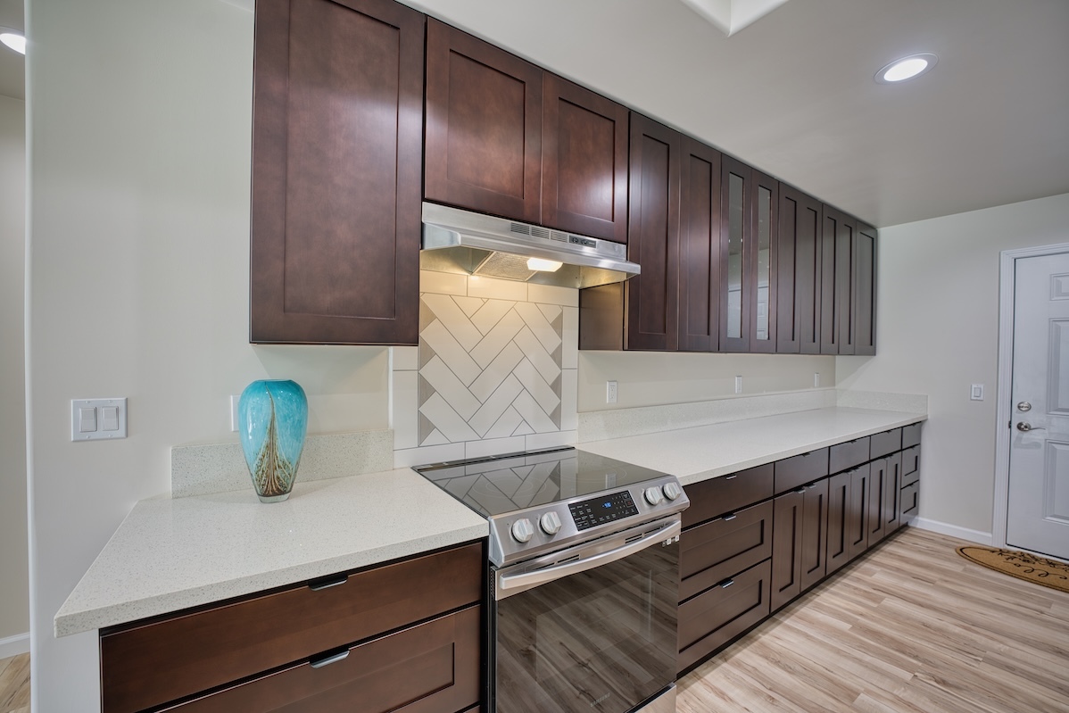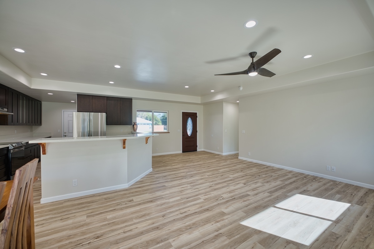 The spacious main living area boasts a 9-foot tray ceiling, can-less color-select lighting, bar seating, and sugi pine window sills that add warmth and character. The kitchen offers soft-close cabinetry and an auto-on pantry light for effortless convenience.