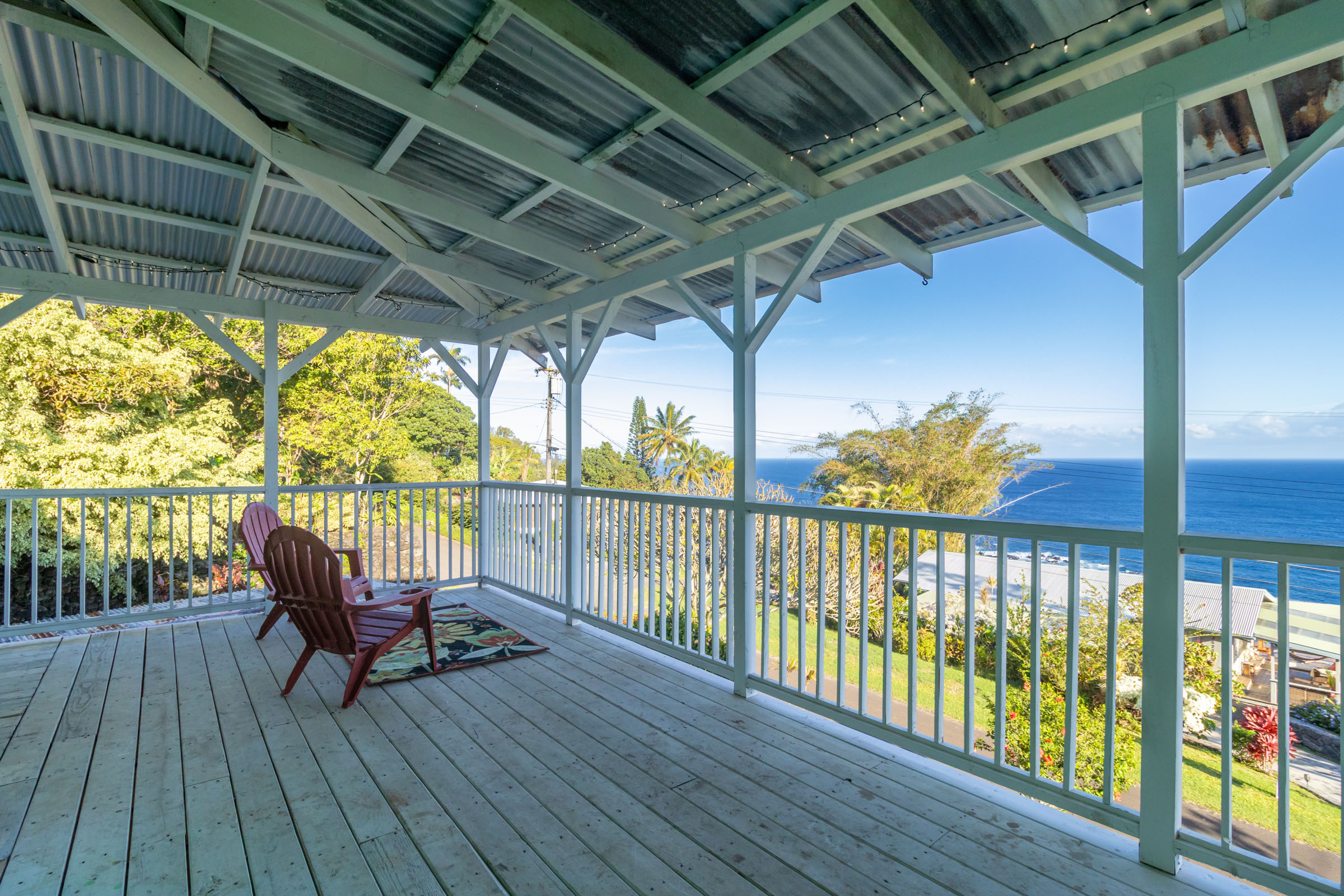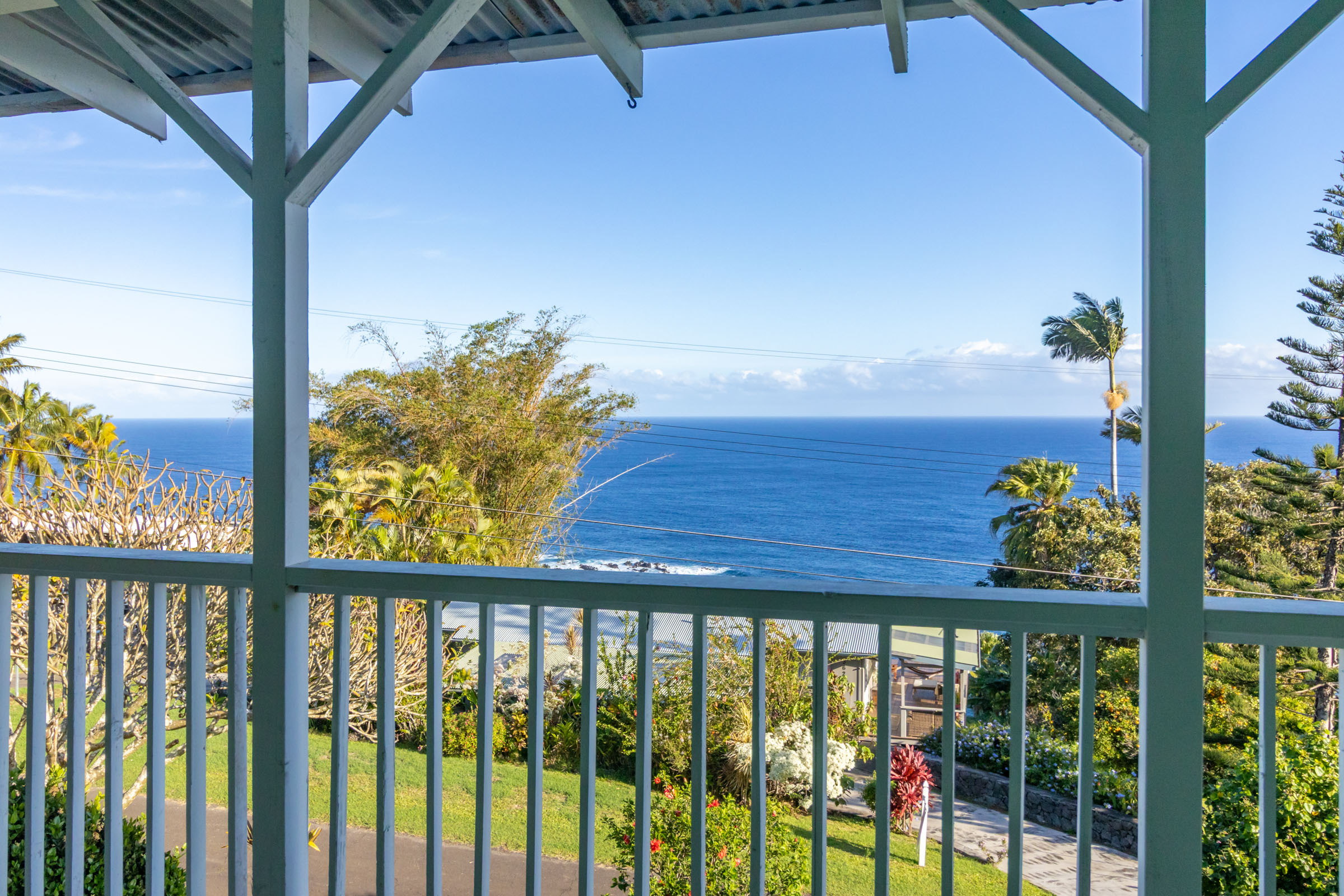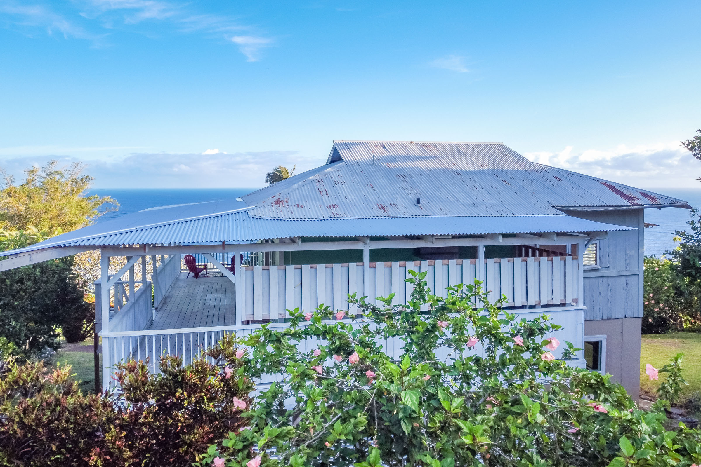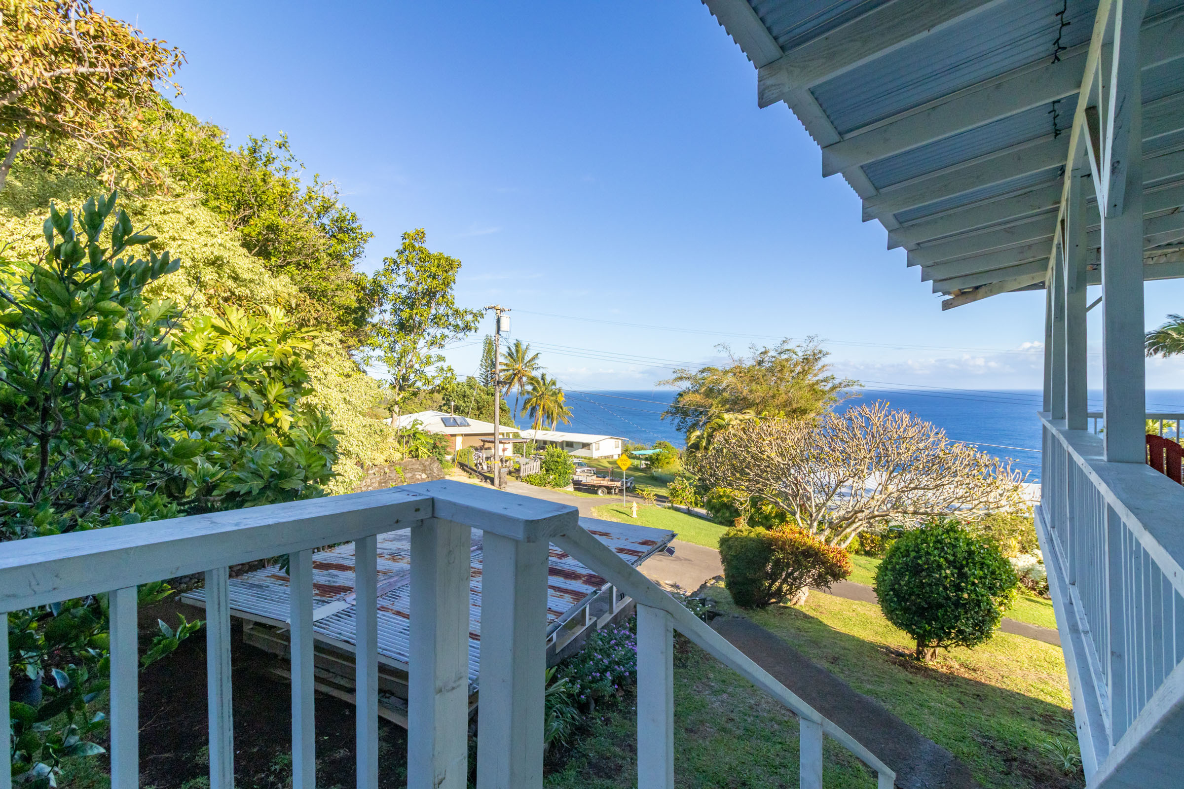 This classic Hawaiian plantation home overlooking Laupahoehoe Point provides sweeping ocean views above the Hamakua coastline. Relax on its expansive wraparound lanai and enjoy sunrise glow over the ocean, squalls move across the horizon creating rainbows, and whale watching. The house has undergone various renovations since it was moved onsite prior to 1960. The most recent raised the house two feet to full ceiling height on the lower level. Raising the house included removing and replacing the upper lanai, the interior and exterior stairways, and the lower-level walls which are now smart-sided 2x6 hurricane braced shear walls. Structural work on the lower level has been completed, leaving the interior to be finished to fit your lifestyle needs. County records reflect this home could host 4 bedrooms and 1.5 baths. The upper level has one bedroom, a full bath, and a spacious living/kitchen/dining area that opens onto the lanai for indoor-outdoor living. The lush yard has over 10 varieties of mature fruit trees including tangerine, ulu, Brazilian cherry, grapefruit, papaya, lemon, lilikoi and dragon fruit as well as avocados that fall from a neighboring tree. Enjoy native and exotic ornamentals such as plumeria, hau, hibiscus, ixora, ti plants, bromeliad, anthurium, and orchids with plenty of room for more. A 4-stall dog kennel sits in the SE corner of the backyard, and a covered carport fronts the street. Laupahoehoe is a small, vibrant community midway between Hilo and Waimea along Hwy. 19. It hosts a pre-k-12 school, public pool, library, playground, the Laupahoehoe Train Museum, Papa’aloa Country Store and Cafe with live music in the restaurant/bar, and Minit Stop gas station and convenience store. Laupahoehoe Point Beach Park is only minutes away.