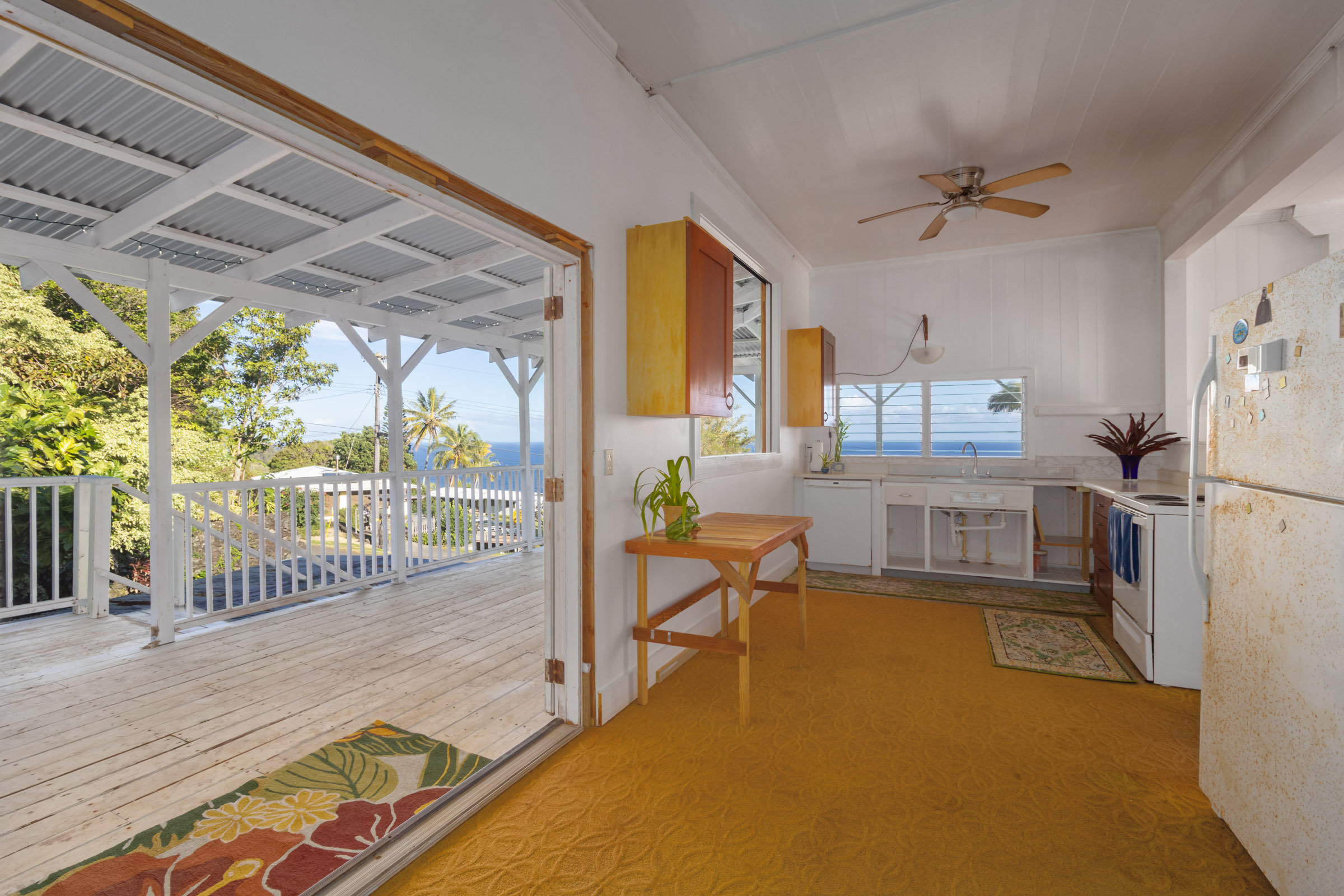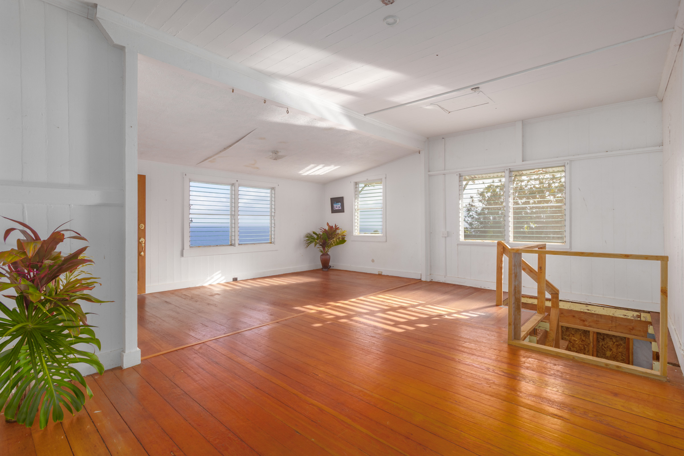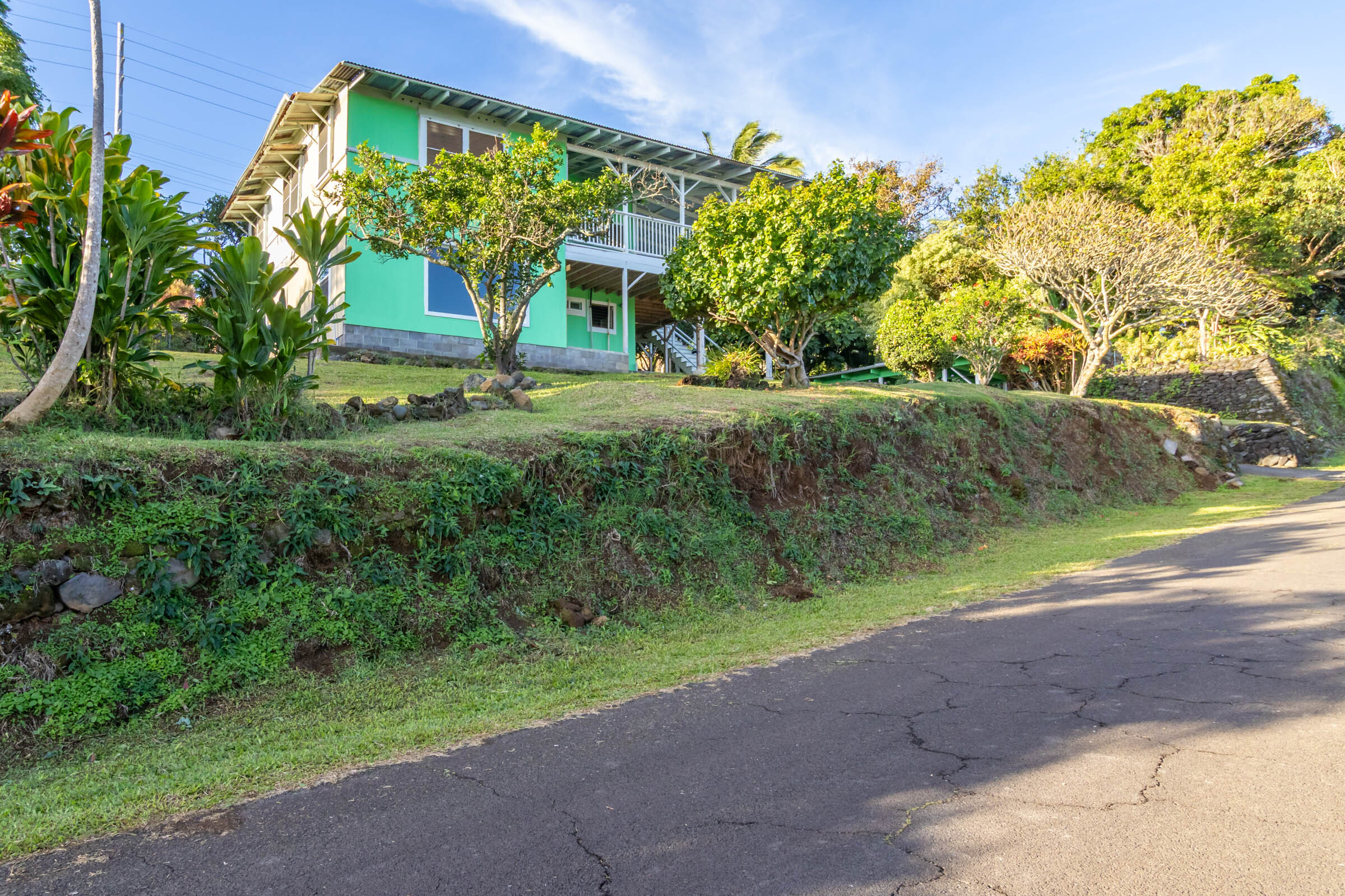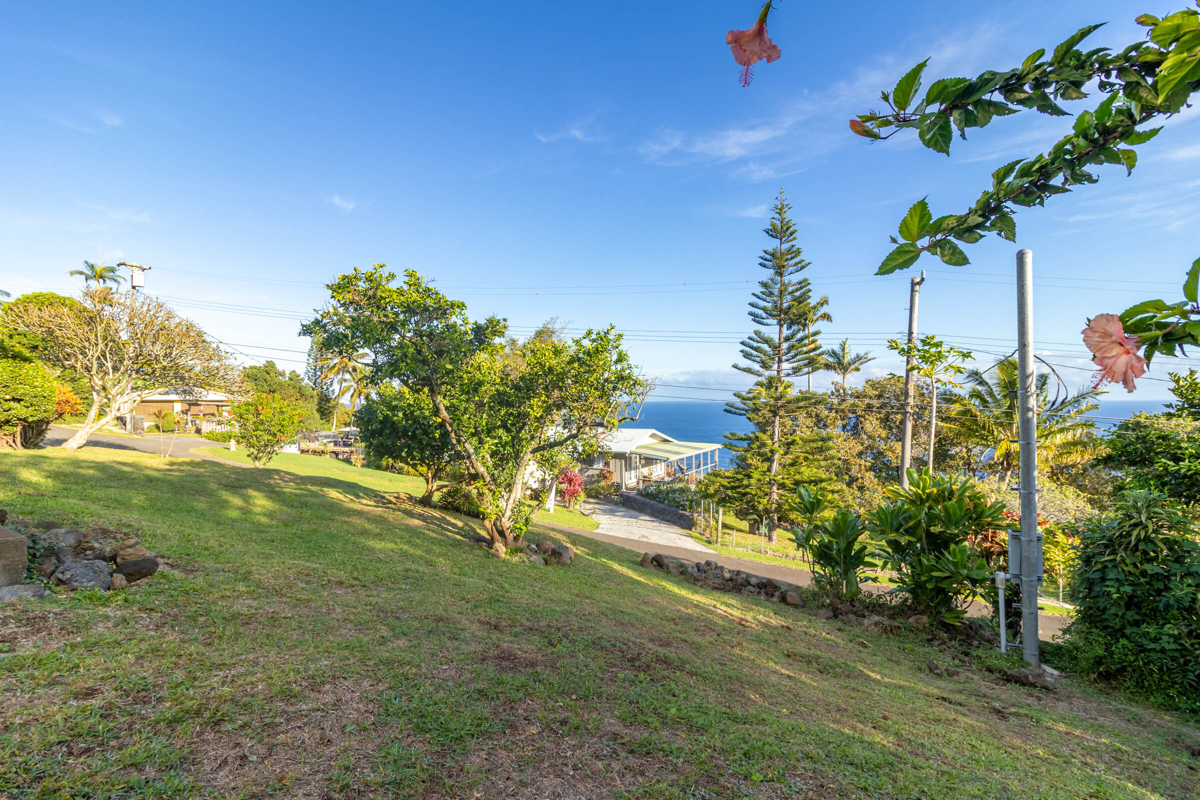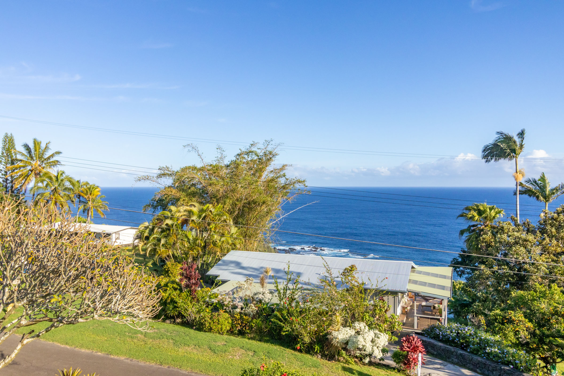 This classic Hawaiian plantation home overlooking Laupahoehoe Point provides sweeping ocean views above the Hamakua coastline. Relax on its expansive wraparound lanai and enjoy sunrise glow over the ocean, squalls move across the horizon creating rainbows, and whale watching. The house has undergone various renovations since it was moved onsite prior to 1960. The most recent raised the house two feet to full ceiling height on the lower level. Raising the house included removing and replacing the upper lanai, the interior and exterior stairways, and the lower-level walls which are now smart-sided 2x6 hurricane braced shear walls. Structural work on the lower level has been completed, leaving the interior to be finished to fit your lifestyle needs. County records reflect this home could host 4 bedrooms and 1.5 baths. The upper level has one bedroom, a full bath, and a spacious living/kitchen/dining area that opens onto the lanai for indoor-outdoor living. The lush yard has over 10 varieties of mature fruit trees including tangerine, ulu, Brazilian cherry, grapefruit, papaya, lemon, lilikoi and dragon fruit as well as avocados that fall from a neighboring tree. Enjoy native and exotic ornamentals such as plumeria, hau, hibiscus, ixora, ti plants, bromeliad, anthurium, and orchids with plenty of room for more. A 4-stall dog kennel sits in the SE corner of the backyard, and a covered carport fronts the street. Laupahoehoe is a small, vibrant community midway between Hilo and Waimea along Hwy. 19. It hosts a pre-k-12 school, public pool, library, playground, the Laupahoehoe Train Museum, Papa’aloa Country Store and Cafe with live music in the restaurant/bar, and Minit Stop gas station and convenience store. Laupahoehoe Point Beach Park is only minutes away.