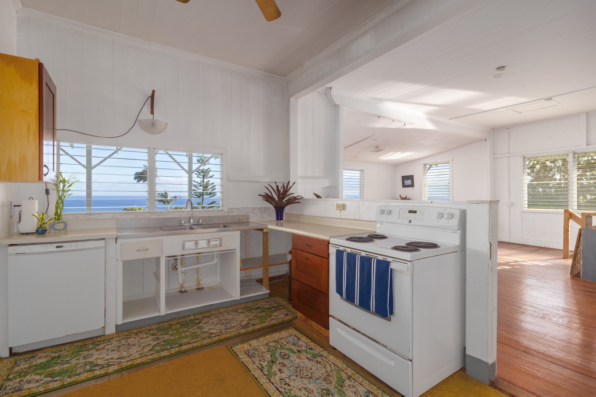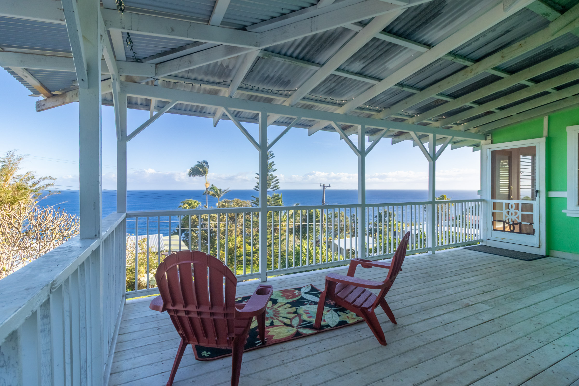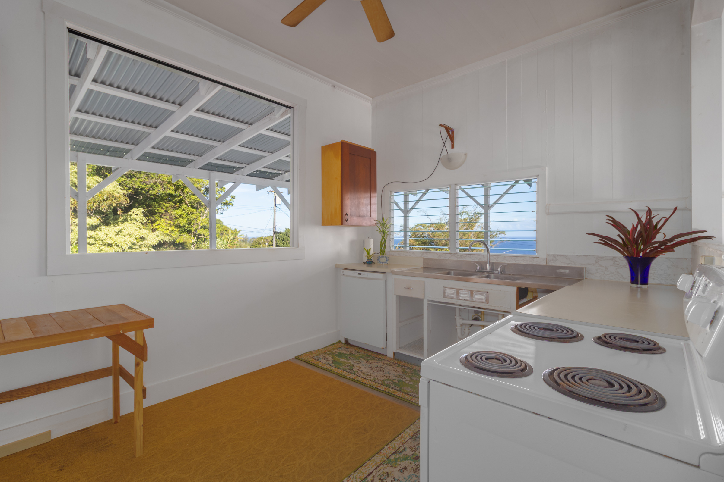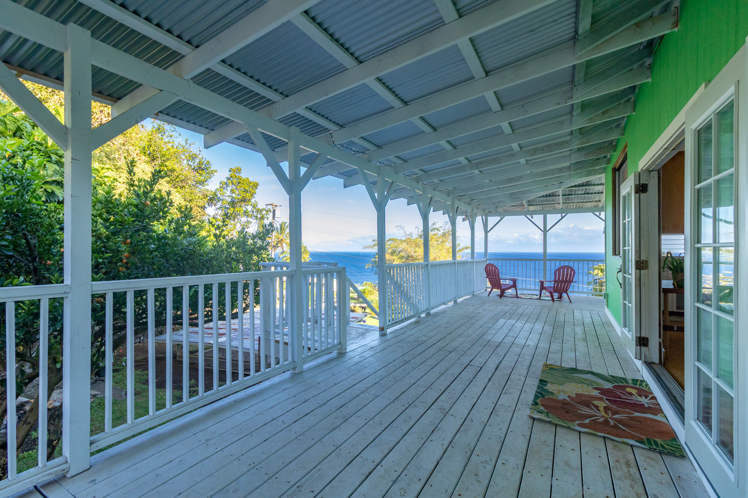 This classic Hawaiian plantation home overlooking Laupahoehoe Point provides sweeping ocean views above the Hamakua coastline. Relax on its expansive wraparound lanai and enjoy sunrise glow over the ocean, squalls move across the horizon creating rainbows, and whale watching. The house has undergone various renovations since it was moved onsite prior to 1960. The most recent raised the house two feet to full ceiling height on the lower level. Raising the house included removing and replacing the upper lanai, the interior and exterior stairways, and the lower-level walls which are now smart-sided 2x6 hurricane braced shear walls. Structural work on the lower level has been completed, leaving the interior to be finished to fit your lifestyle needs. County records reflect this home could host 4 bedrooms and 1.5 baths. The upper level has one bedroom, a full bath, and a spacious living/kitchen/dining area that opens onto the lanai for indoor-outdoor living. The lush yard has over 10 varieties of mature fruit trees including tangerine, ulu, Brazilian cherry, grapefruit, papaya, lemon, lilikoi and dragon fruit as well as avocados that fall from a neighboring tree. Enjoy native and exotic ornamentals such as plumeria, hau, hibiscus, ixora, ti plants, bromeliad, anthurium, and orchids with plenty of room for more. A 4-stall dog kennel sits in the SE corner of the backyard, and a covered carport fronts the street. Laupahoehoe is a small, vibrant community midway between Hilo and Waimea along Hwy. 19. It hosts a pre-k-12 school, public pool, library, playground, the Laupahoehoe Train Museum, Papa’aloa Country Store and Cafe with live music in the restaurant/bar, and Minit Stop gas station and convenience store. Laupahoehoe Point Beach Park is only minutes away.