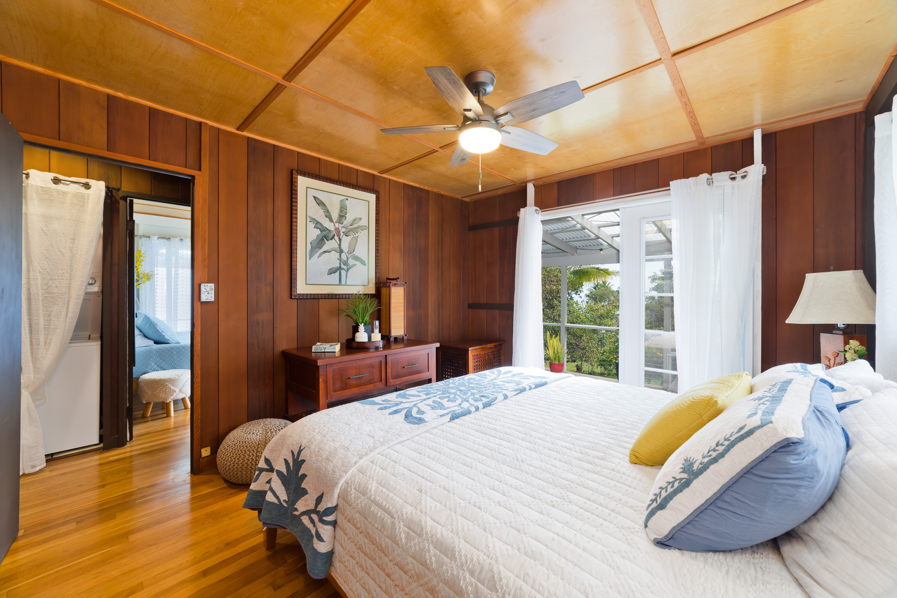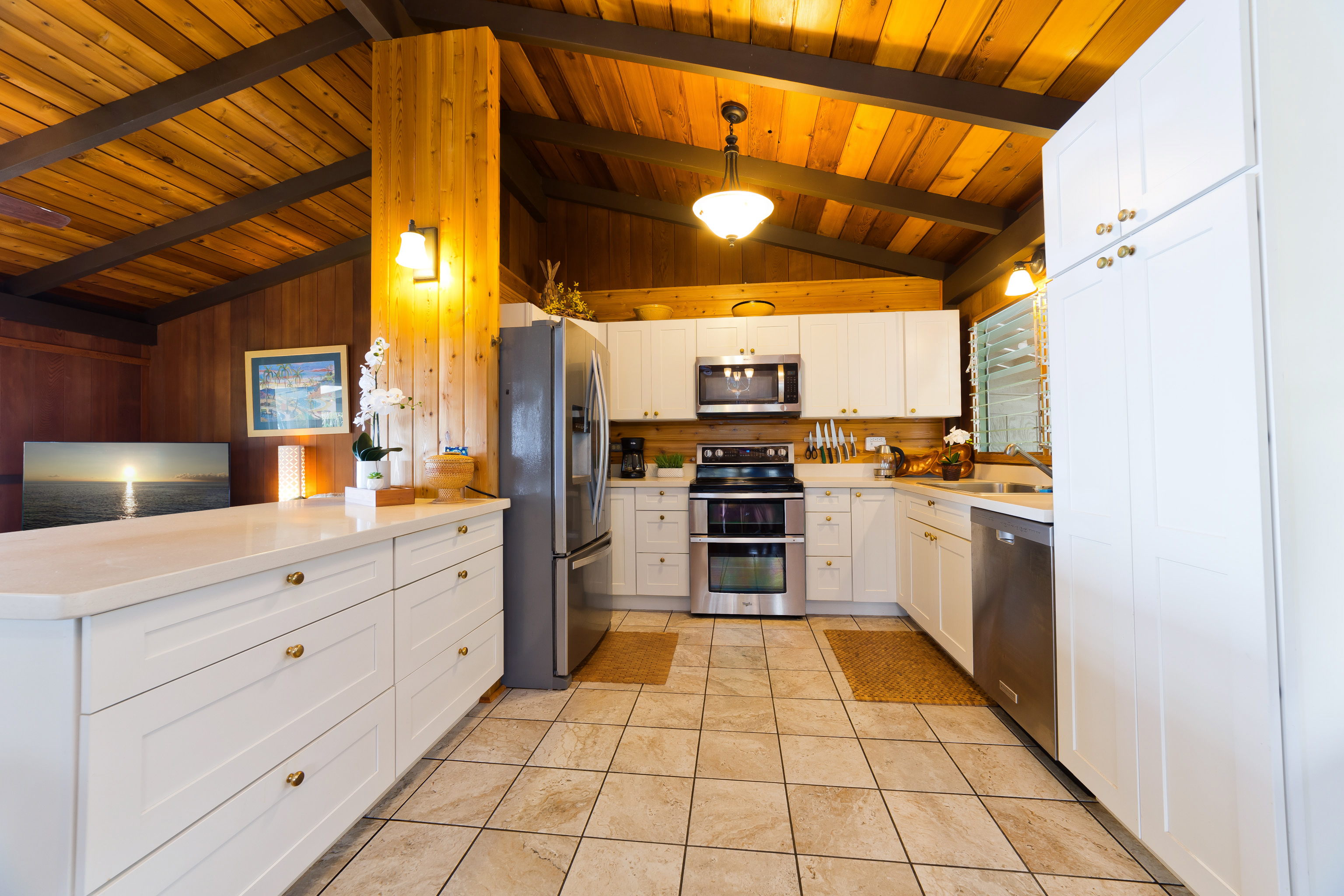 The owners added a covered lanai completely around the home, offering seemingly endless ocean views and a beautiful blend of indoor and outdoor living. Inside, the timeless craftsmanship of the original build shines through: redwood walls, pine ceilings, and hardwood floors, all restored to their vintage charm. Updates include some newer appliances, fixtures, doors, an electric water heater, and quartz countertops. Both bathrooms feature ceramic tile; one with a classic cast-iron tub and shower.