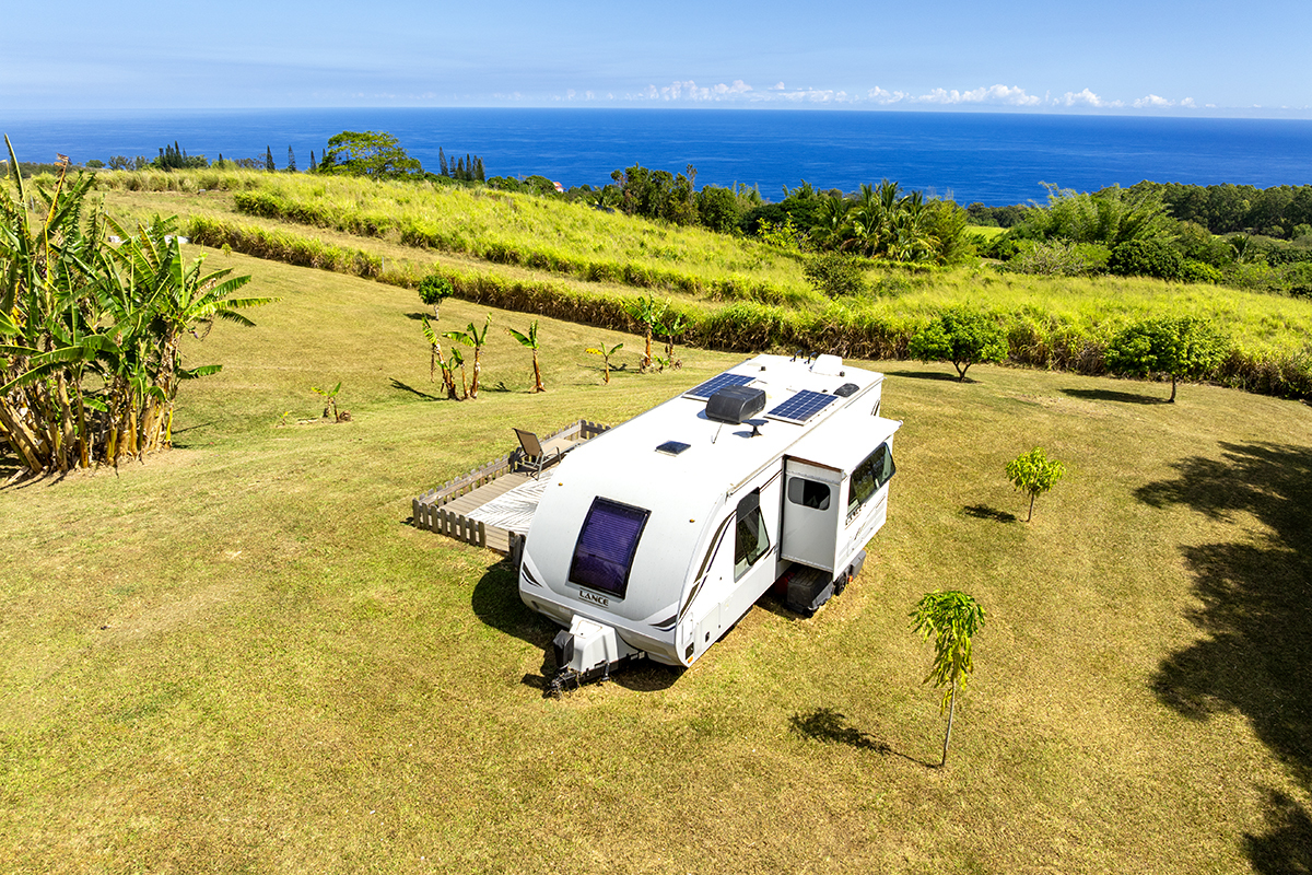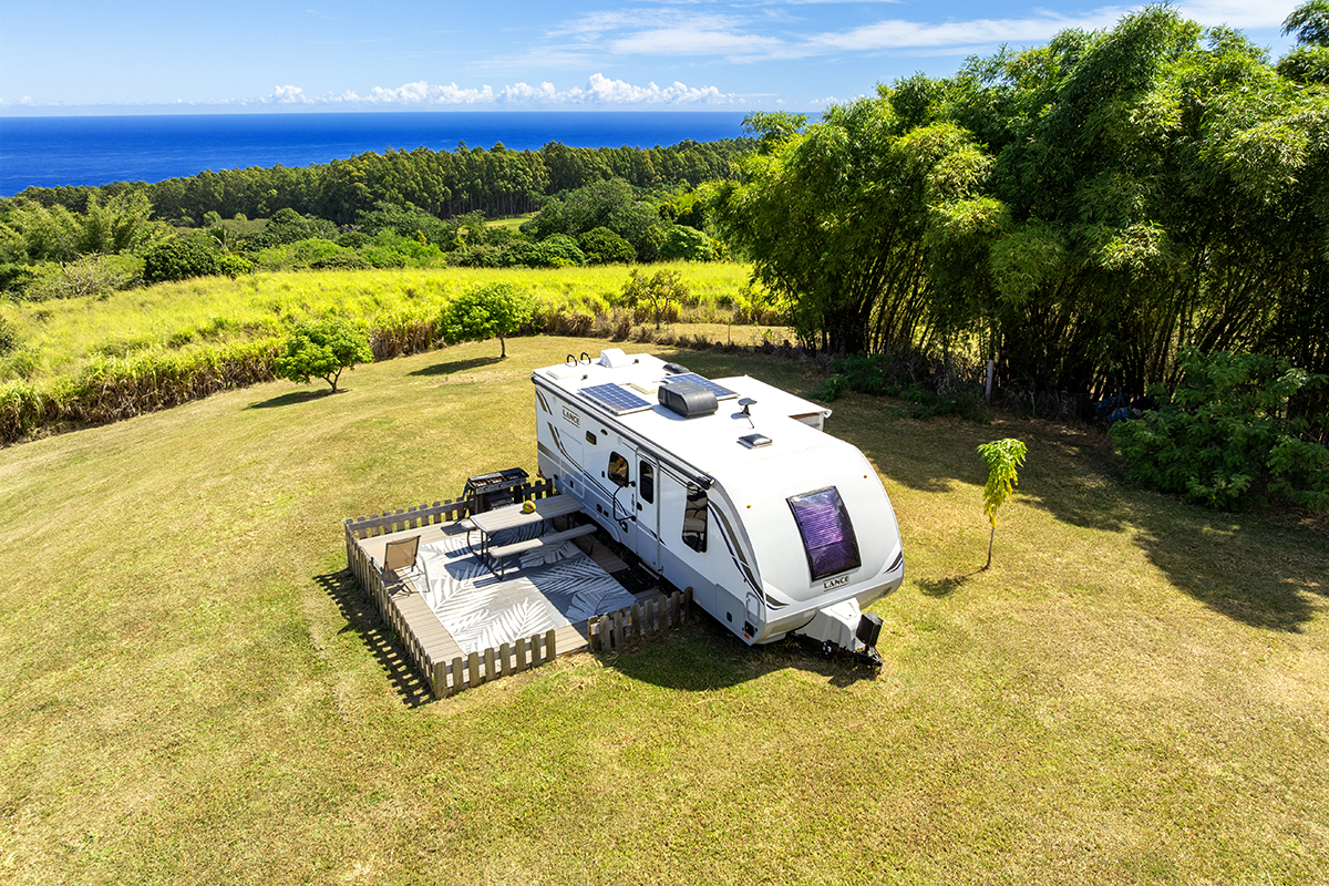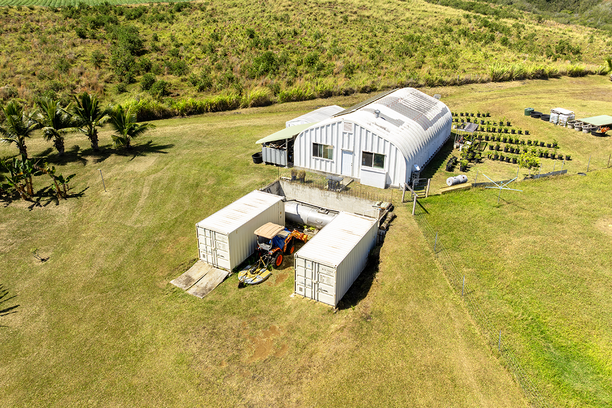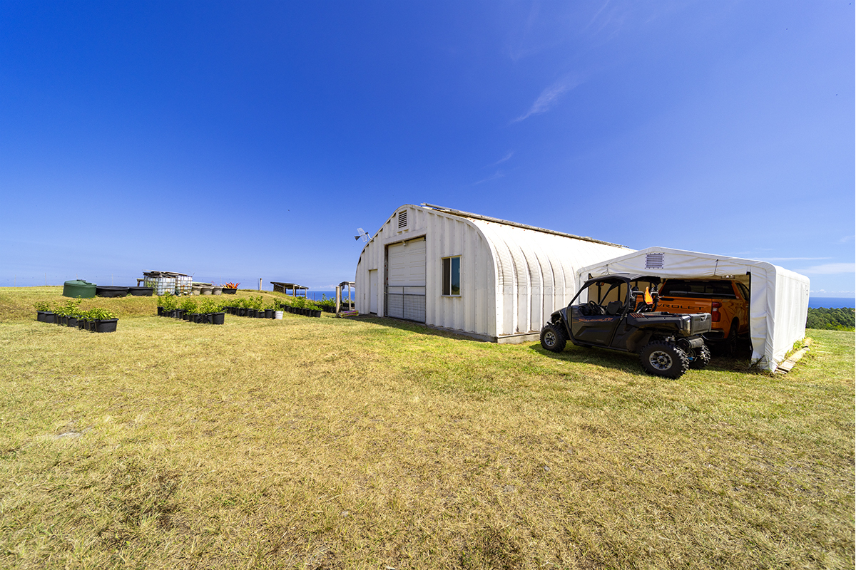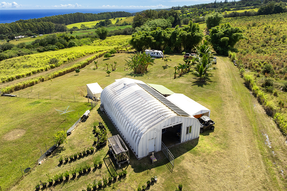Access the property with a peaceful drive through a eucalyptus forest on a paved county road just minutes from the highway, Papa’aloa Country Store, Community Center, Library and public swimming pool. Massive trees create a partial border as you enter the property providing protection for an existing honeybee operation. A grassy driveway, framed by dwarf Samoan coconut trees, welcomes you through this fenced and gated property. Be mesmerized by three varieties of swaying bamboo stands, additional fruiting dwarf Samoan and Fijian coconut trees, 11 varieties of banana, 7 varieties of avocado, and an impressive list of other fruiting trees as you approach the upper section, which features a 1,500 sq ft, 2-level permitted 2012 Quonset living and storage structure, a fully loaded 2021 Lance 2295 travel trailer, and a 2024 Shelter Tube portable garage. The lower 3 acres is ready for your imagination with rich, deep soil.