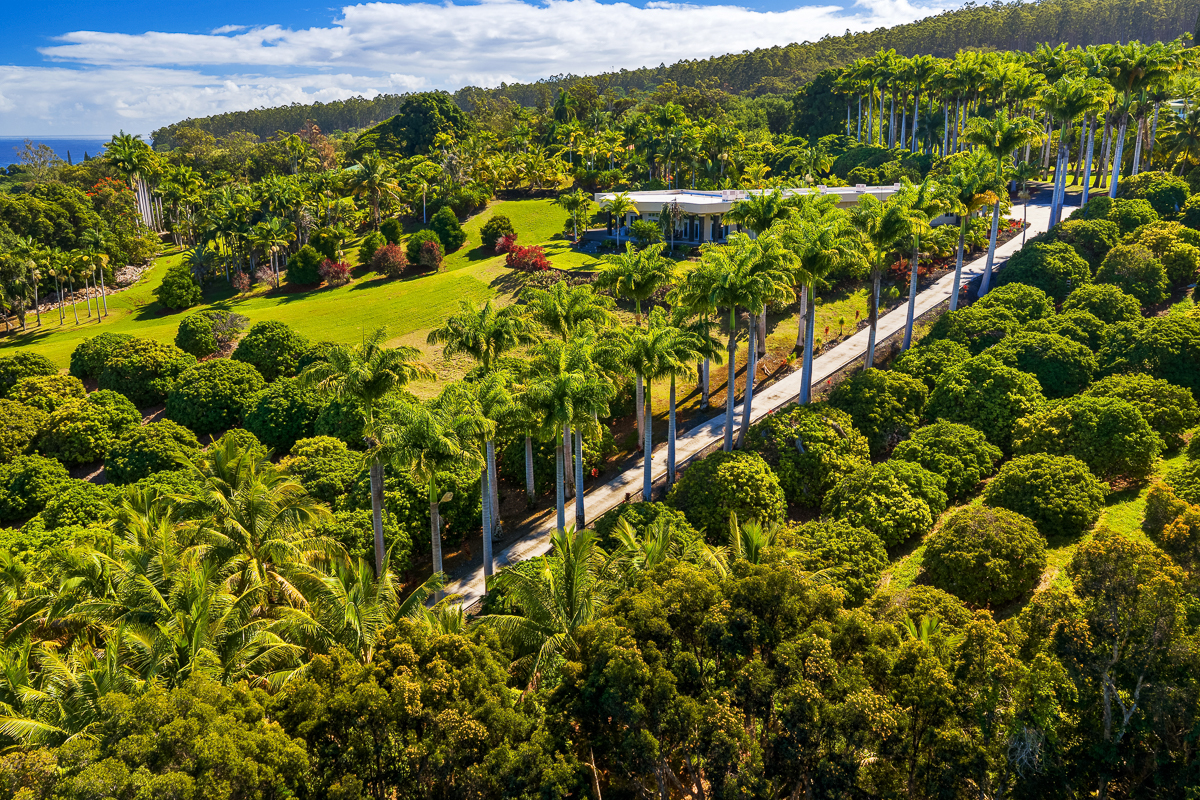 Royal Palms Estate is one of the most private oceanfront-style retreats along the Hamakua Coast. Nearly thirteen acres stretch toward the Pacific, offering sweeping, uninterrupted ocean views that anchor the property to the coastline. The gated arrival, framed by towering royal palms, sets a serene and sophisticated tone from the moment you enter.