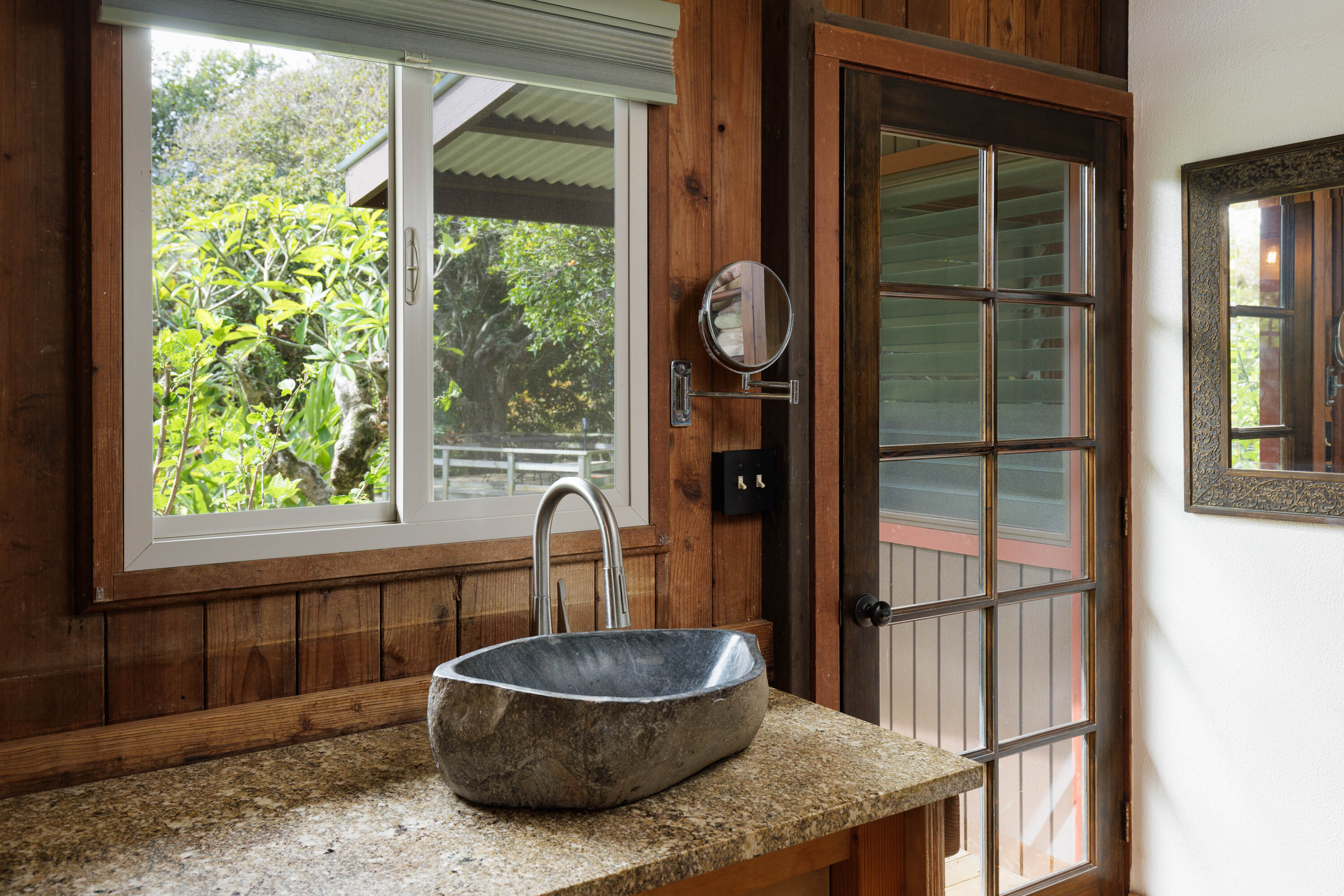 A custom built outdoor cement soaking tub located on the back lanai creates a serene, private space surrounded by nature.