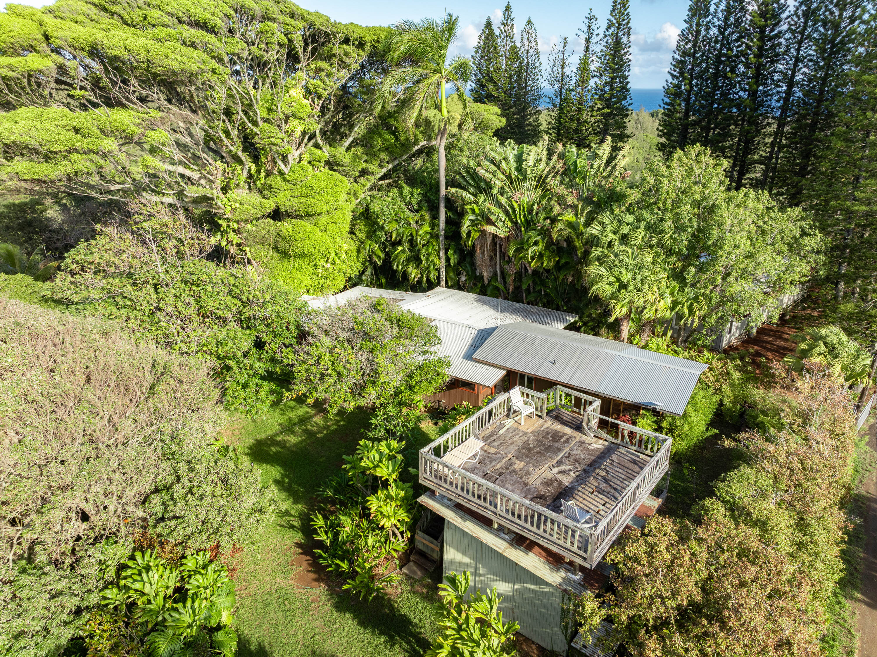 A large front lanai offers ideal outdoor areas for relaxation, gathering, and enjoying mountain and garden views. A detached garage and workshop with a viewing platform above provides ocean, mountain, and sunset views and presents an excellent opportunity for restoration.