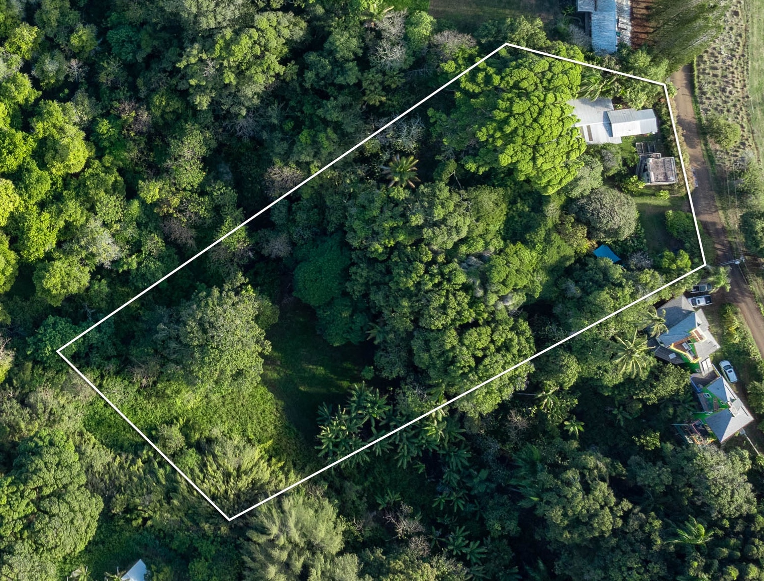 The property includes mature monkeypod, lychee, and avocado trees among a variety of tropical plantings including coffee, soursop, ulu, and bananas. A natural path leads into the gulch where a seasonal stream and cleared flat area offer potential for gardening or orchard use, with the property extending across the gulch.