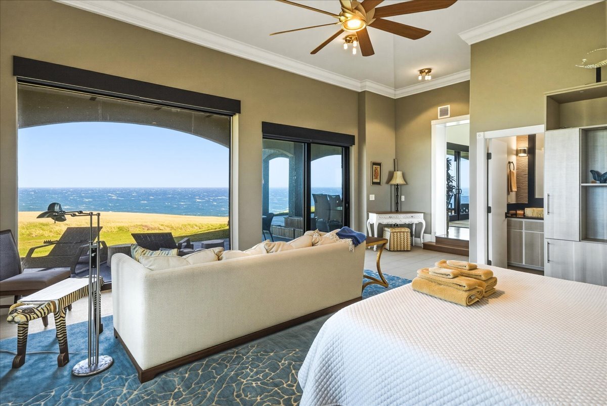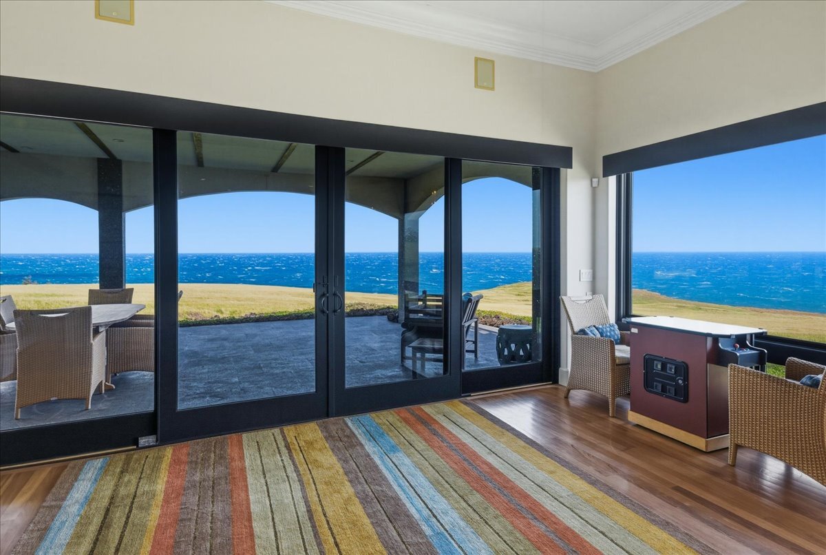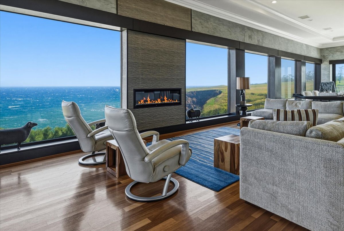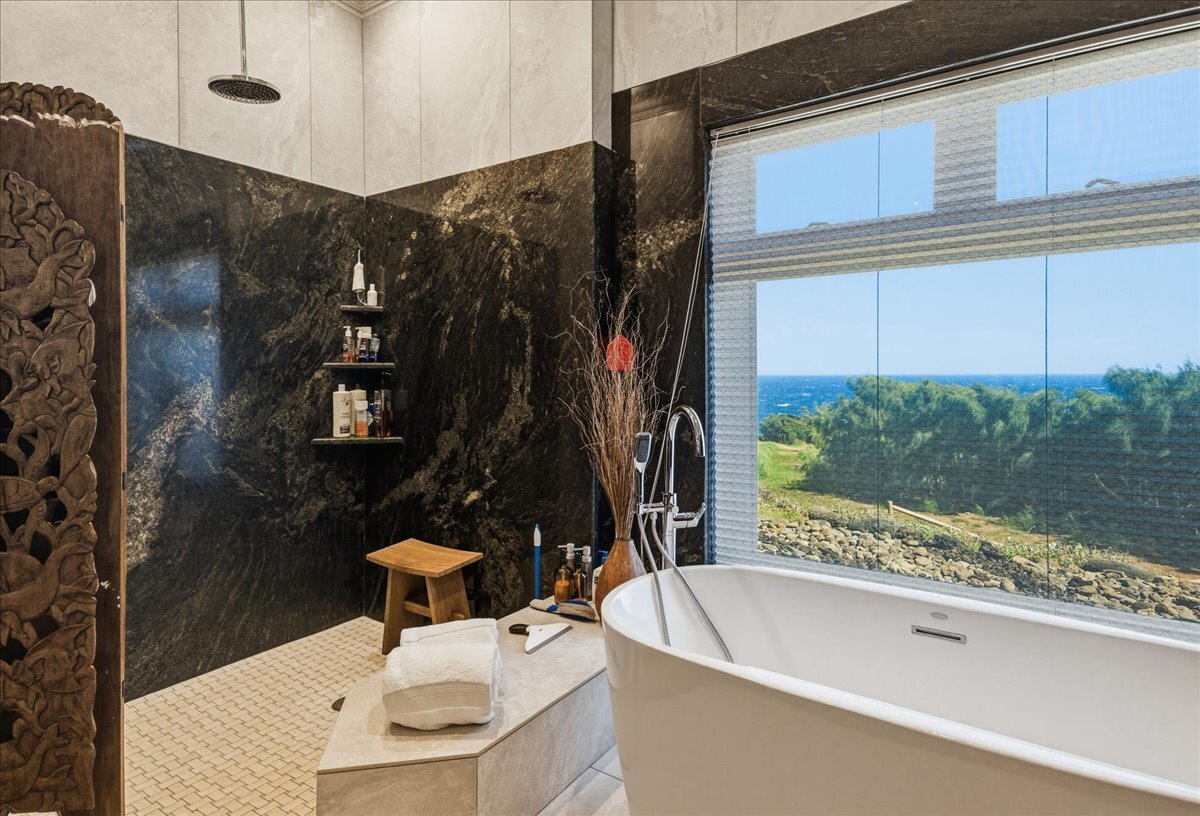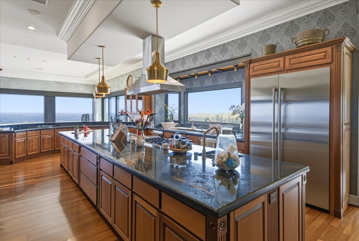There is oceanfront property - and there is exceptional oceanfront living. From this North Hawai?i estate home on 20+ acres overlooking a half-mile of dramatic coastline to the west and a gulch with a small stony beach on its eastern boundary, you can: ? watch sunrise and sunset, moonrise and moonset, and frequent rainbows ? enjoy over 180 degrees of ocean view, Maui rising across the channel, and the Kohala mountains and historic valleys sheltering from behind ? watch whales breaching up close in season, cruise ships passing in the distance, ?iwa and koa‘e kea soaring overhead ? glimpse cows and horses grazing in nearby pastures ? feel the serenity of the rural North Kohala location, with restaurants, boutiques, services and farm-to-table agriculture only a few miles away. The gracious home of nearly 10,000 sq ft was built in 2005 but has been almost completely renovated inside and out since 2018. Offering both warmth and privacy for extended family or visiting friends, its generous proportions and thoughtful floor plan with multiple living spaces are equally perfect for entertaining at scale. The owners have hosted magical musical evenings for dozens of guests from the community. The kitchen, main living areas, and one guest bedroom are on the second floor. Ascend the grand spiral staircase from the foyer, or bring groceries directly from garage to kitchen and butlers pantry via a commercial grade elevator. The primary bedroom suite, three additional guest bedrooms, secondary living room and lanai are located on the ground floor. The primary bedroom features a seating area, an oversized walk in closet with custom cabinetry, and a large en suite bath with ocean view tub and shower. The attached private lanai area features seating and punee (daybeds), an outdoor shower, and a hot tub to enjoy on starry nights. Furnishings and art were carefully selected to enhance the sense of place; most are available for sale.